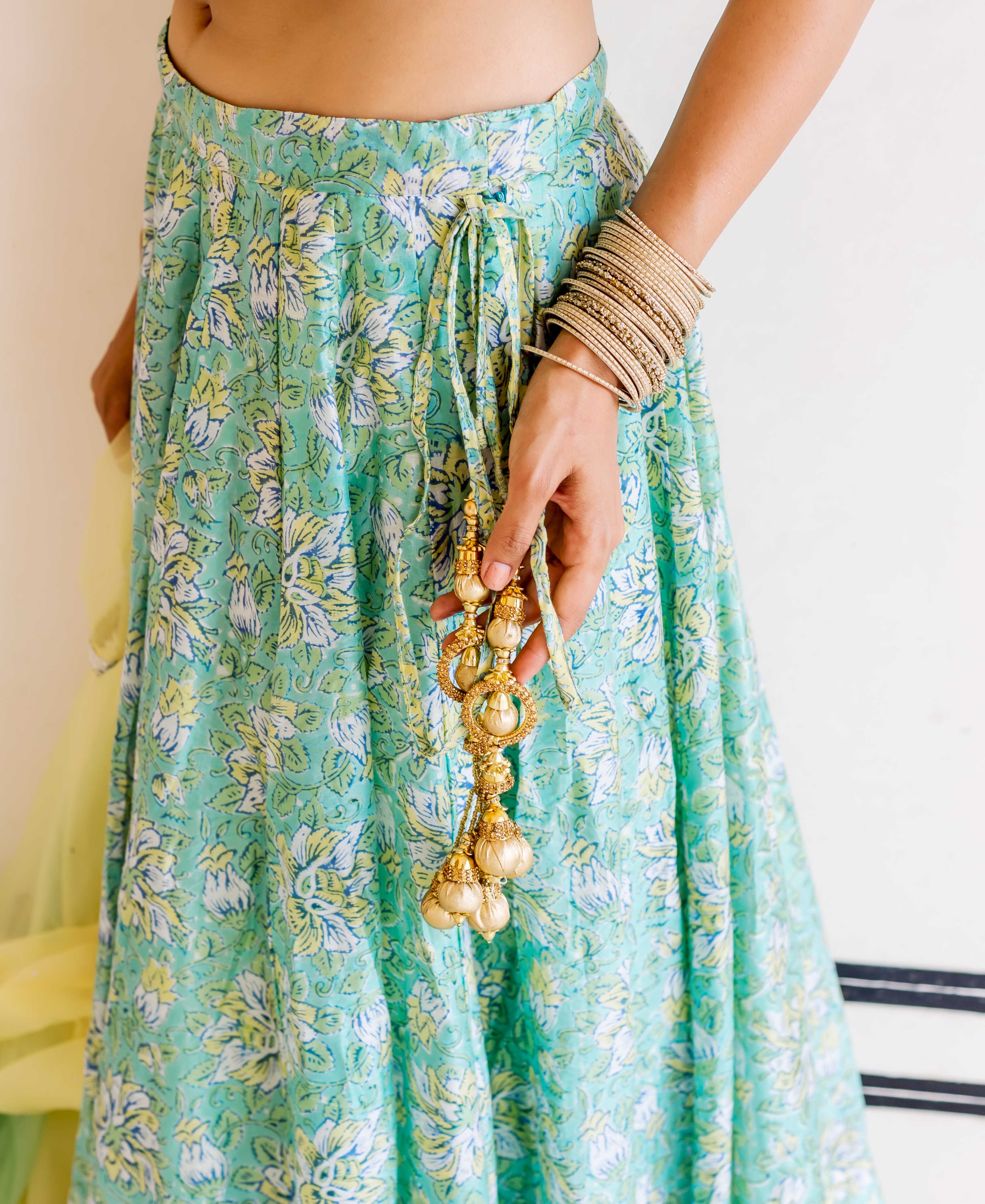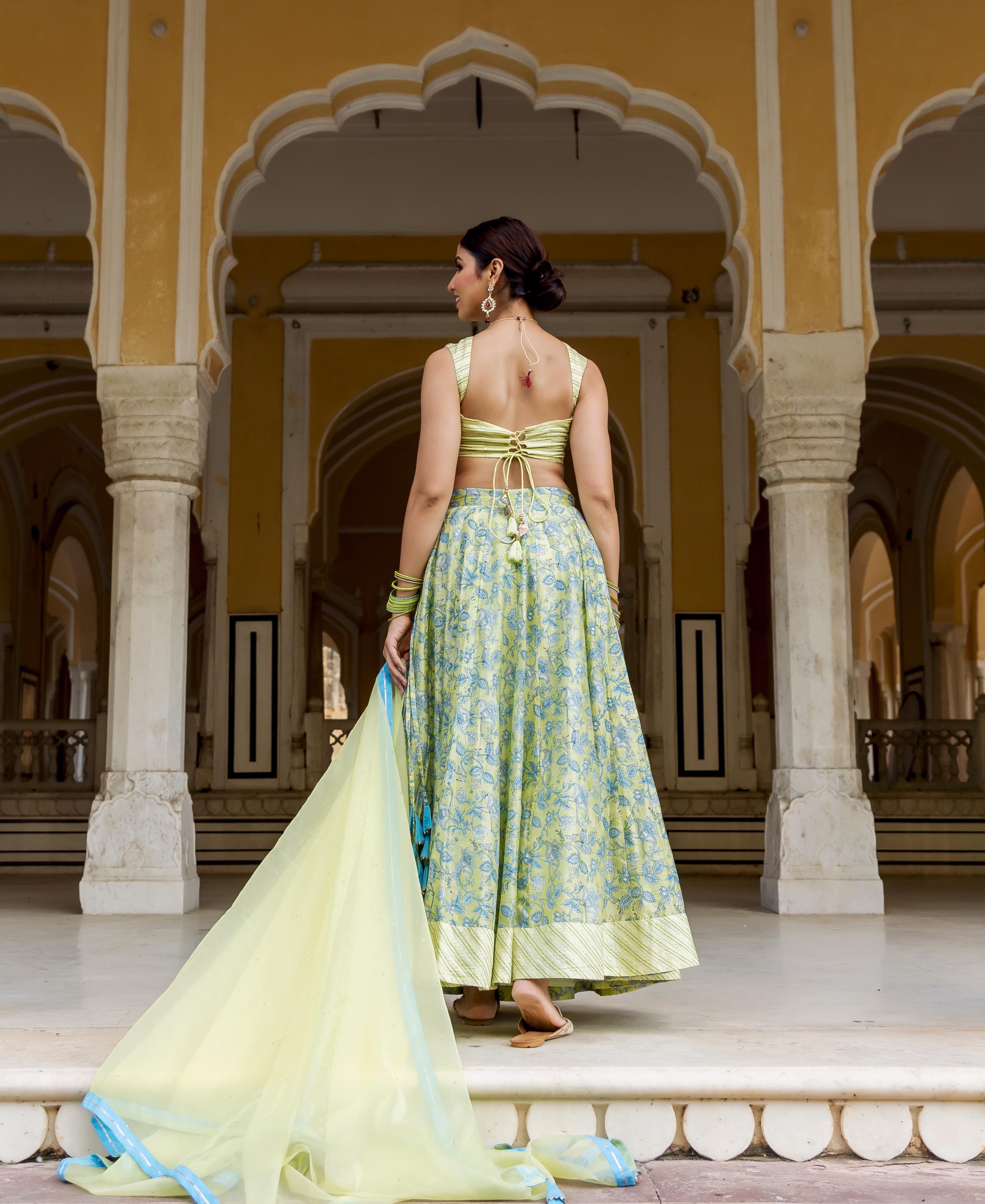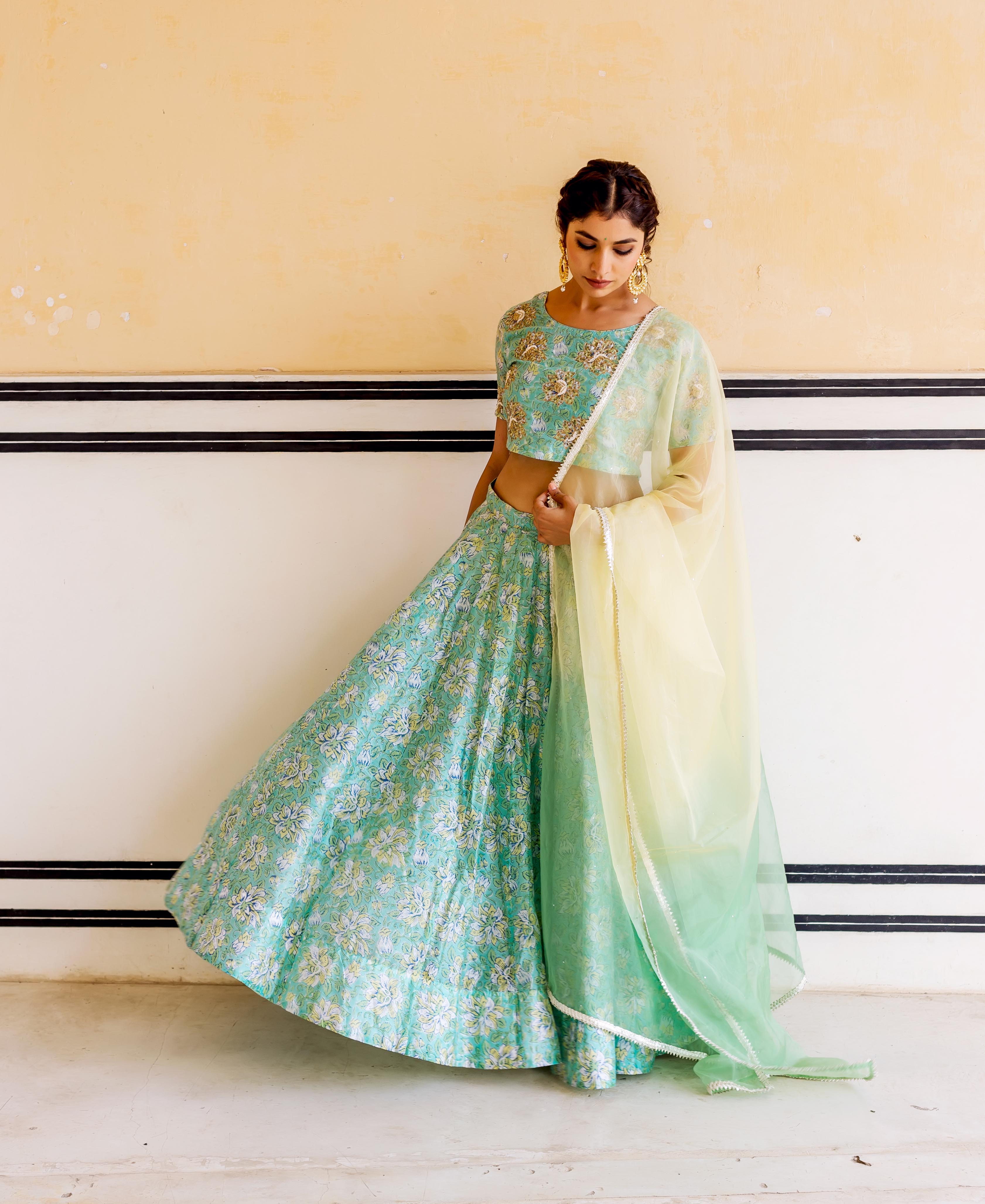 Mehar Green Hand Block Printed and Embroidered Lehenga Set