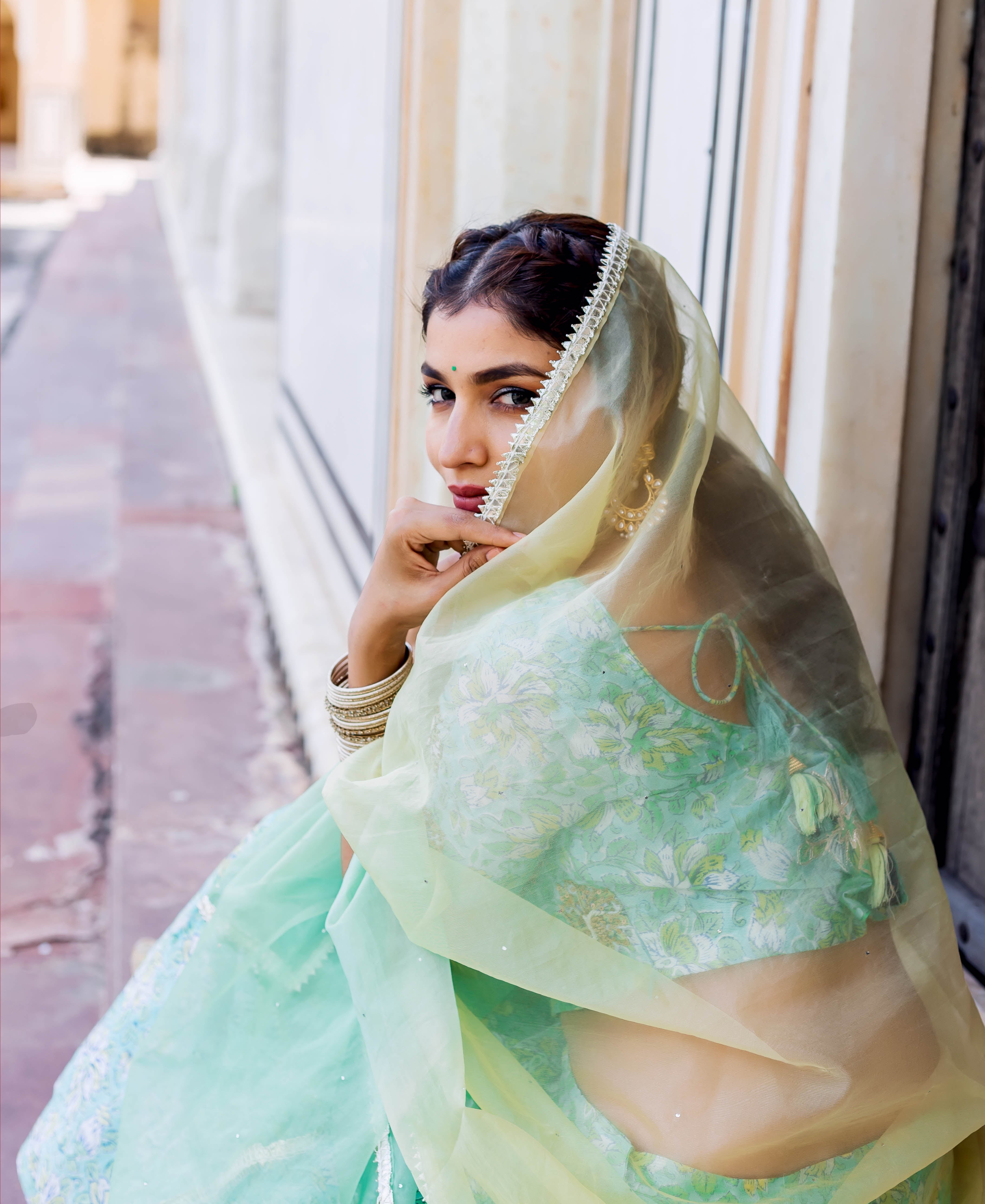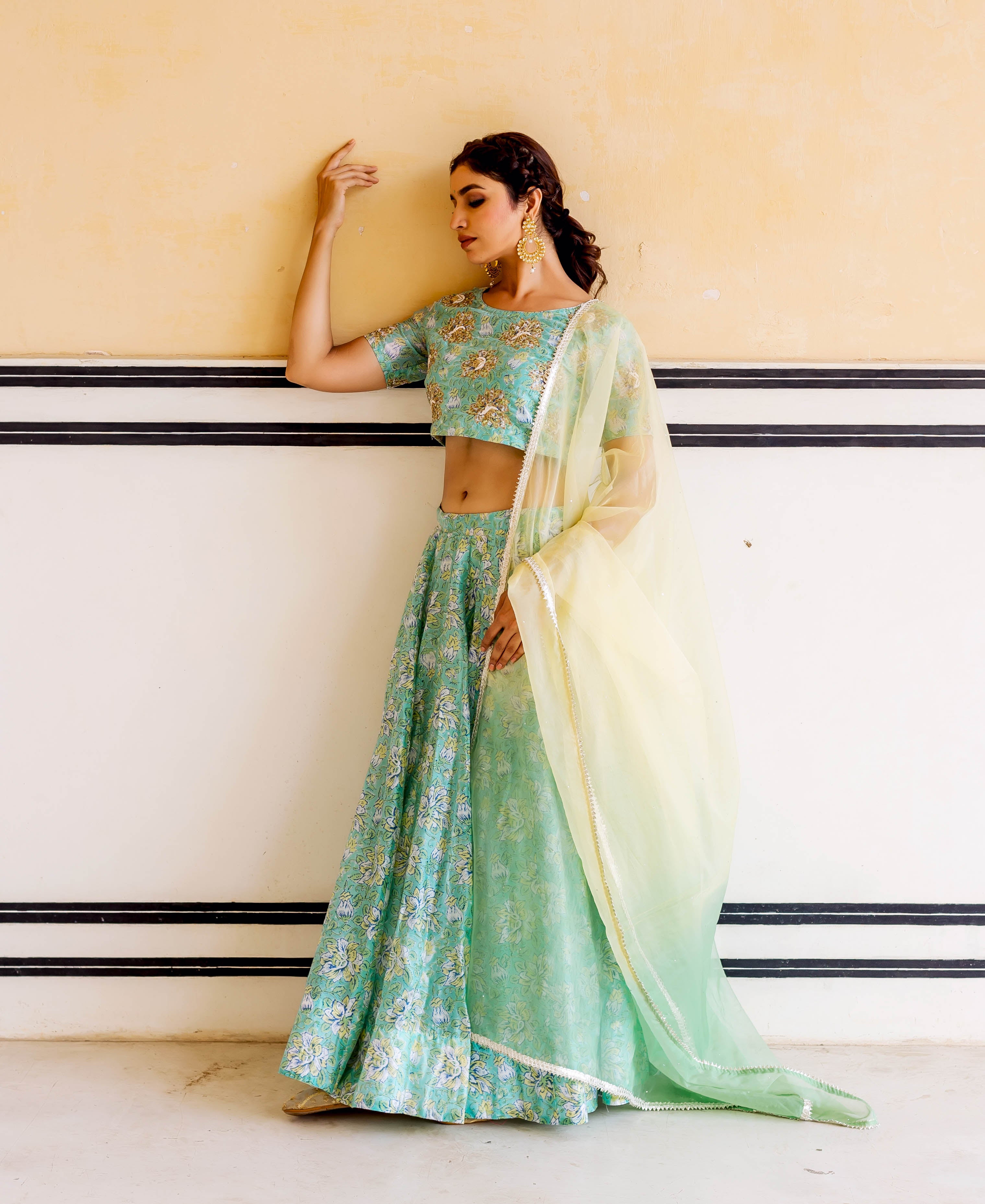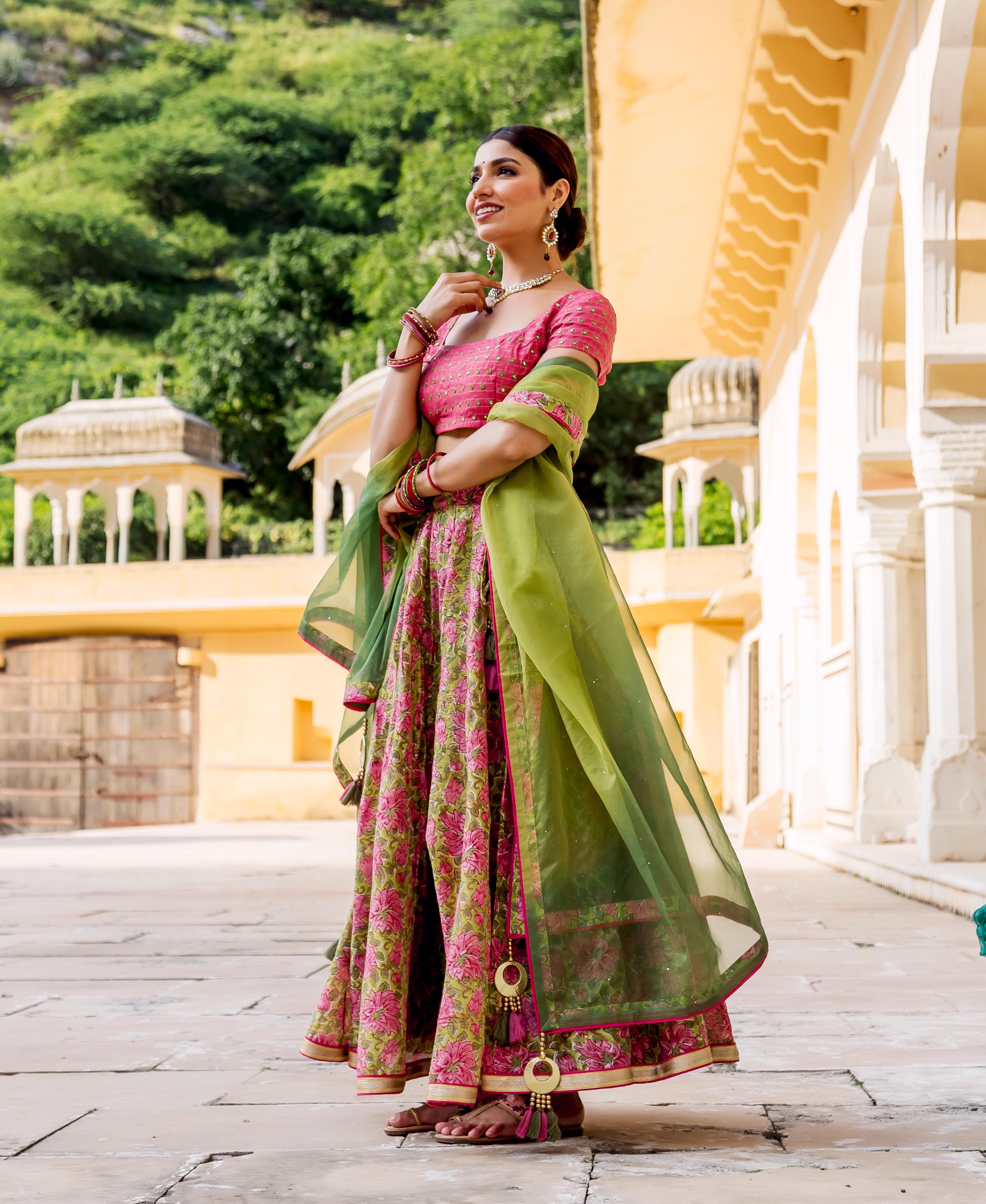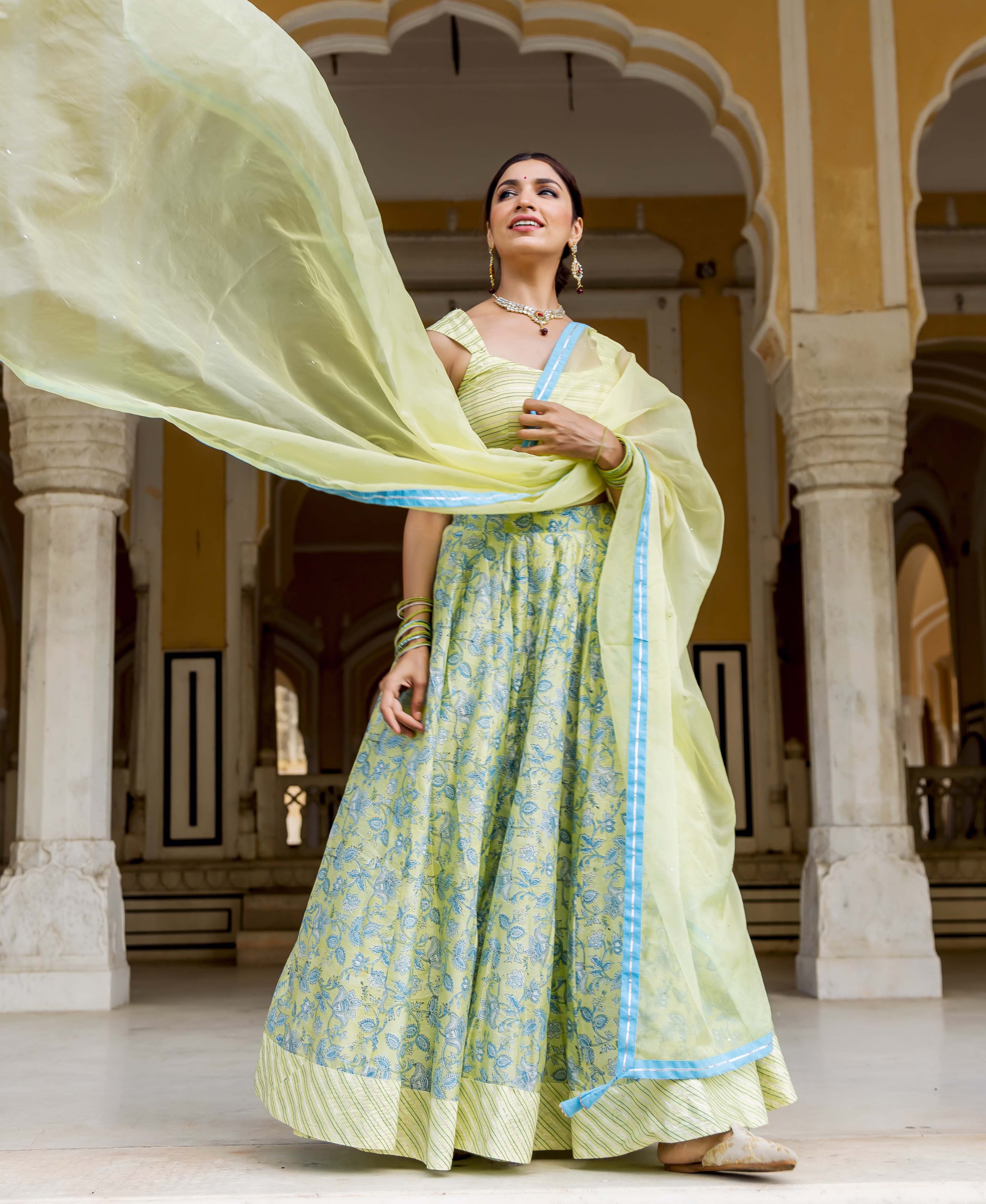 Mehar Green Hand Block Printed and Embroidered Lehenga Set