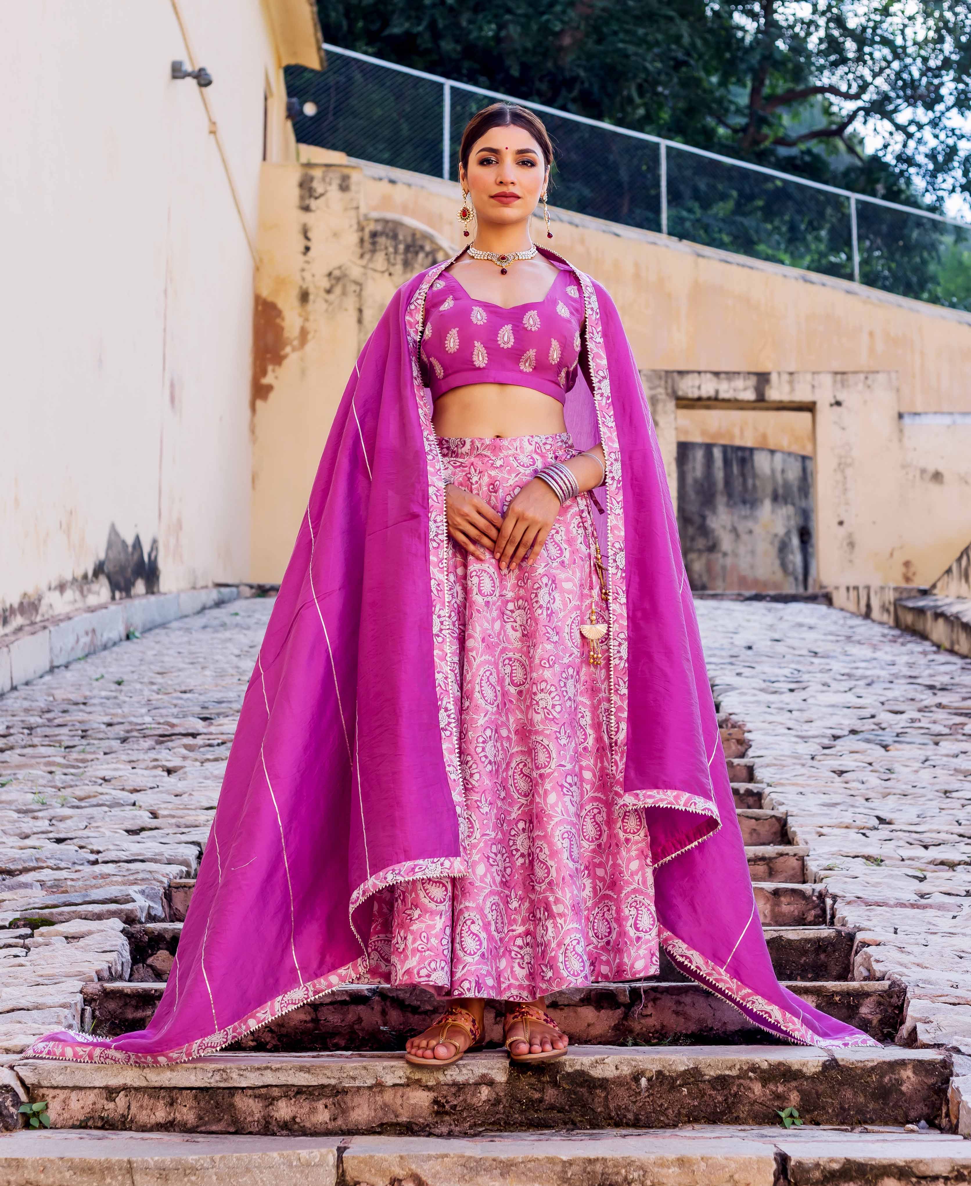 Aarzoo Pink and Purple Hand Block Printed Lehenga Set