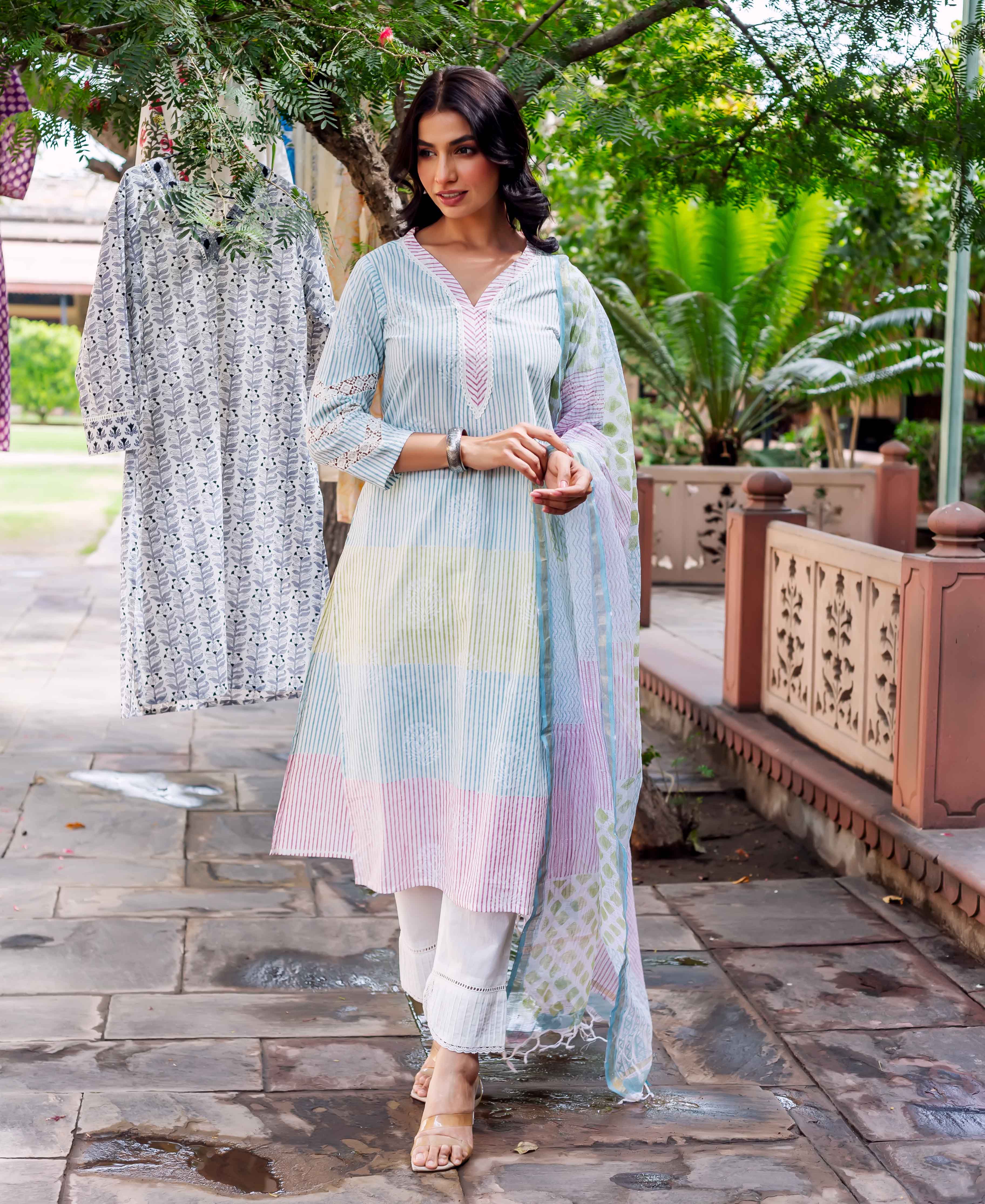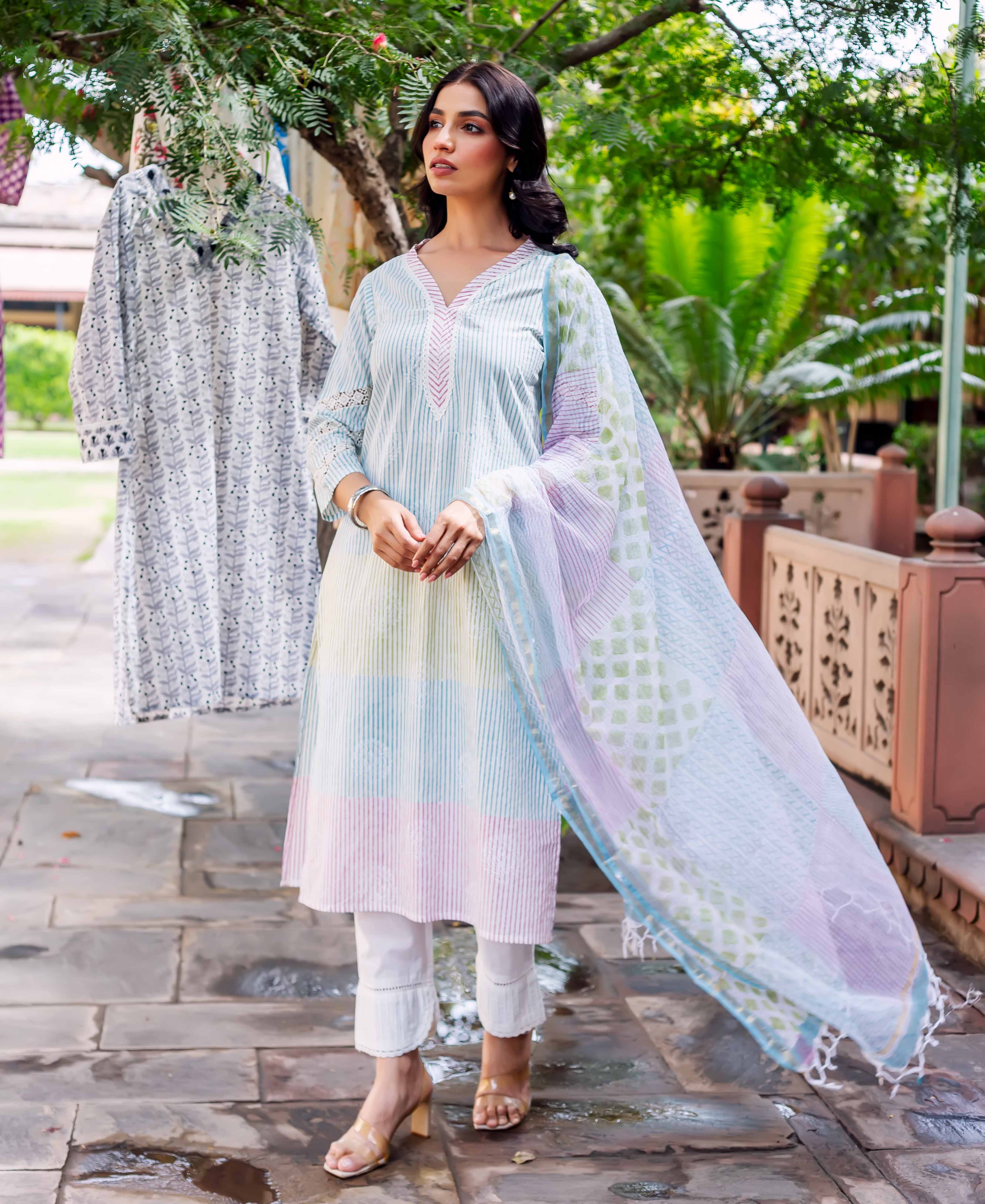- Dupatta: Block-printed Kota Doria in coordinating pastel shades of blue, pink, and green, with a lightweight and sheer texture that enhances the set with a graceful drape.