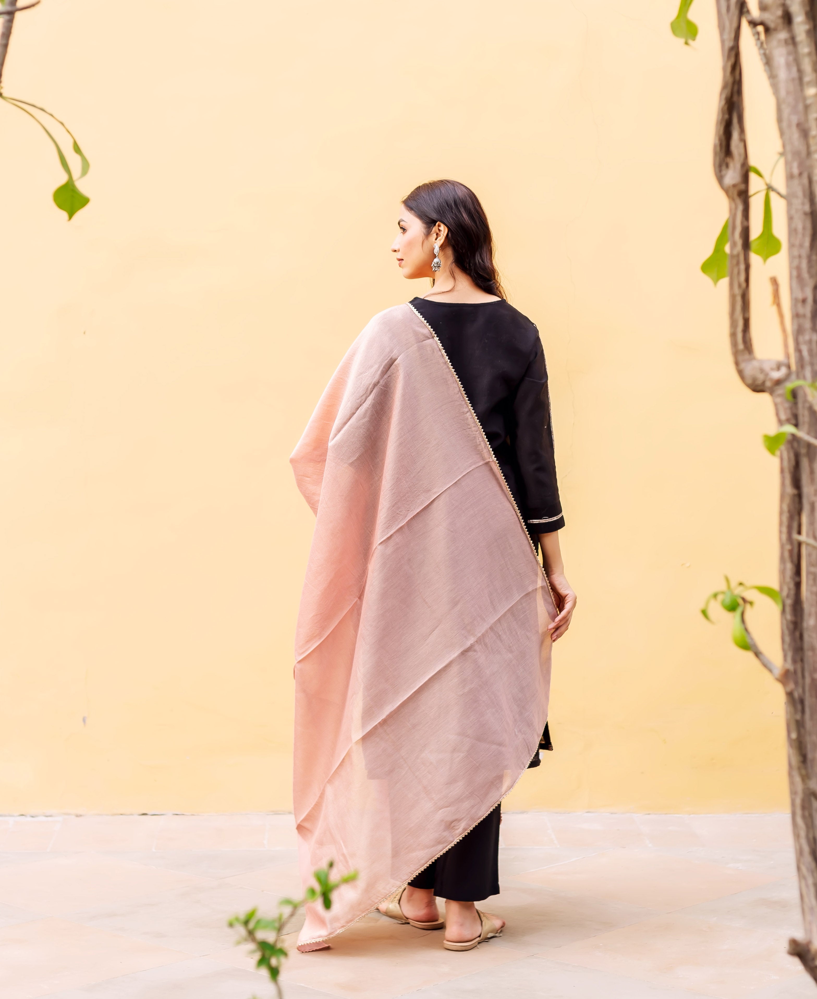 - Dupatta: Cotton silk in a soft peach shade, featuring delicate gotta lace detailing along the borders, adding a festive and graceful drape to the ensemble.