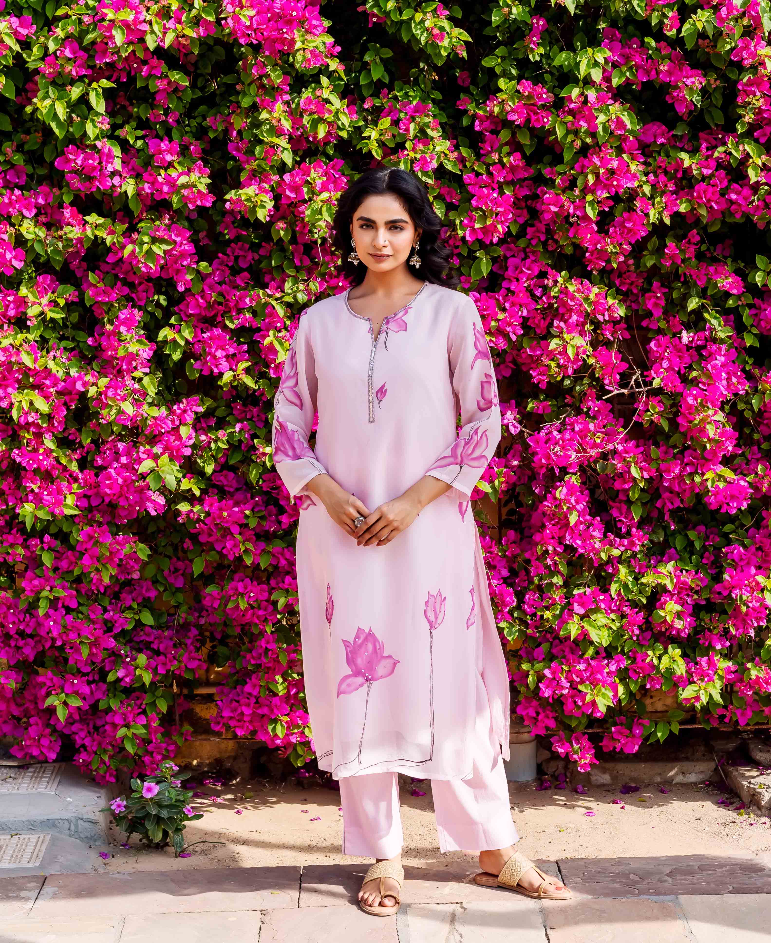 - Dupatta: Hand brush-painted organza in soft pink with matching lotus motifs, featuring a lightweight and sheer texture that enhances the set with a graceful drape.