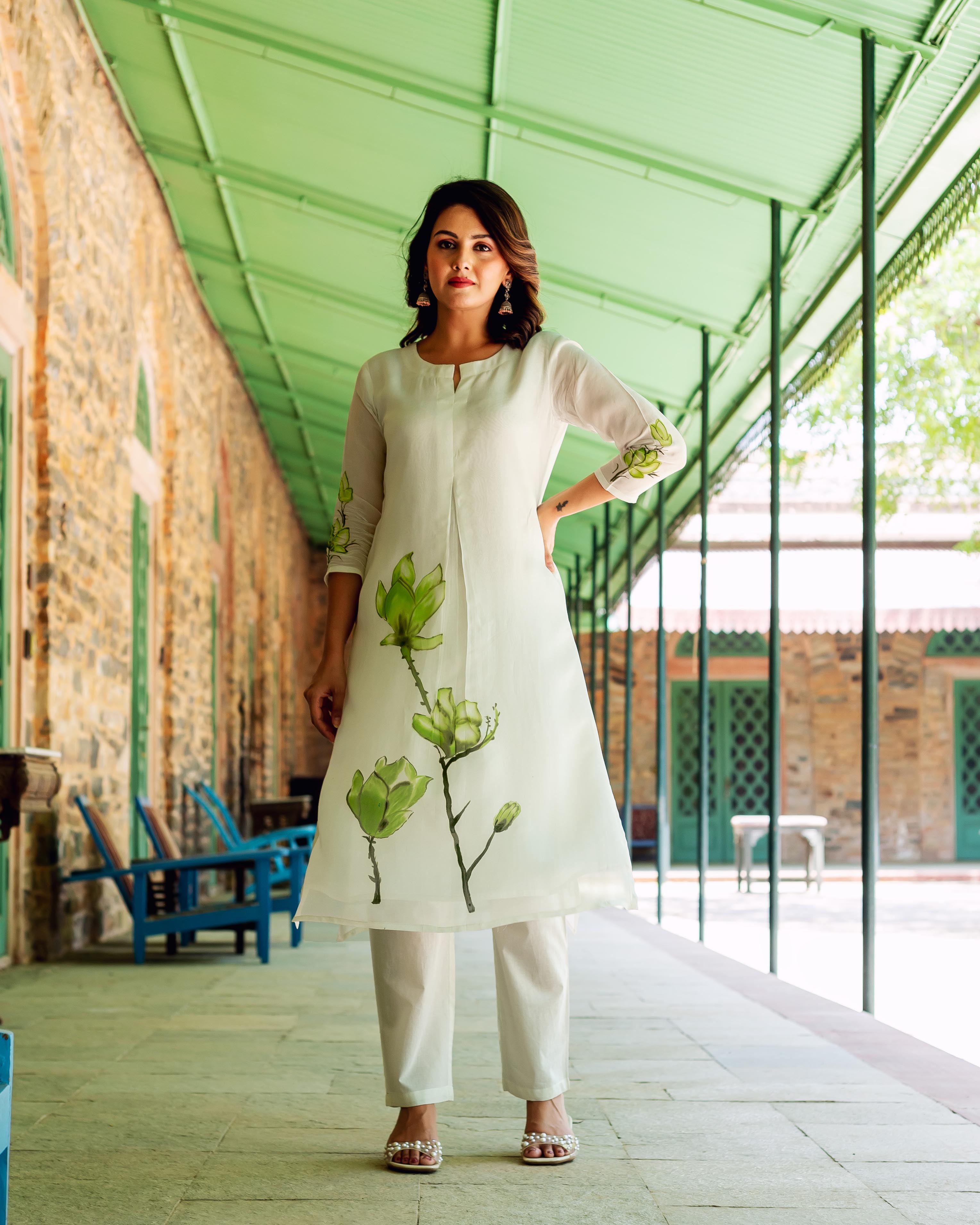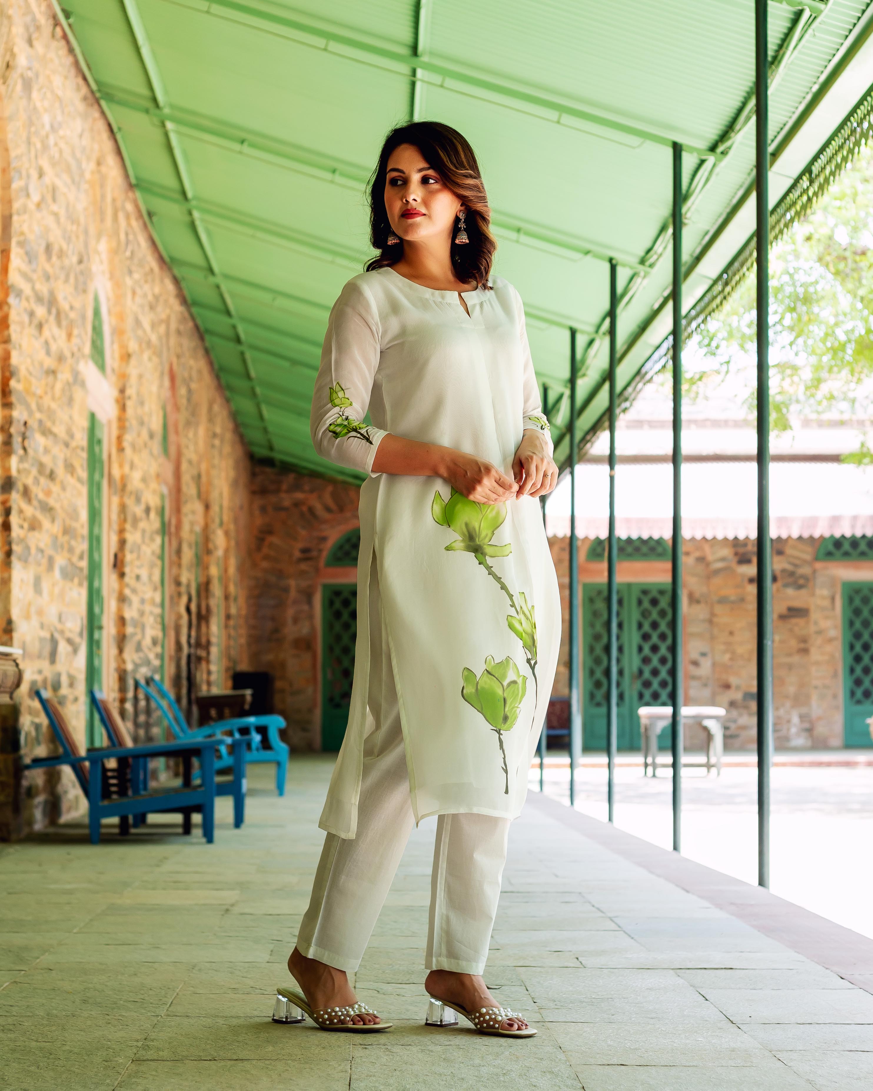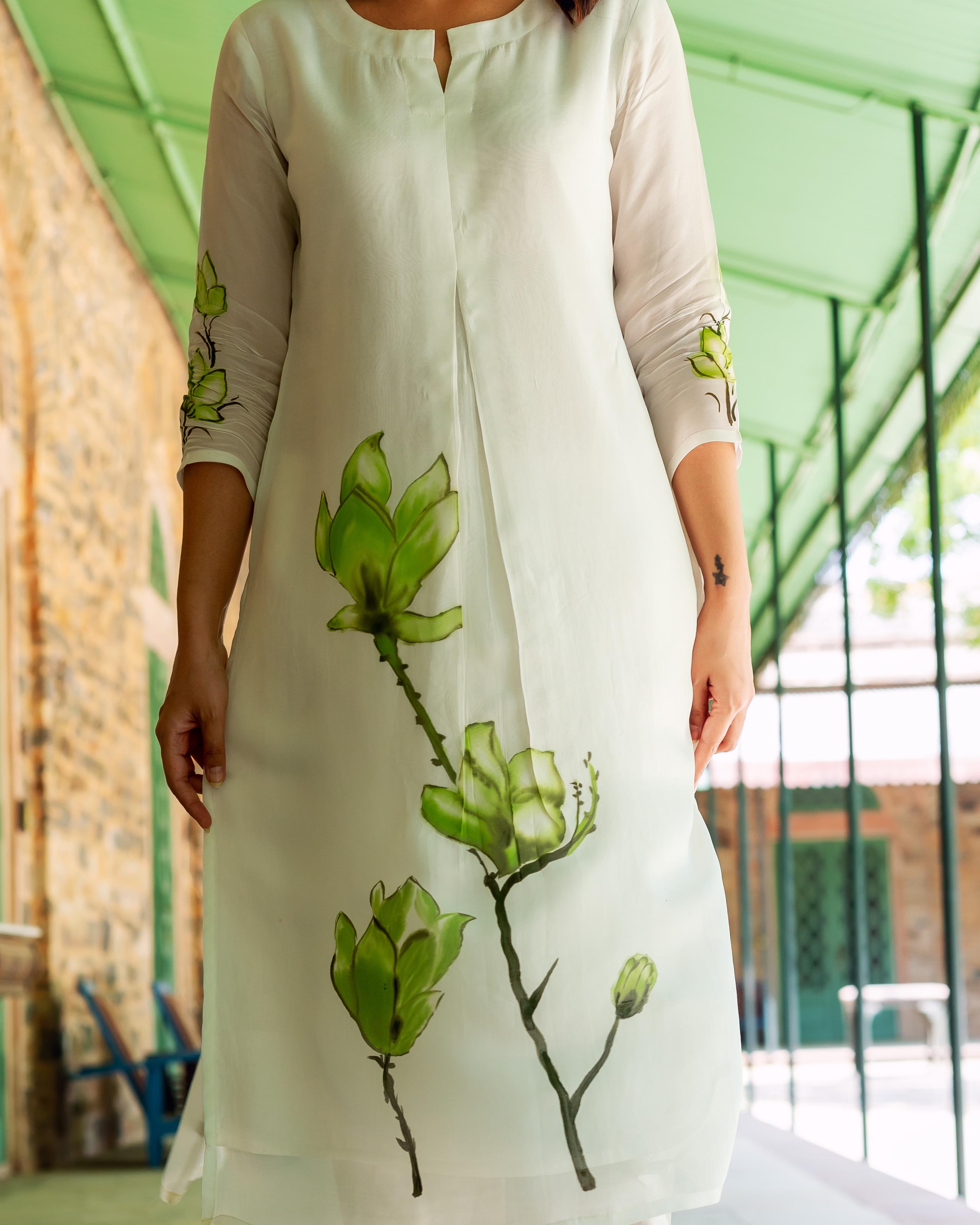 Product Description: Elevate your wardrobe with our exquisite Blossom Hand Painted Kurta Set. The kurta features delicate floral motifs hand painted in shades of green on lightweight organza fabric, exuding elegance and charm. With its 3/4 sleeves and a comfortable cotton lining, it promises both style and comfort. Complete your ensemble with the Brush Painted Organza dupatta, adding a graceful layer of sophistication.