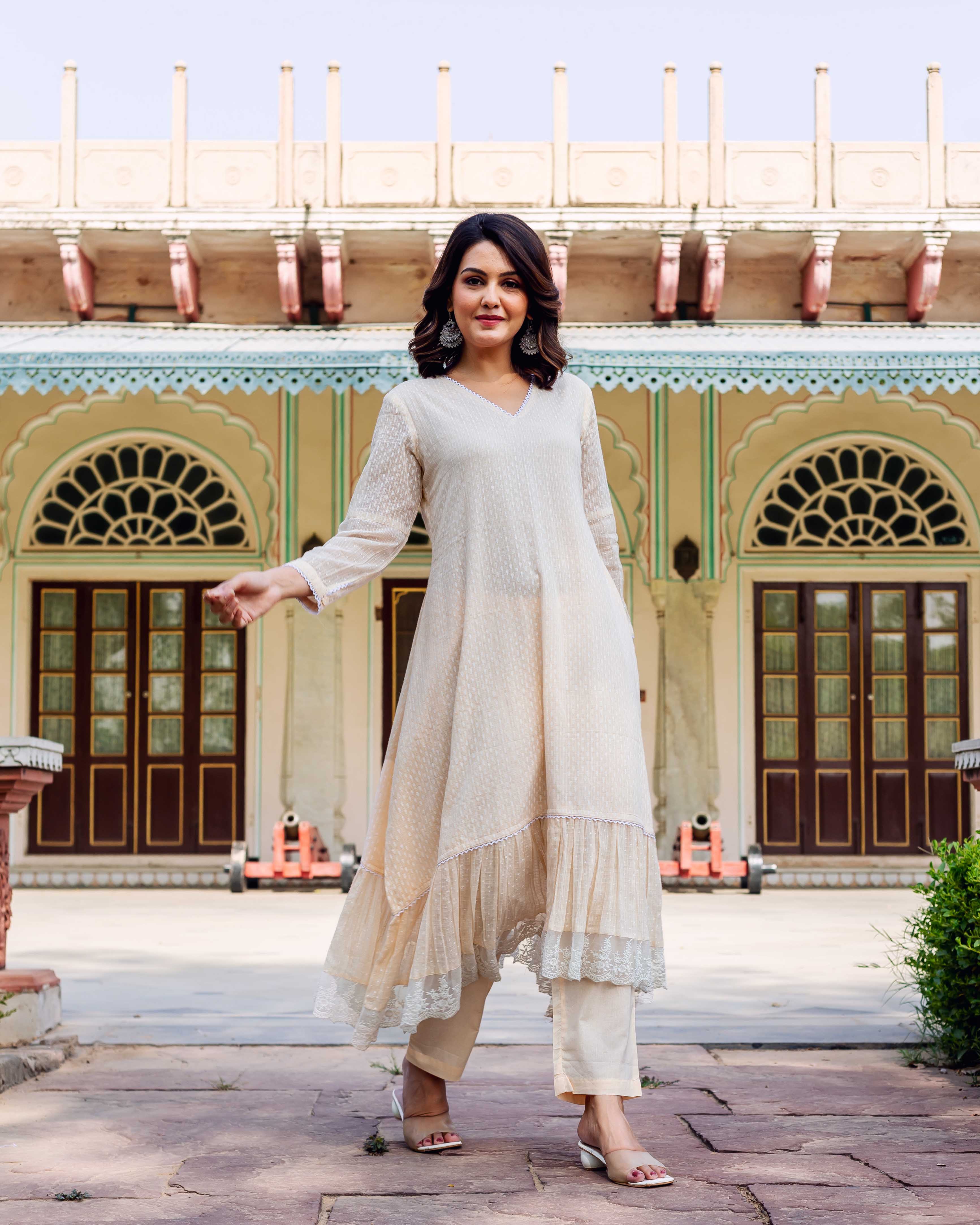 Introducing Desert Blossom Lace kurta, a timeless piece that exudes sophistication. Crafted from soothing Kota doriya fabric in beige hue, this kurta features elegant 3/4 sleeves and intricate lace details. The A-line cut offers a flattering silhouette, while delicate lace details at the neck, sleeves, and hemline enhance its allure. Pair it effortlessly with Solid Cotton bottoms and a kota doriya block printed dupatta for a complete ensemble.