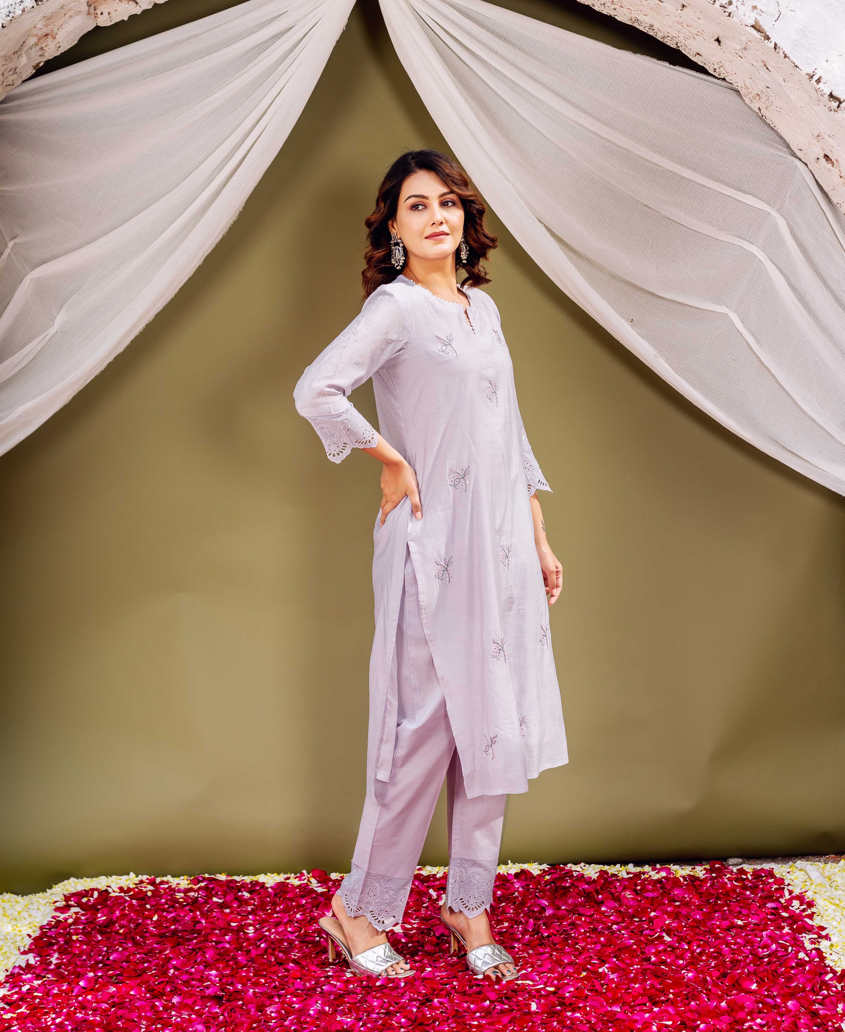 Elevate your elegance with our Lavender Silk Essence Kurta, a luxurious statement piece. Fashioned from ethereal Chanderi Silk fabric in a serene light lavender hue, this kurta boasts graceful 3/4 sleeves and exquisite embroidery adorned with delicate beadwork at the neckline. Further enhancing its allure, embroidered details embellish the sleeve openings. Pair effortlessly with cotton pleated solid pants featuring intricate embroidery along the sweep for added flair. Complete the ensemble with an Organza dupatta featuring intricate lace details. Embrace comfort with the cotton lining within the kurta.