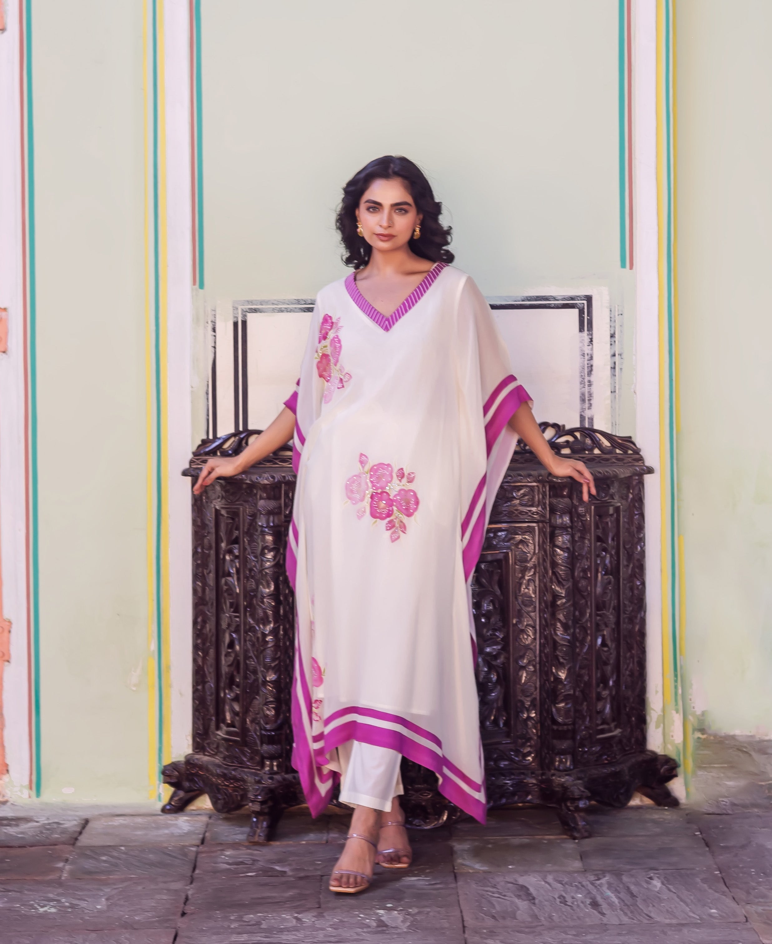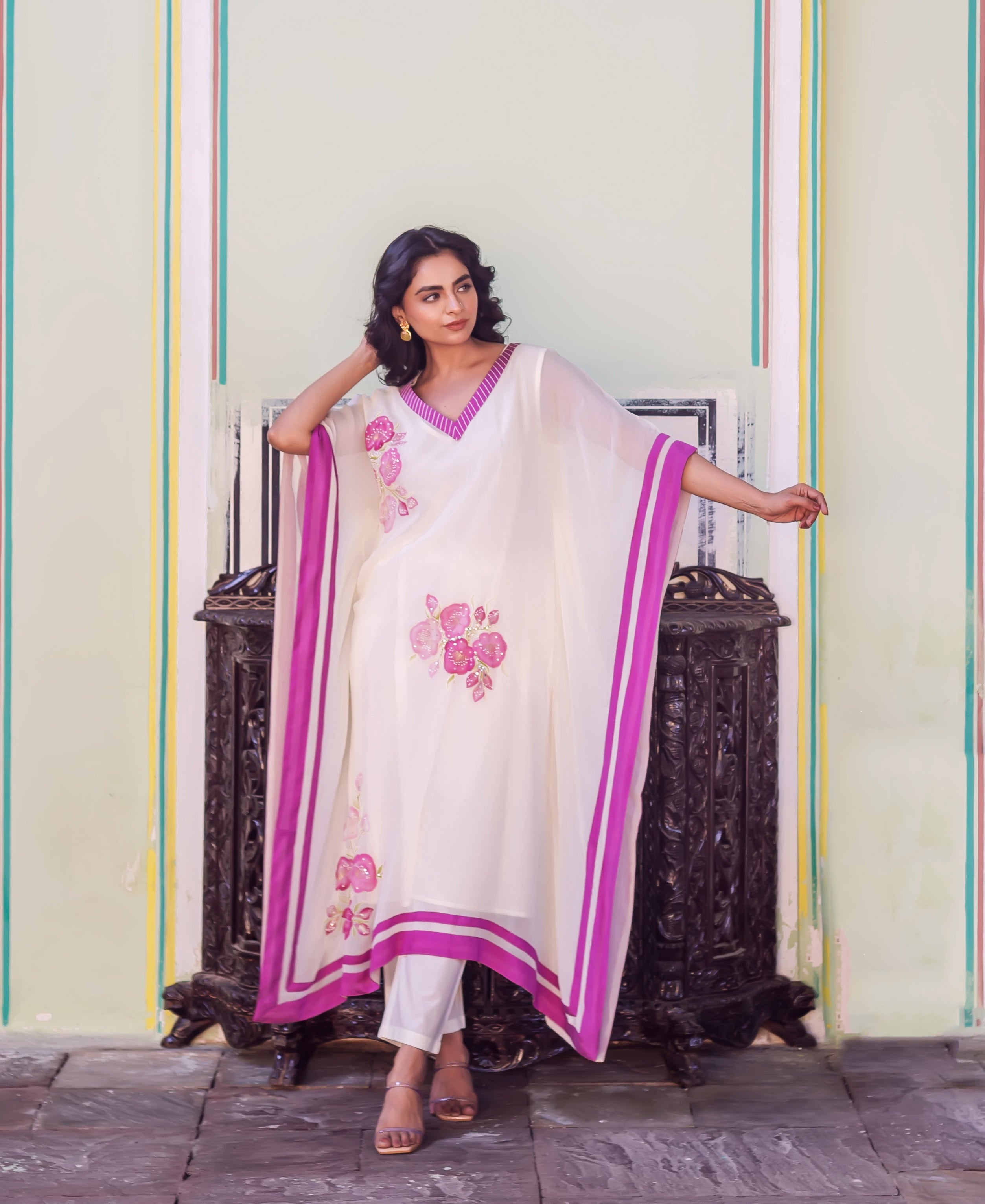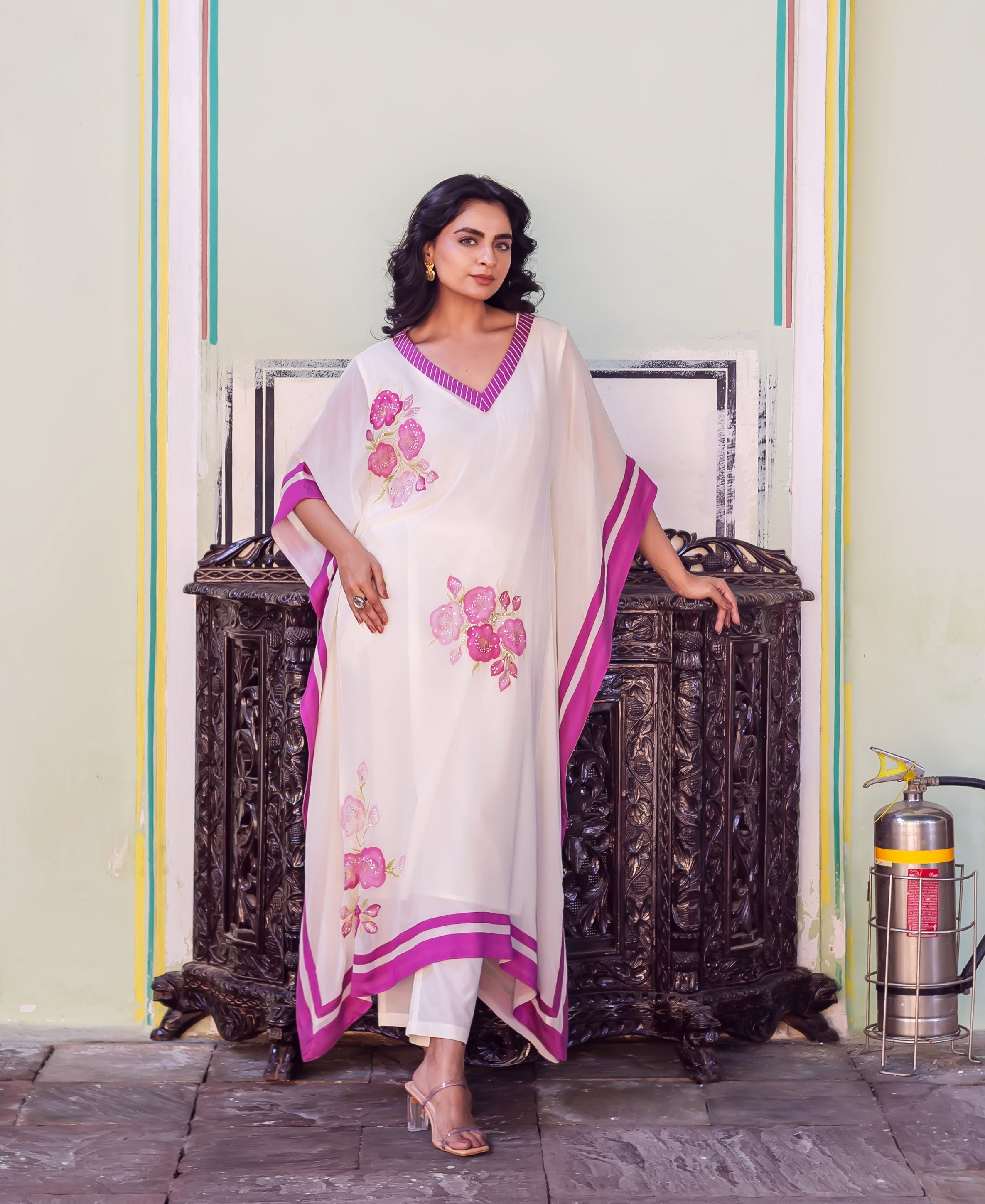 - Design: V-neckline with hand brush painting of pink floral motifs and hand embroidery highlights, featuring wide, flowing sleeves and a floor-length kaftan silhouette with vibrant magenta borders.