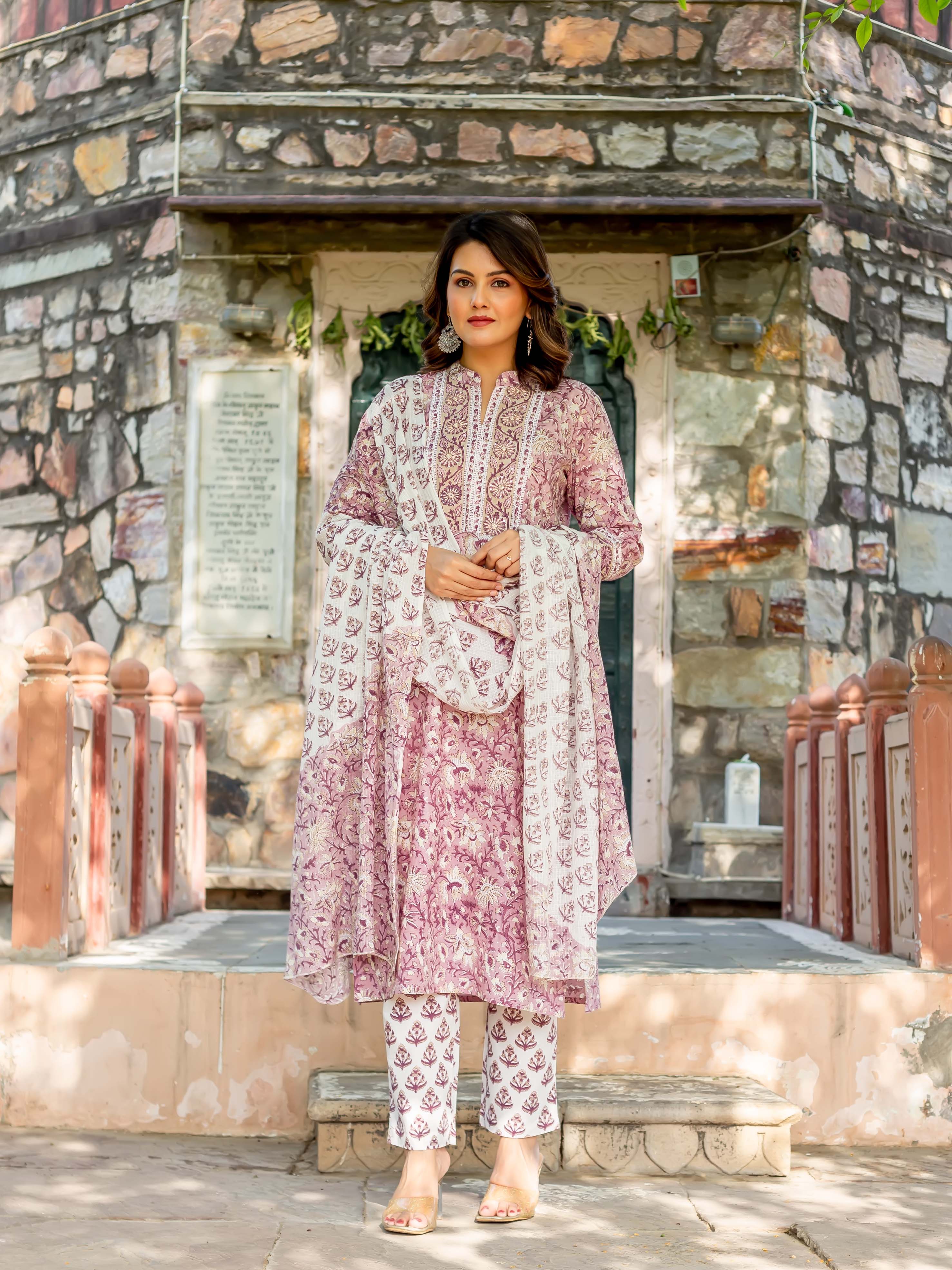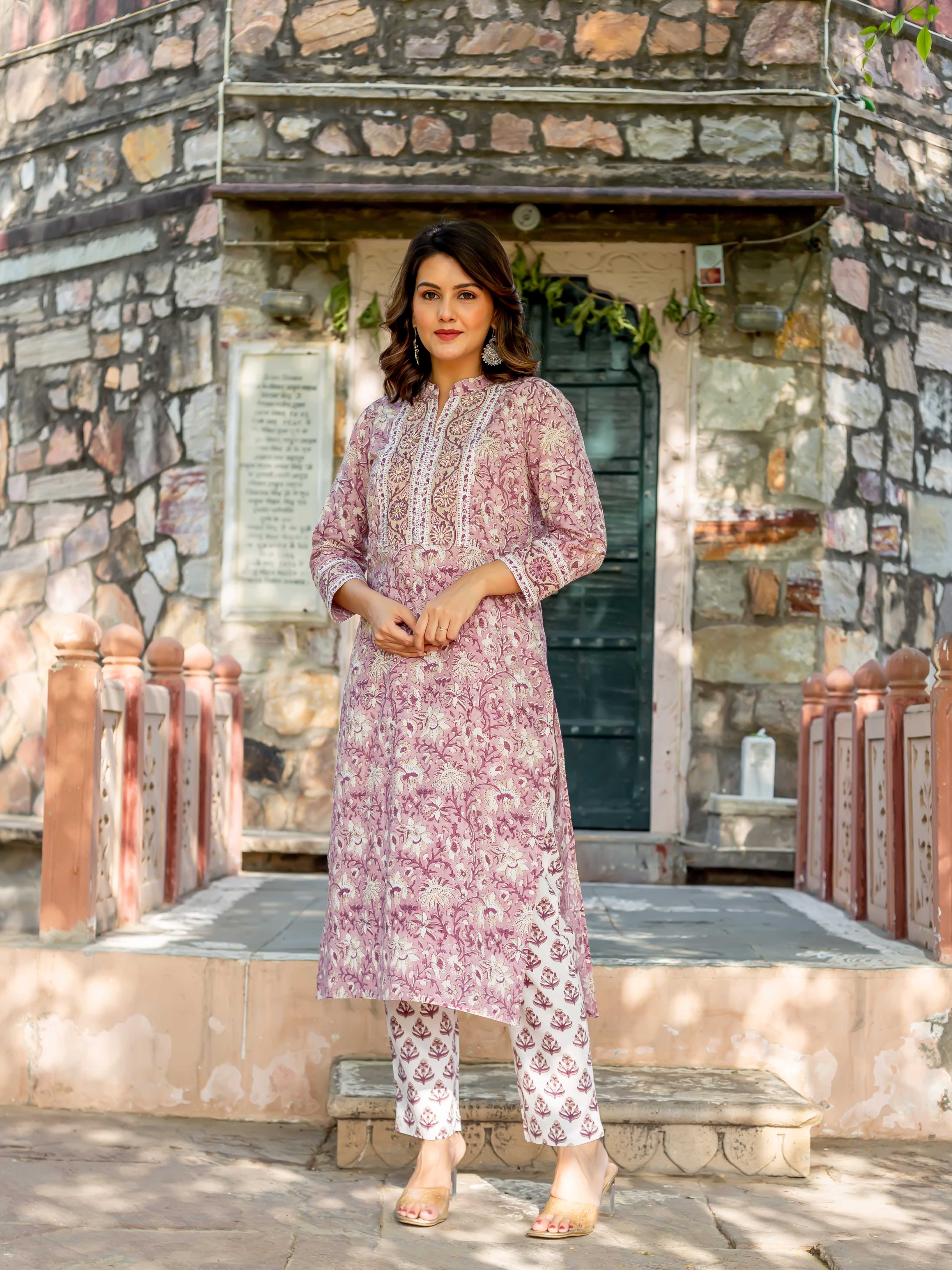 Product Description: Embrace timeless elegance with our Old Rose Hand Block Printed Cotton Kurta. Crafted from 100% fine cotton, this kurta features a charming old rose hue with delicate booty print and hand block printed border details at the neck and sleeves. Pair this kurta effortlessly with Block Printed Cotton Bottoms for a coordinated look, and enhance your ensemble with our Block Printed Kota Doria Dupatta.