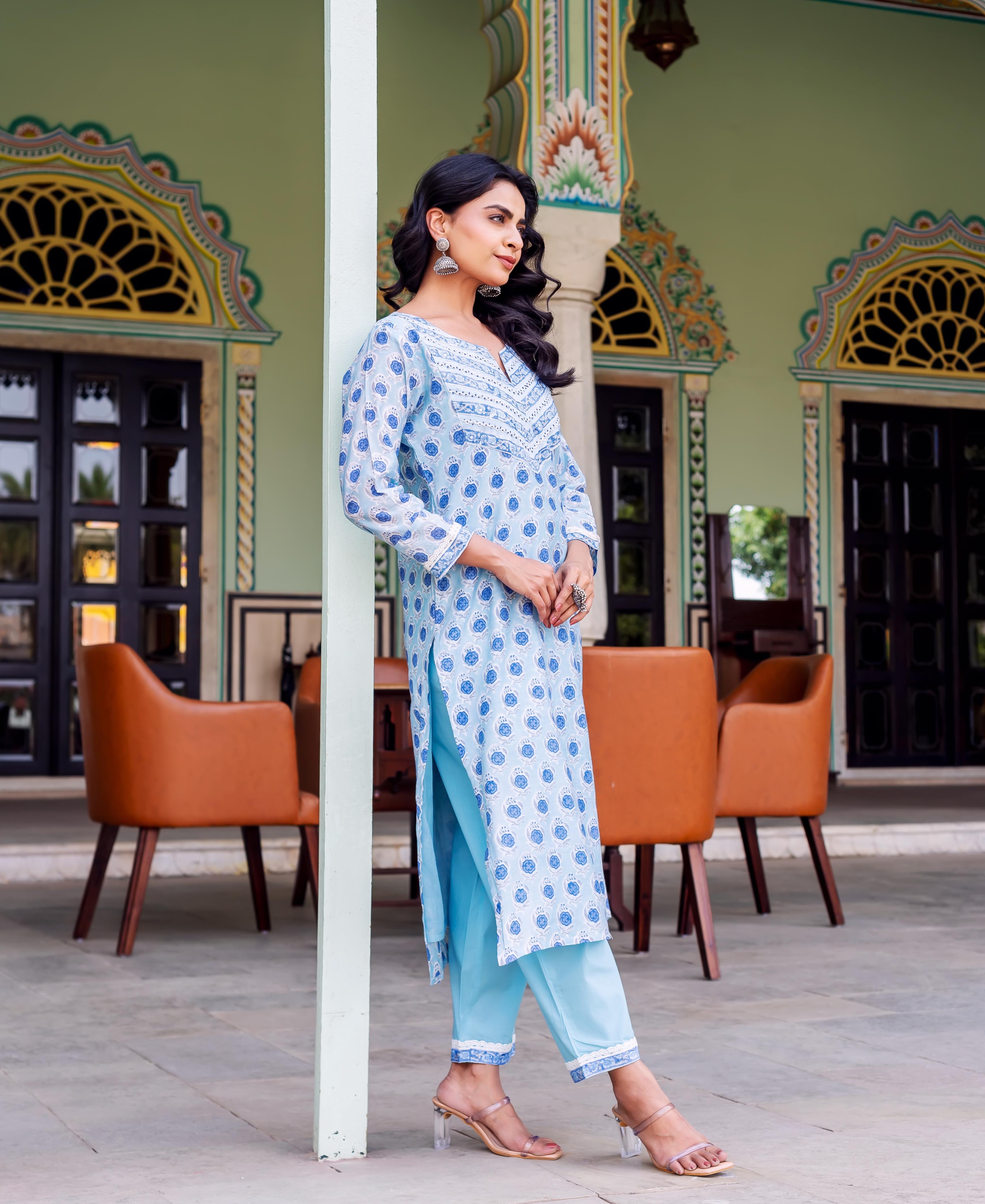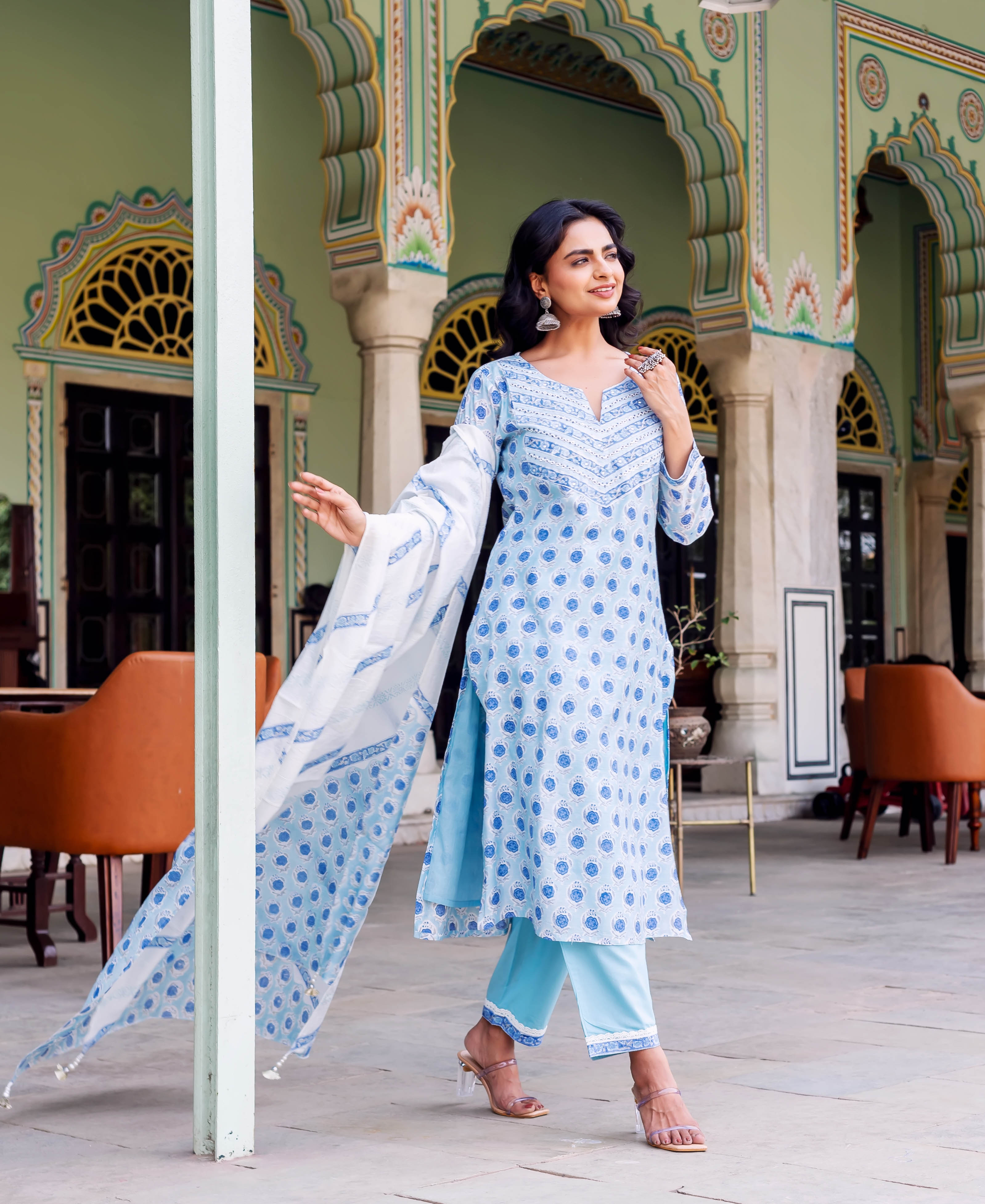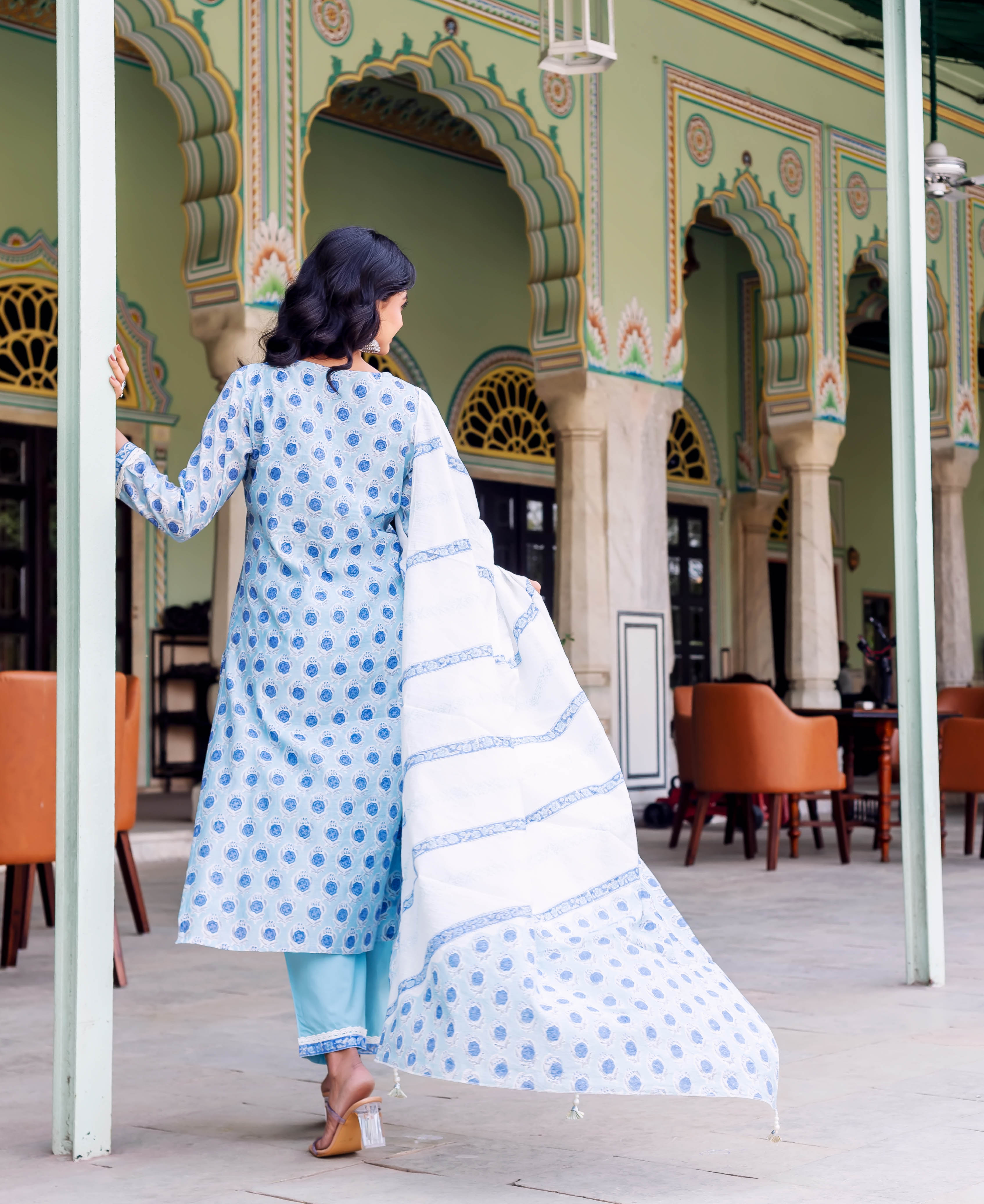 - Dupatta: Block-printed Chanderi in coordinating blue and white tones, enhancing the set with a lightweight and graceful drape.