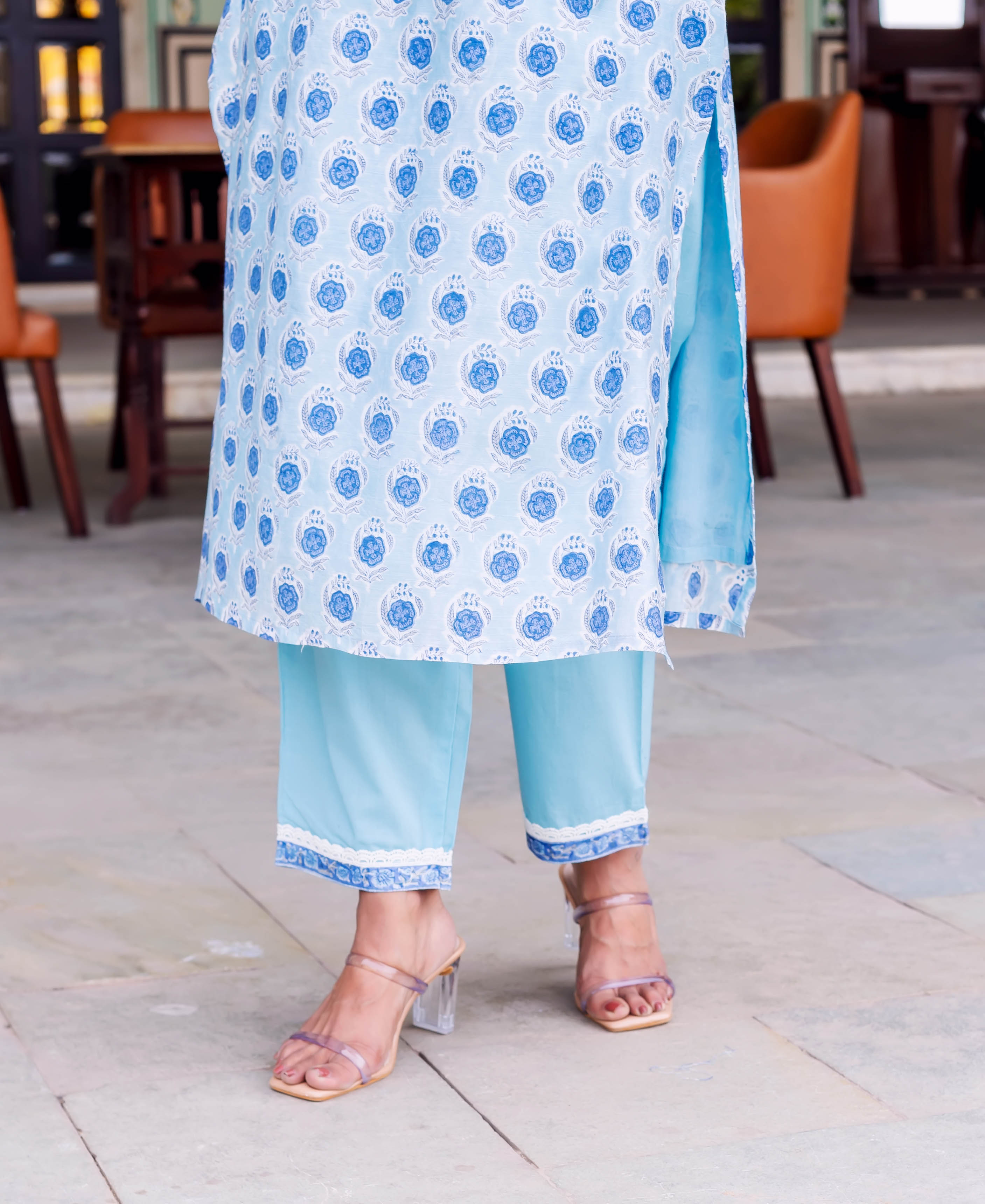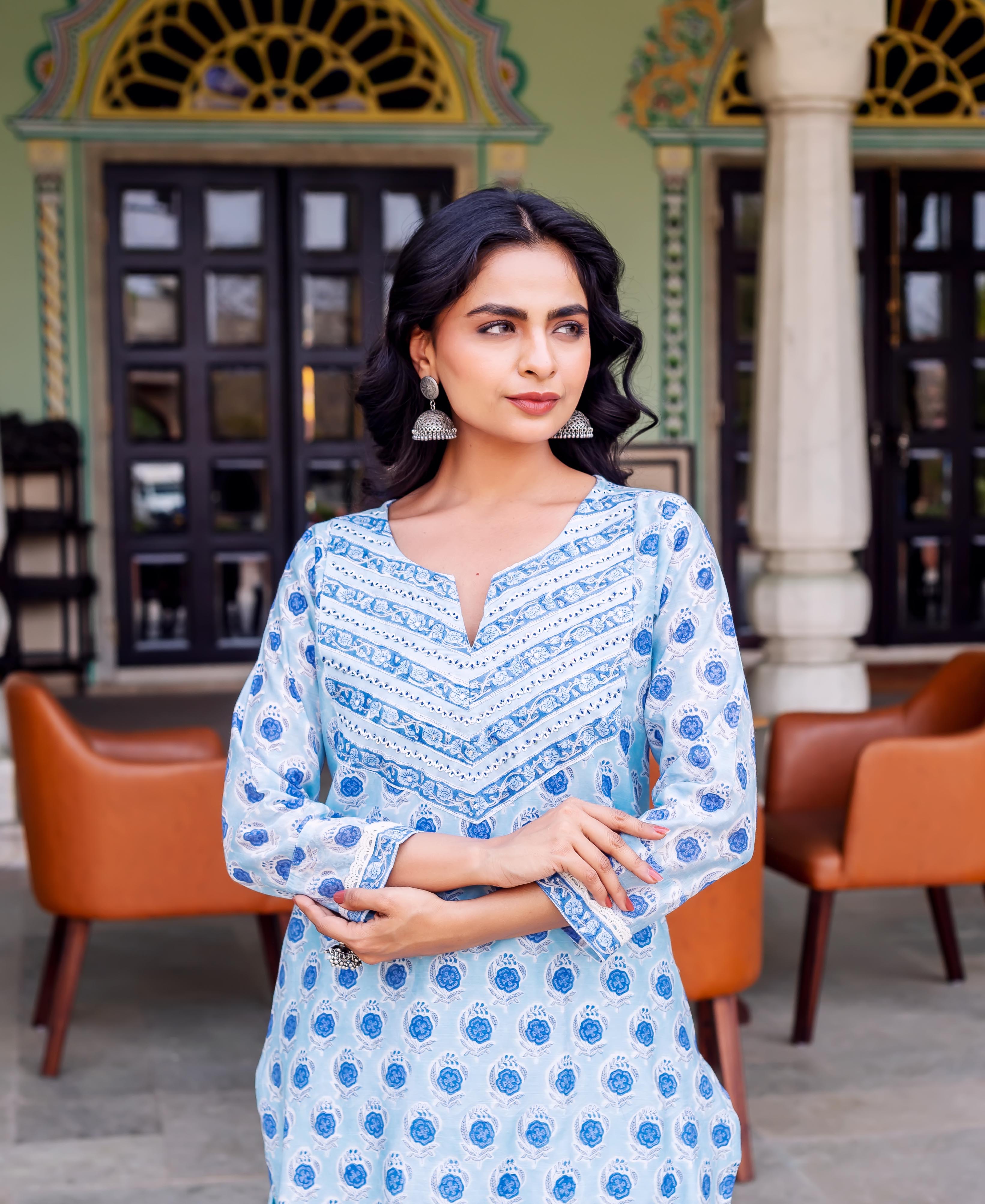 - Bottom: Cotton in matching light blue with detailed lace trim at the hem, adding a refined and elegant touch.