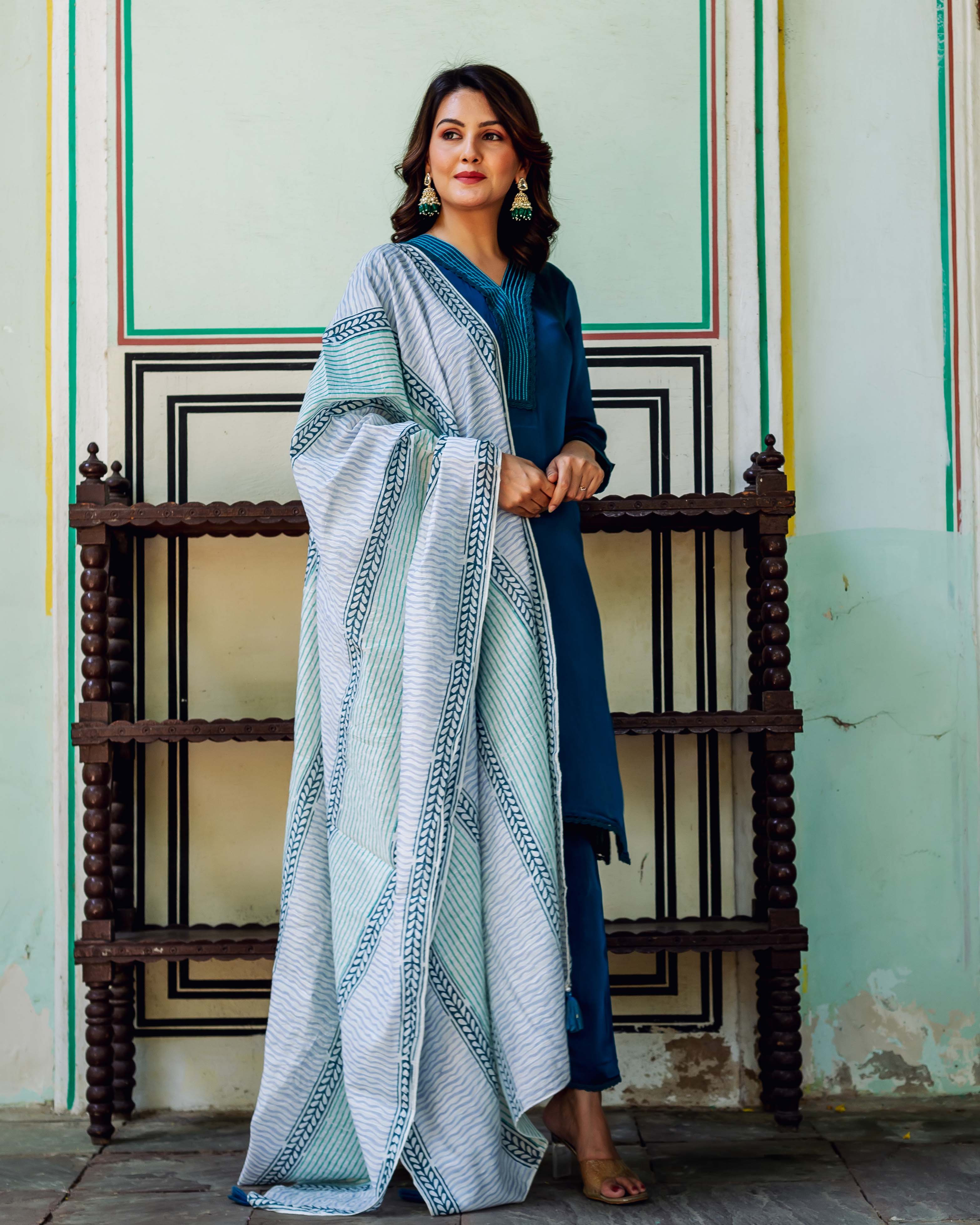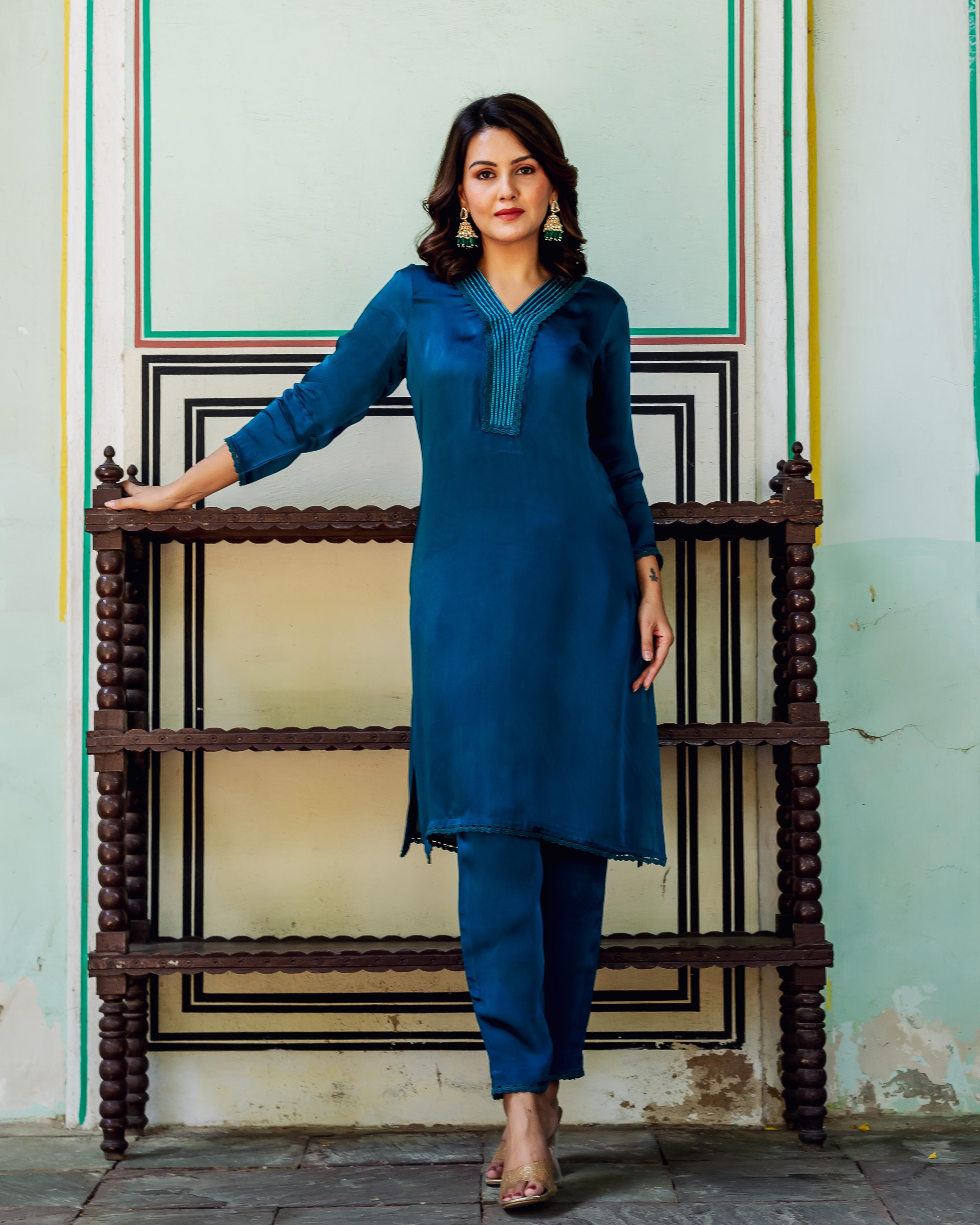 Product Description: Elevate your style with our Royal Blue Satin Kurta Set. This exquisite two-piece ensemble, crafted from luxurious viscose satin, features intricate lace details at the neck, sleeves, and hem. The V-neckline with delicate thread work at the placket and 3/4 sleeves add a touch of elegance. Paired with solid viscose satin pants, this kurta set can be effortlessly complemented with a hand block printed dupatta for a complete look.