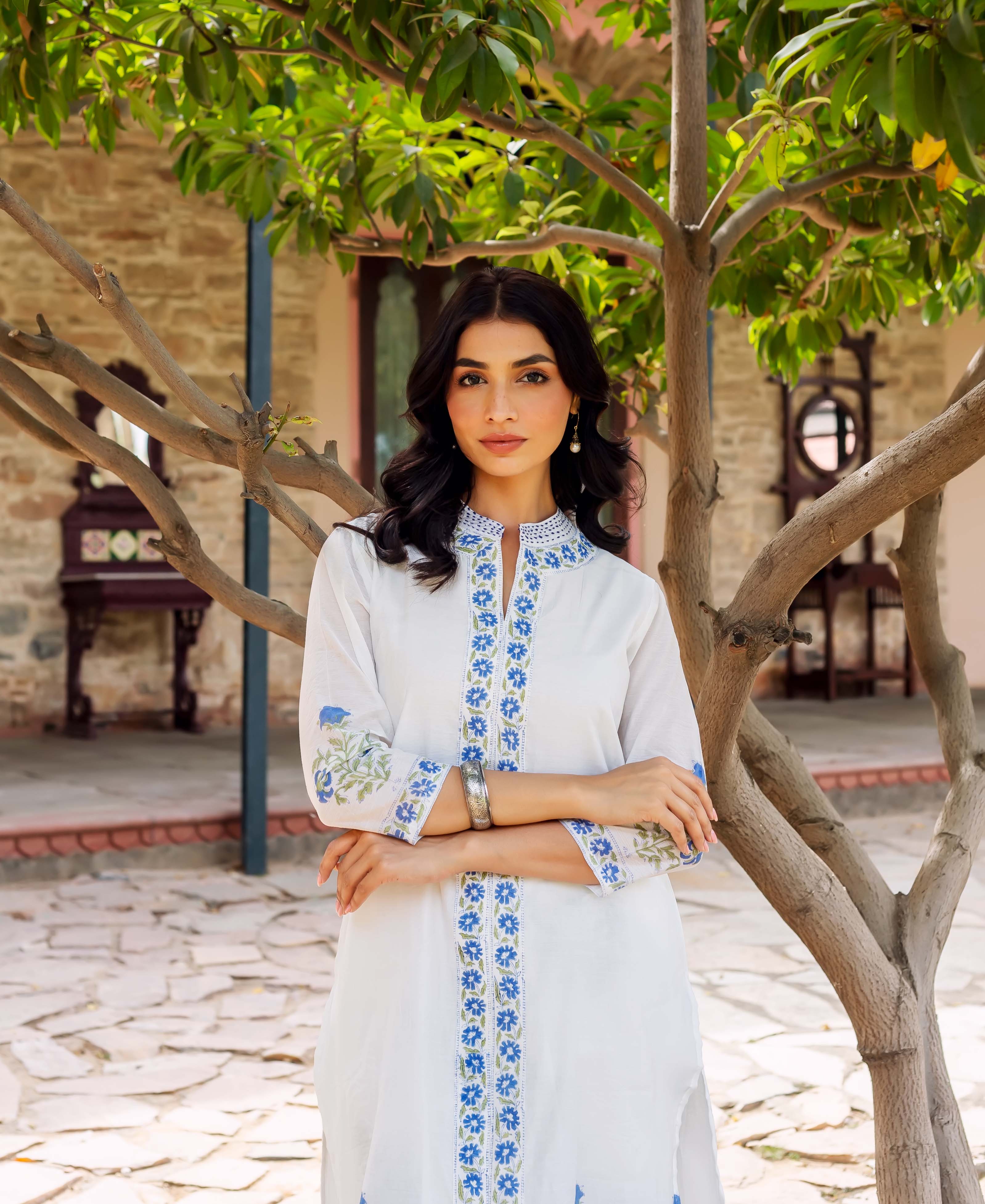 - Color: Pristine white with blue and green floral block printing, offering a fresh and calming aesthetic.