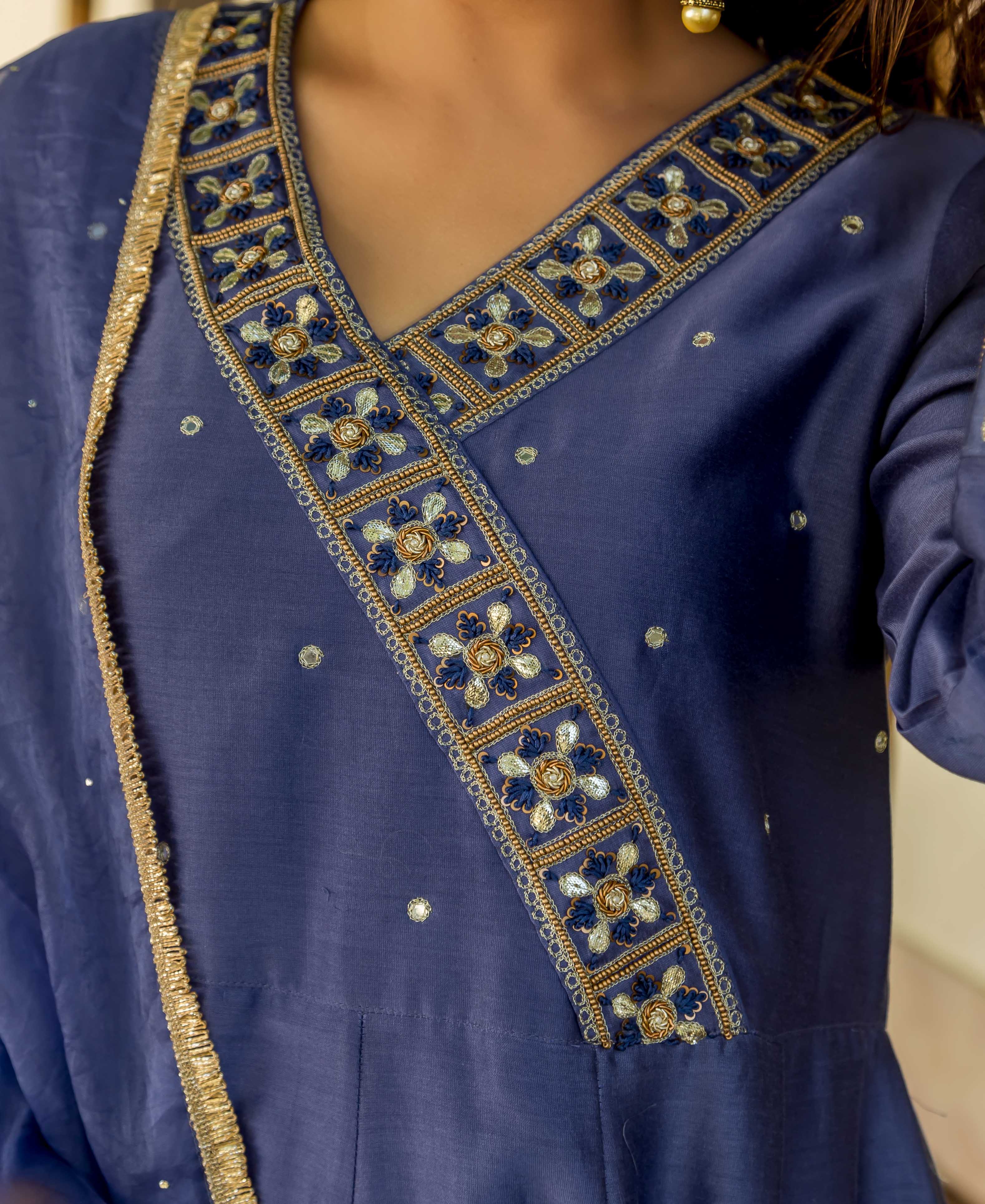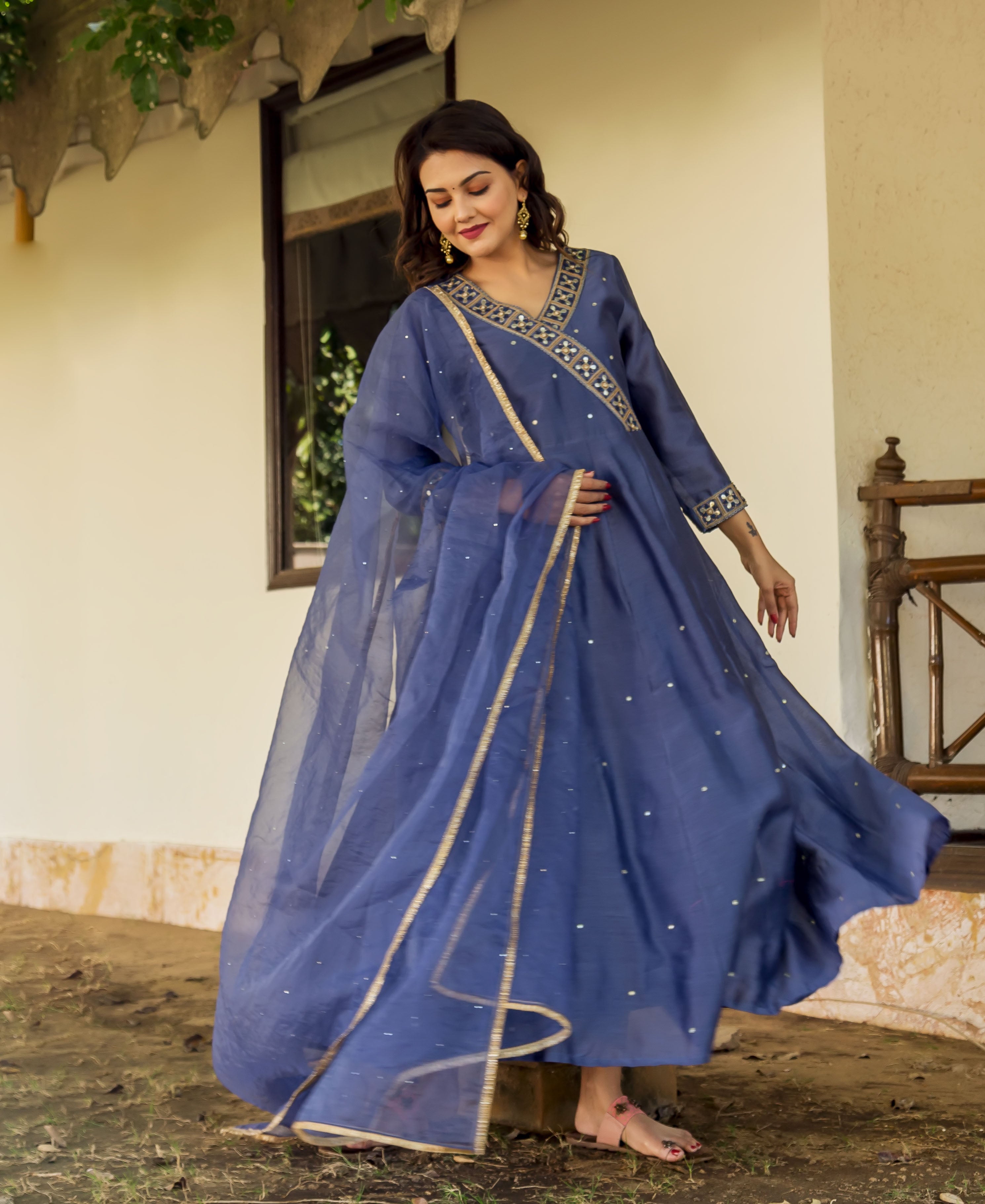 Turvi Steel Blue Hand Embroidered Chanderi Dress