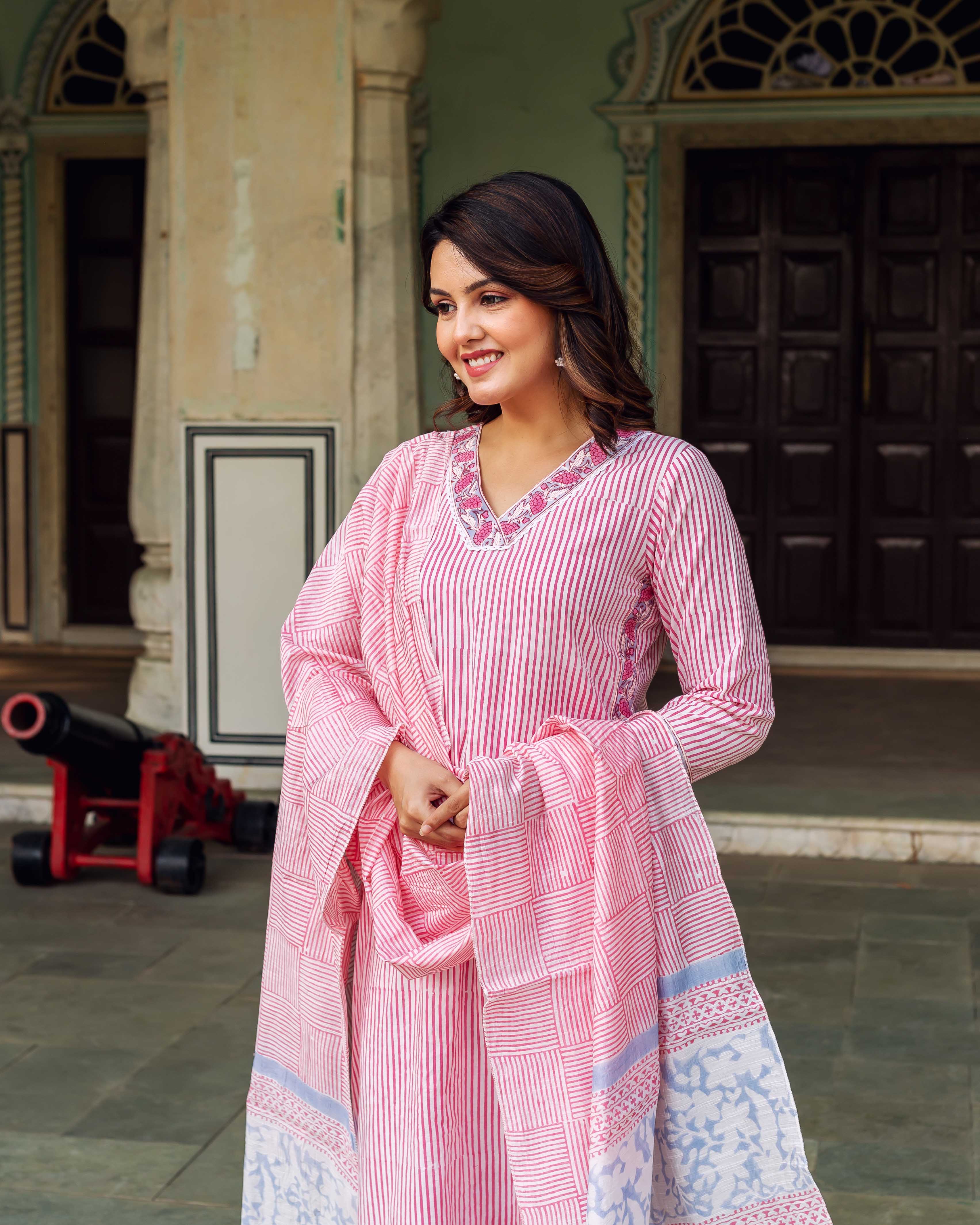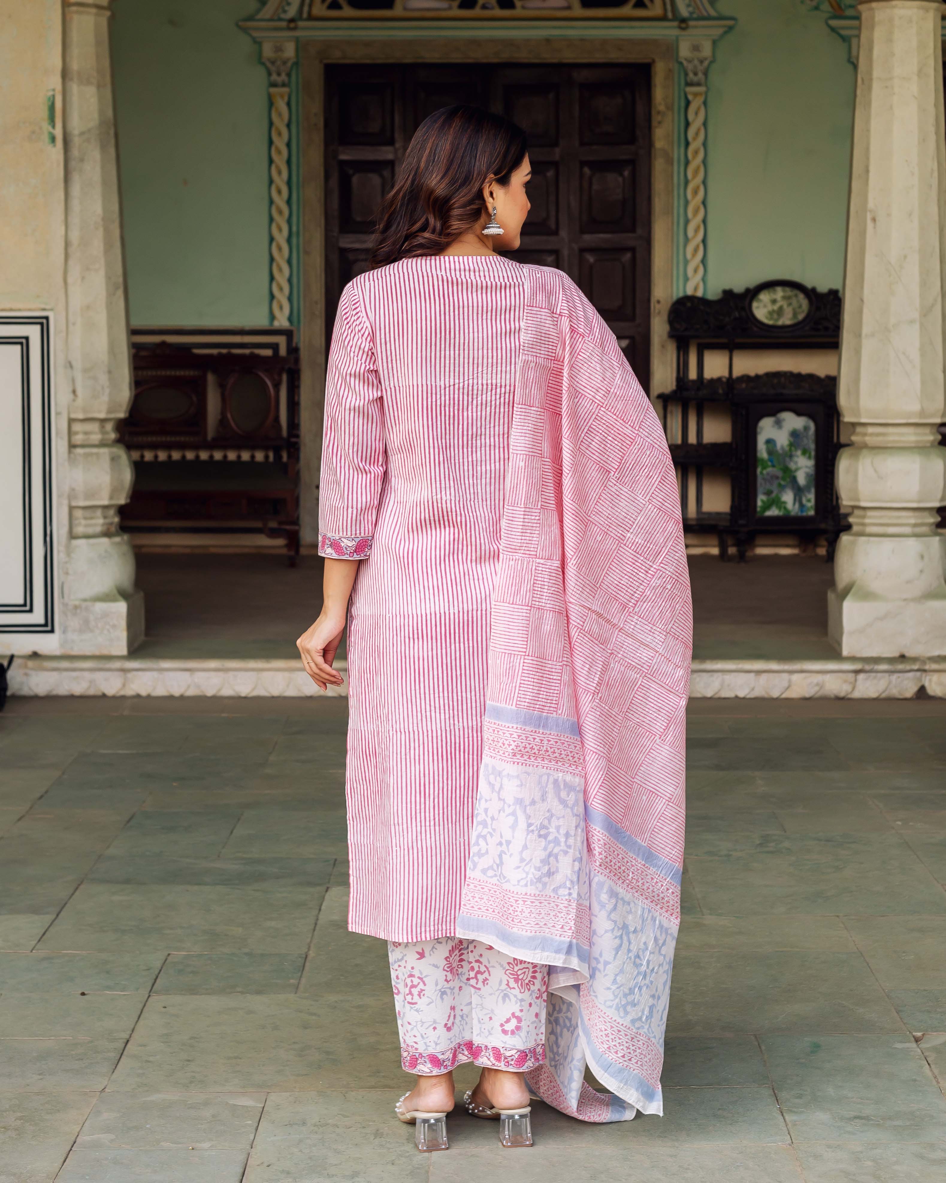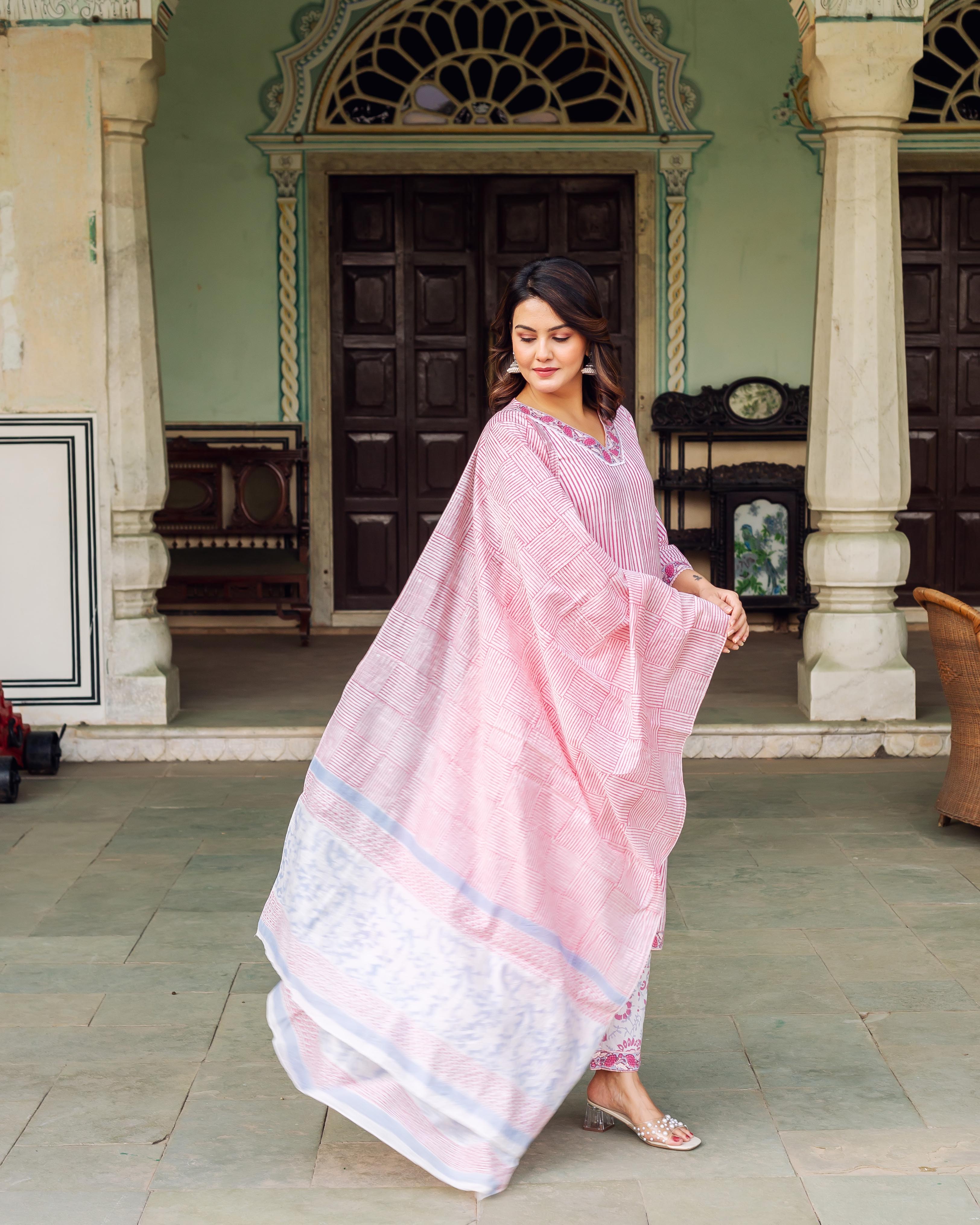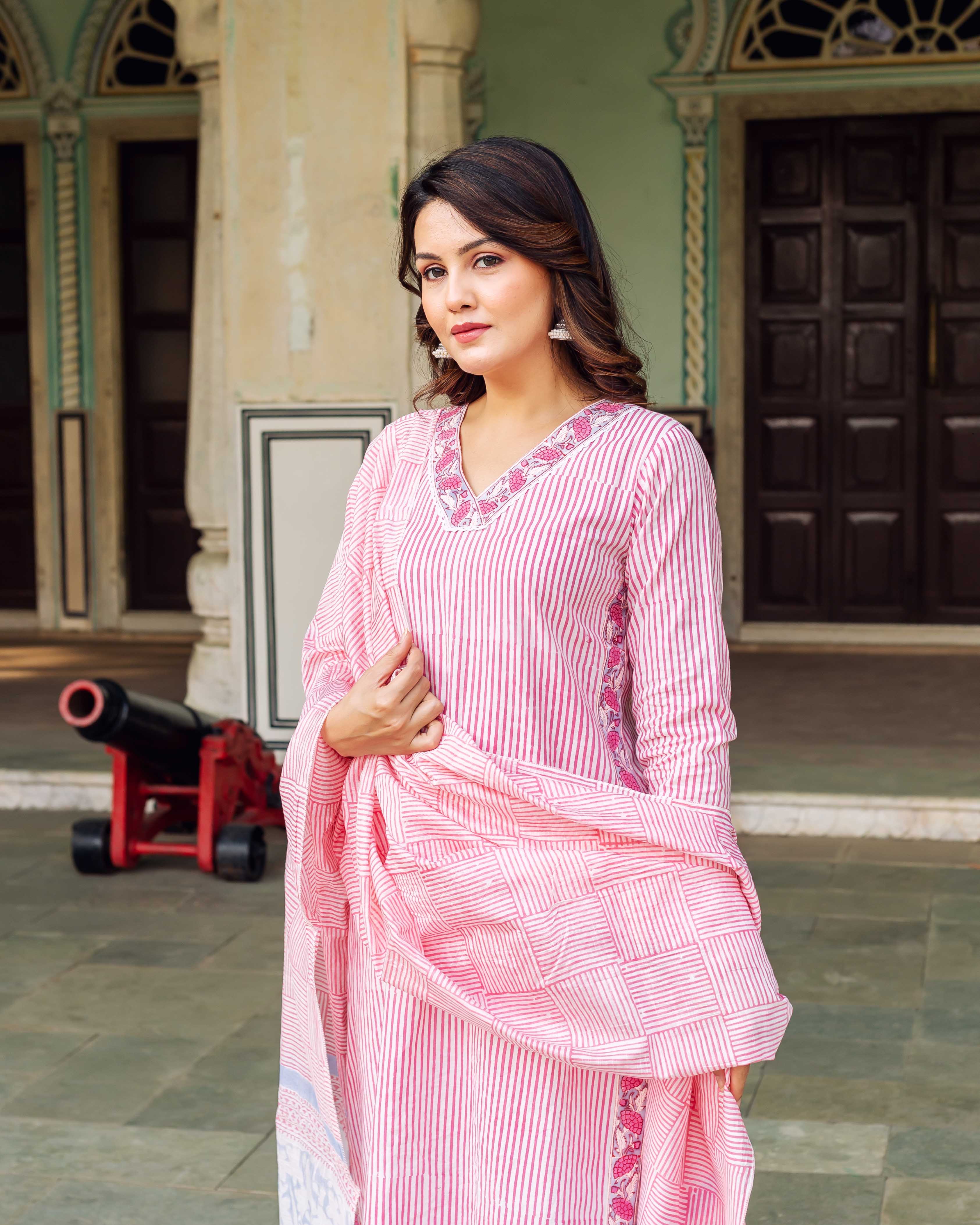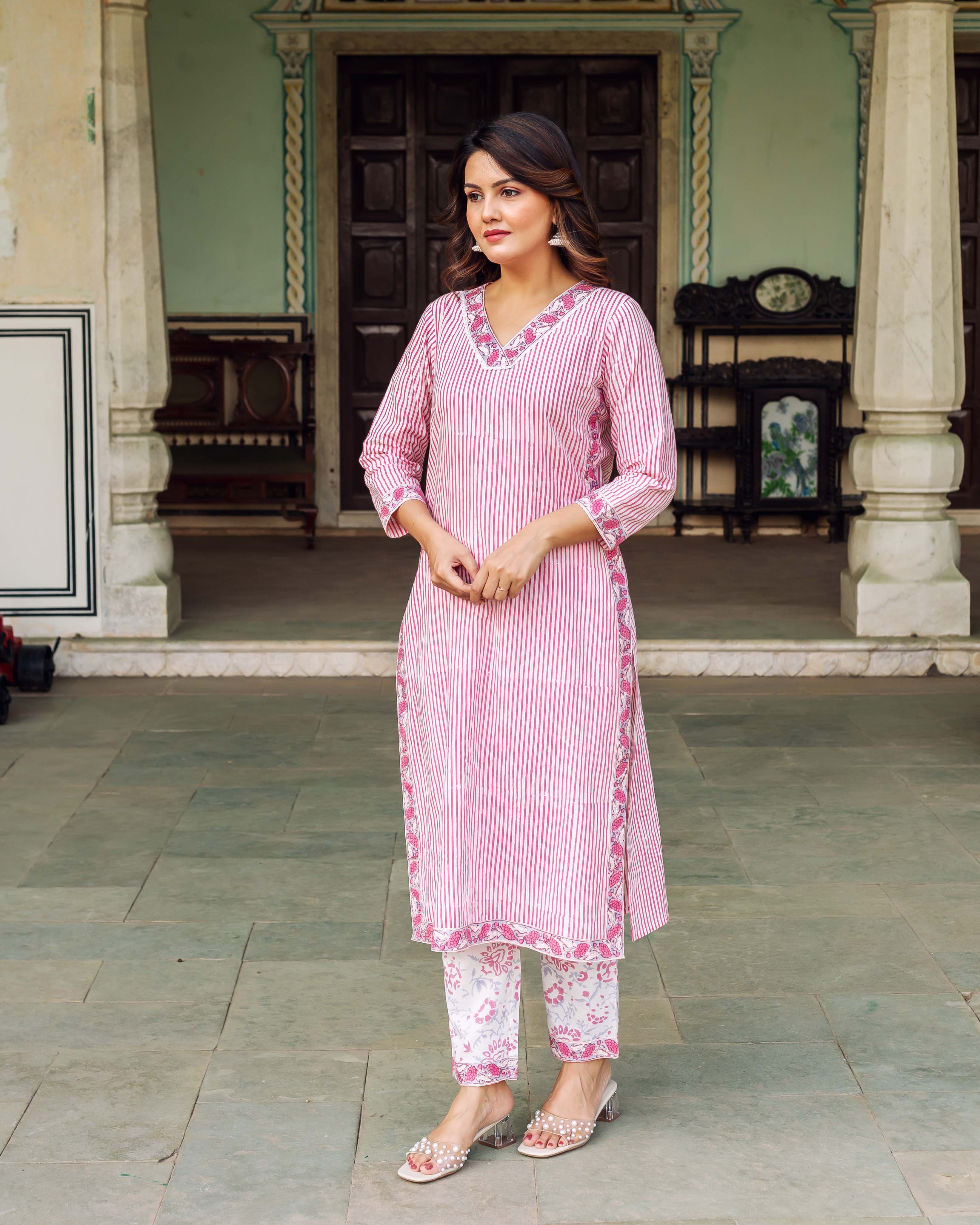 Product Description: Enhance your wardrobe with our White and Pink Stripe Elegance Kurta. This stunning white kurta, crafted from high-quality cotton fabric, features block printed pink stripes with exquisite border details on the sides and neck. The V-neck and 3/4 sleeves add a refined touch to this versatile piece. Ideal for pairing with block printed pants and a Hand Block Printed Chanderi dupatta, this kurta seamlessly blends traditional charm with contemporary style. The cotton lining ensures maximum comfort, making it a perfect choice for any occasion