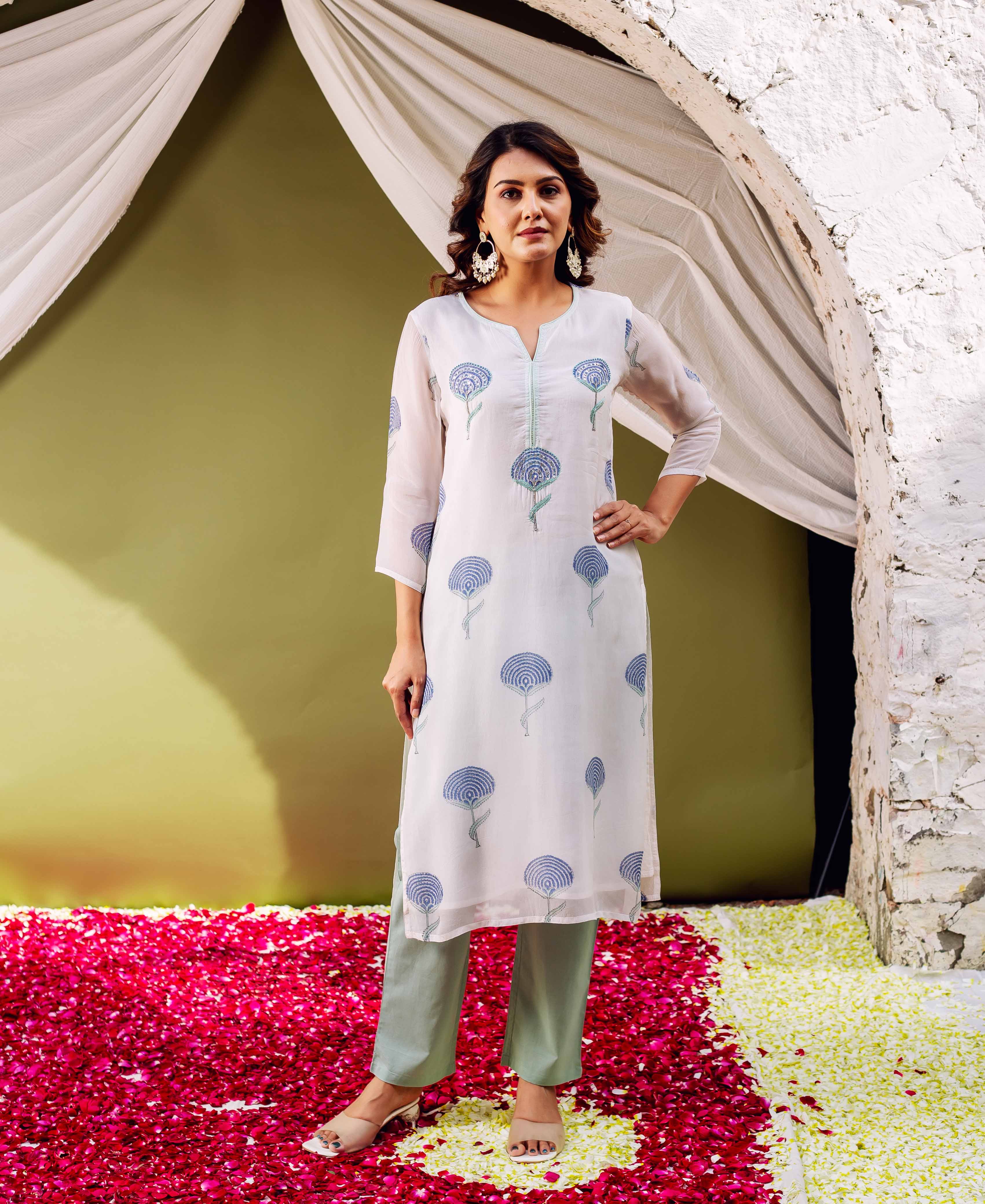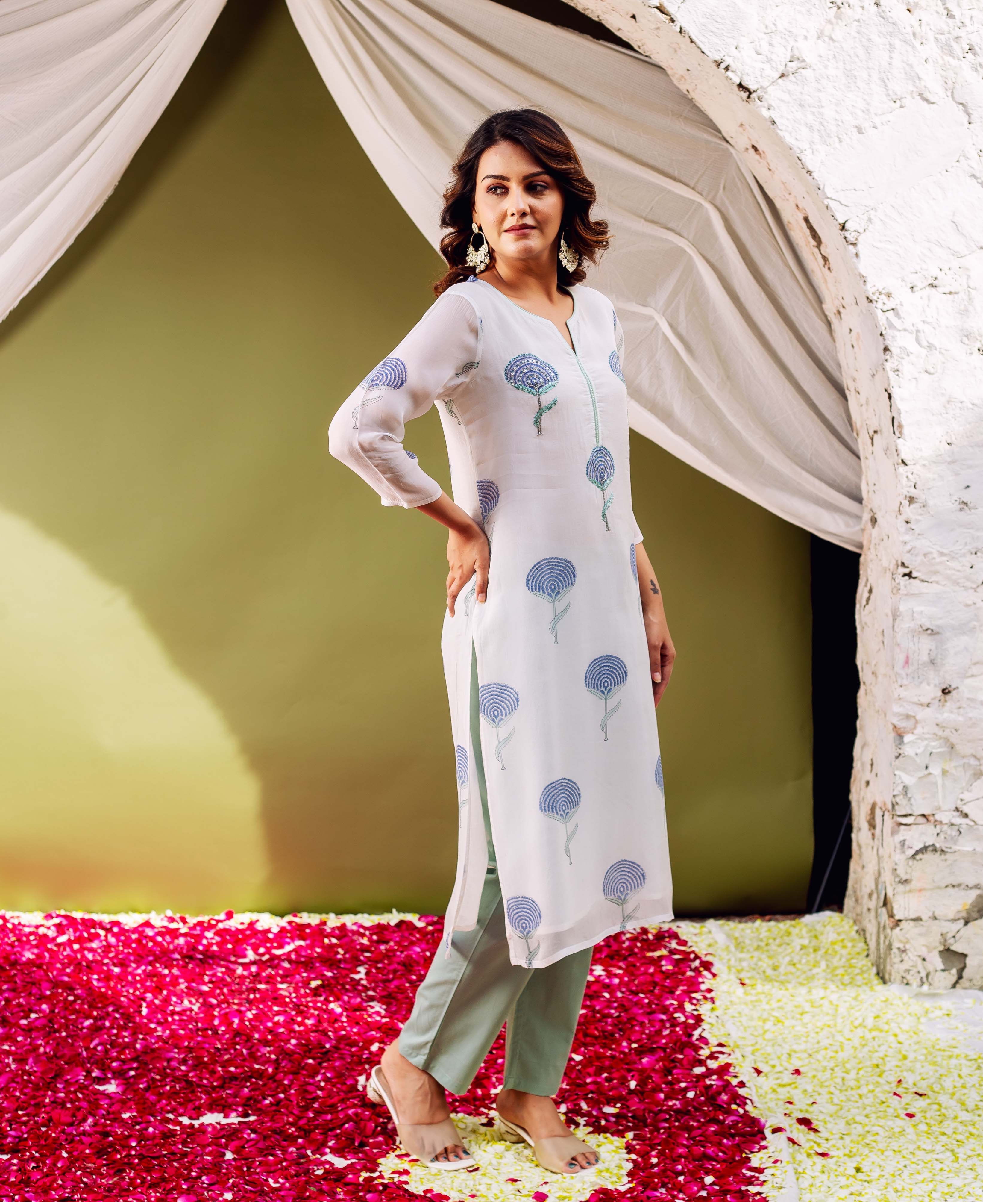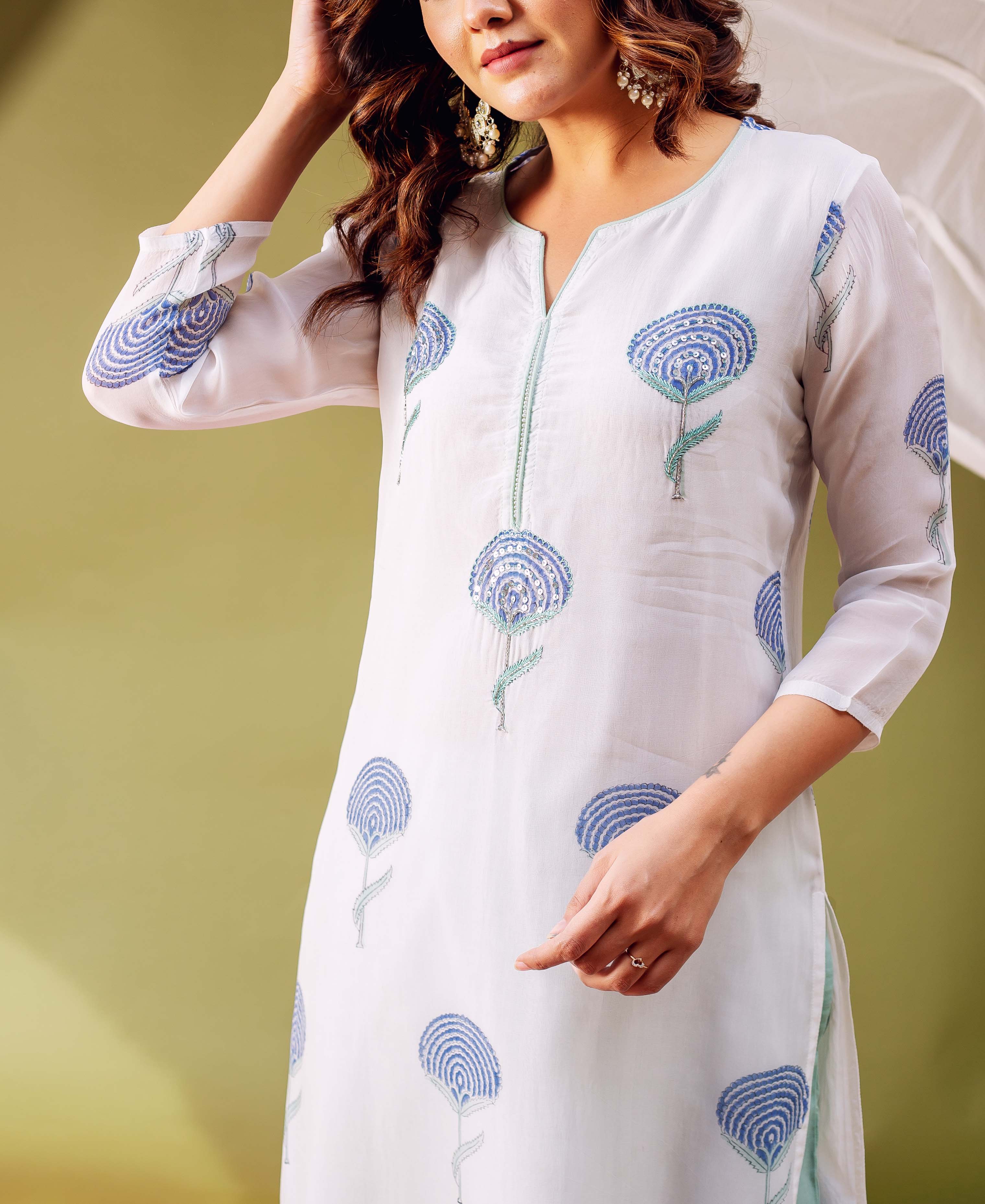 White Hand Block Printed Organza Kurta