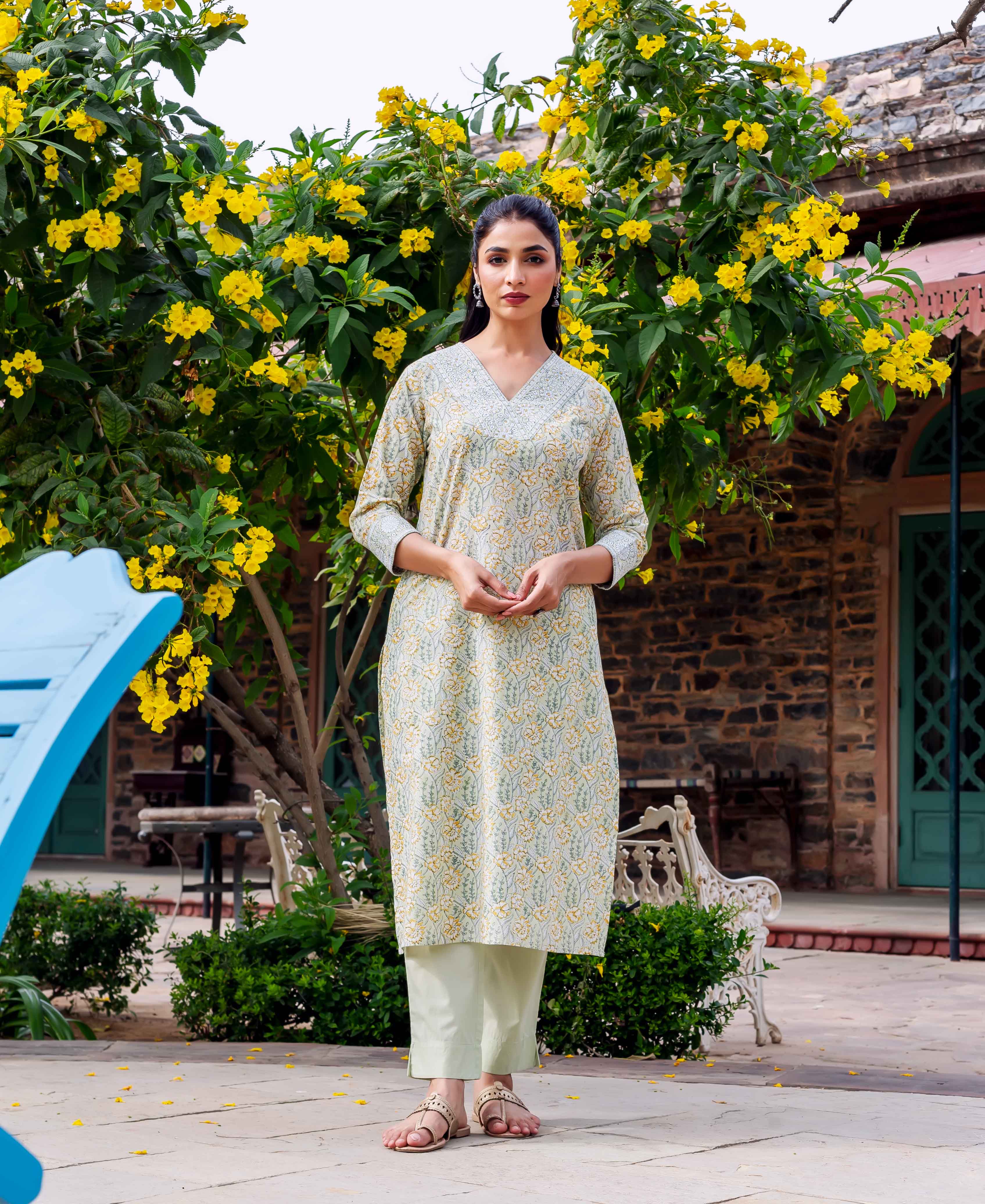 - Color: Mint green with hand block-printed floral motifs in yellow and white, creating a fresh and elegant look.