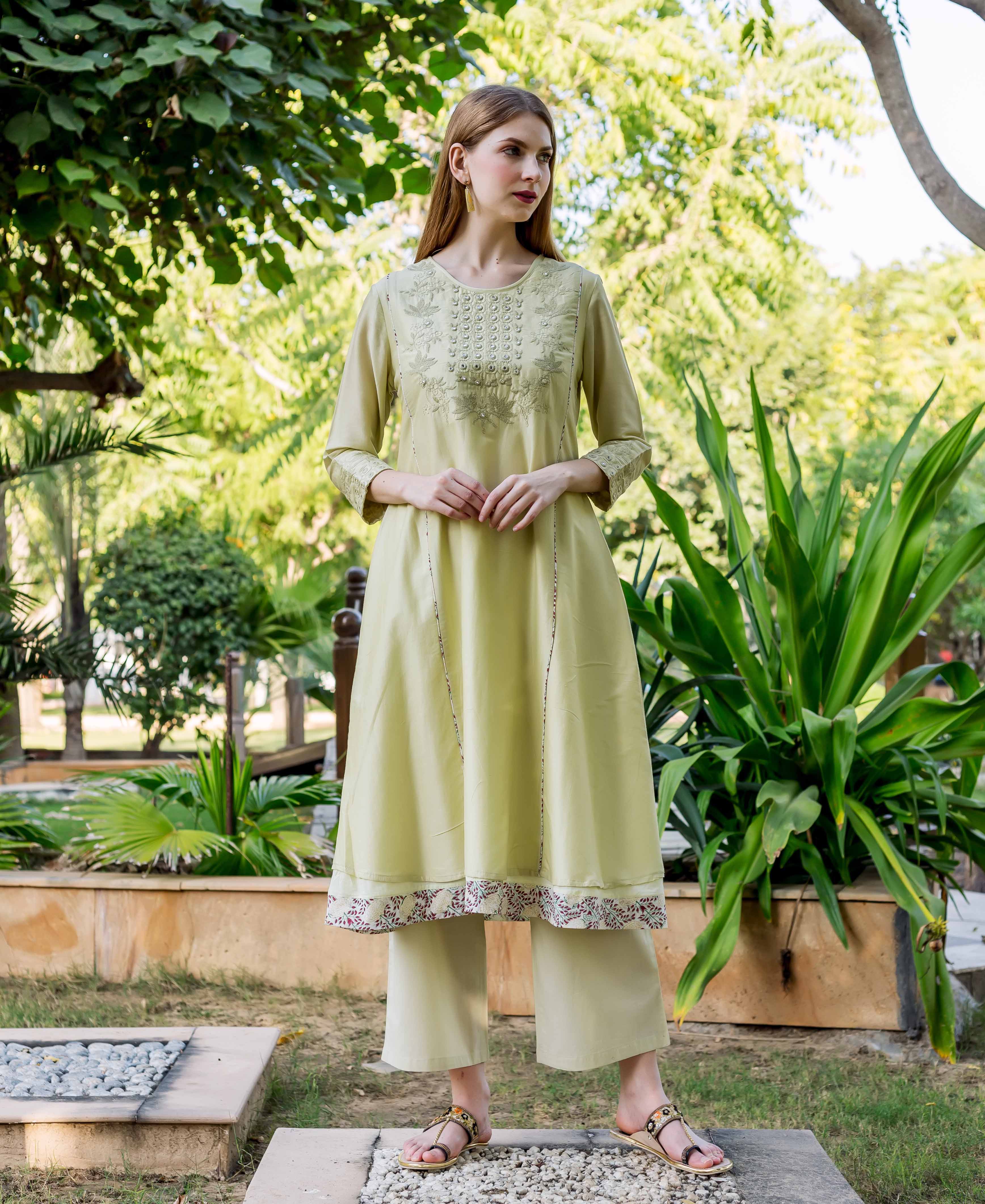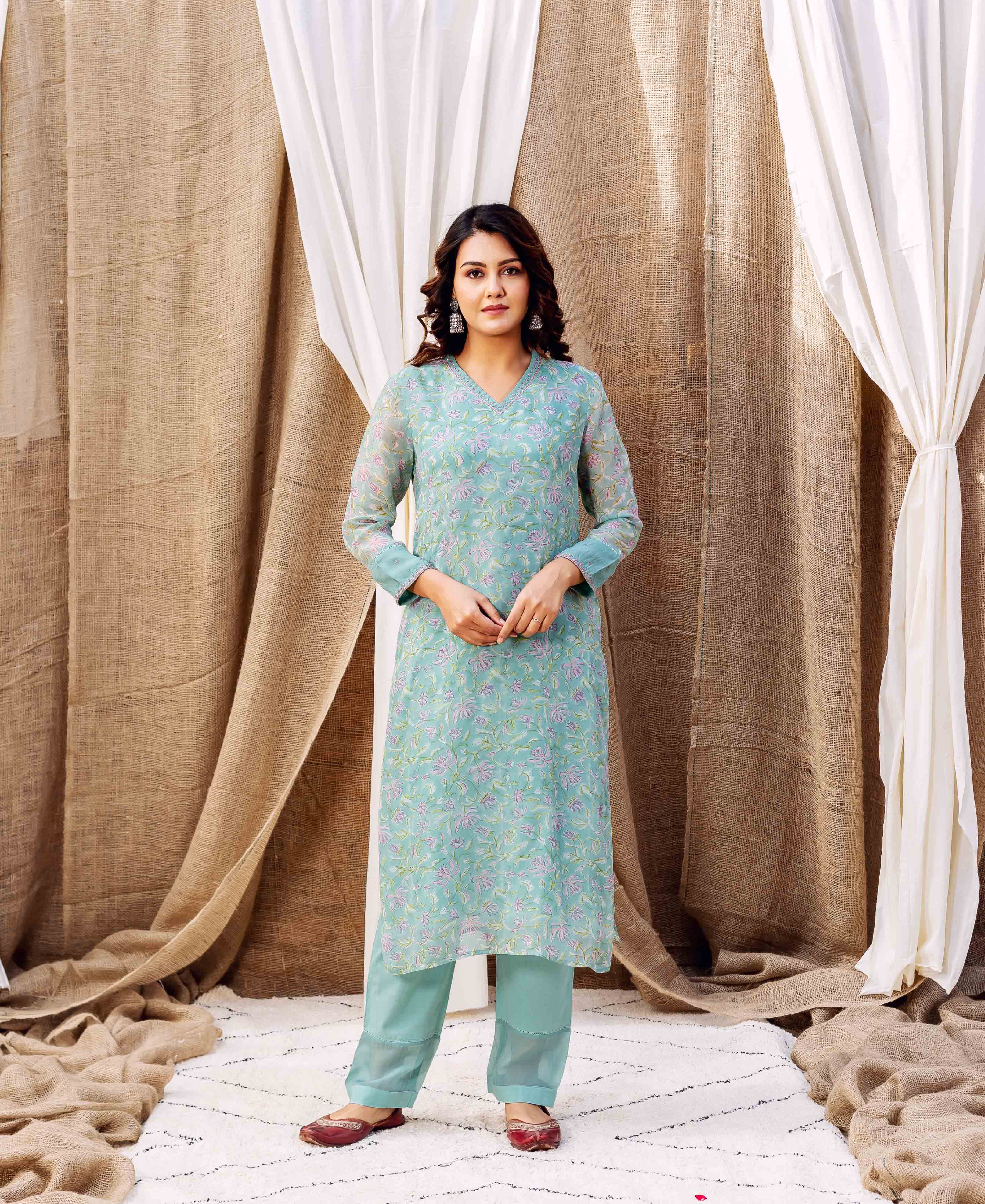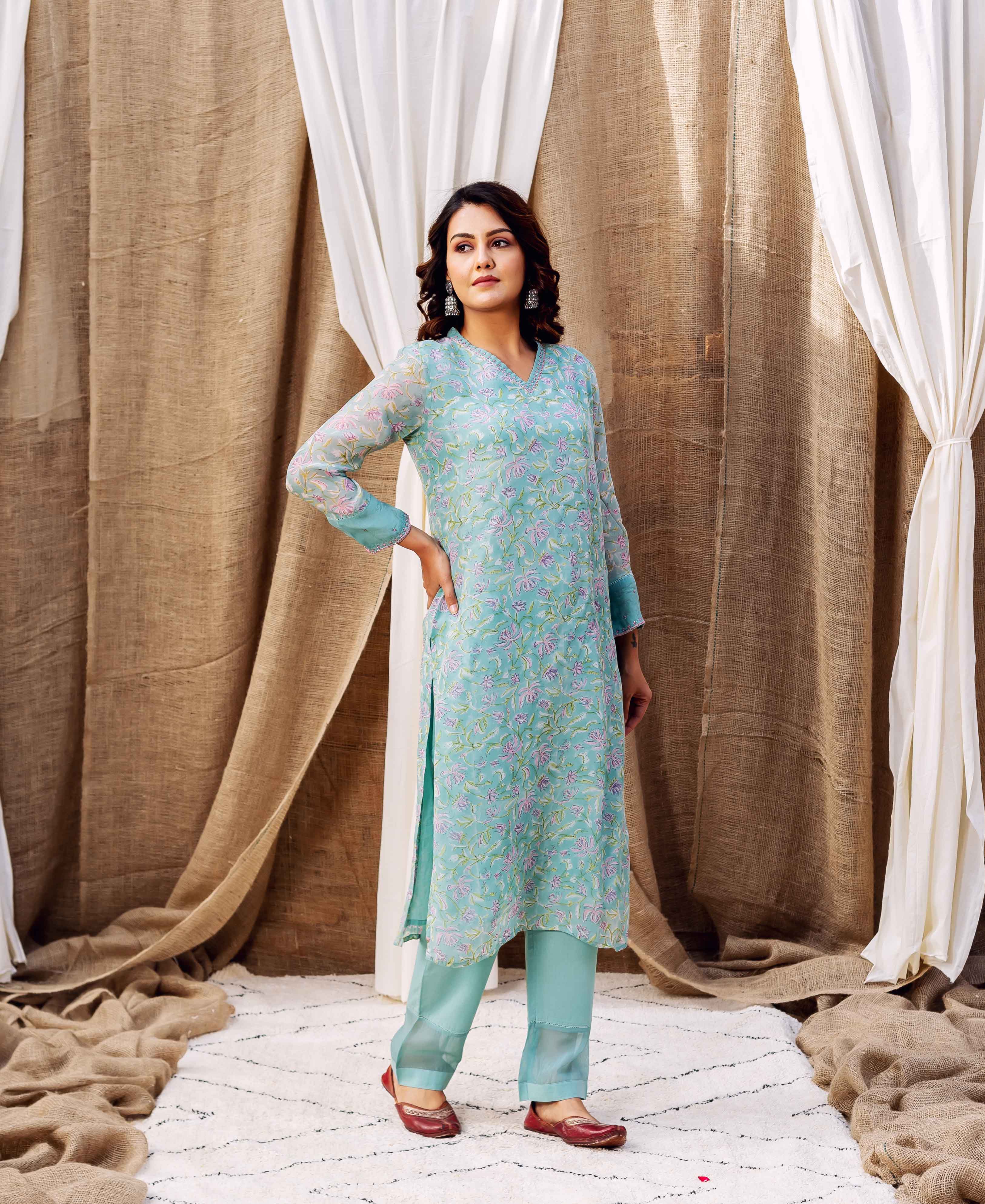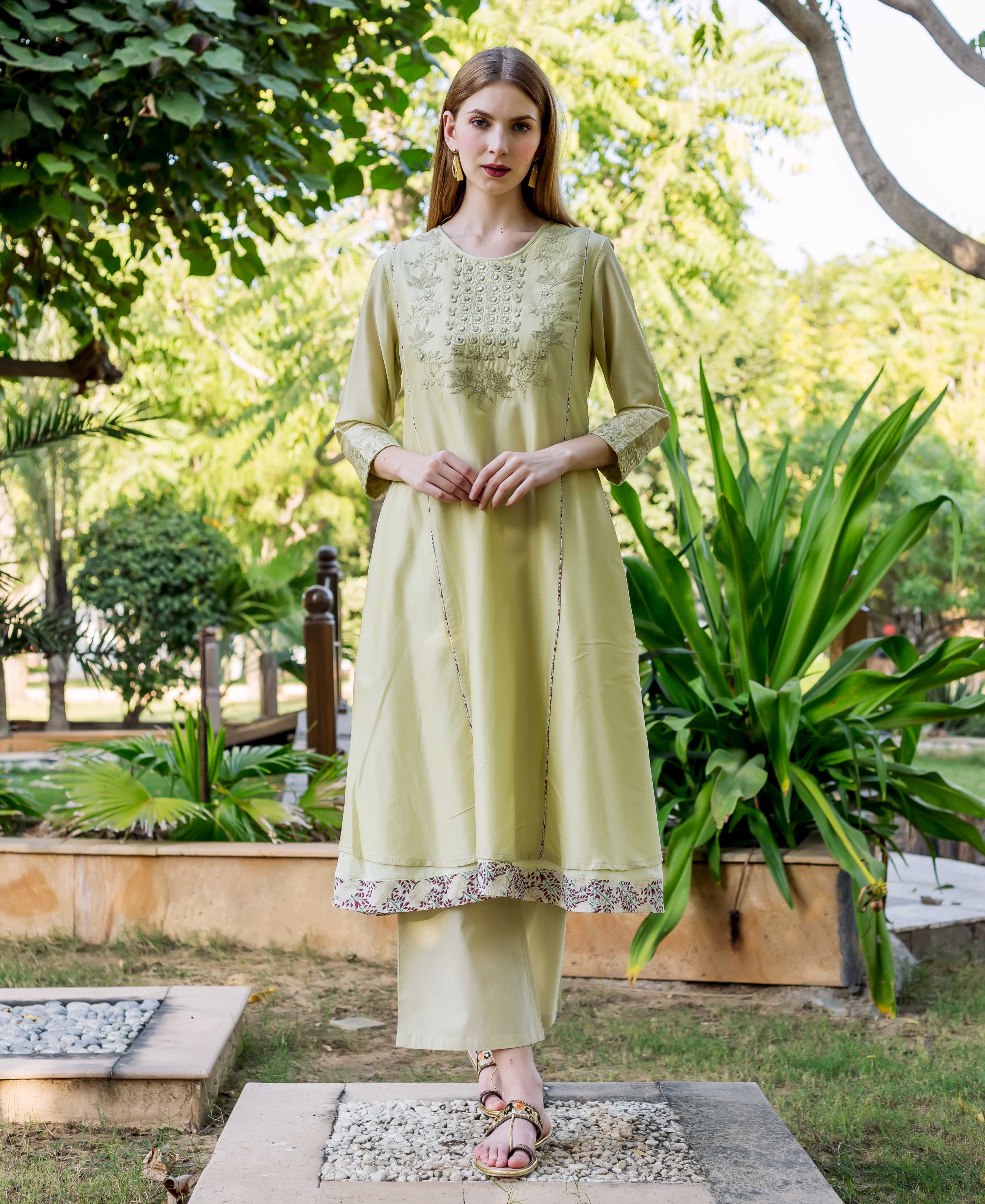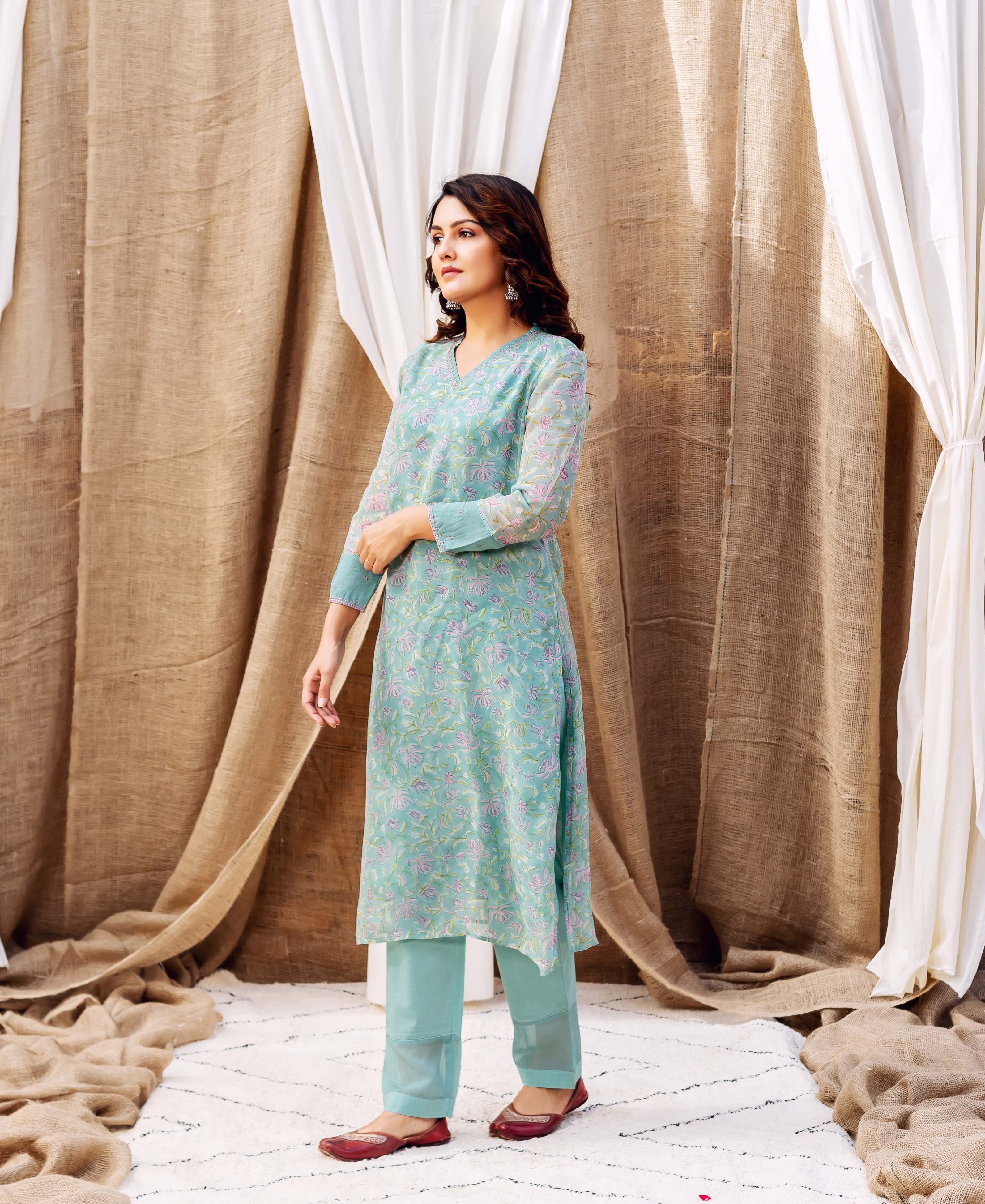 Sea Green Embroidered A-Line Kurta with Printed Hem