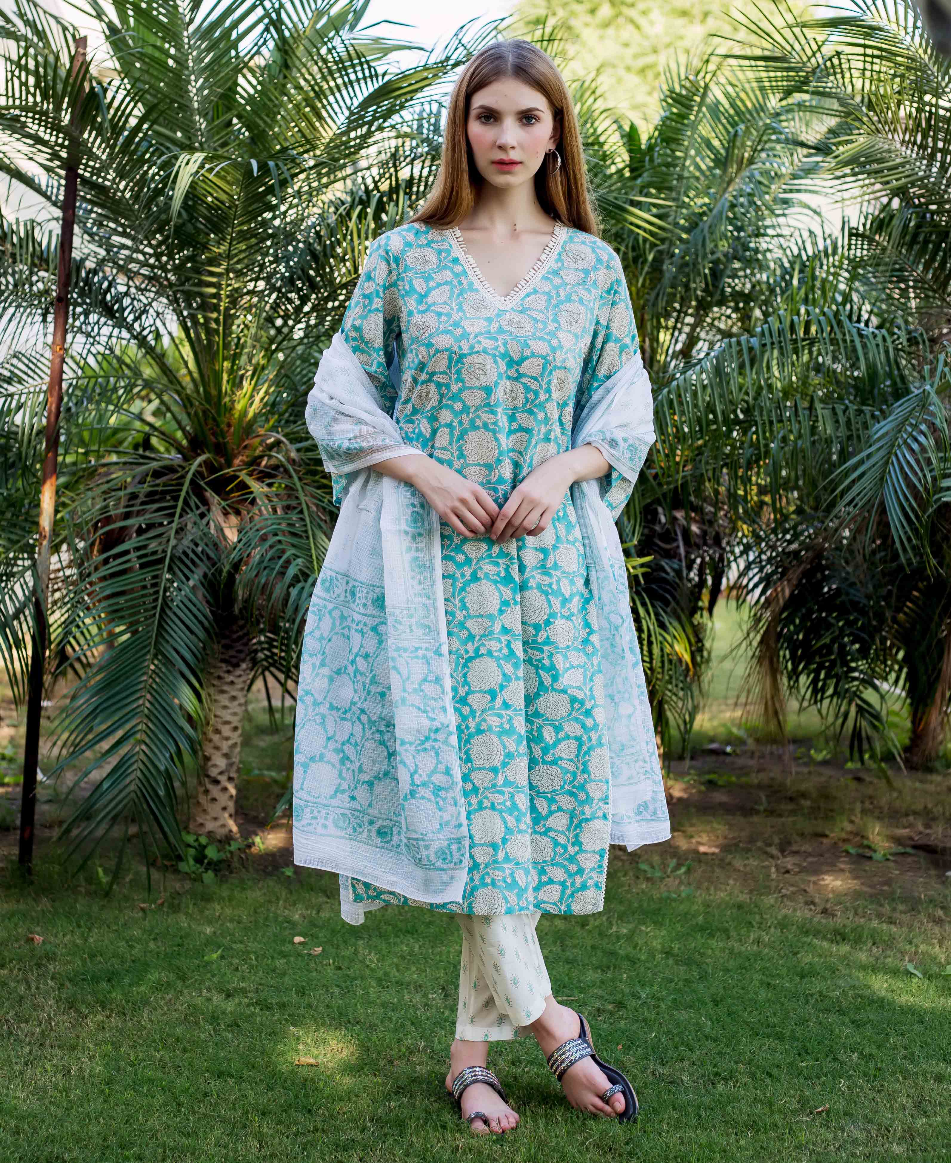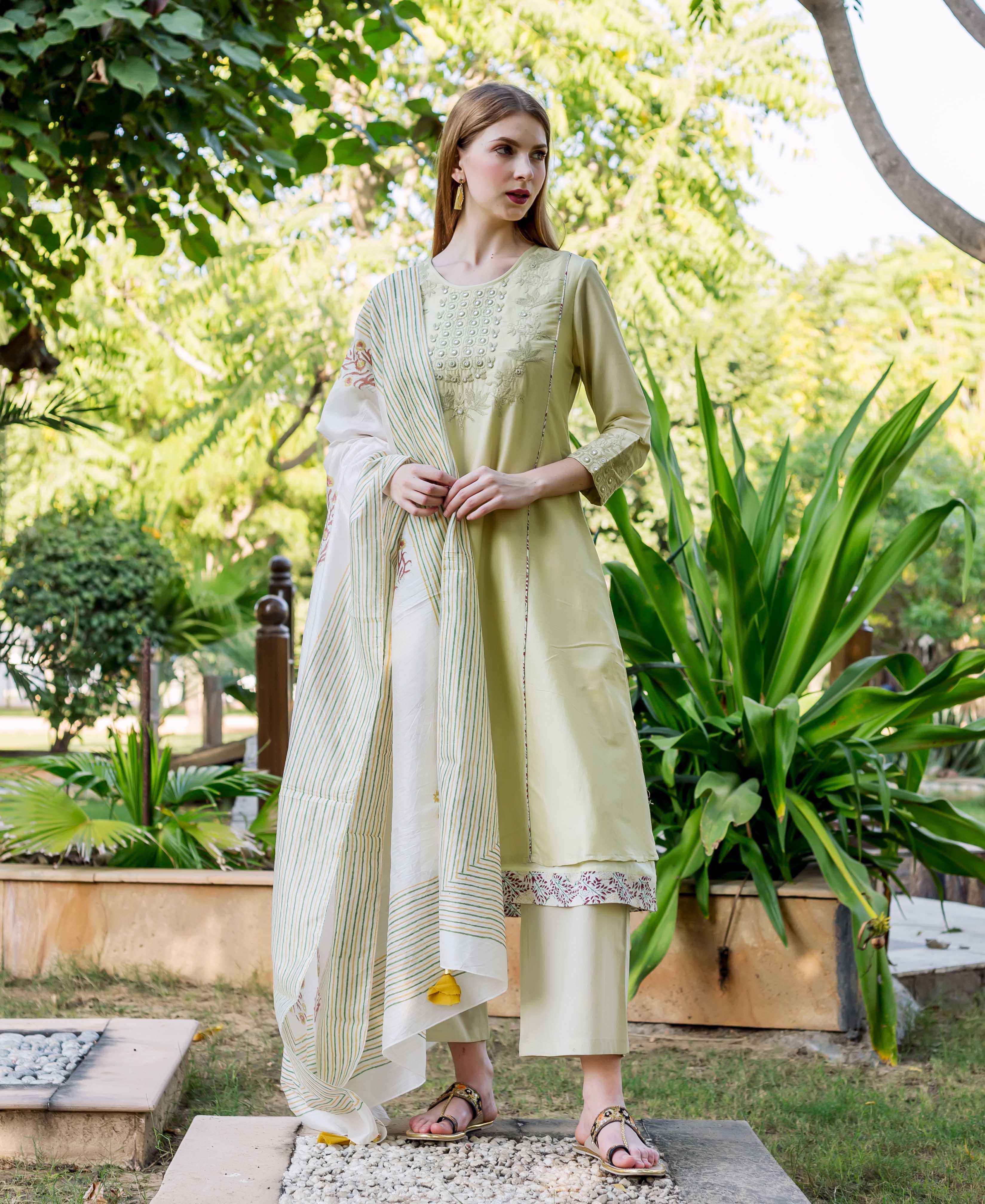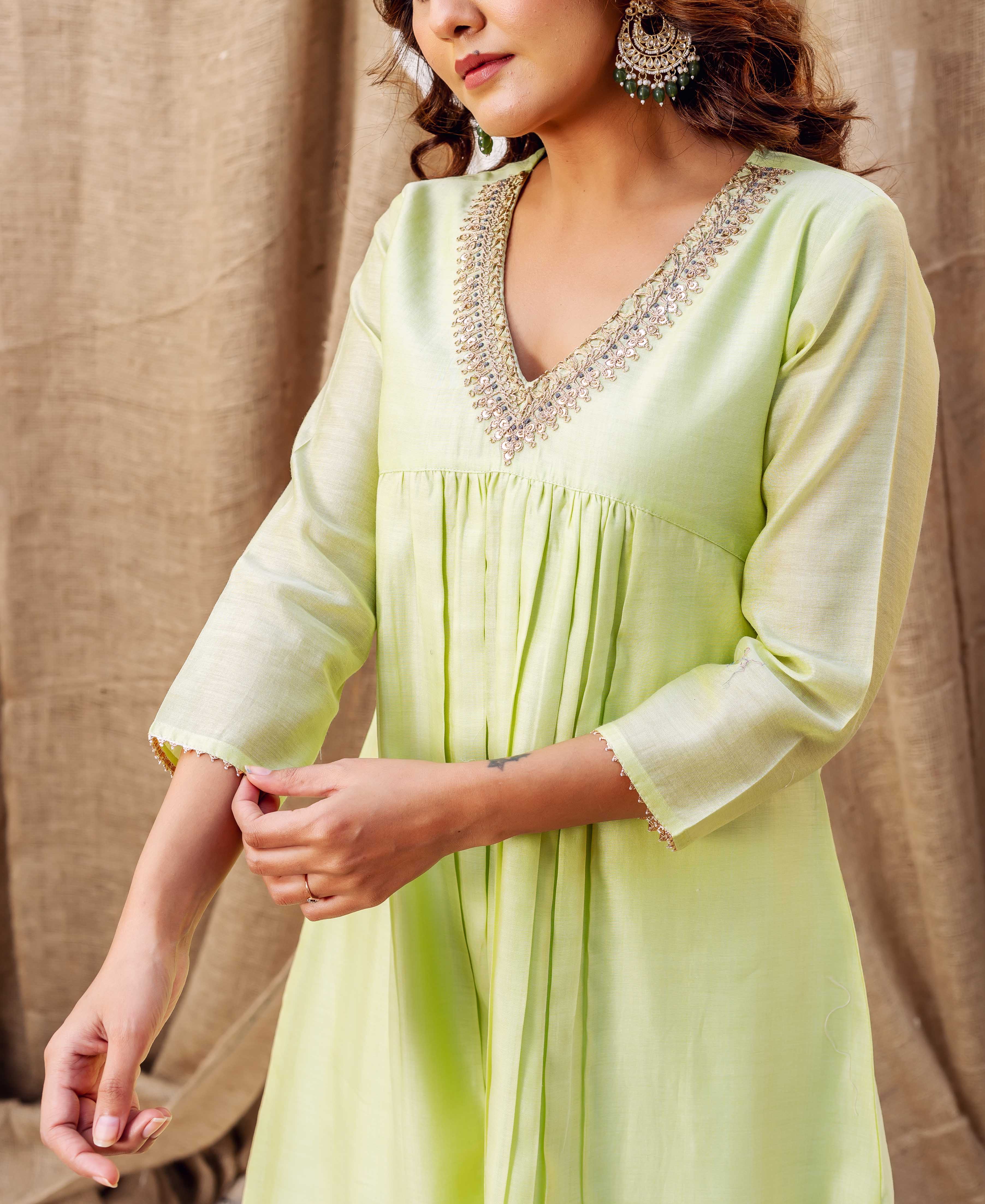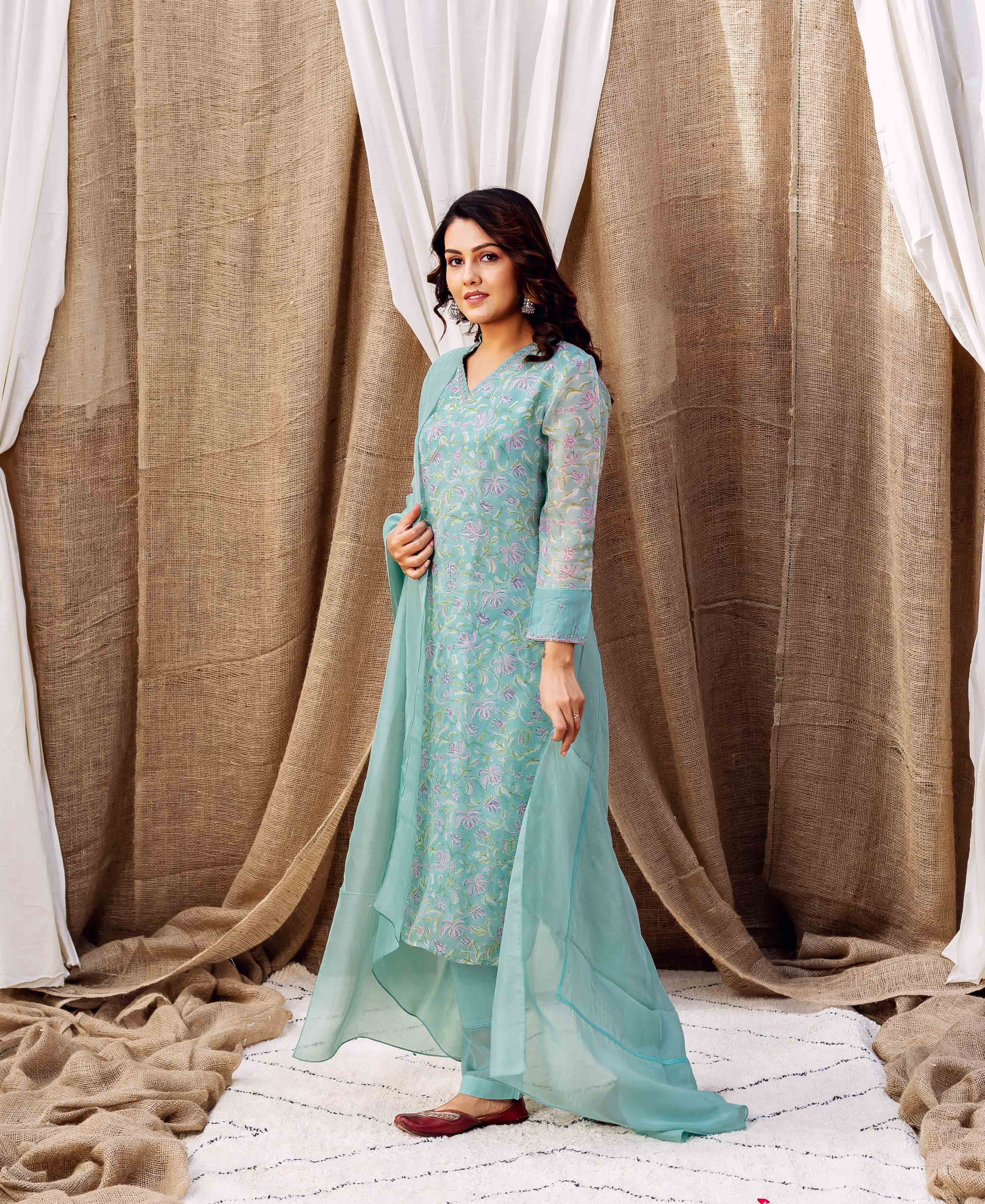 Sea Green Embroidered A-Line Kurta with Printed Hem