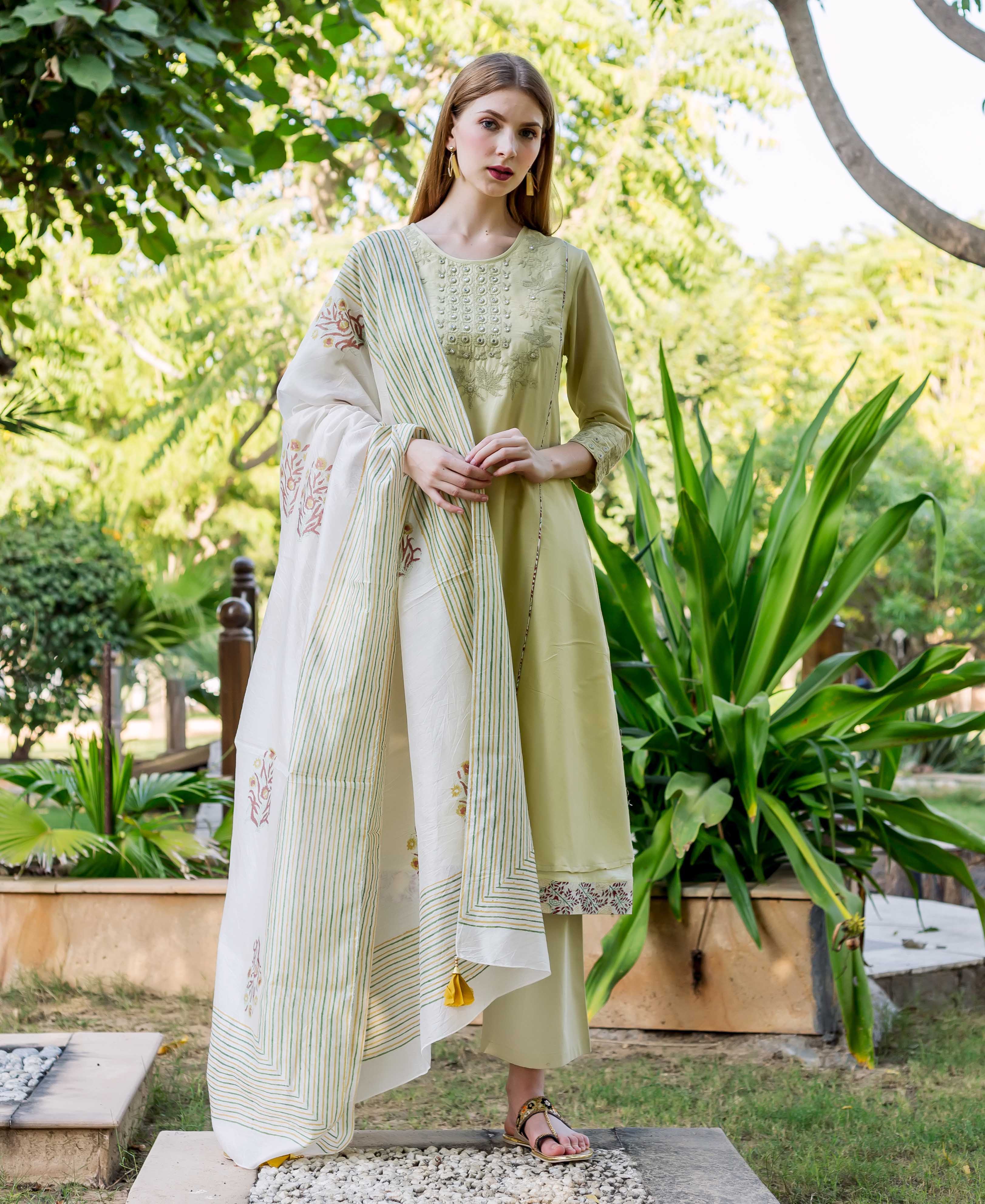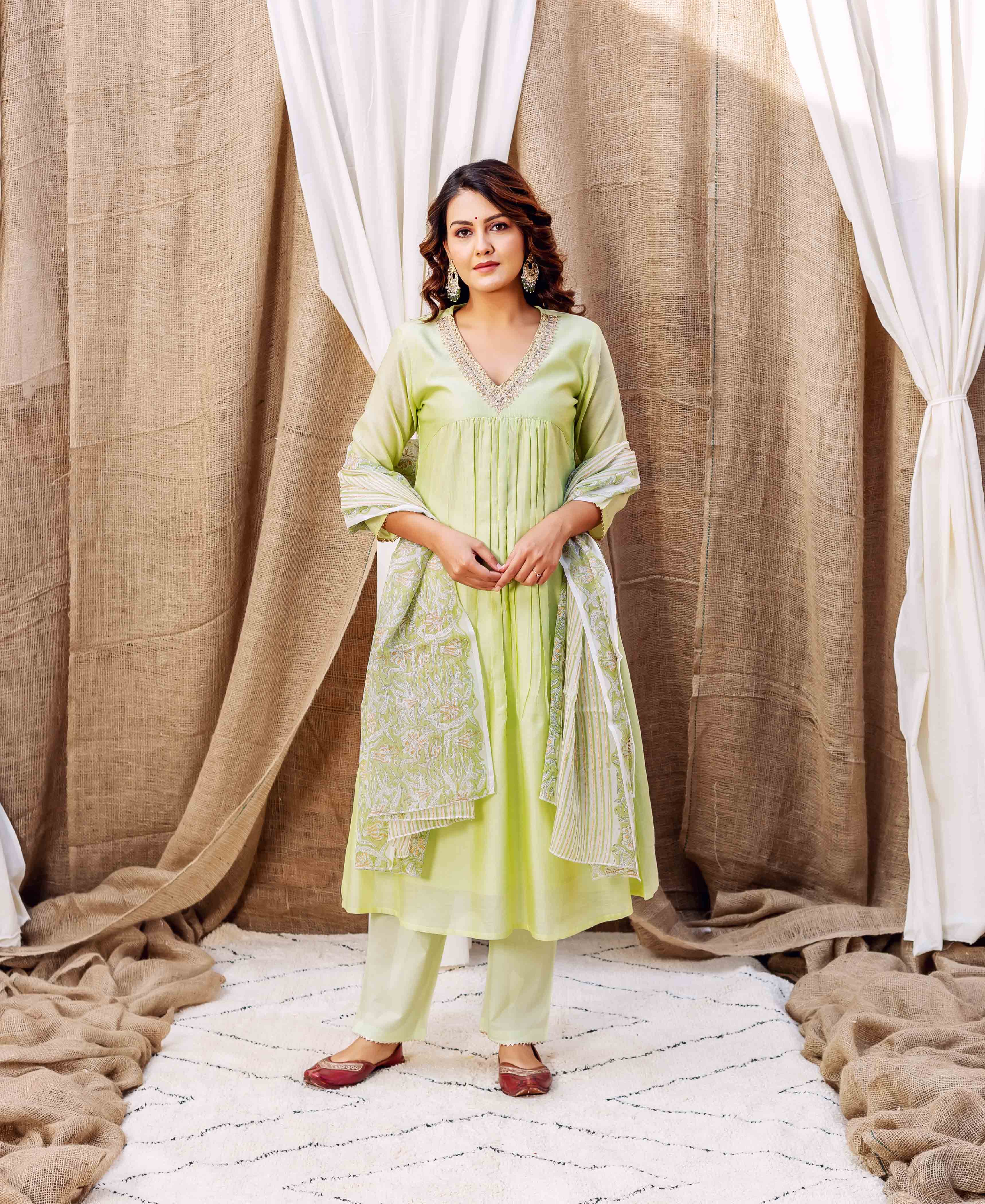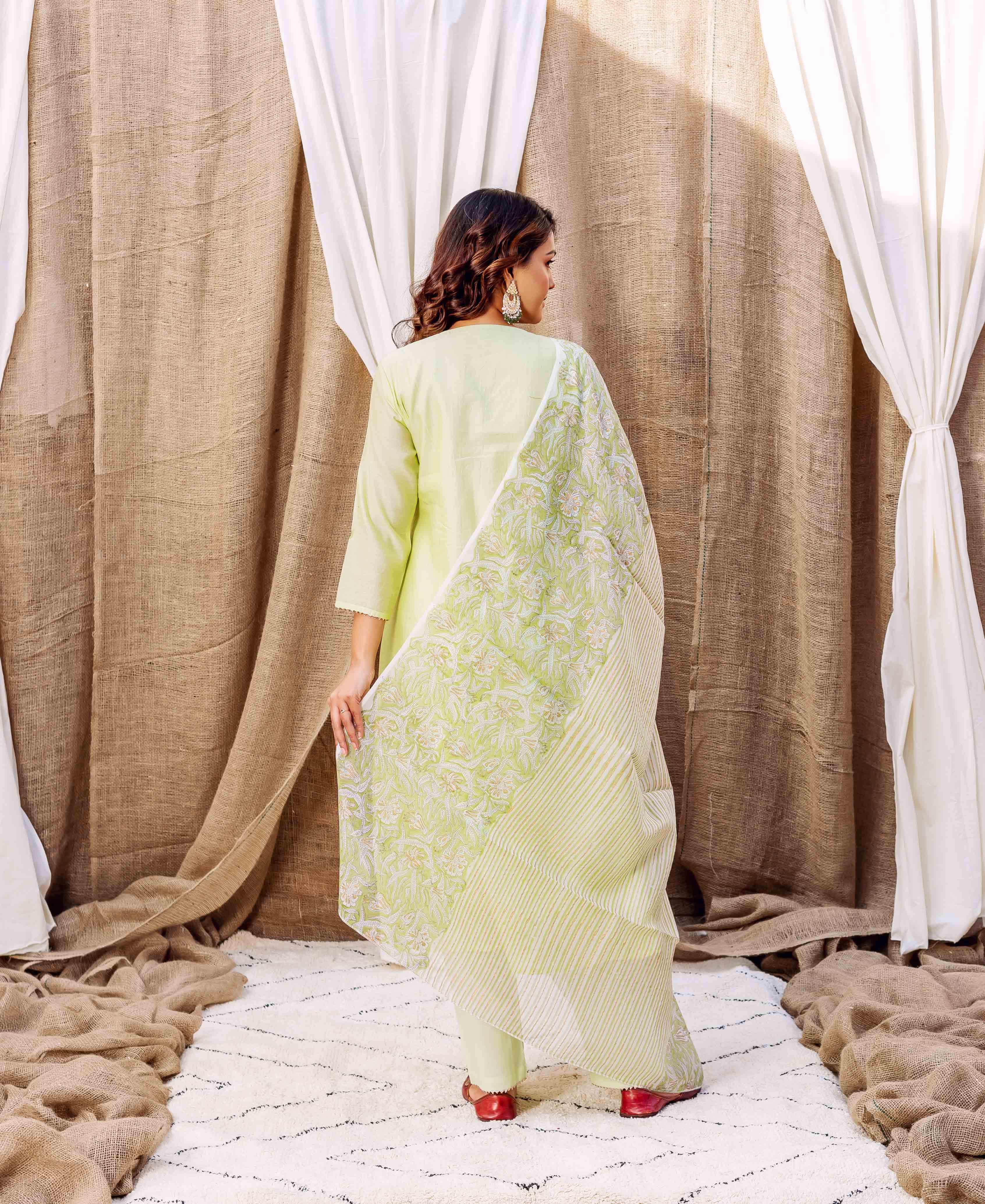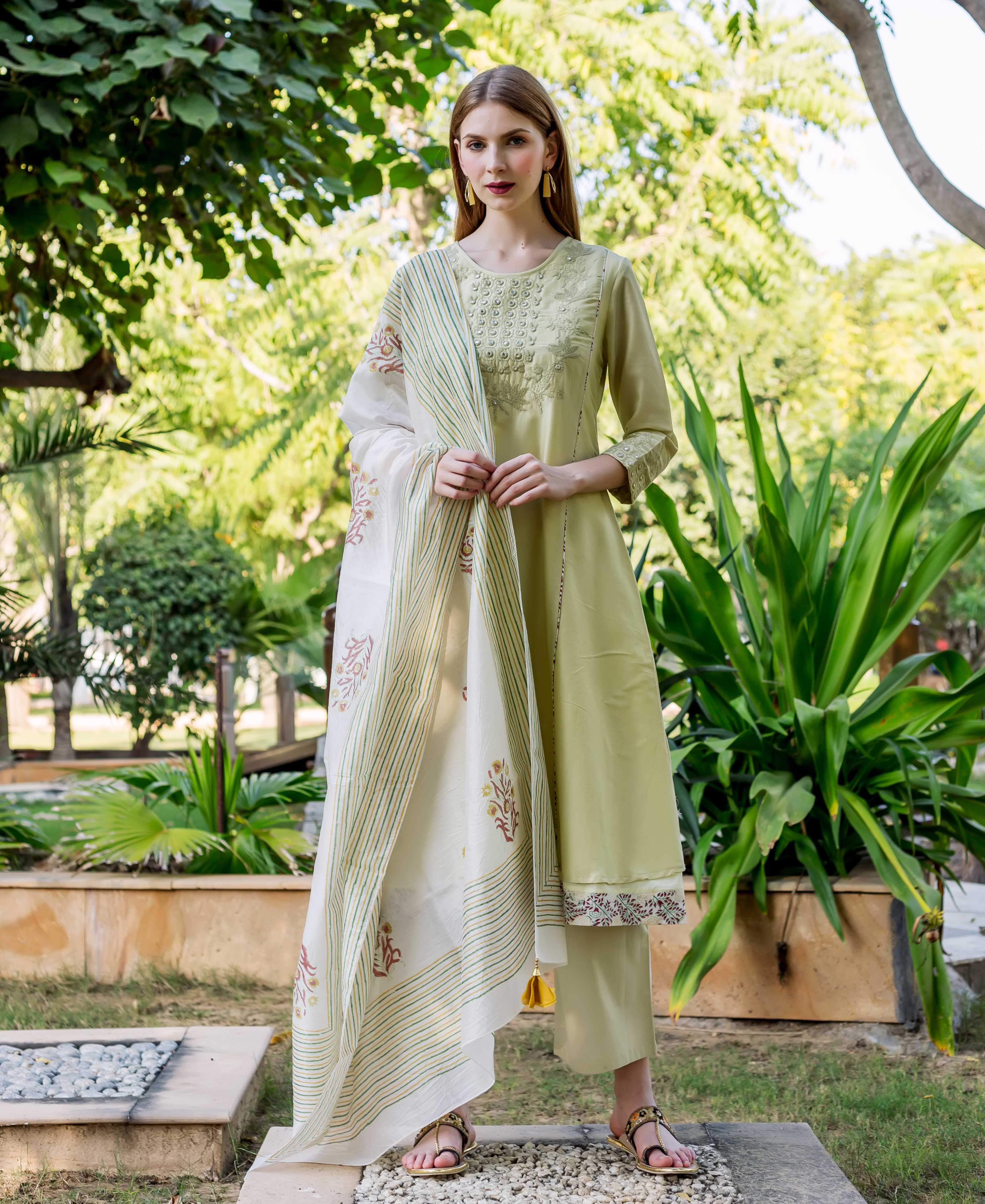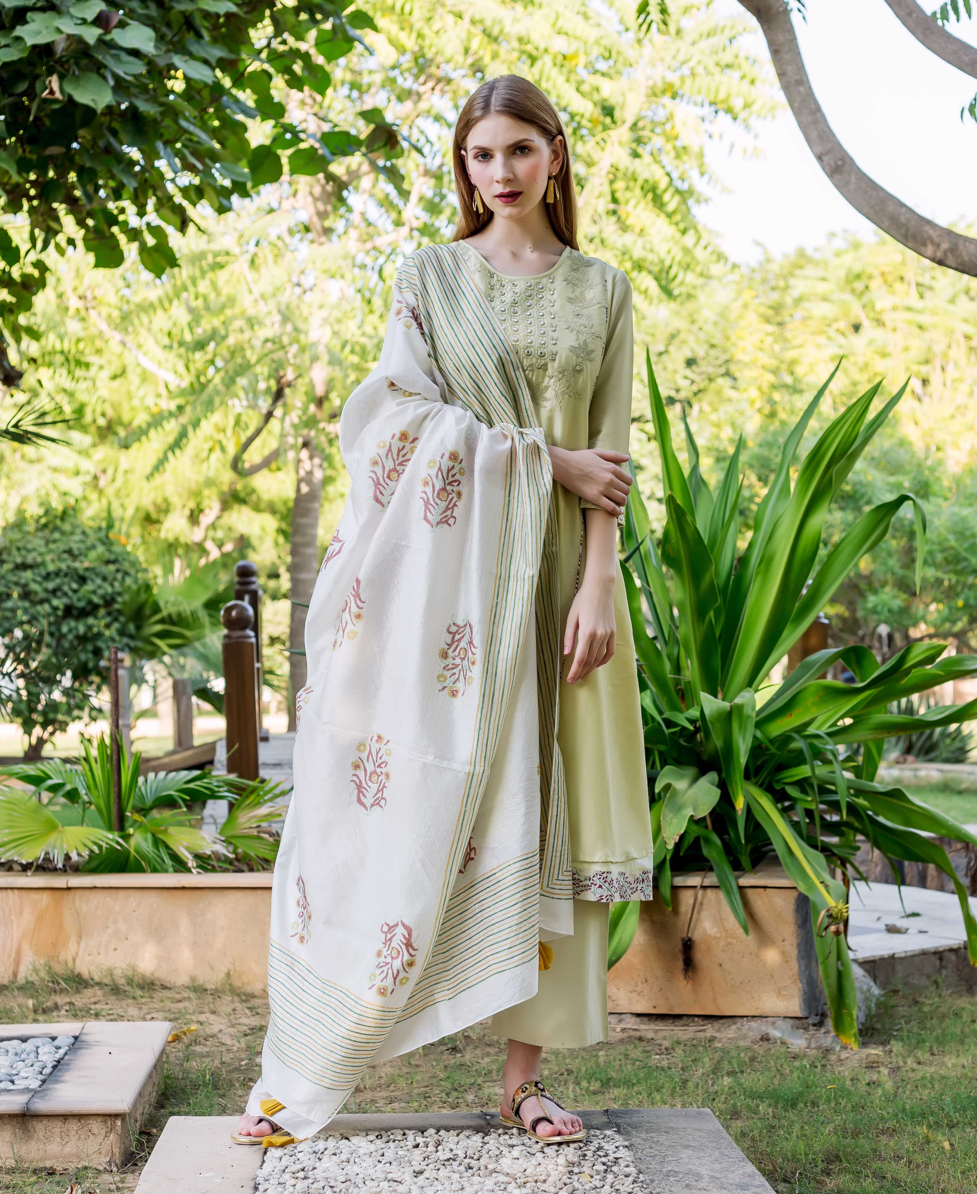 Sea Green Embroidered A-Line Kurta with Printed Hem
