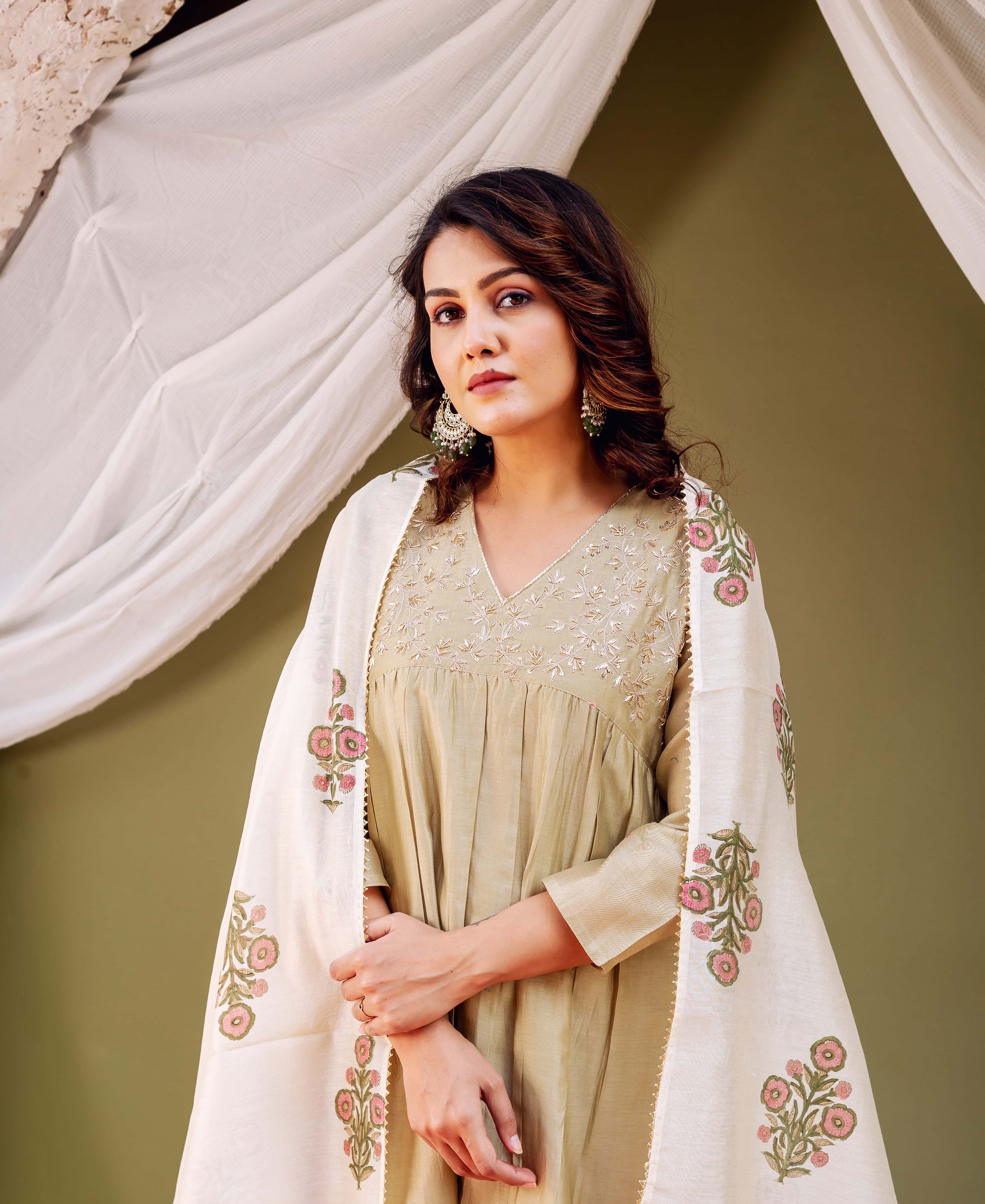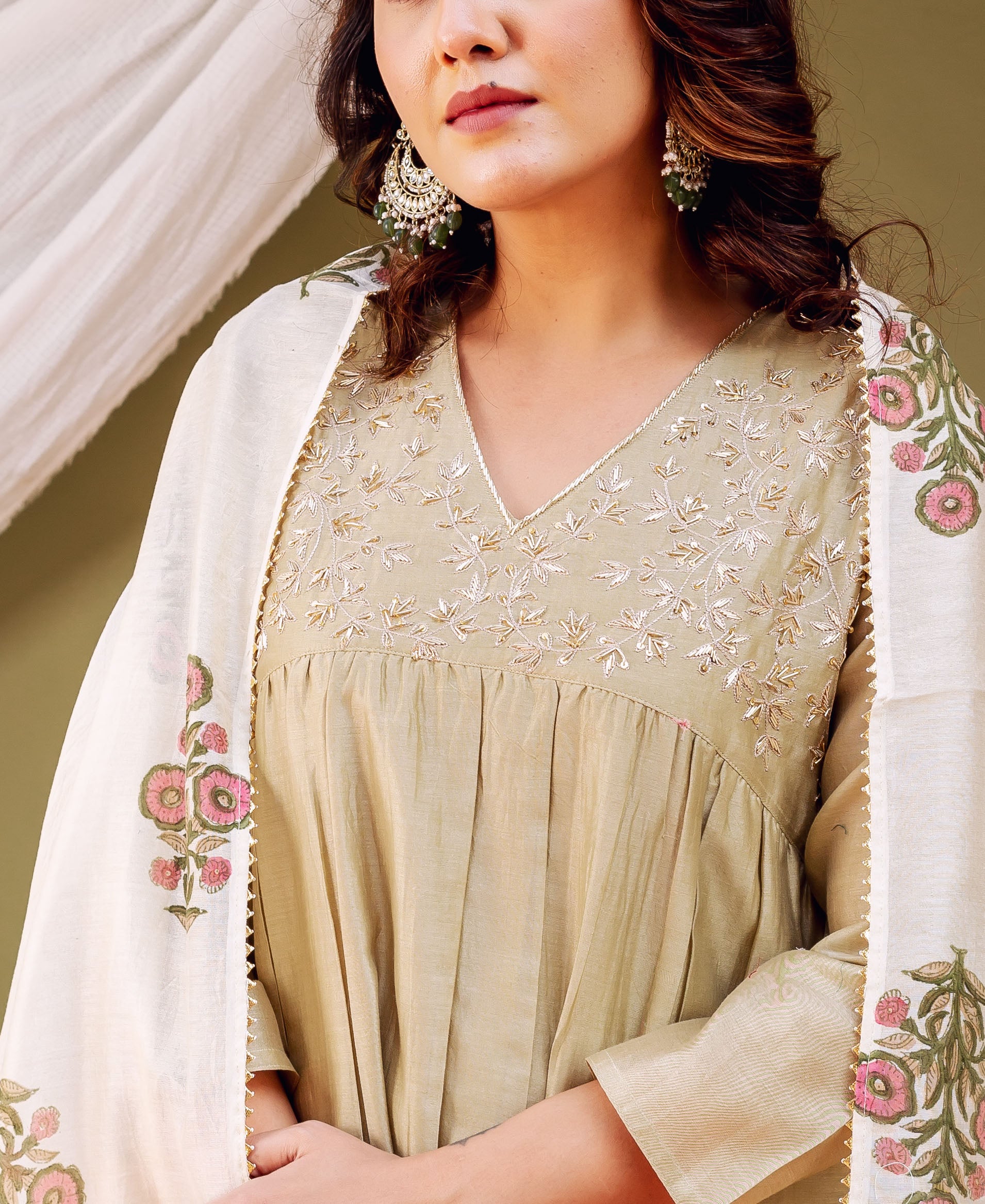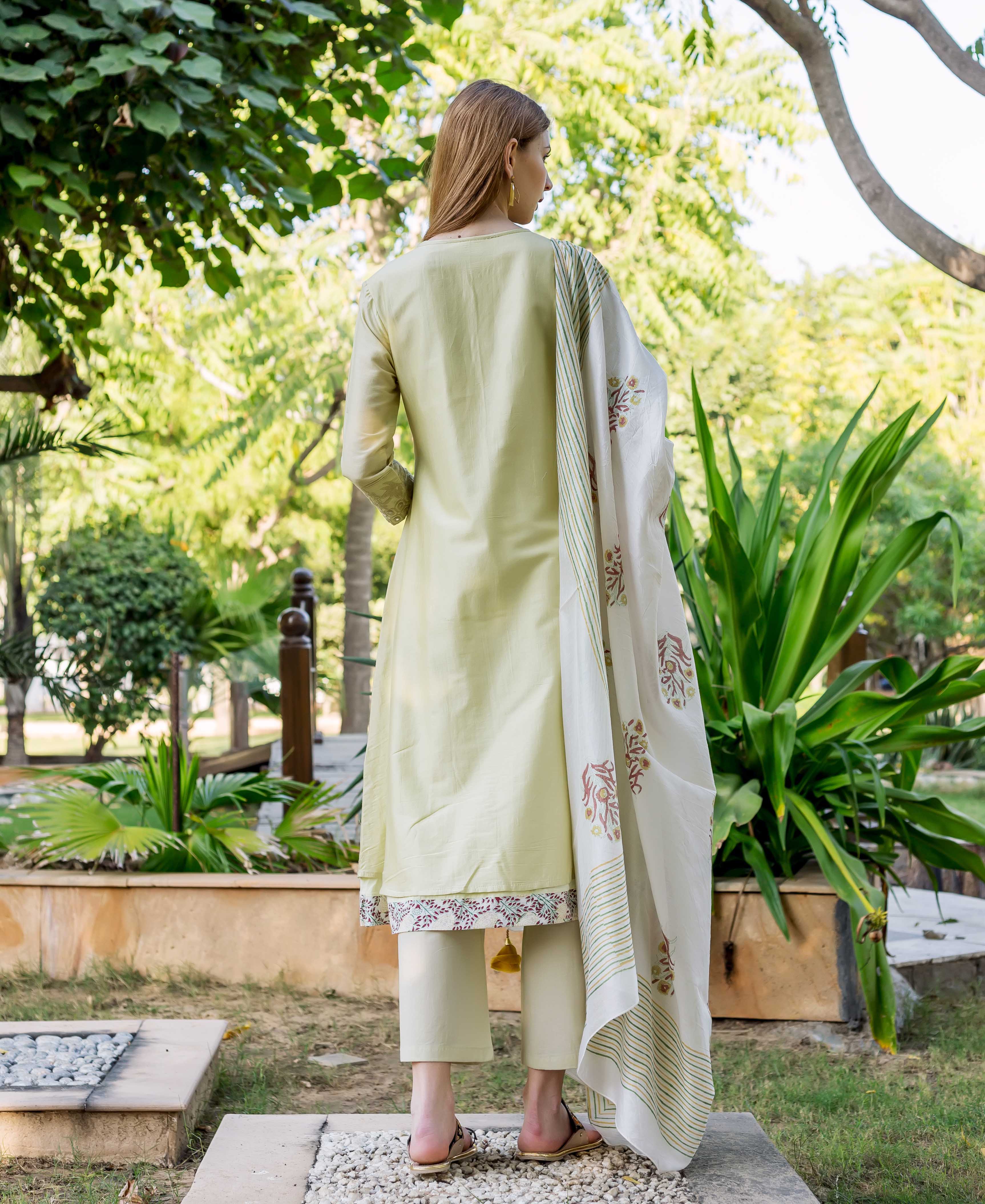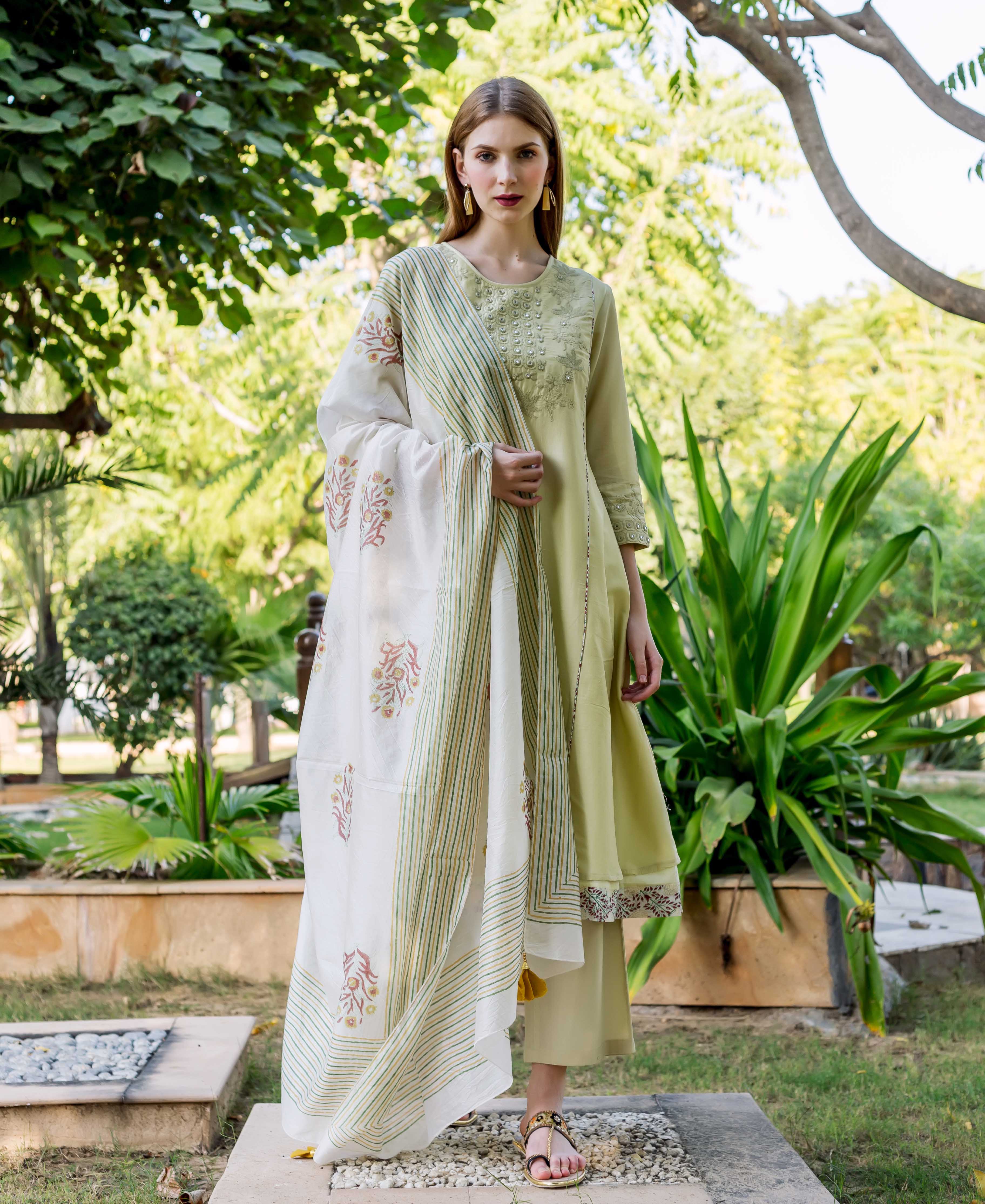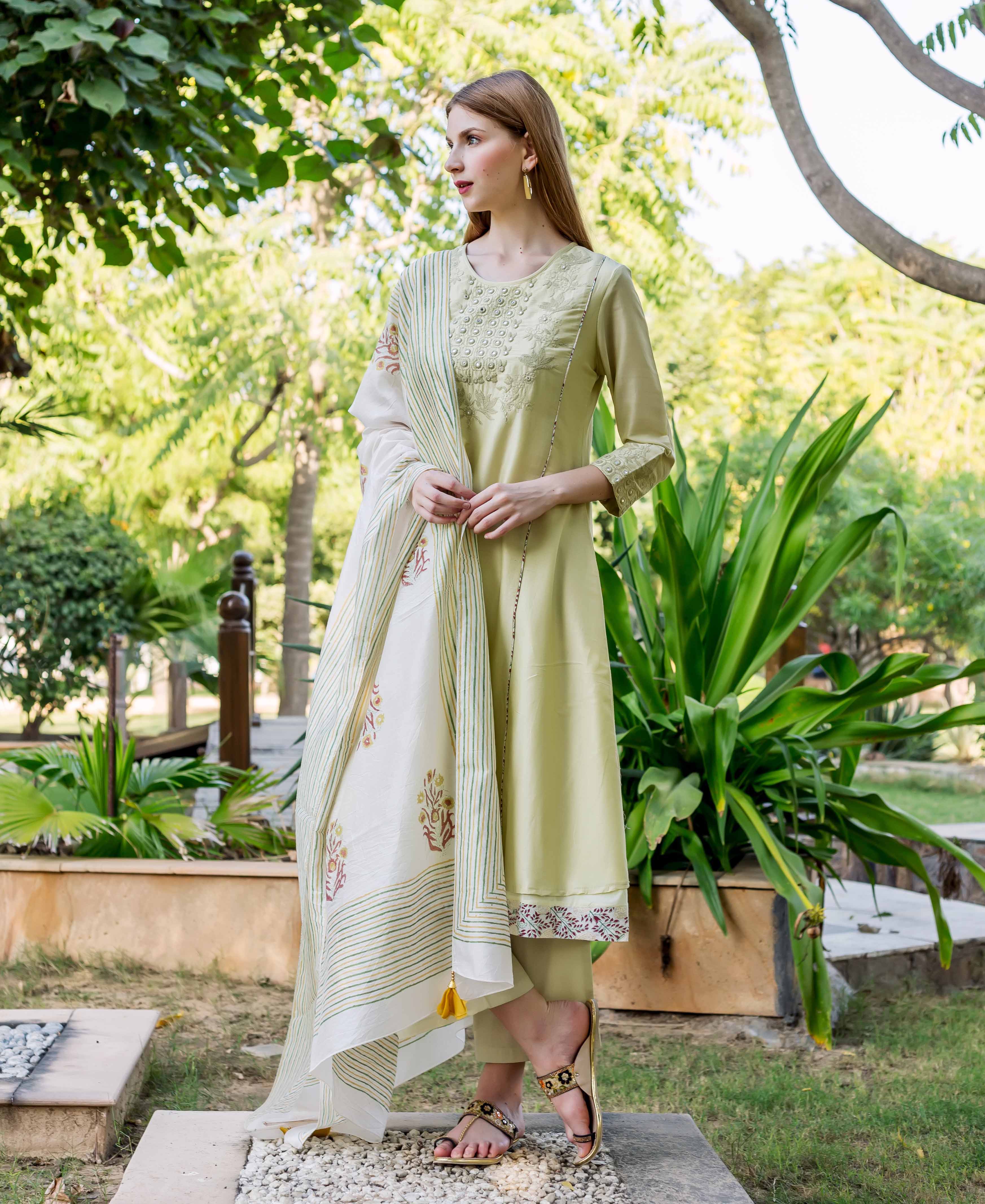 Sea Green Embroidered A-Line Kurta with Printed Hem
