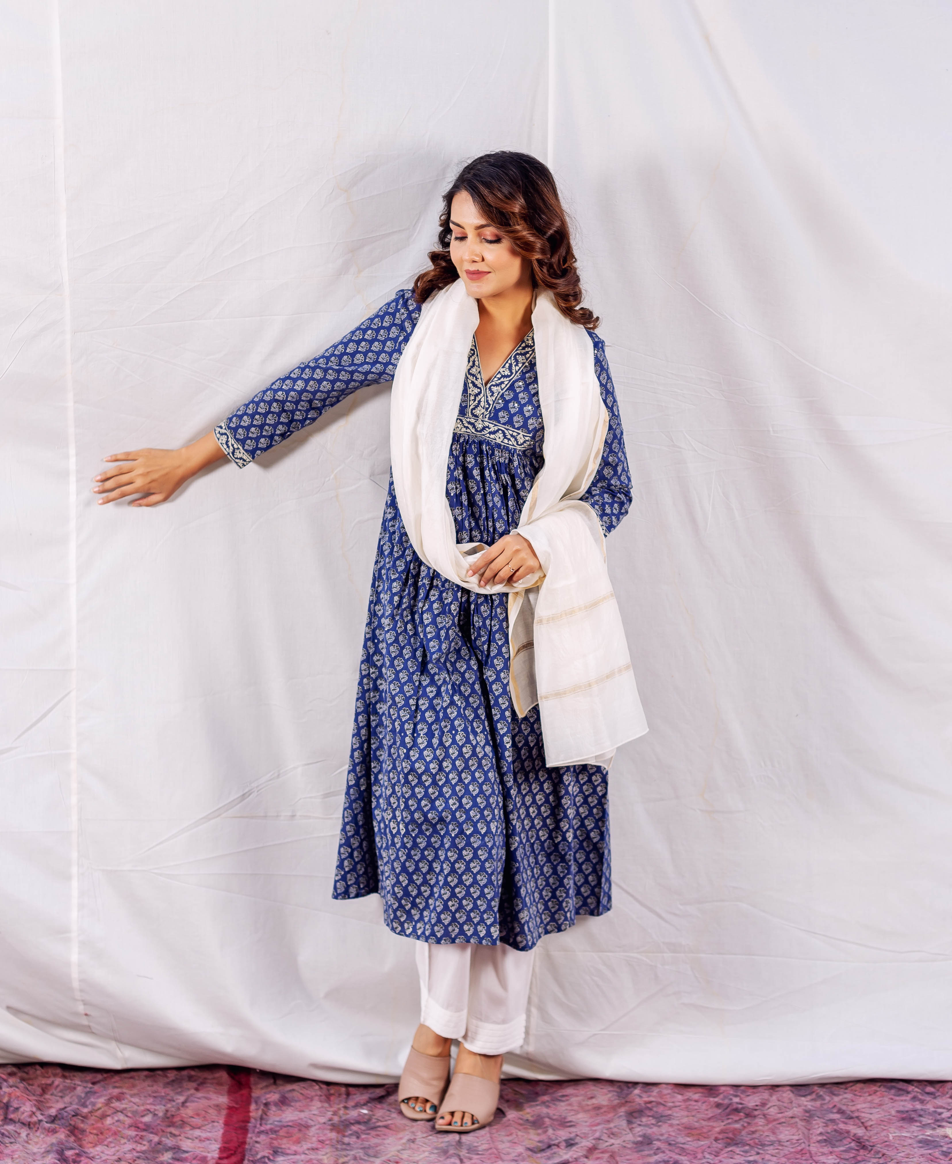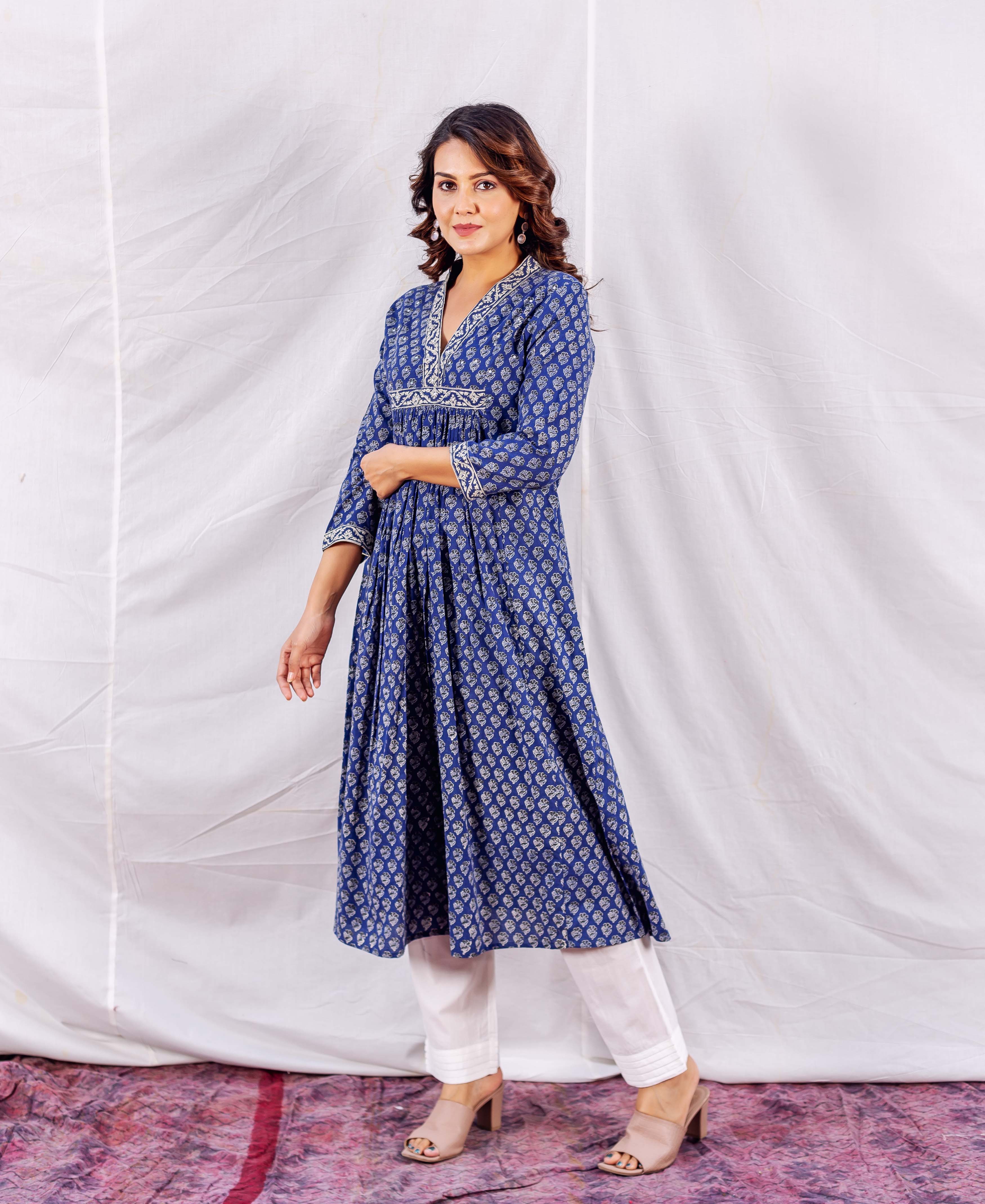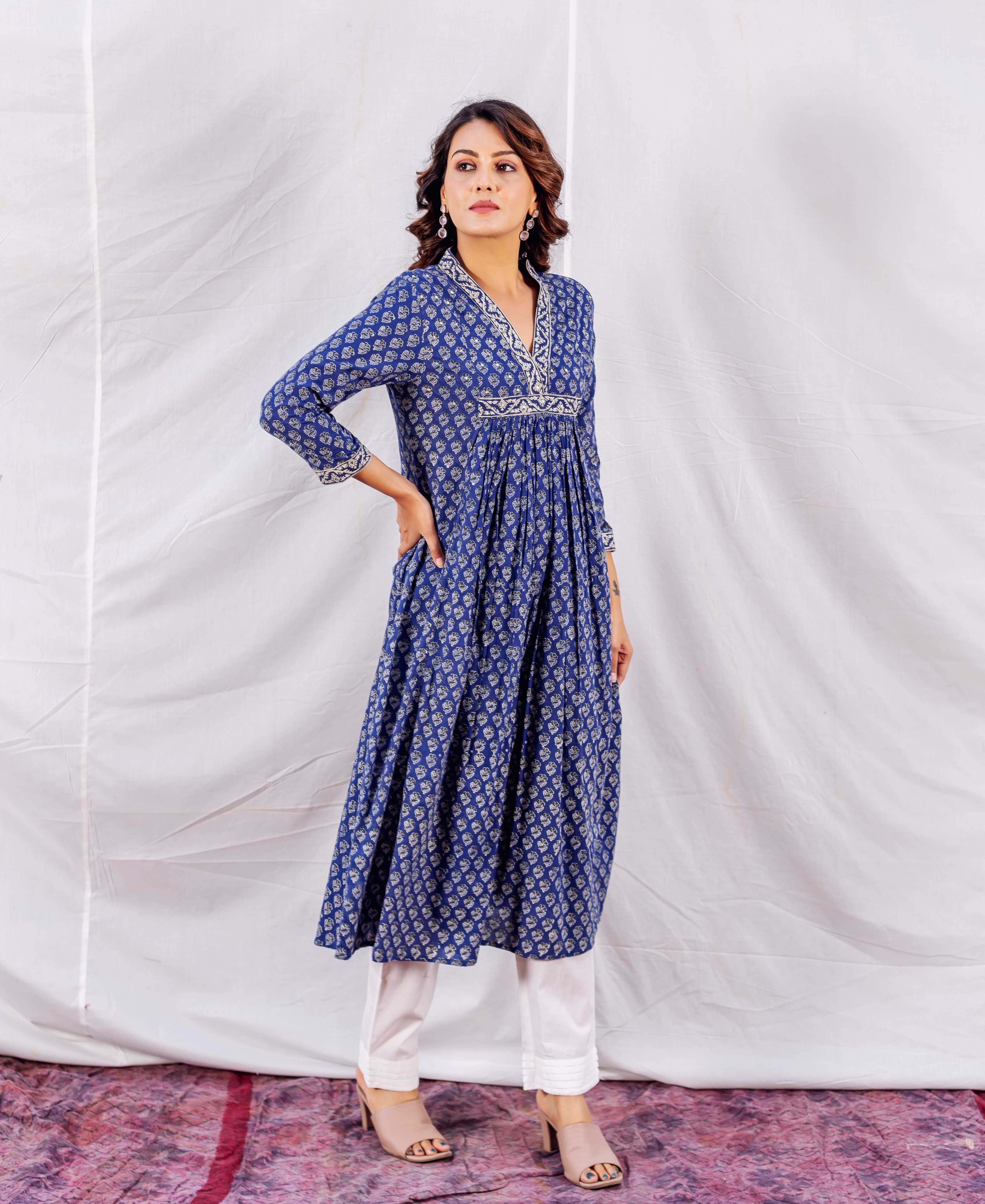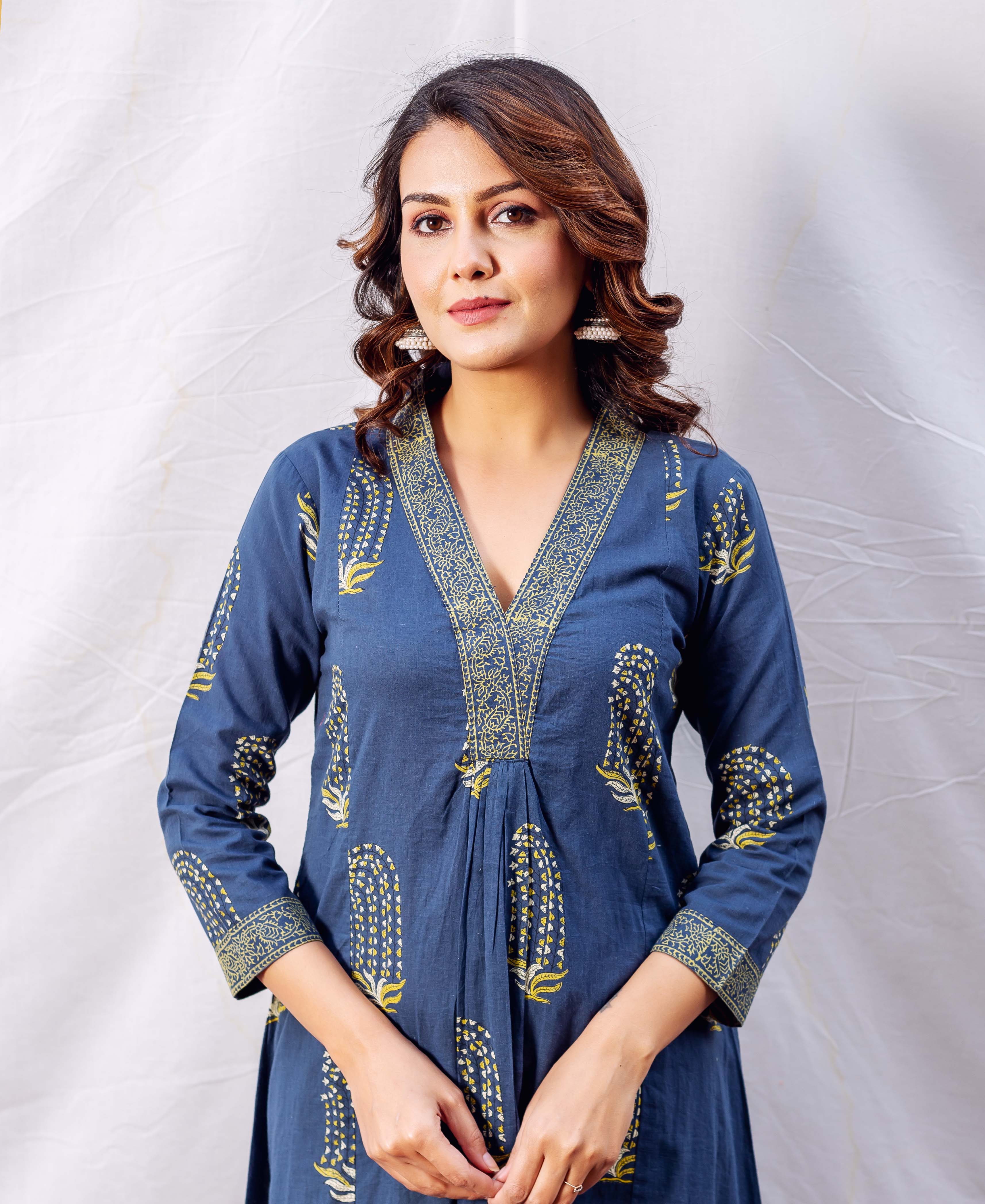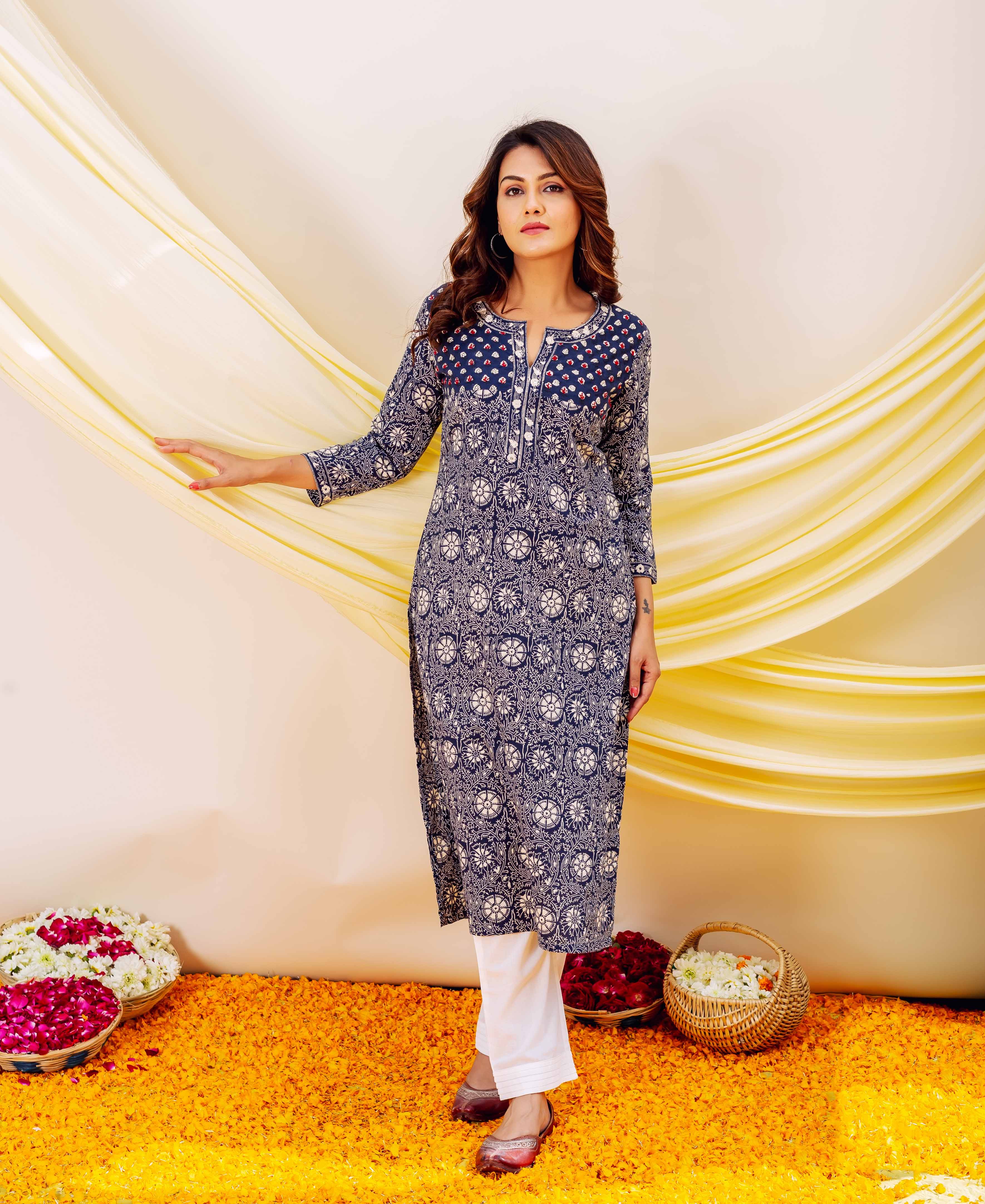 Indigo Hand Block Printed & Embroidered Straight Kurta