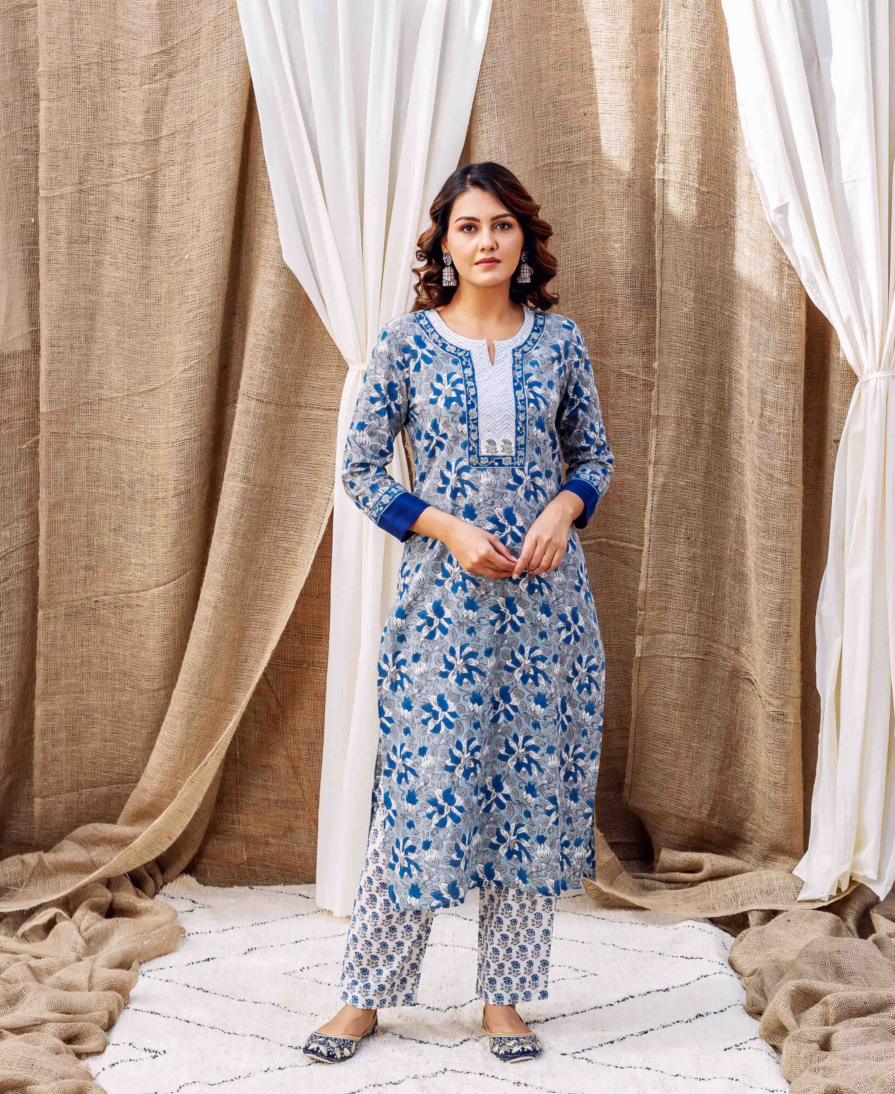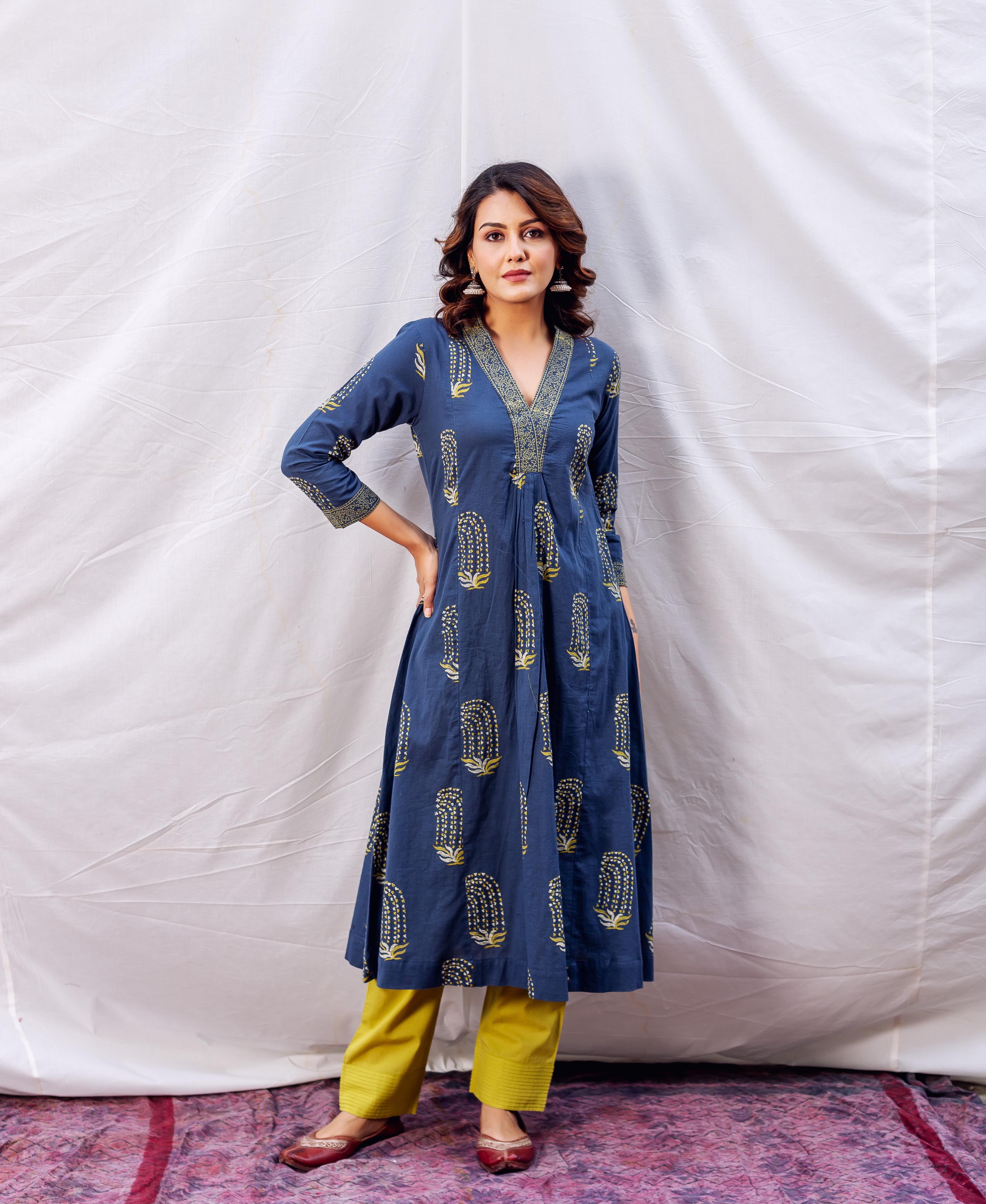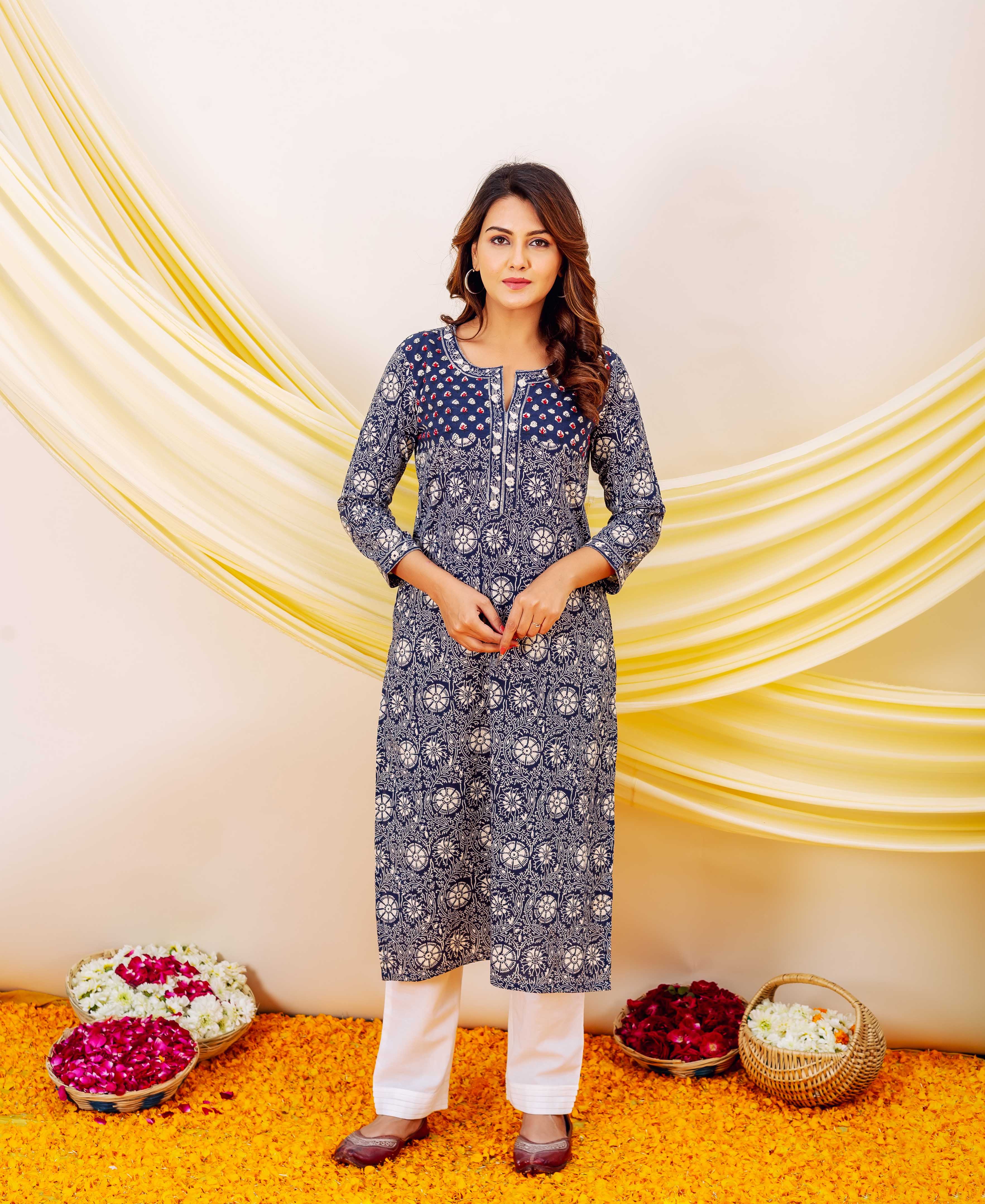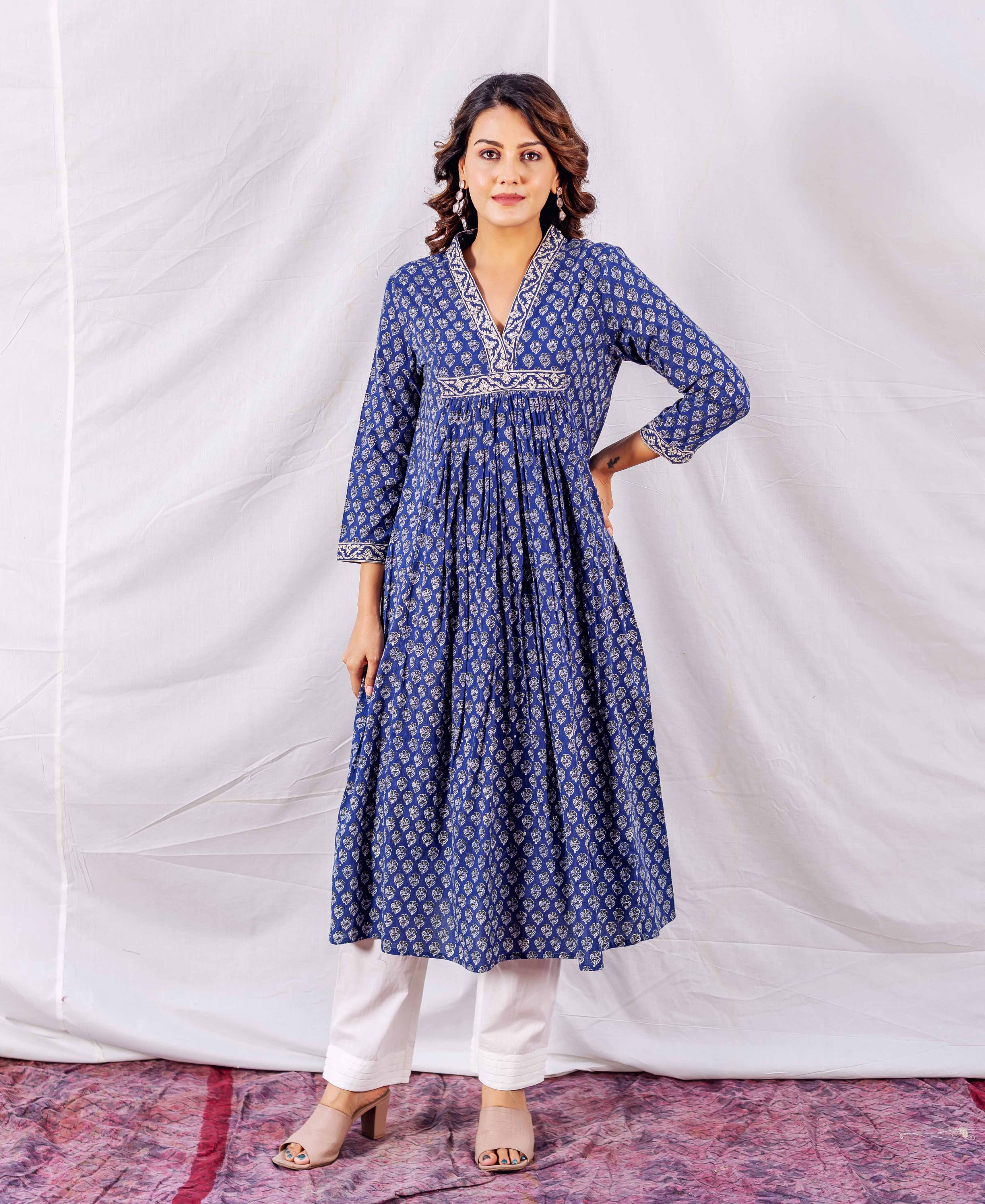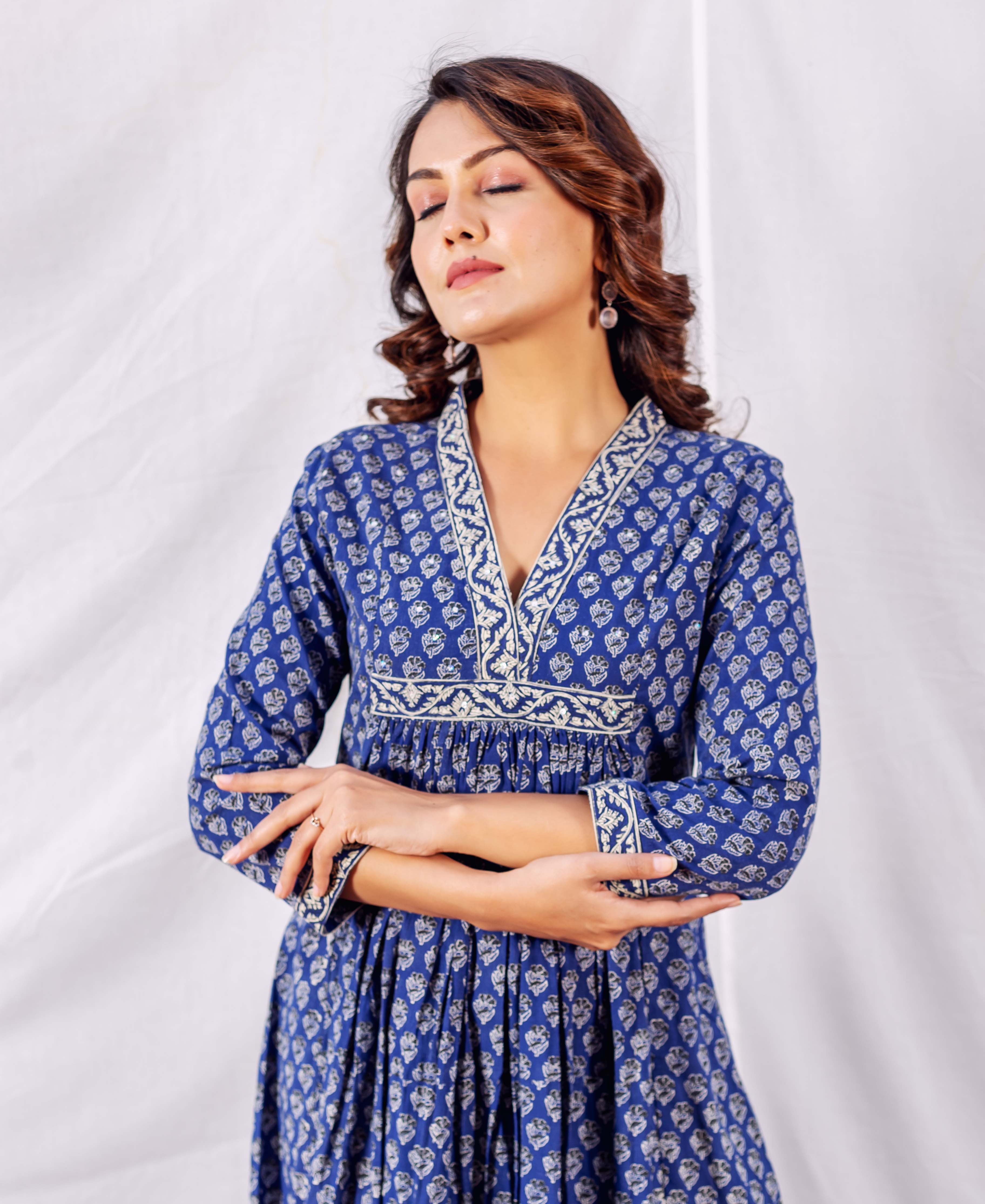 Indigo Hand Block Printed & Embroidered Straight Kurta
