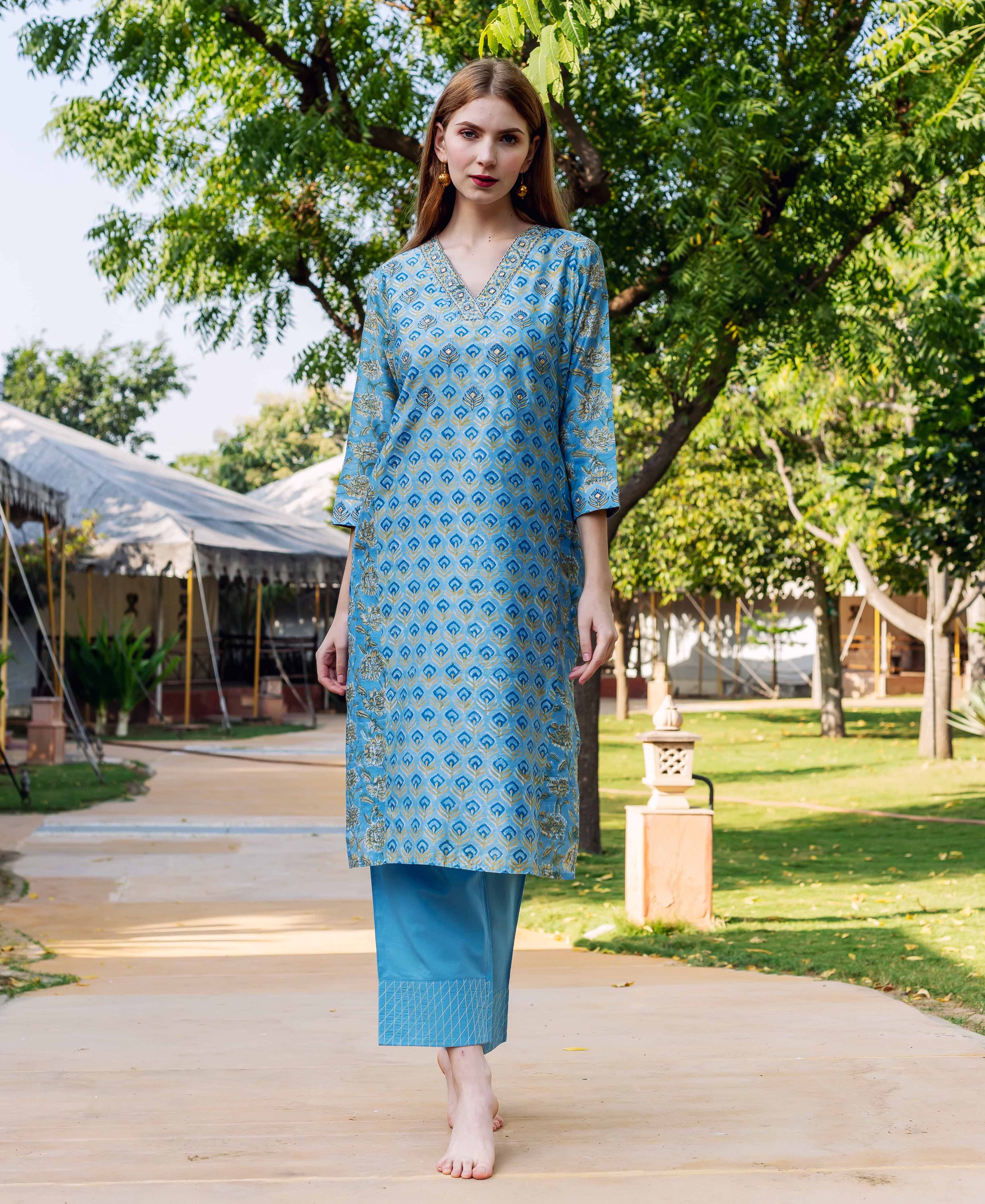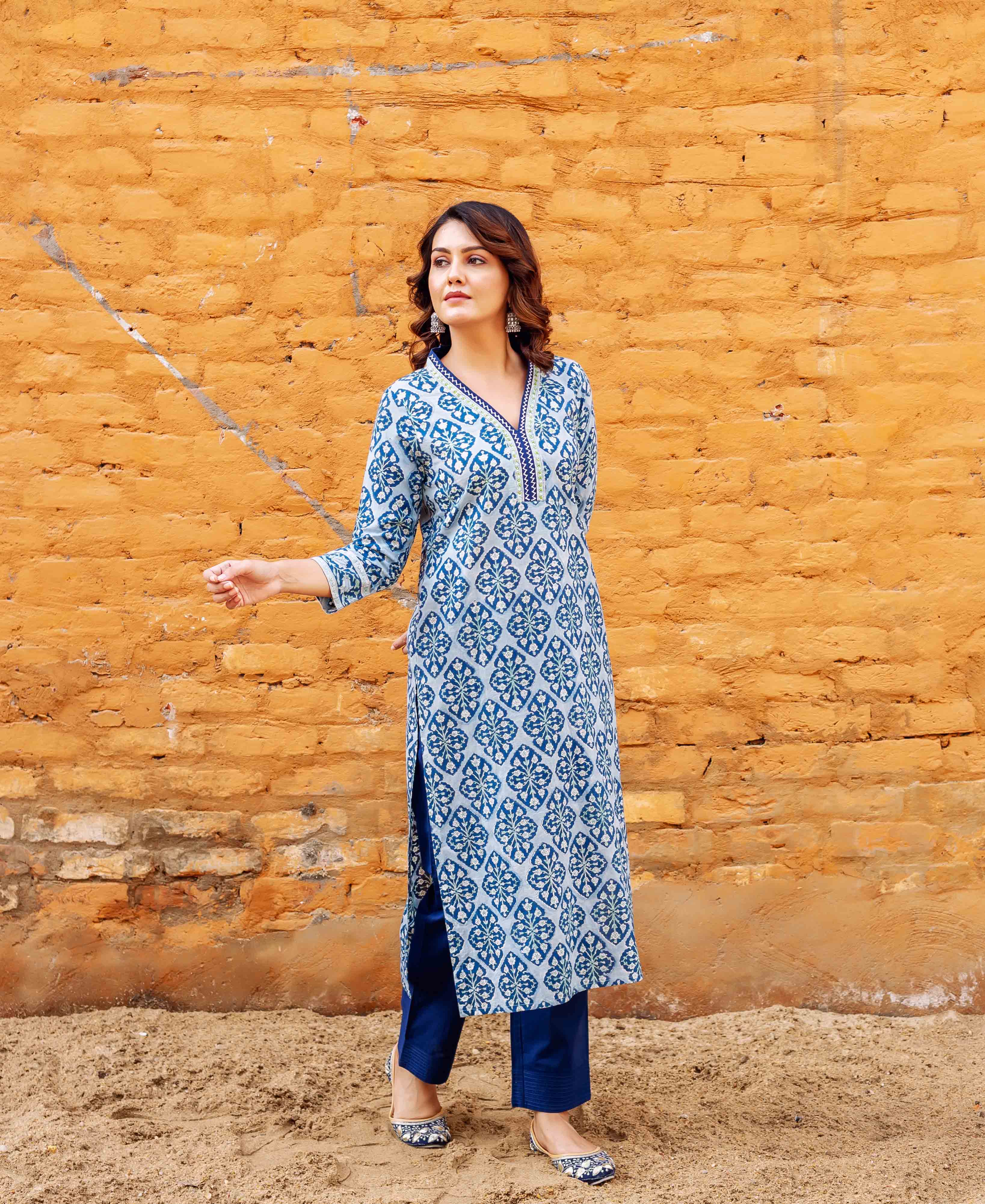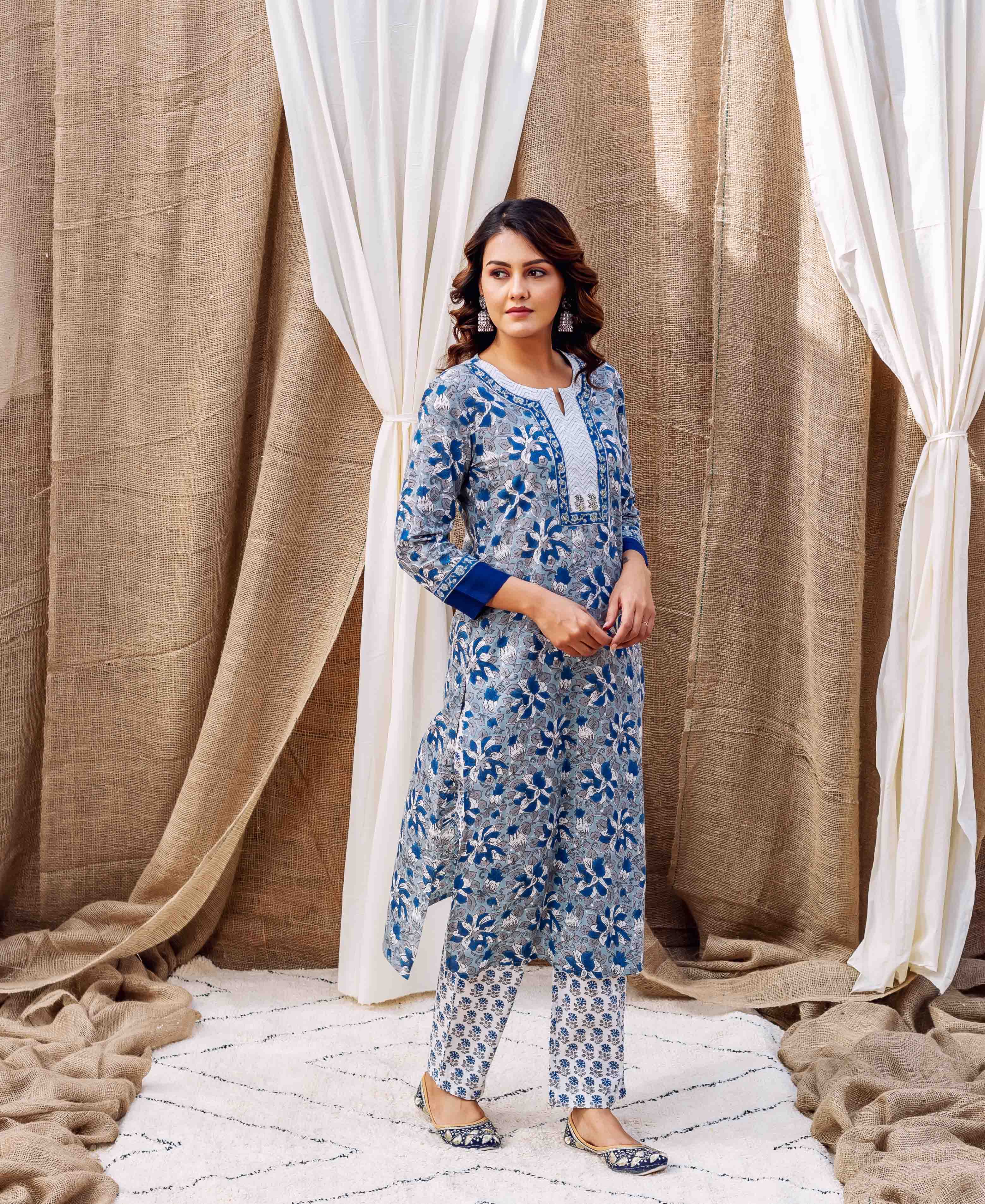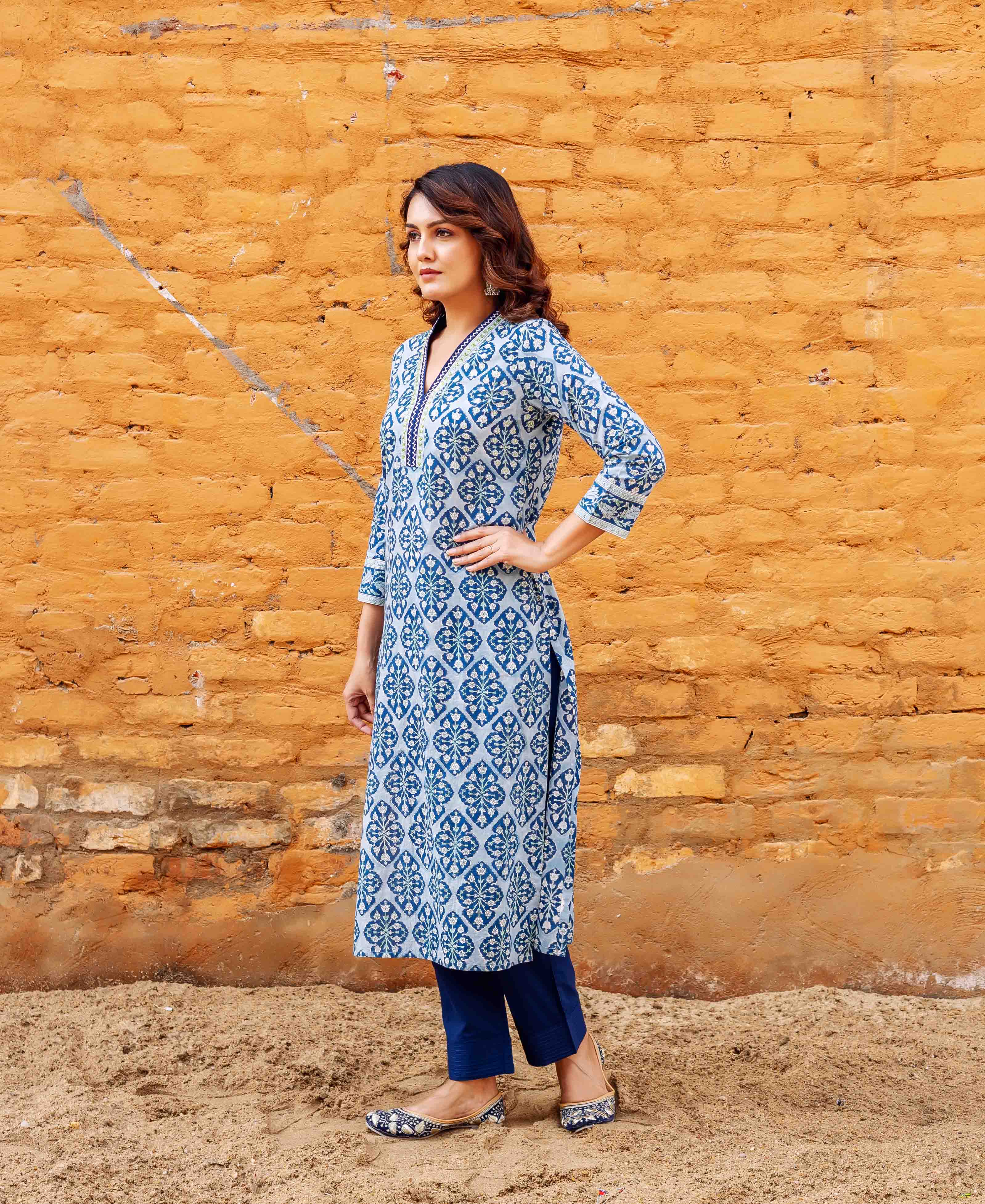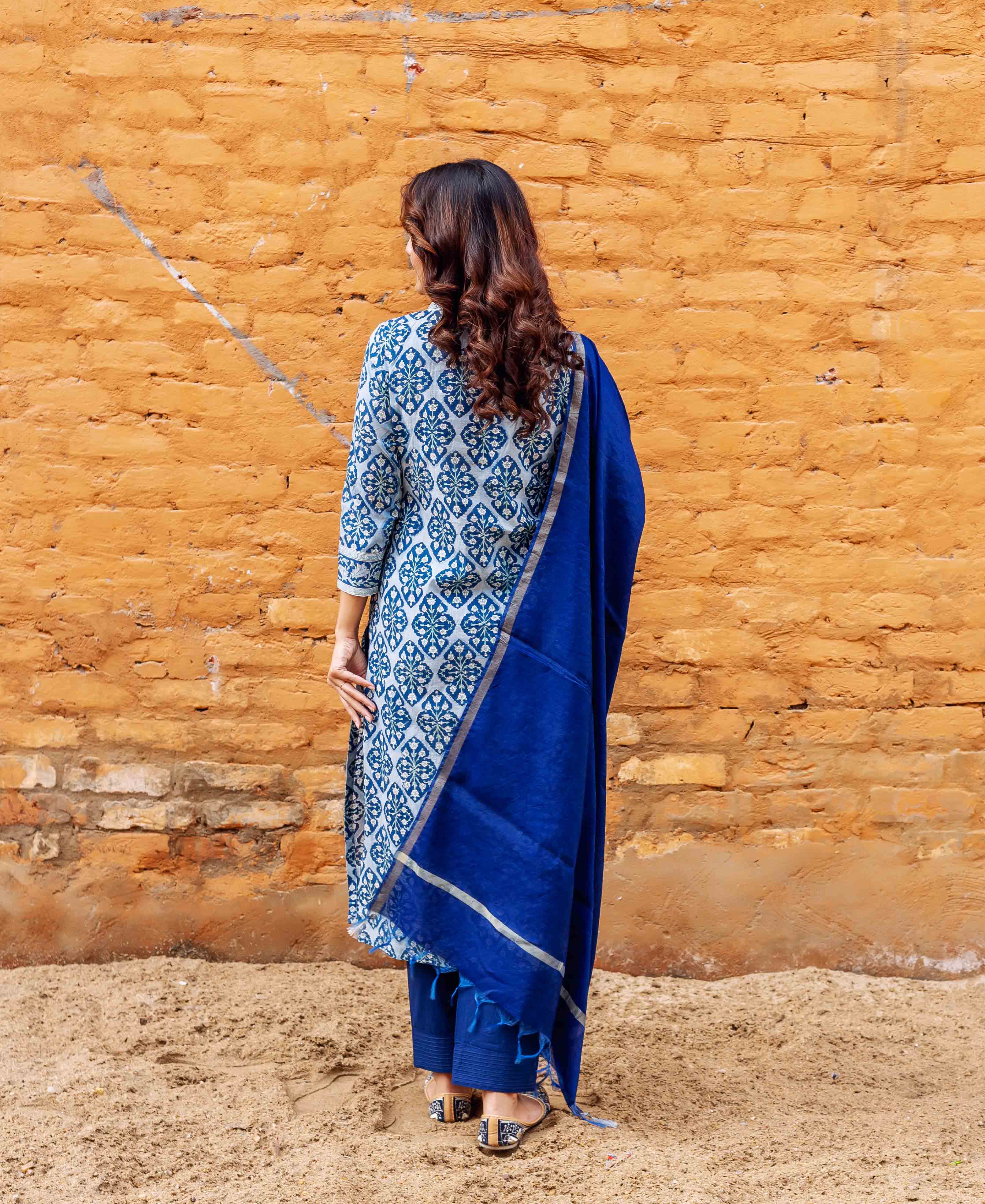 Indigo Hand Block Printed & Embroidered Straight Kurta