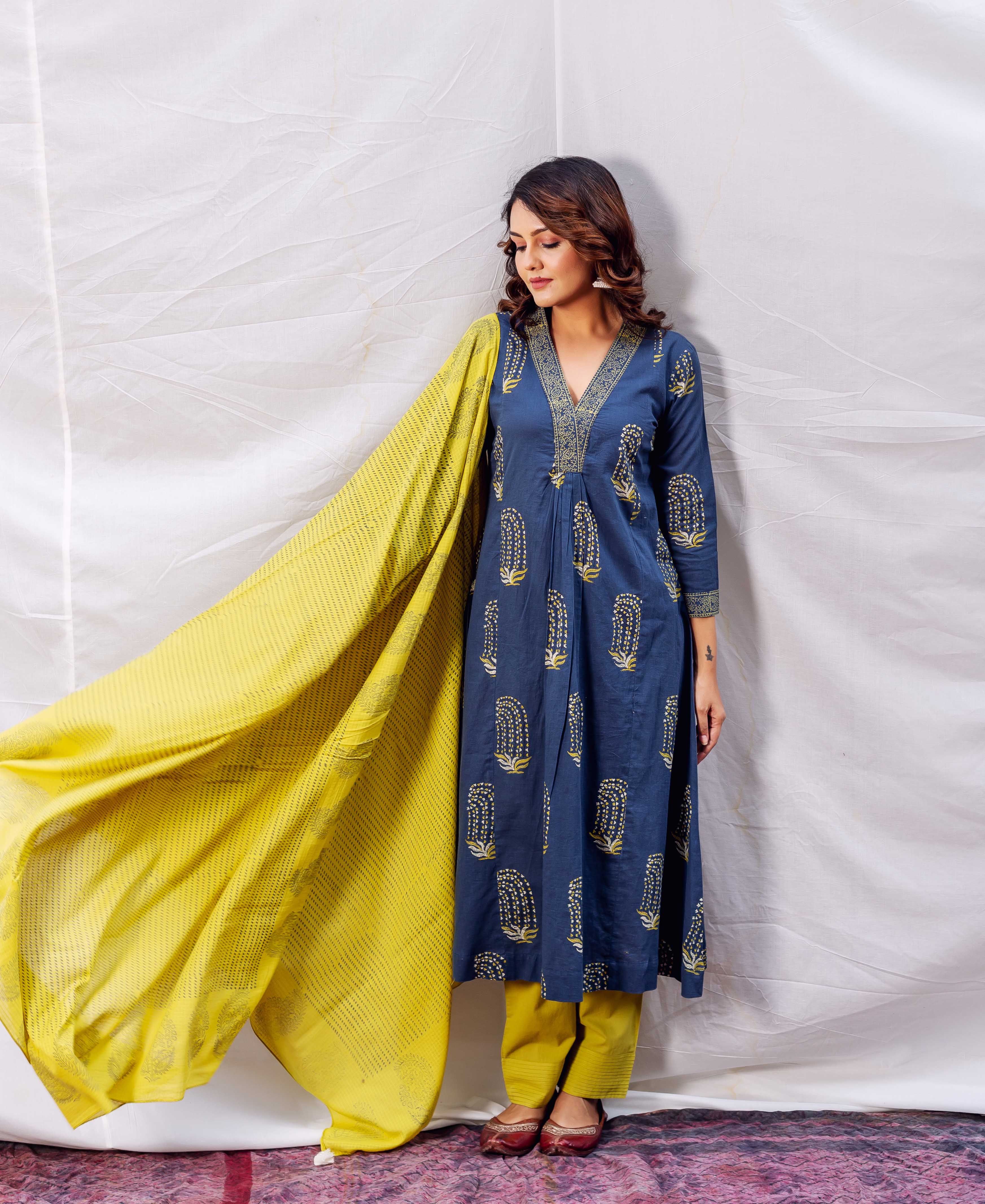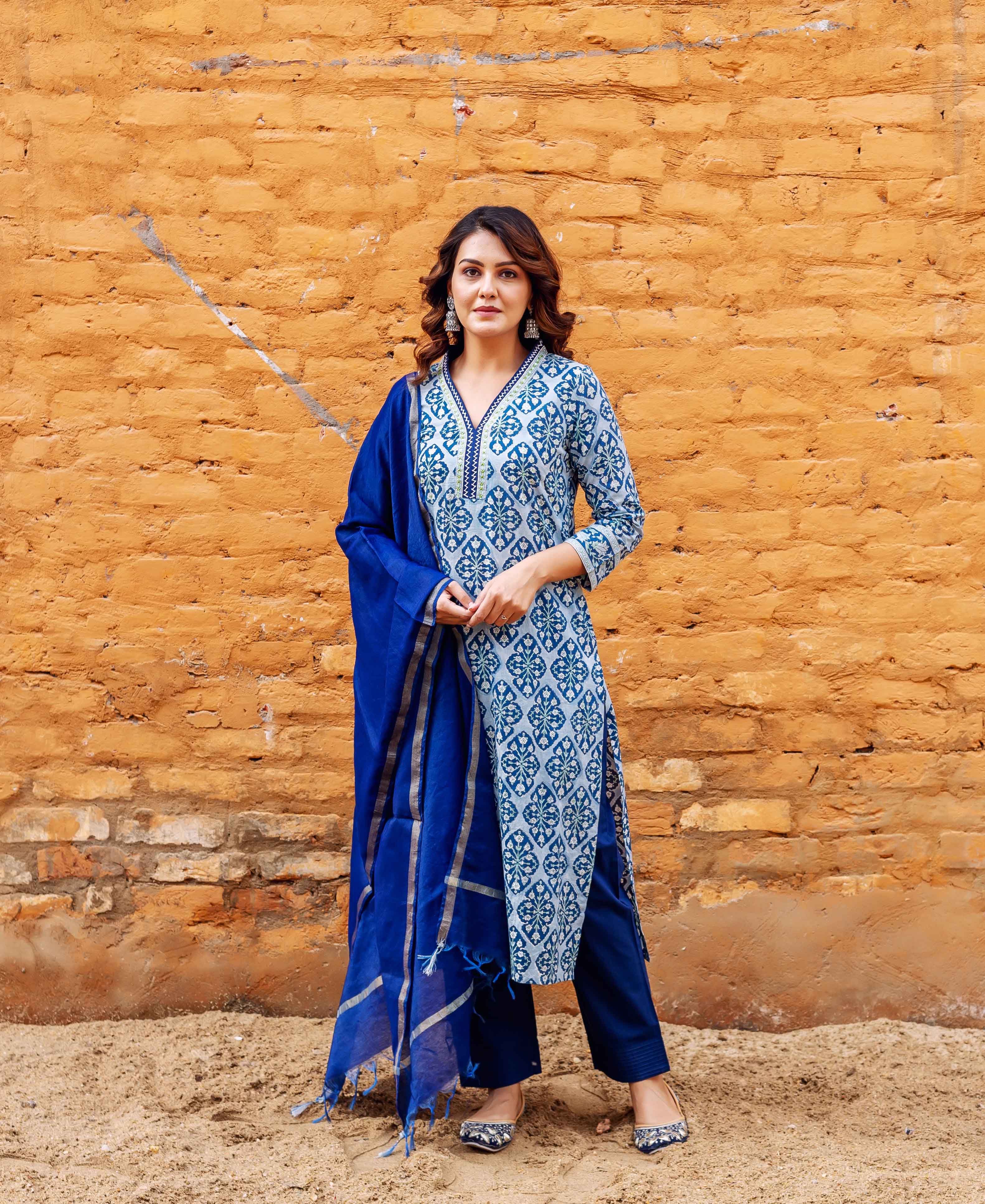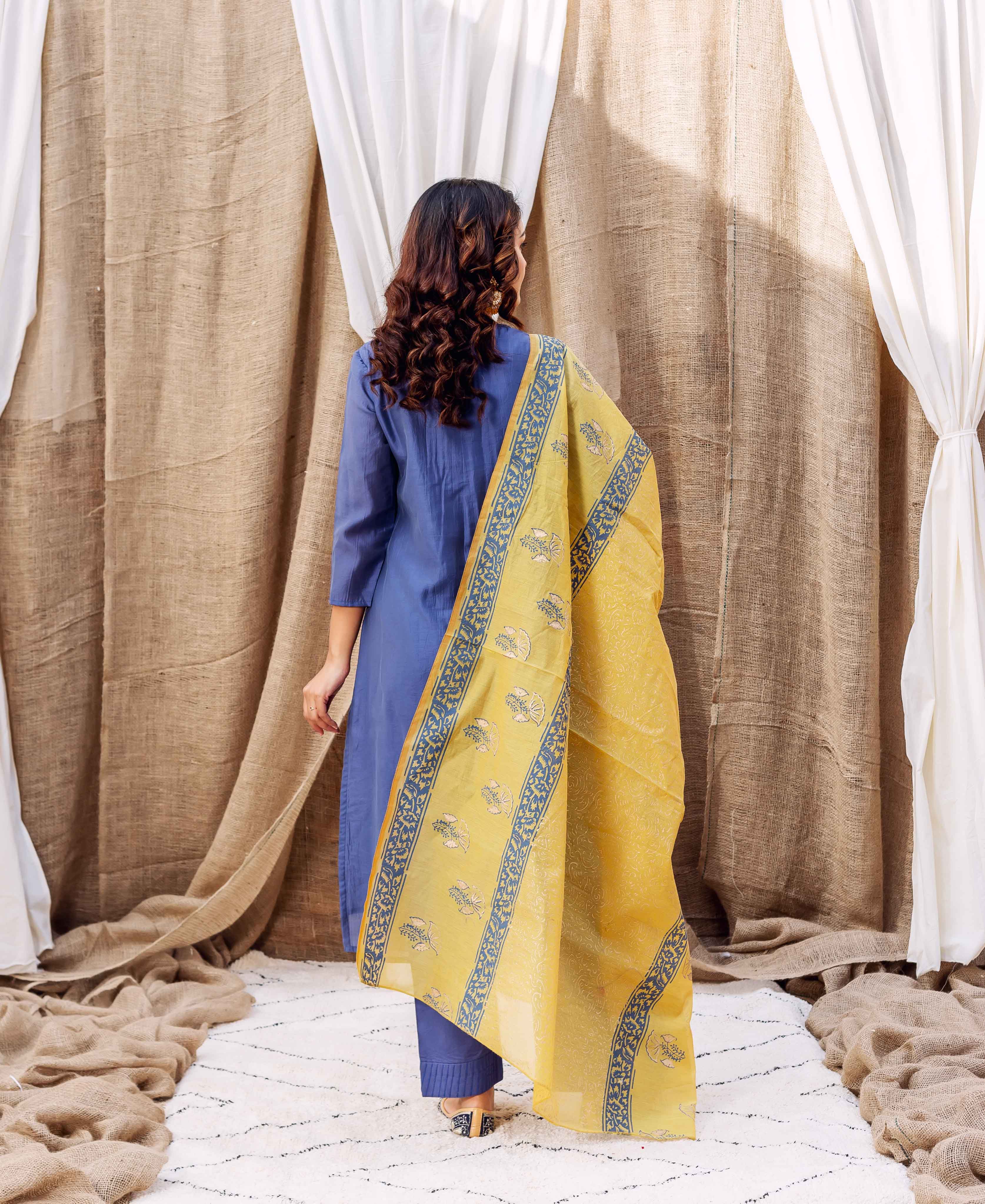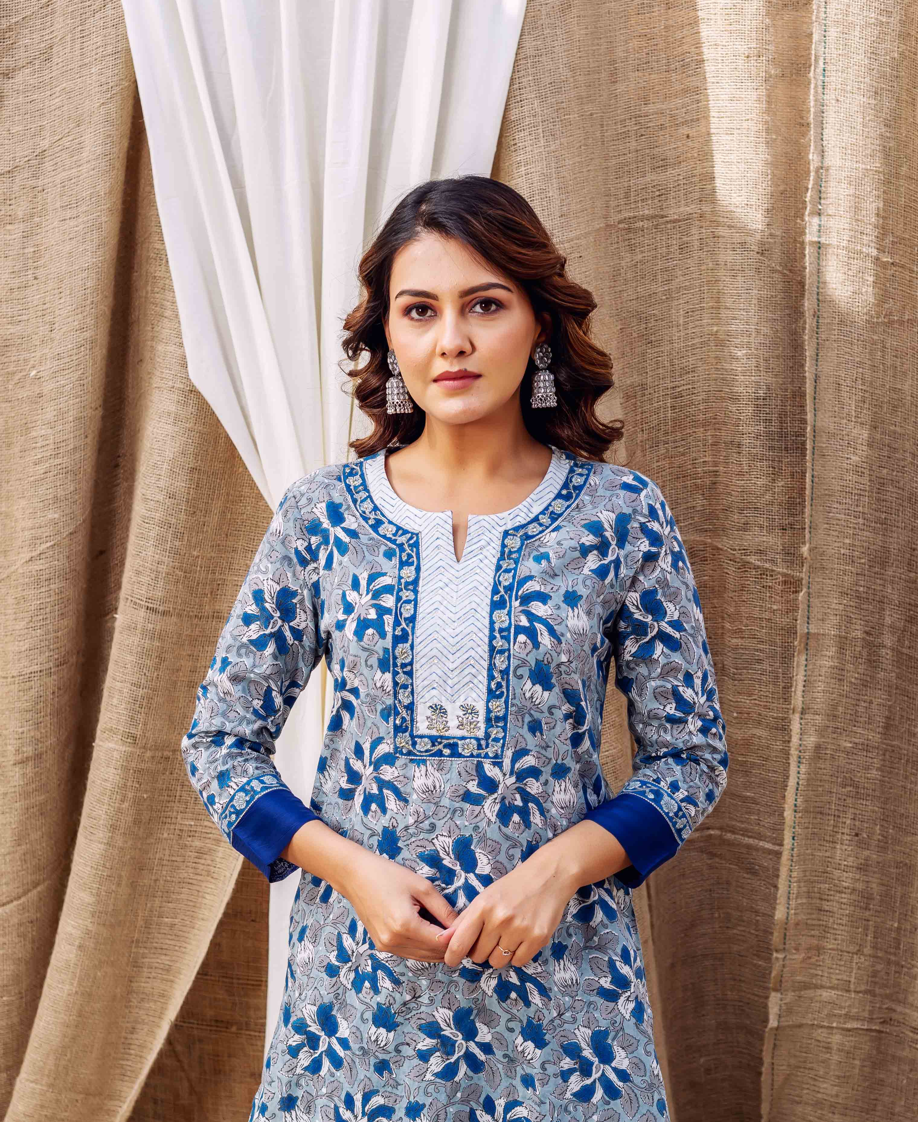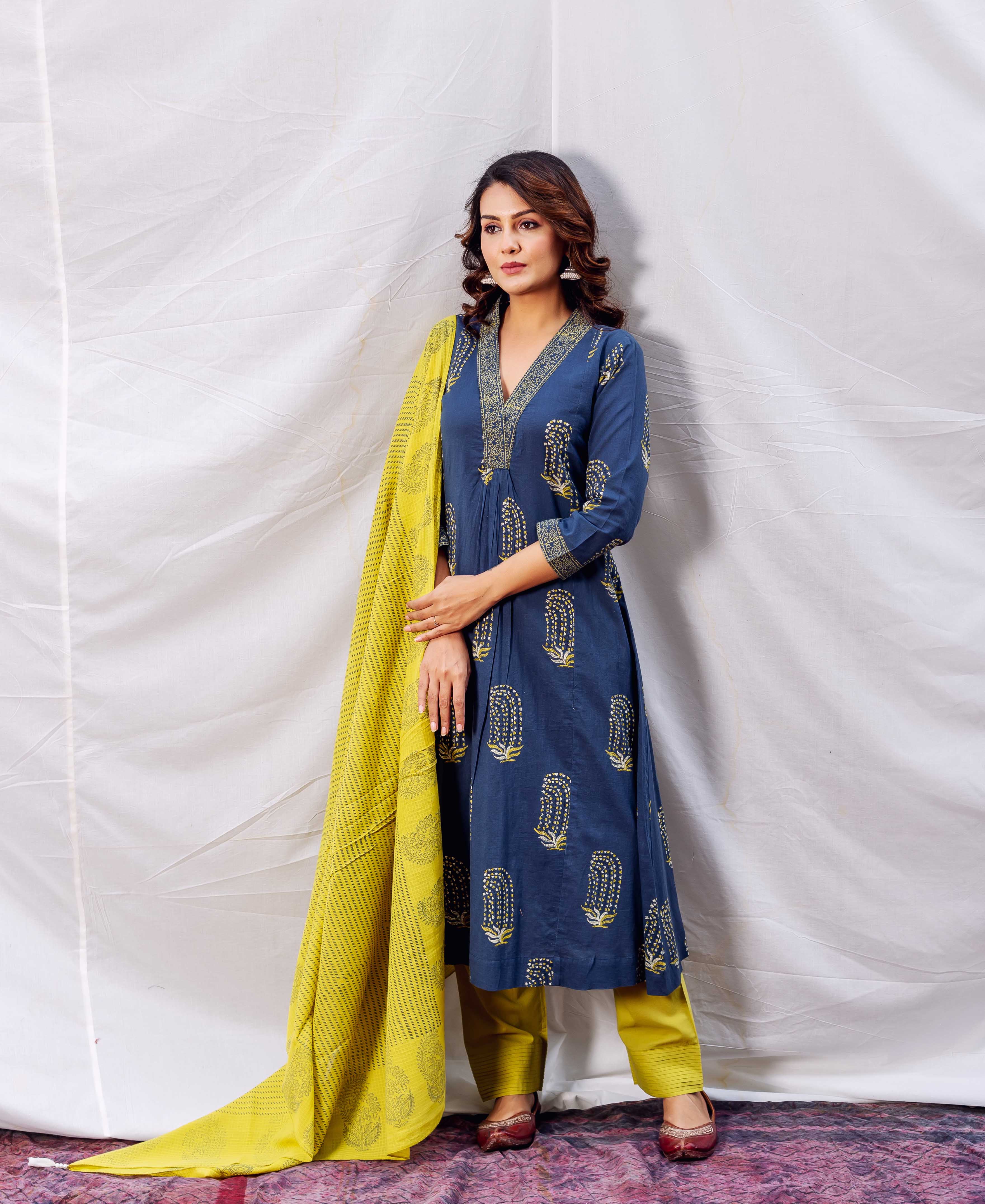 Indigo Hand Block Printed & Embroidered Straight Kurta