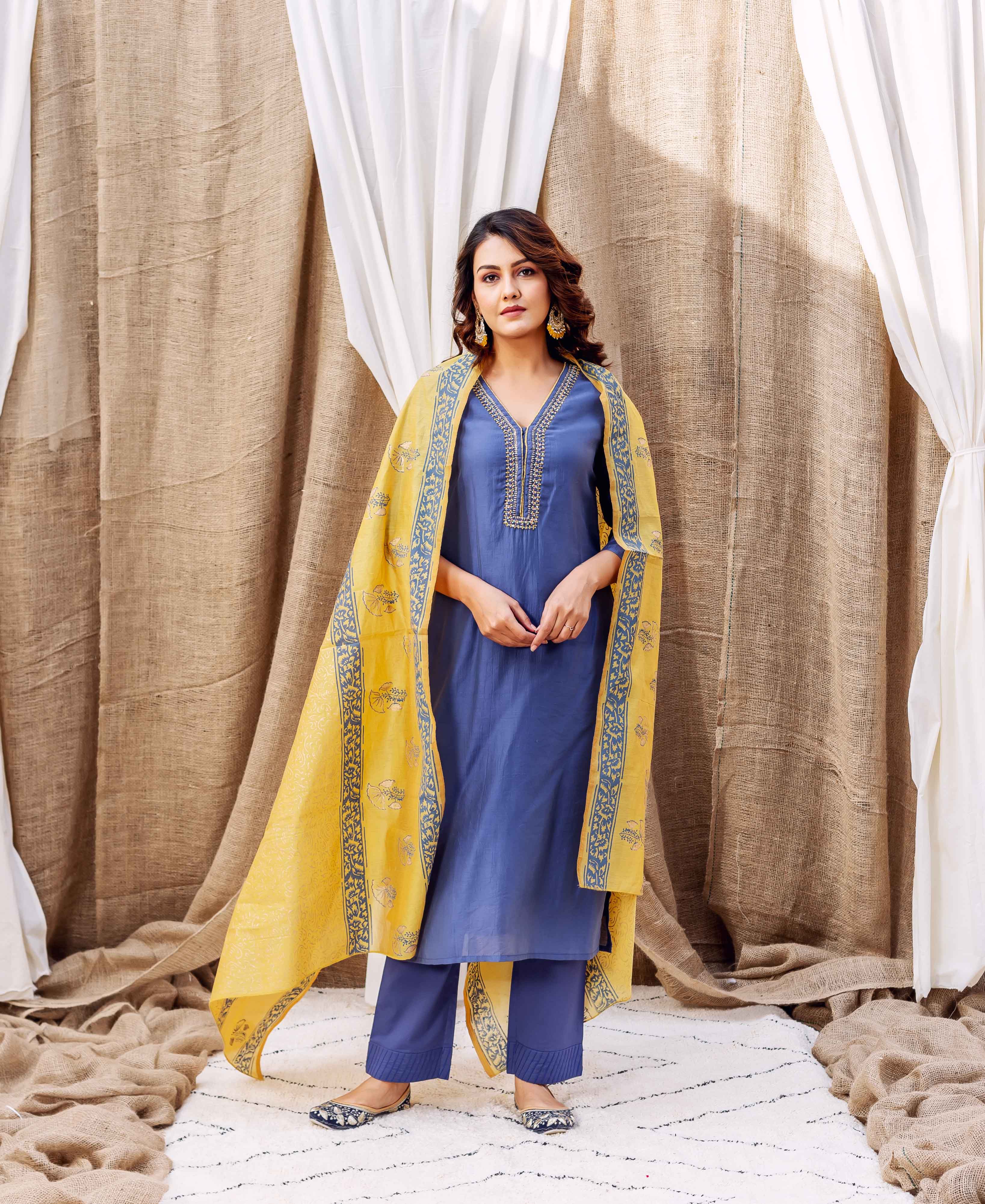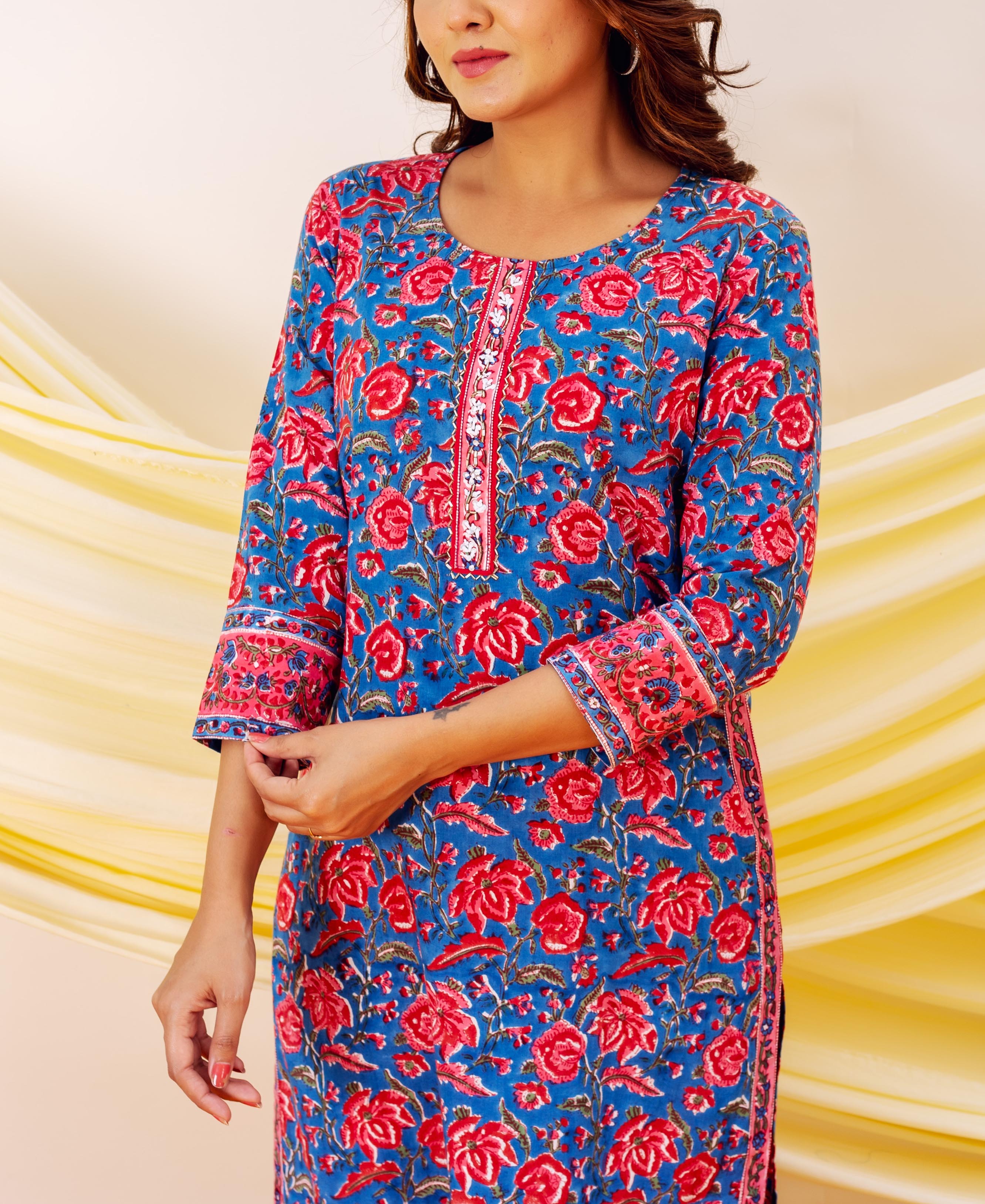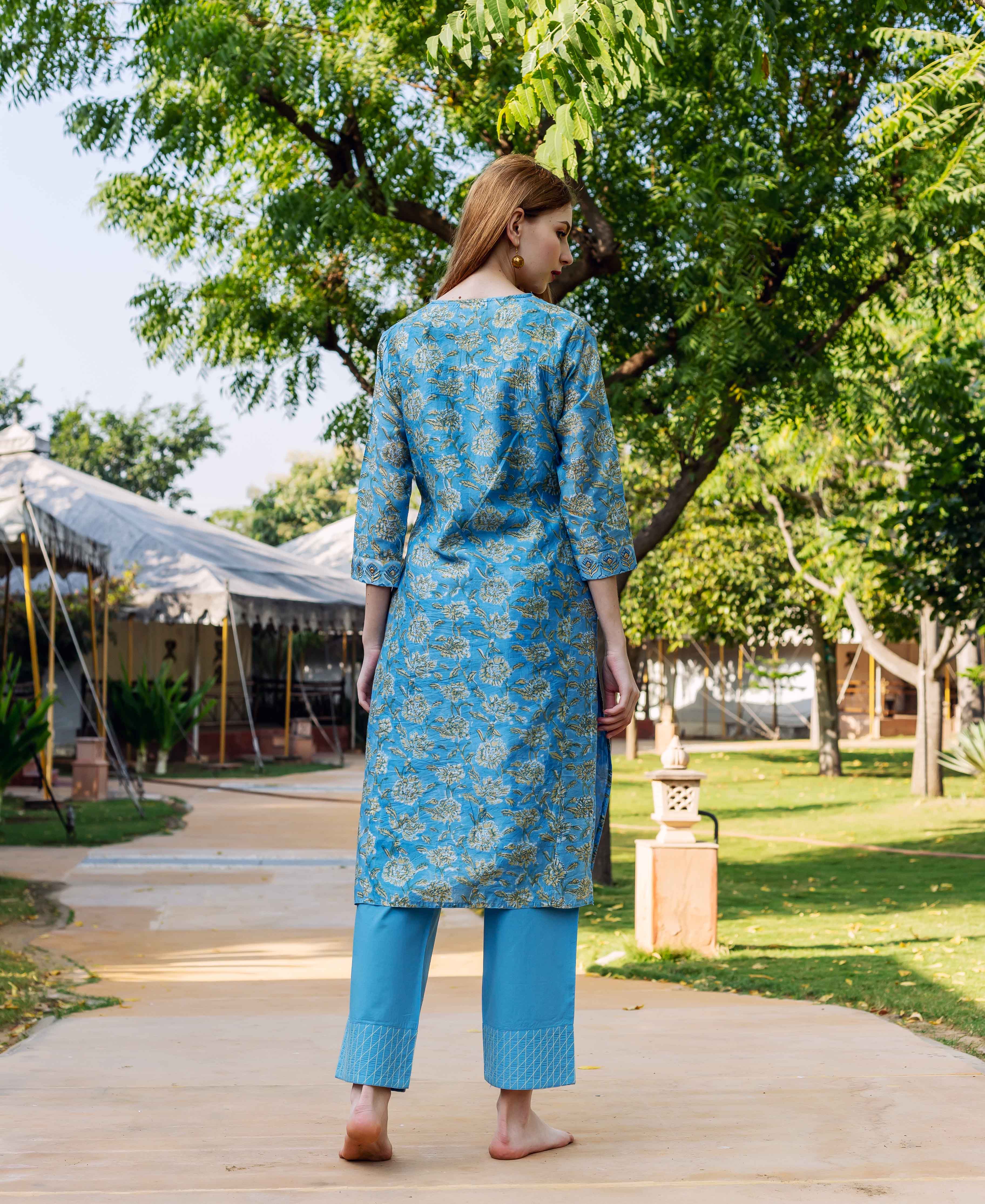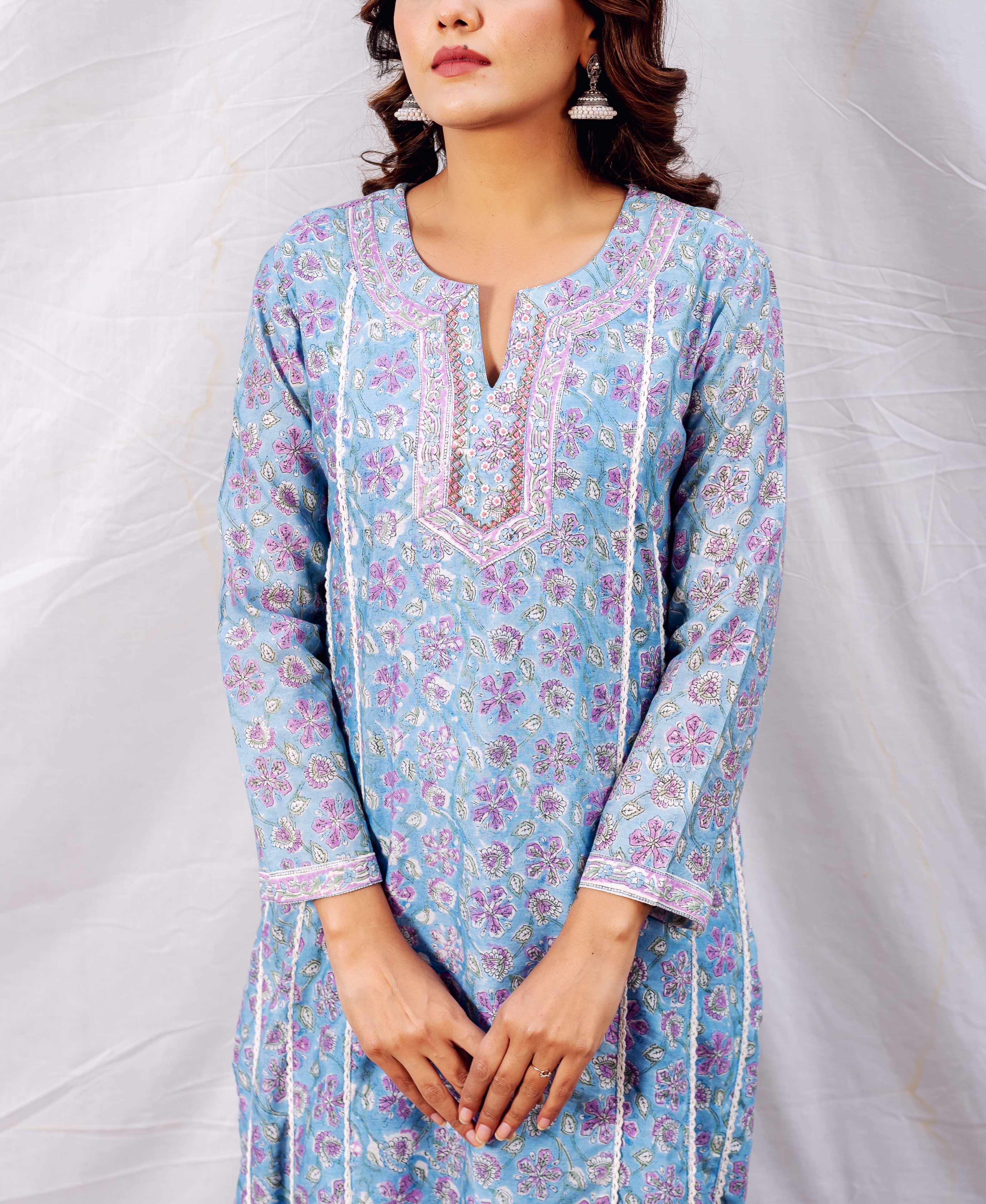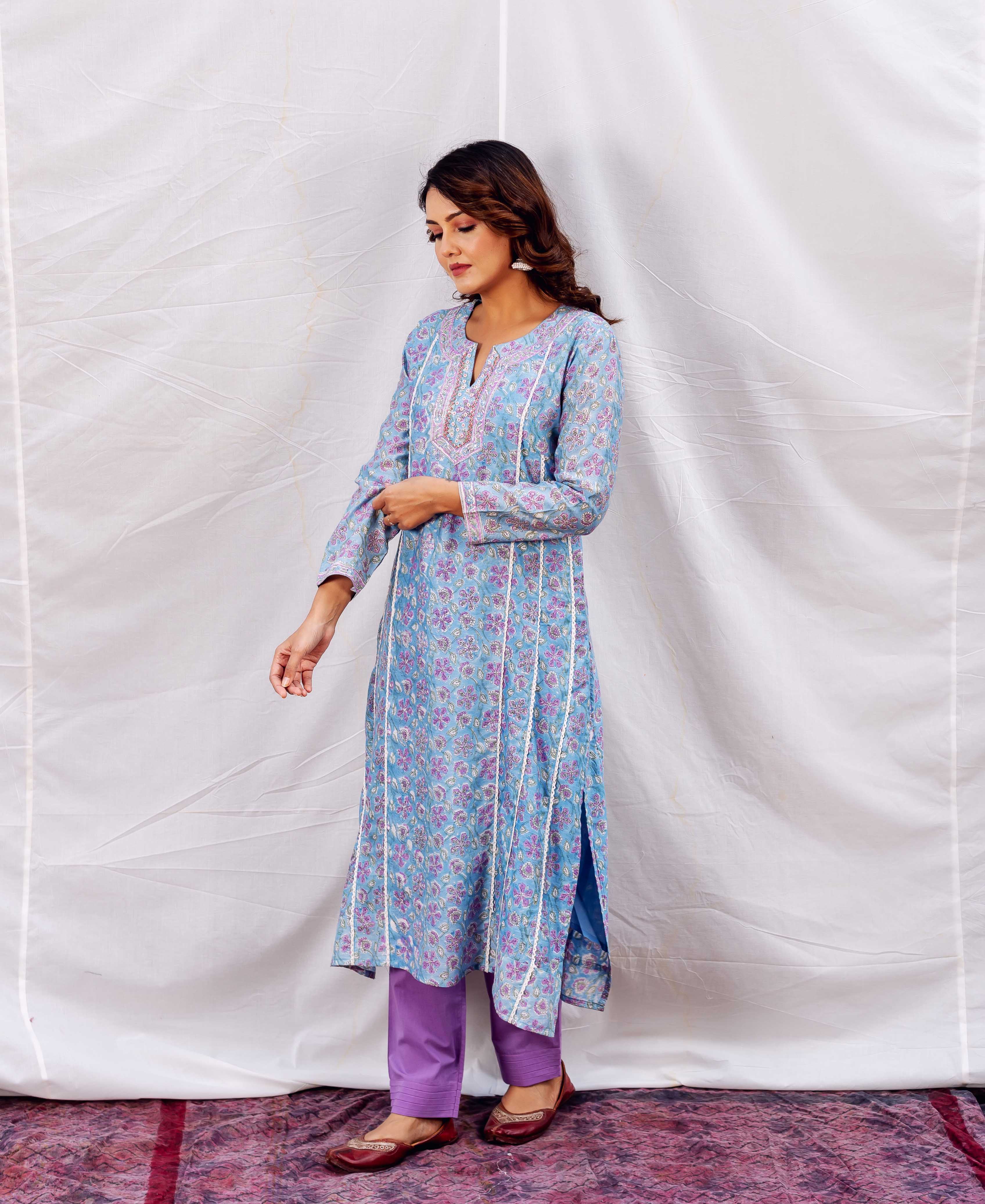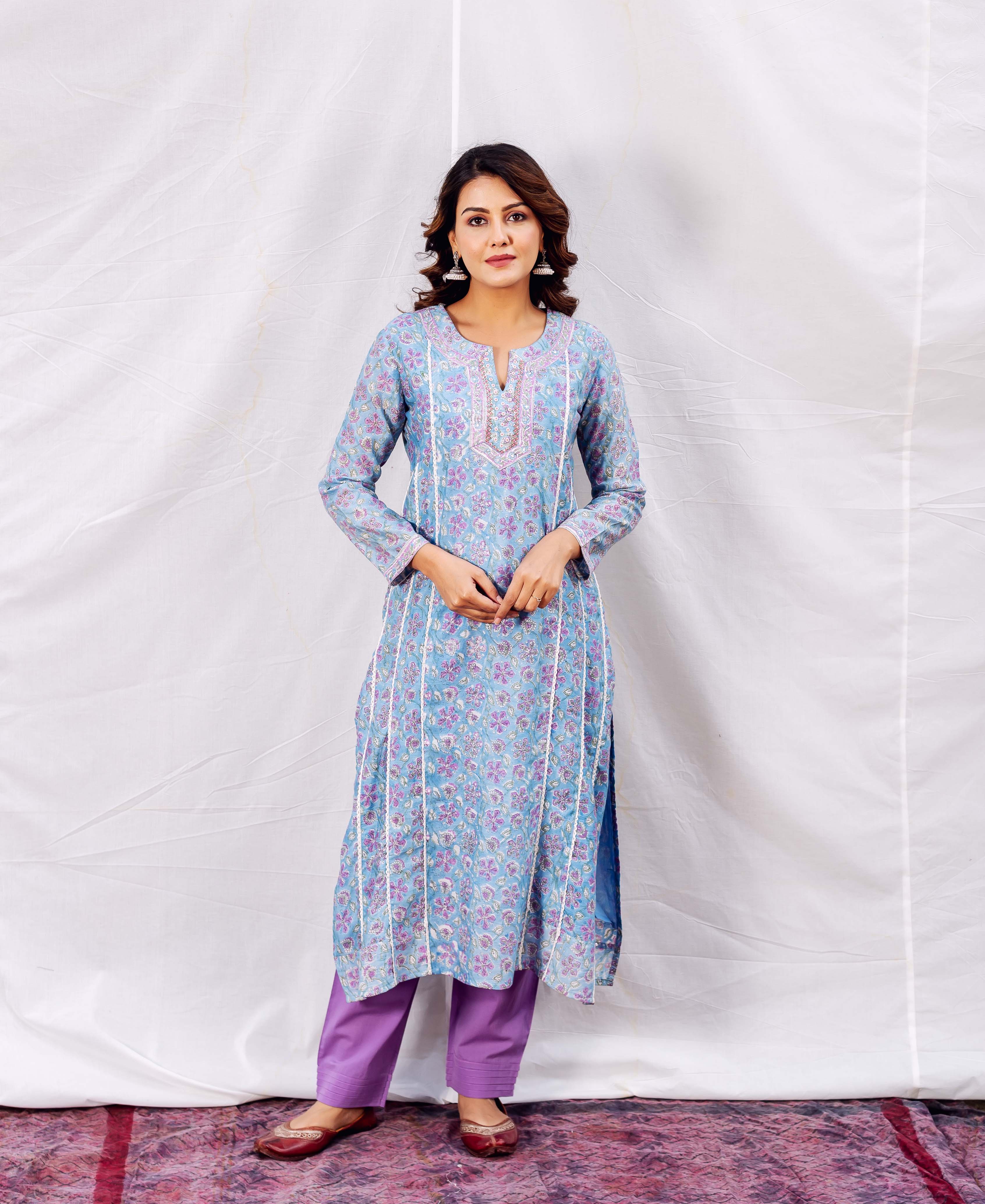 Indigo Hand Block Printed & Embroidered Straight Kurta