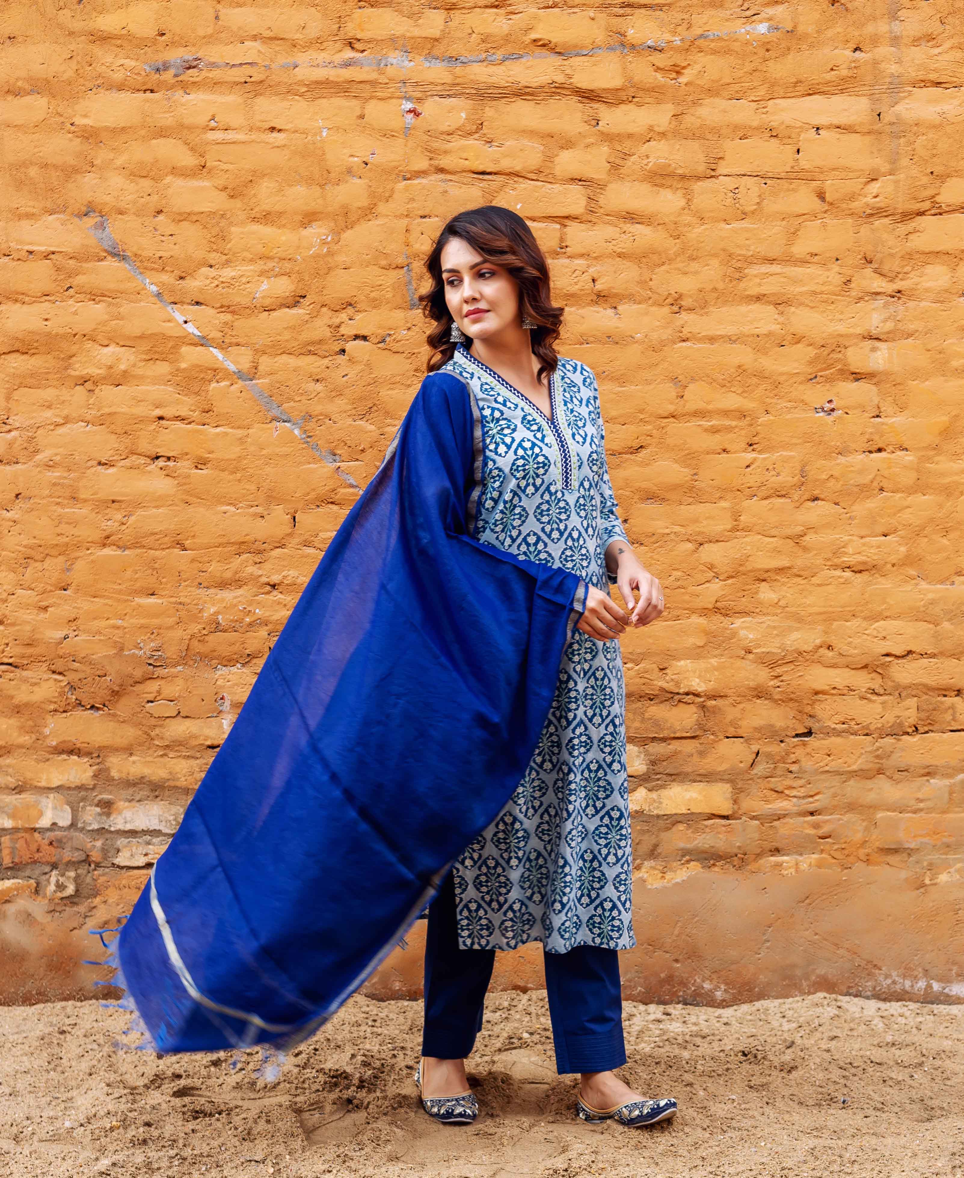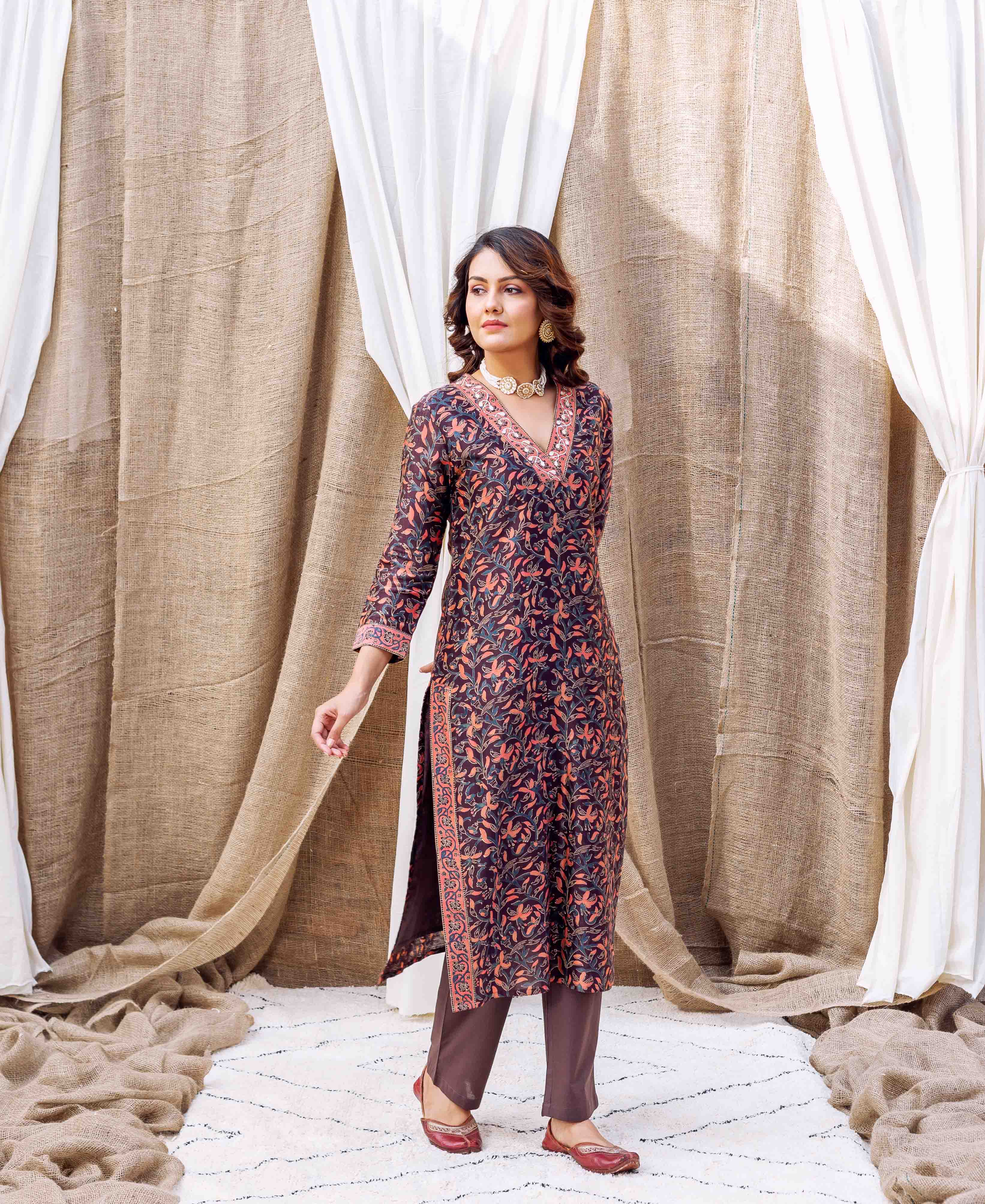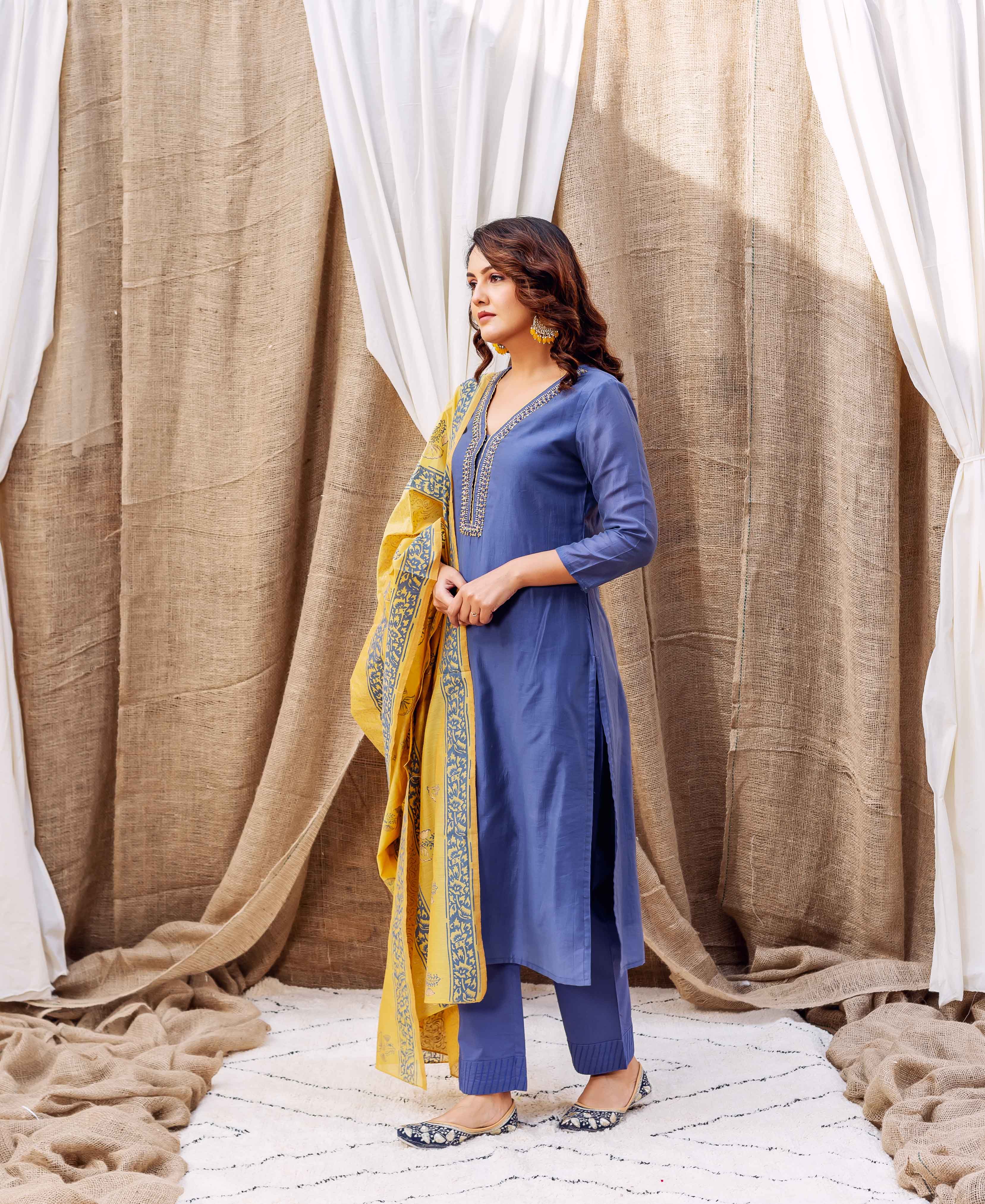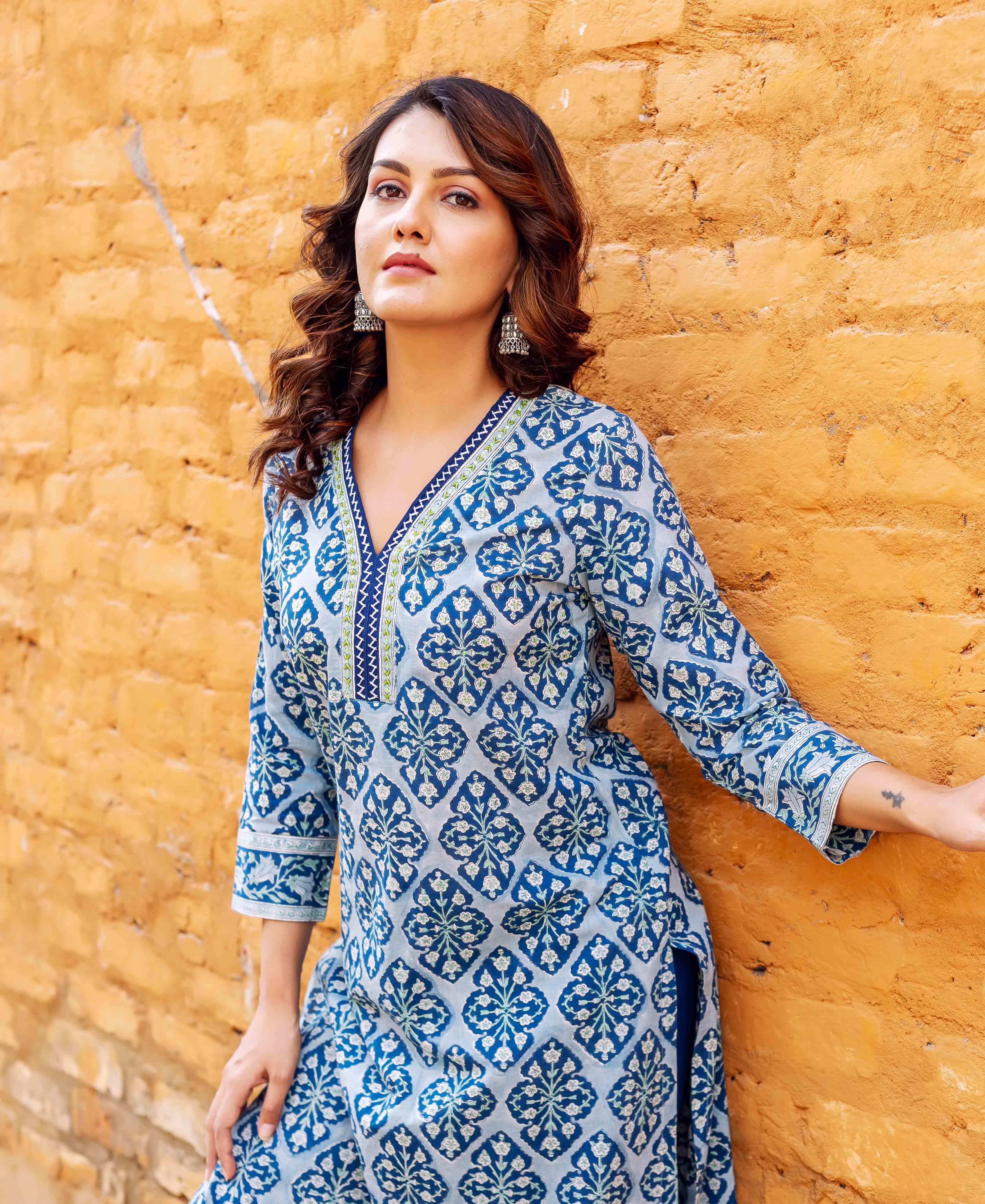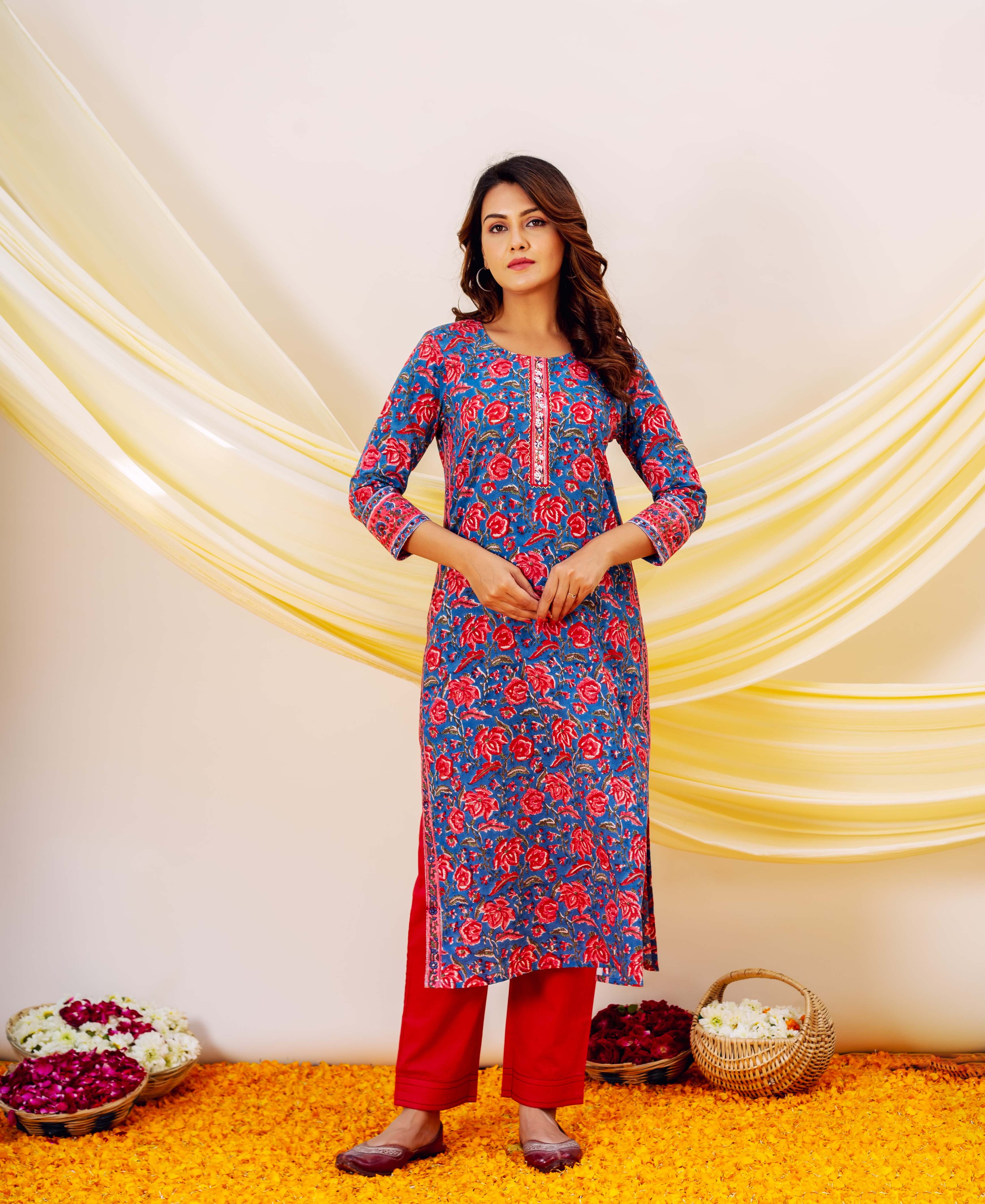 Indigo Hand Block Printed & Embroidered Straight Kurta
