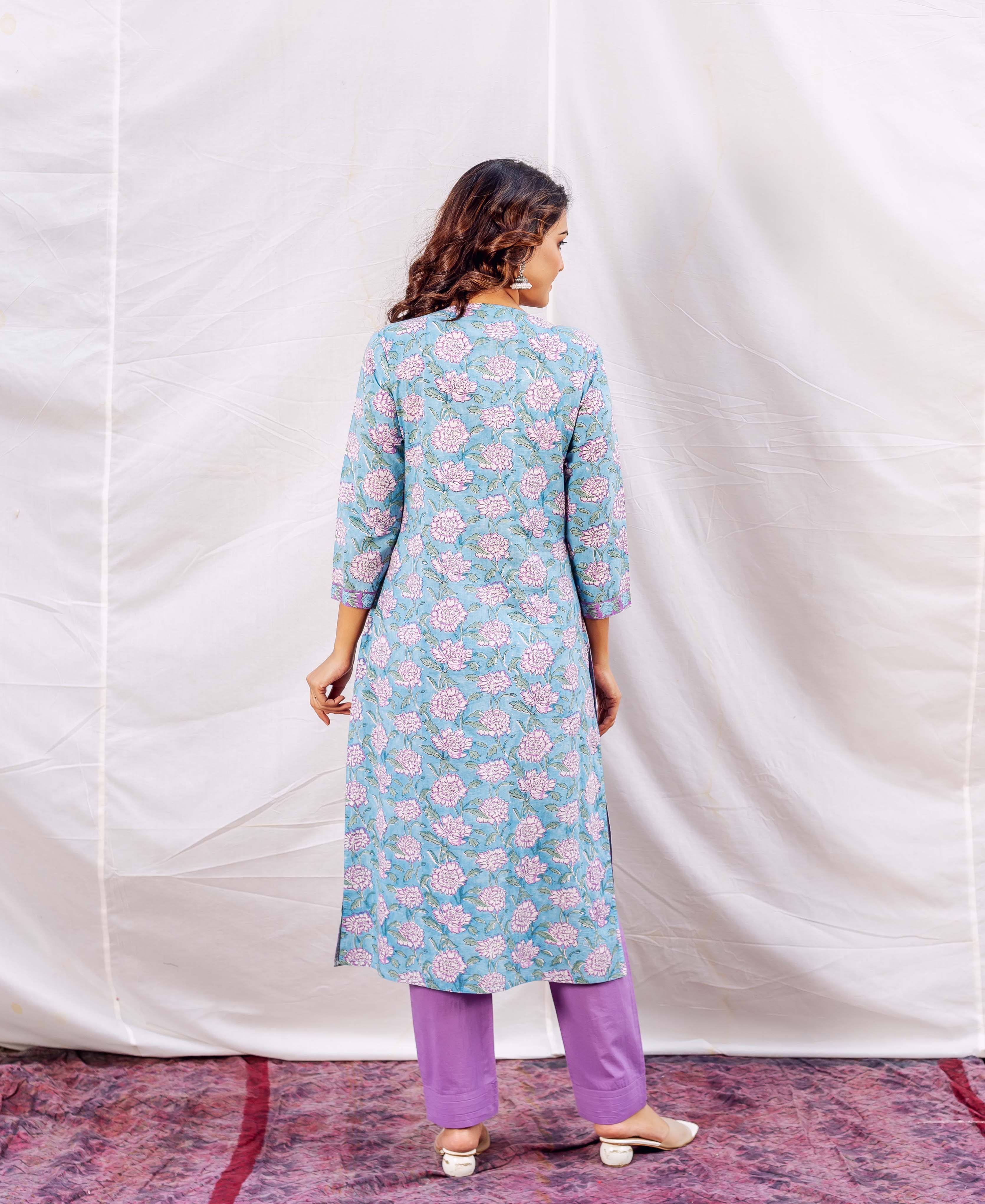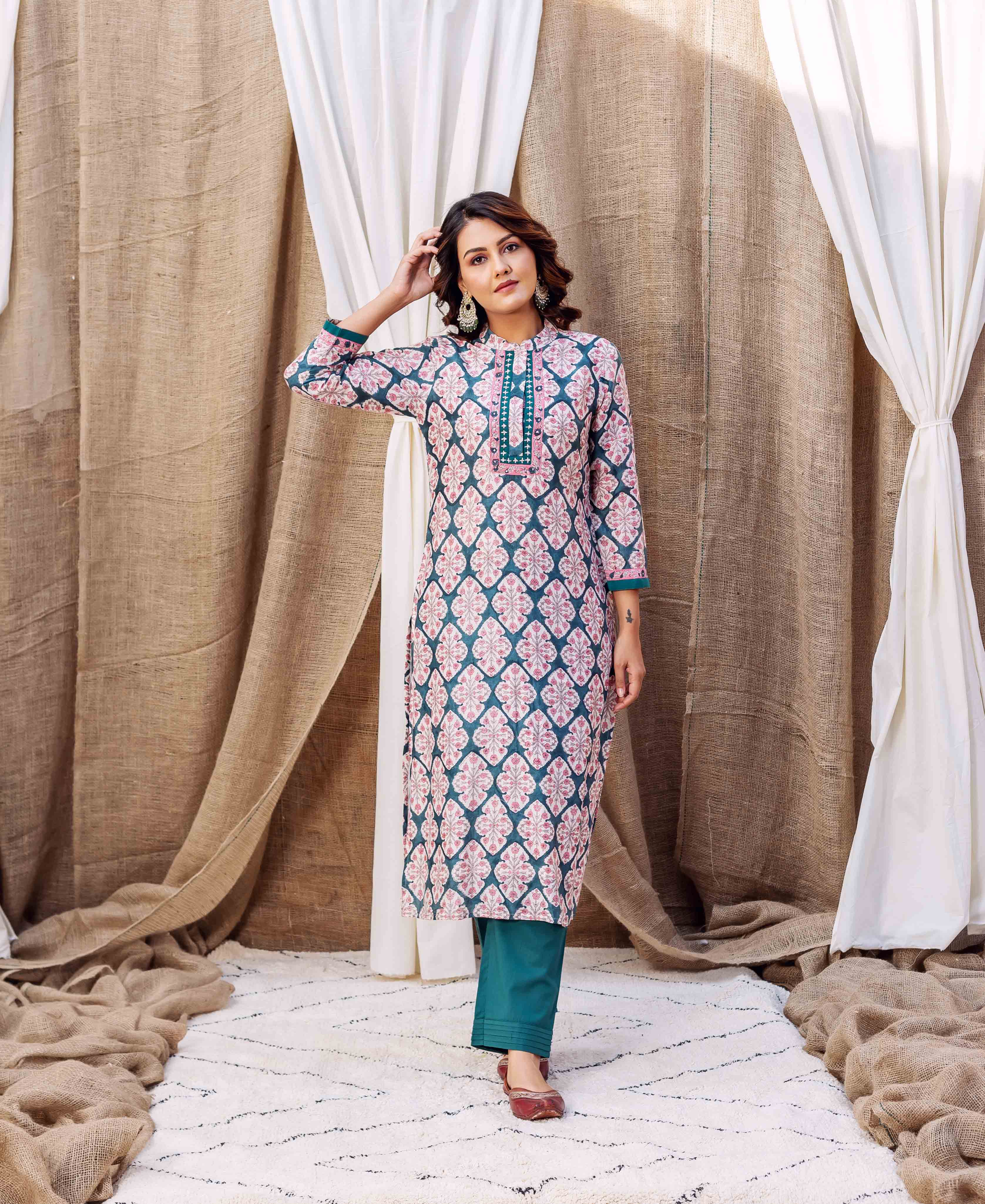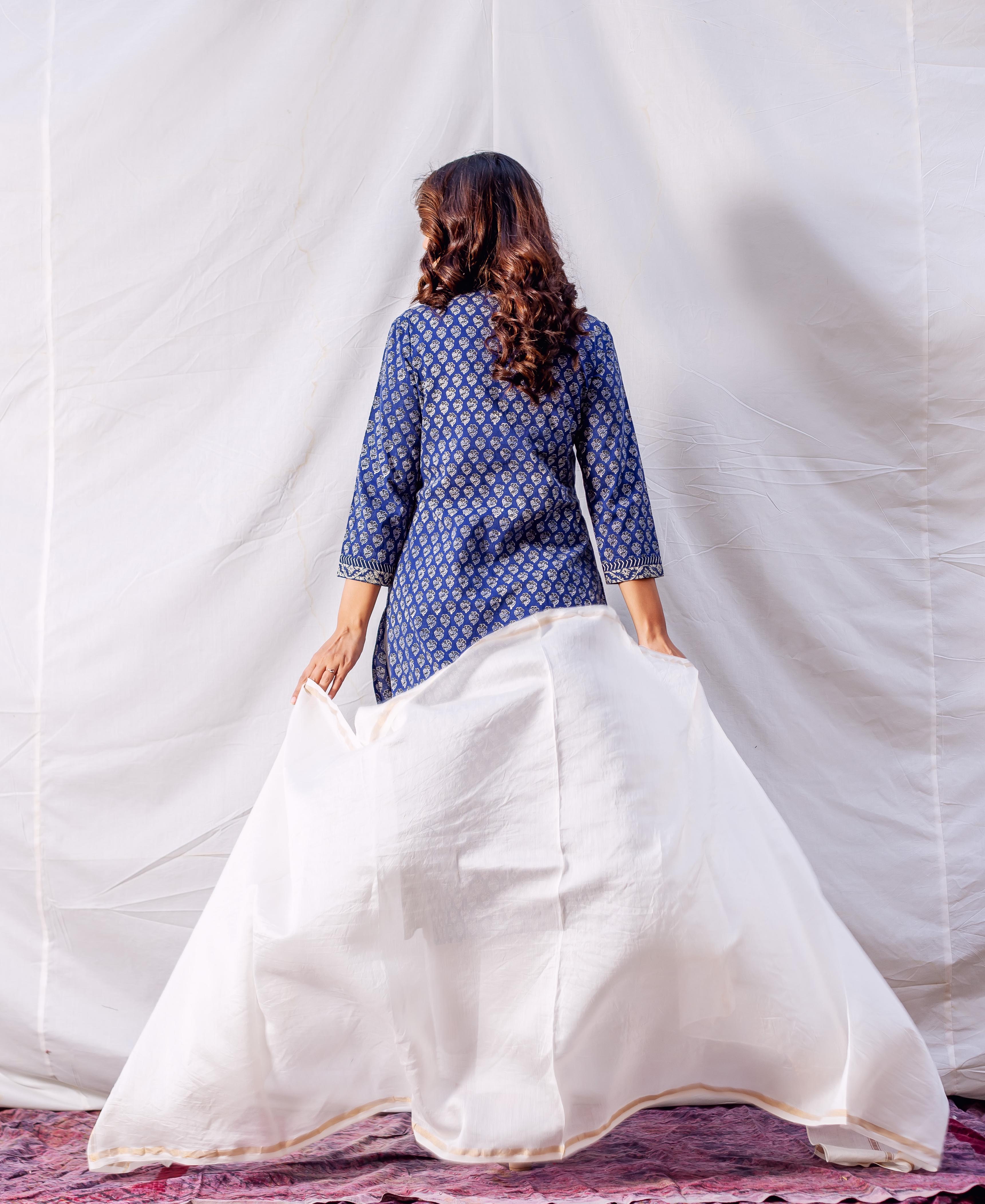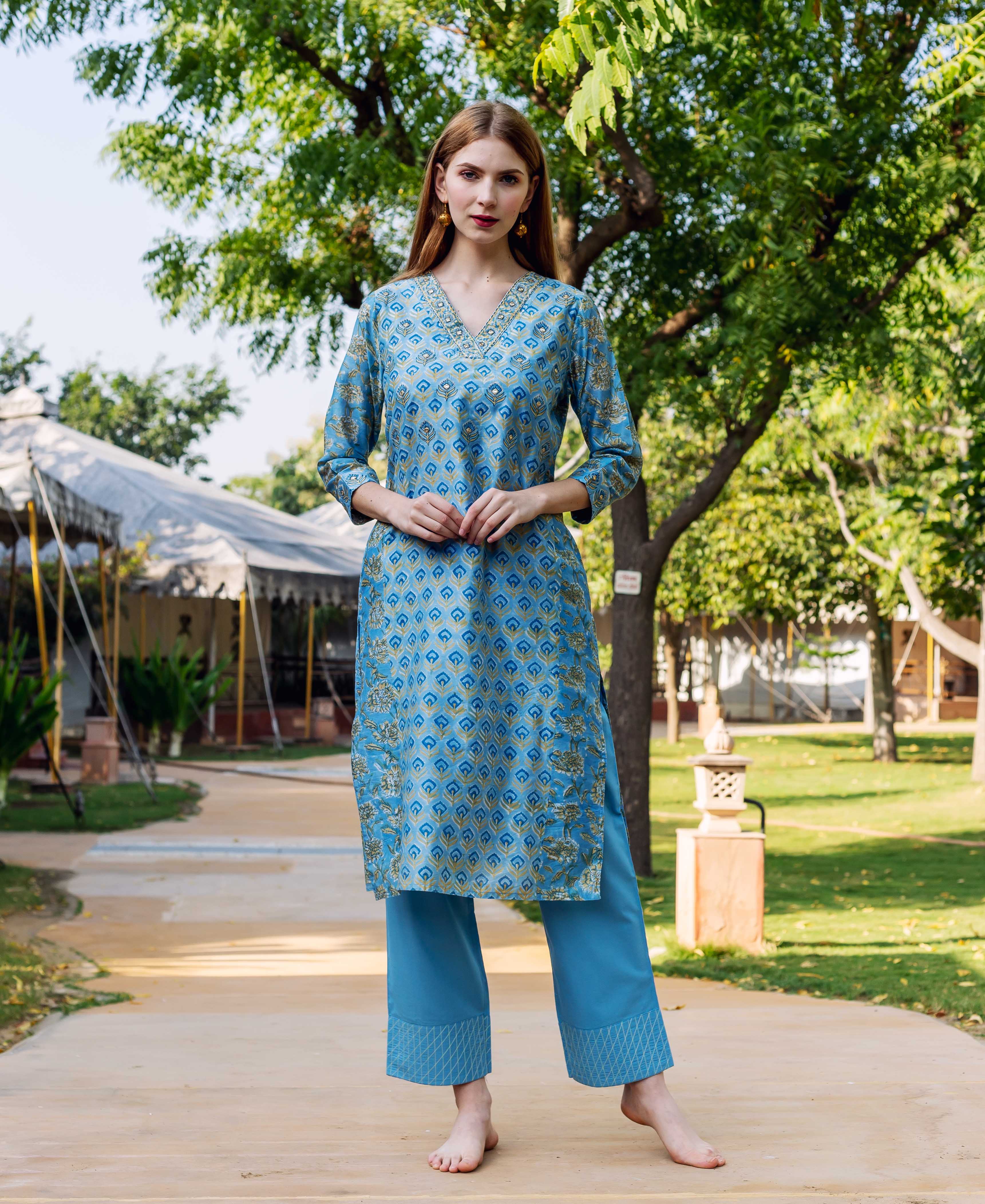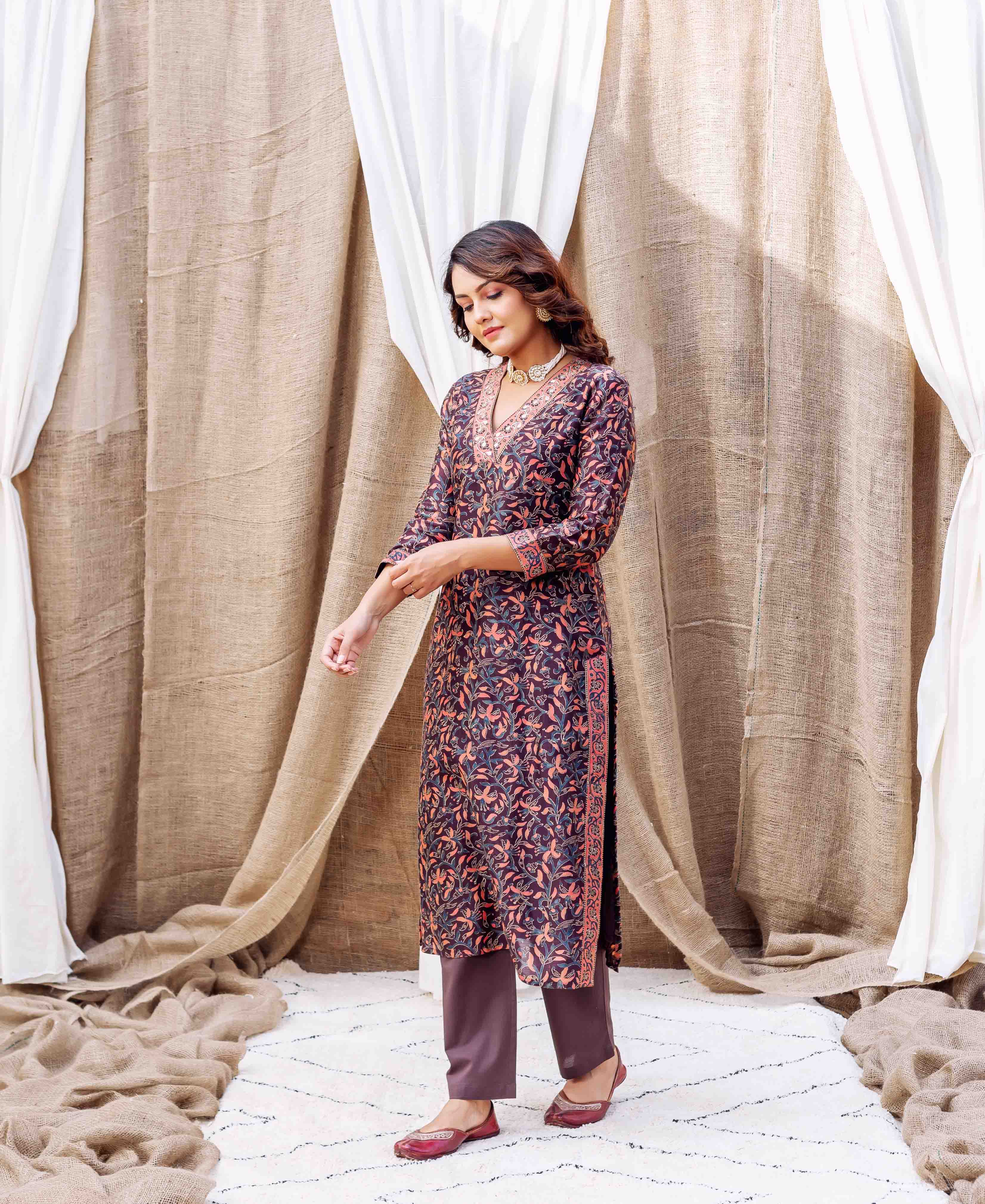 Indigo Hand Block Printed & Embroidered Straight Kurta