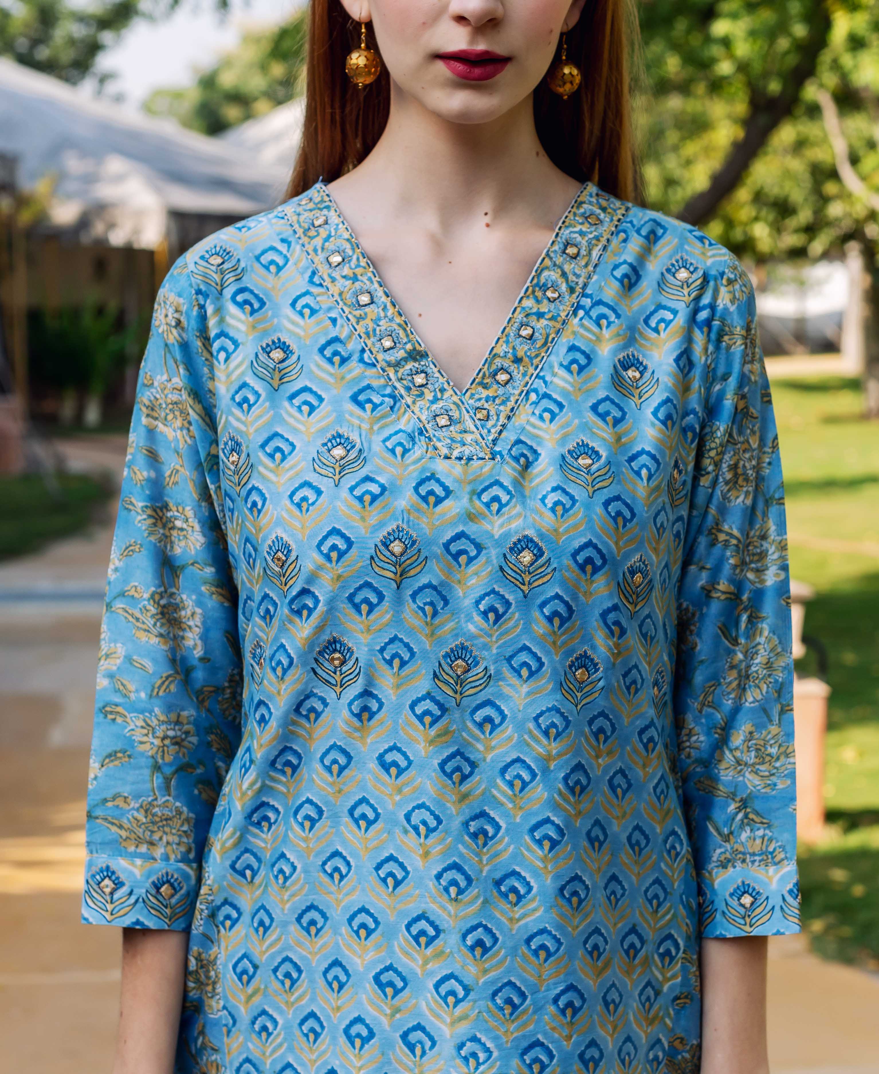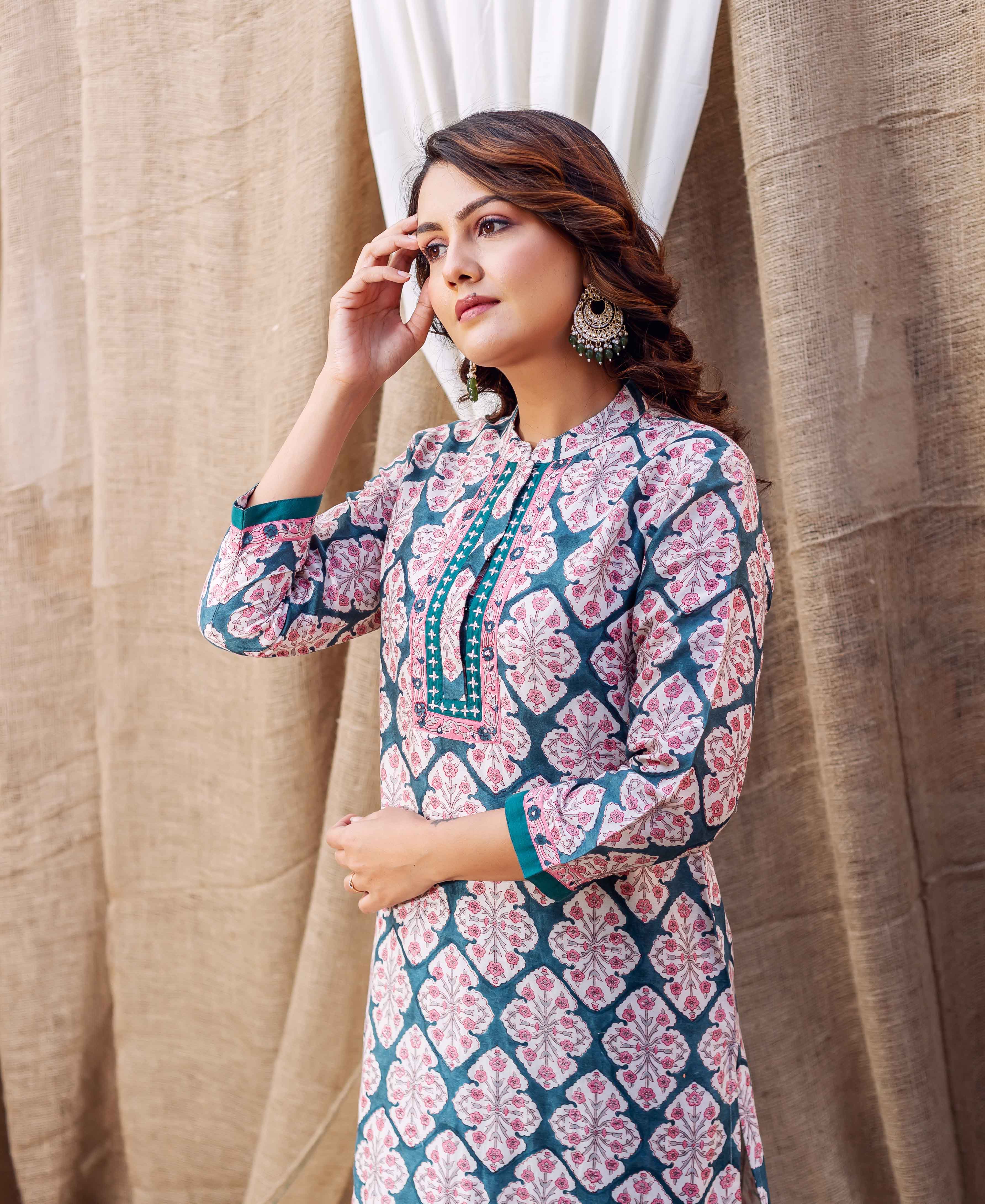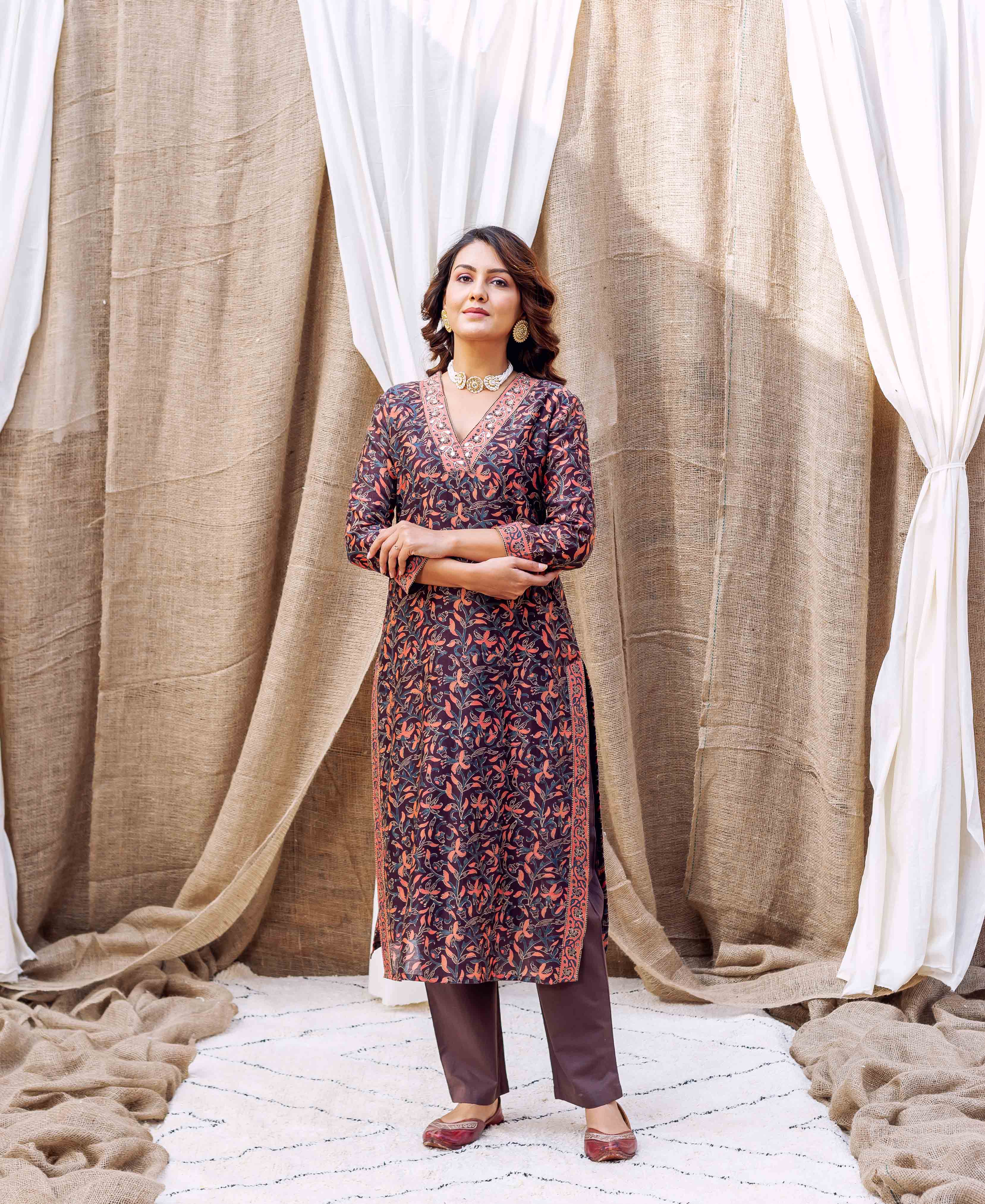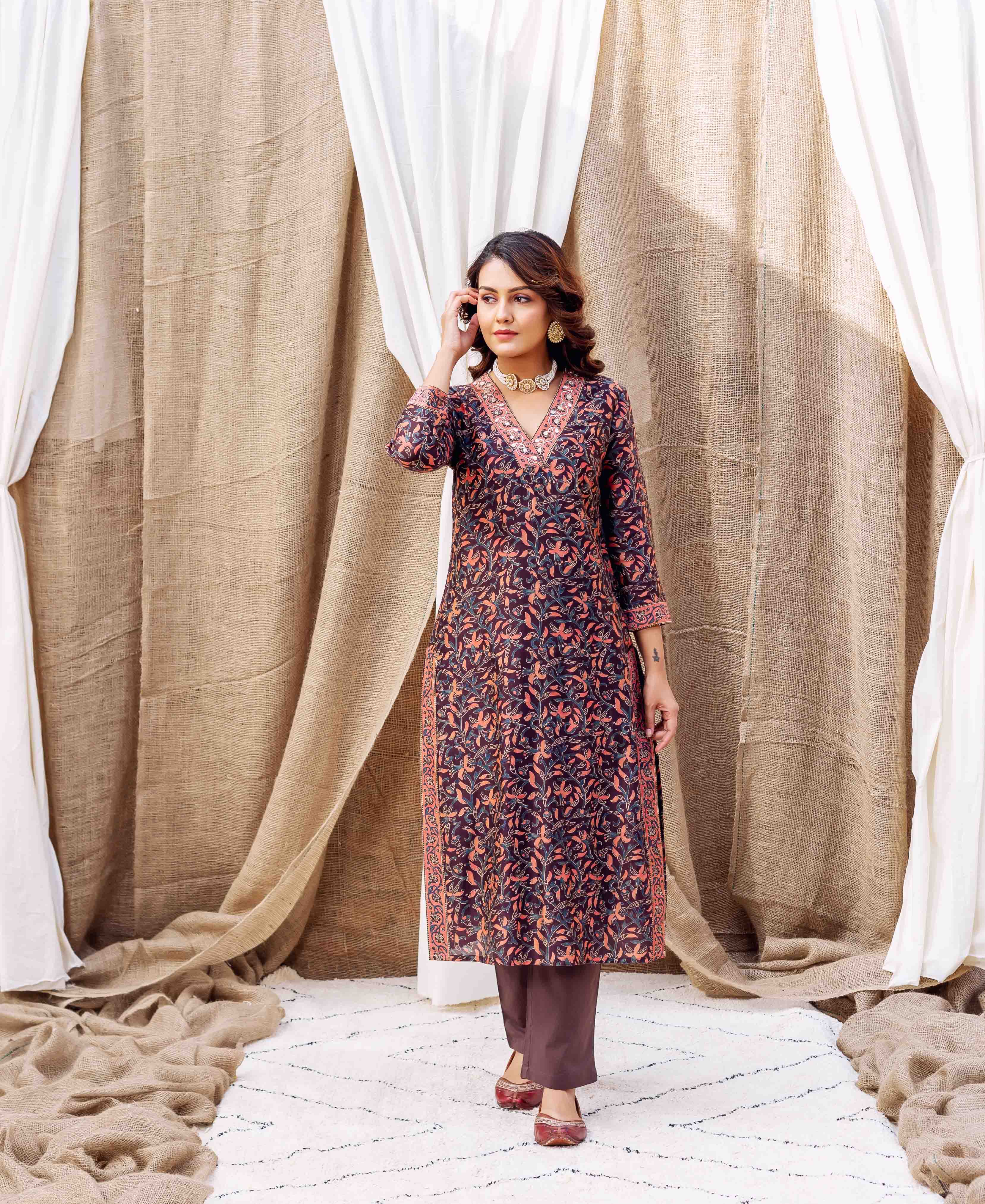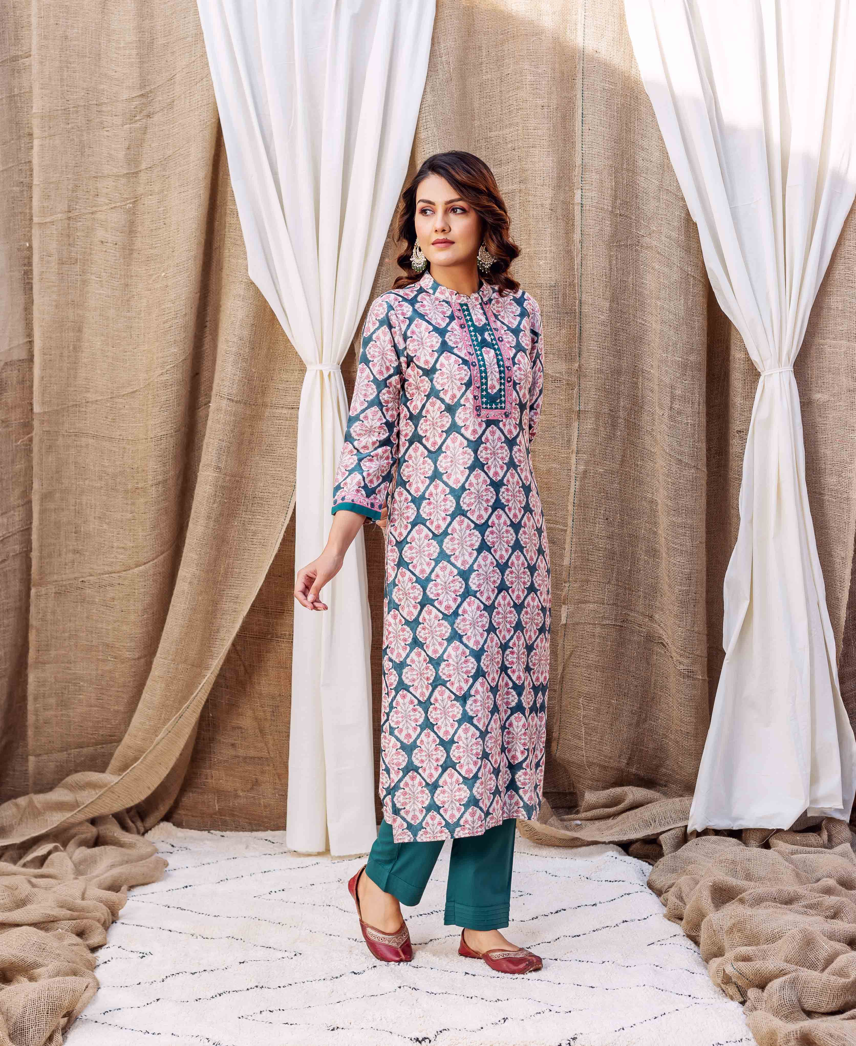 Indigo Hand Block Printed & Embroidered Straight Kurta