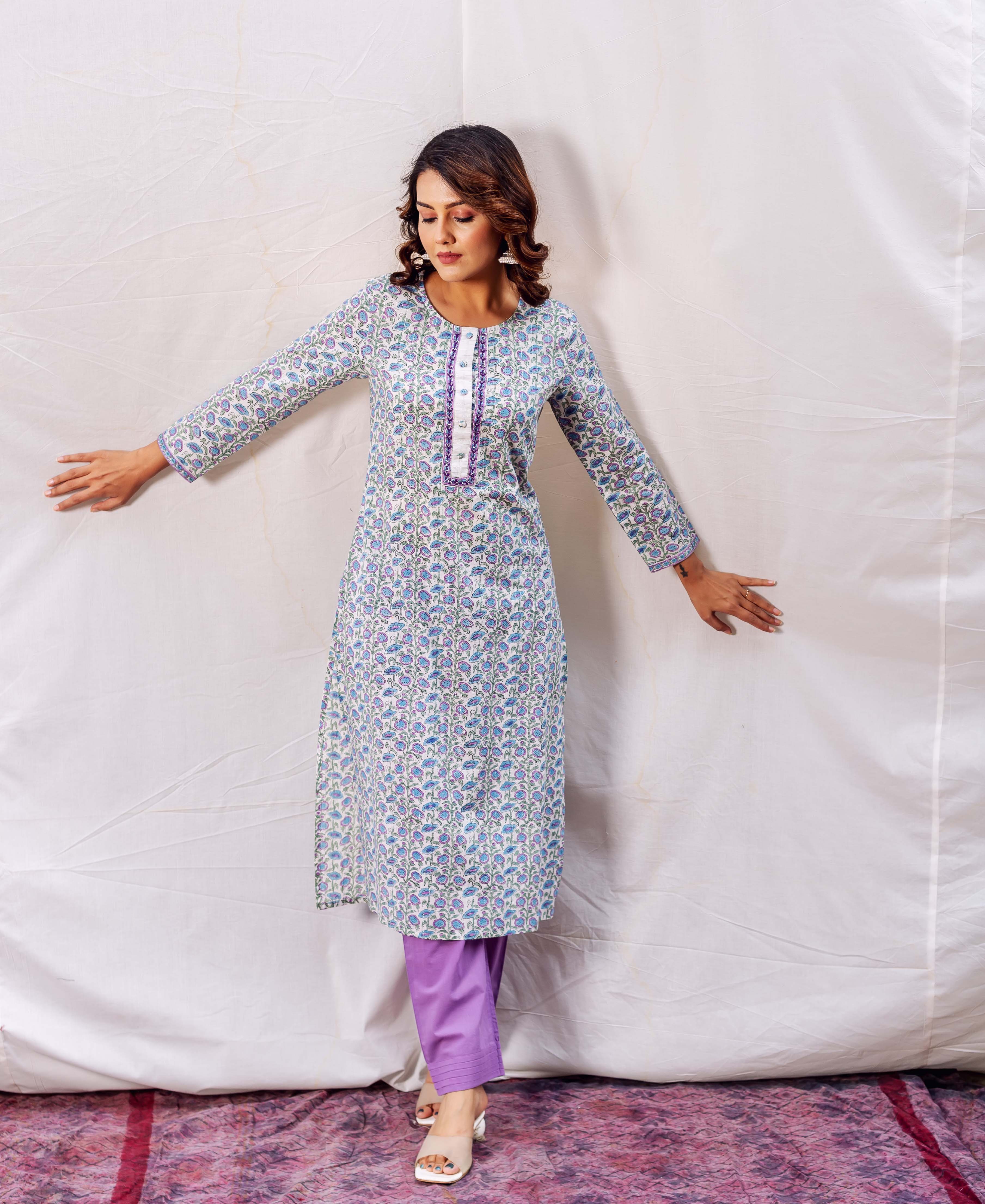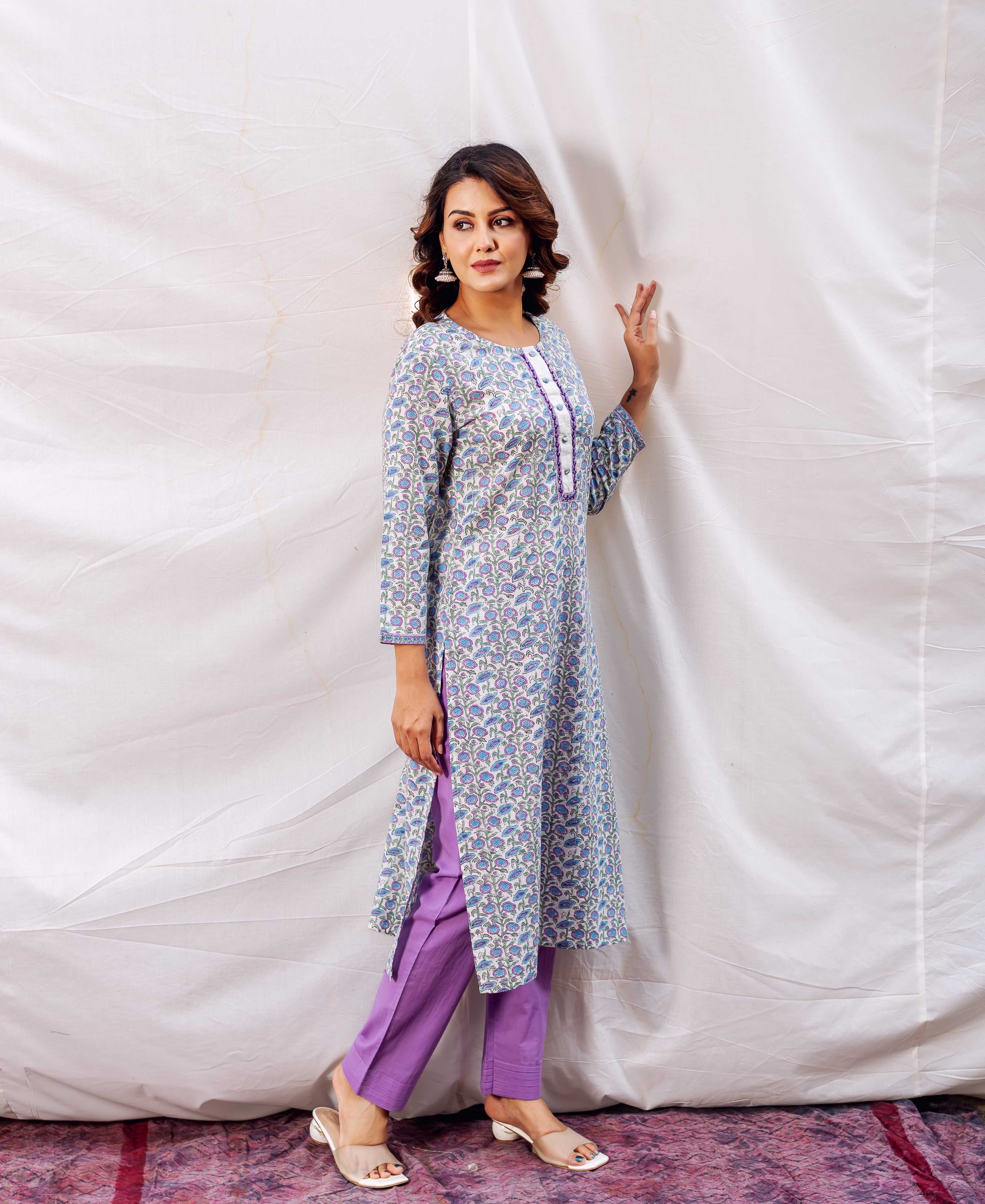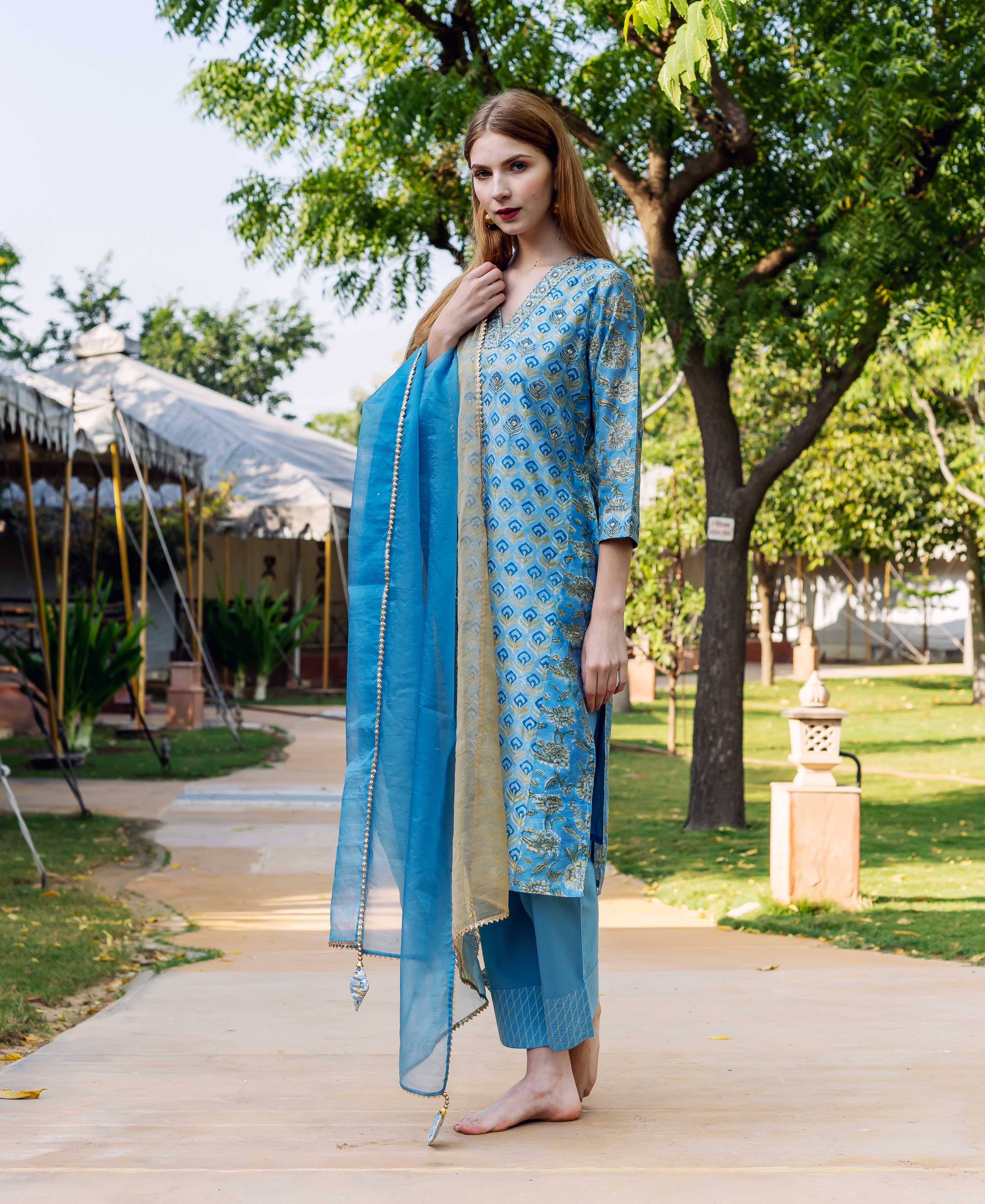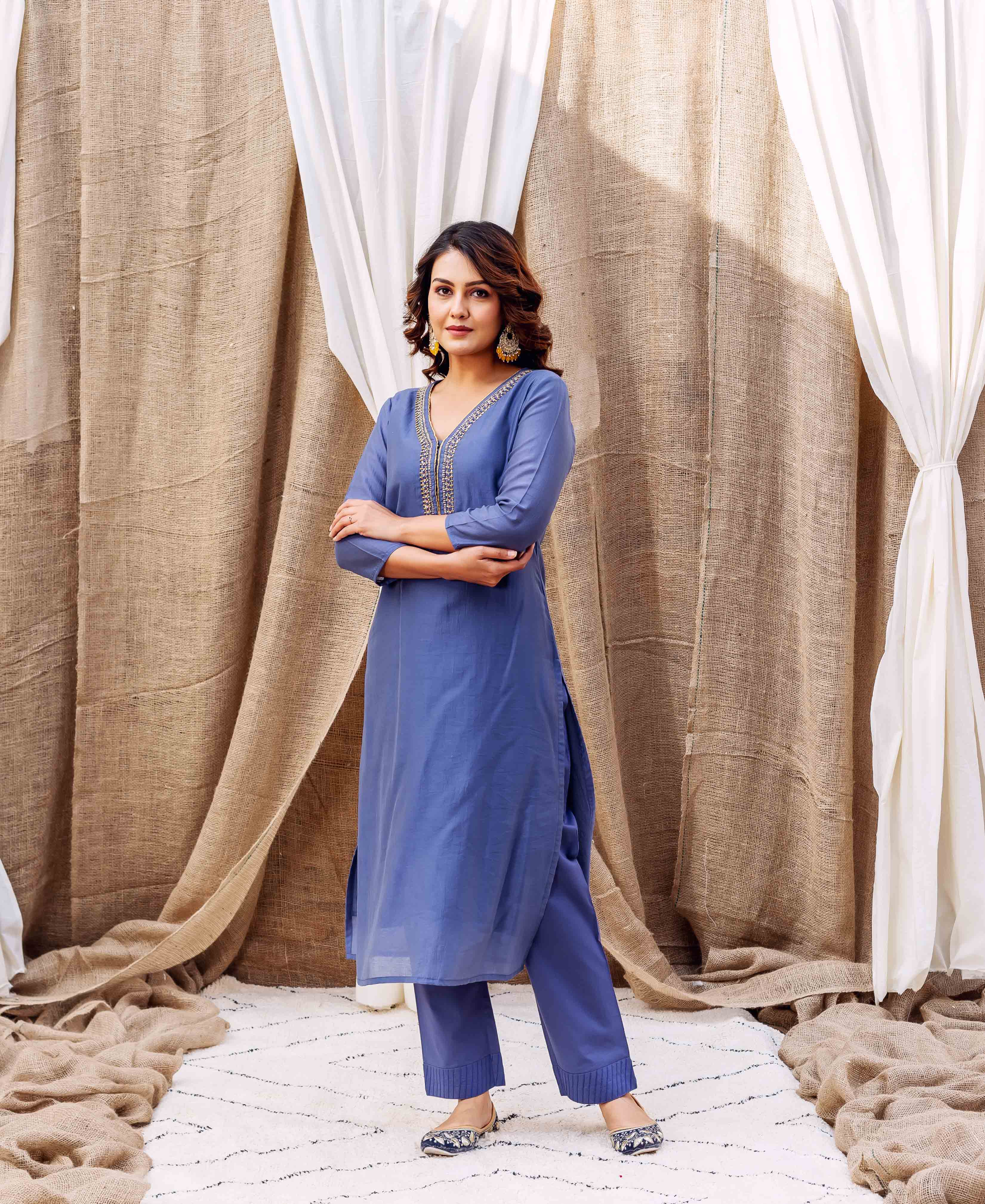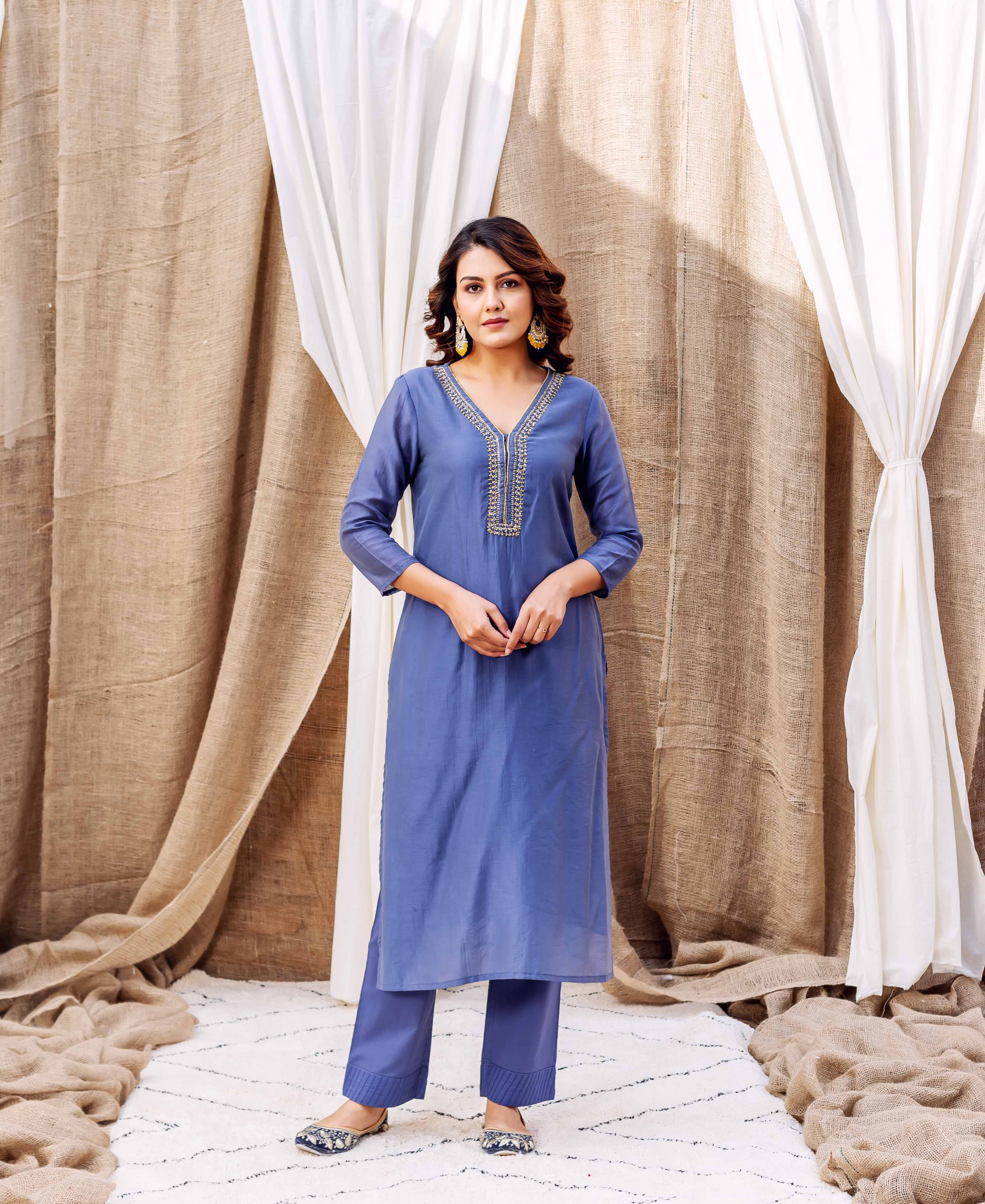 Indigo Hand Block Printed & Embroidered Straight Kurta