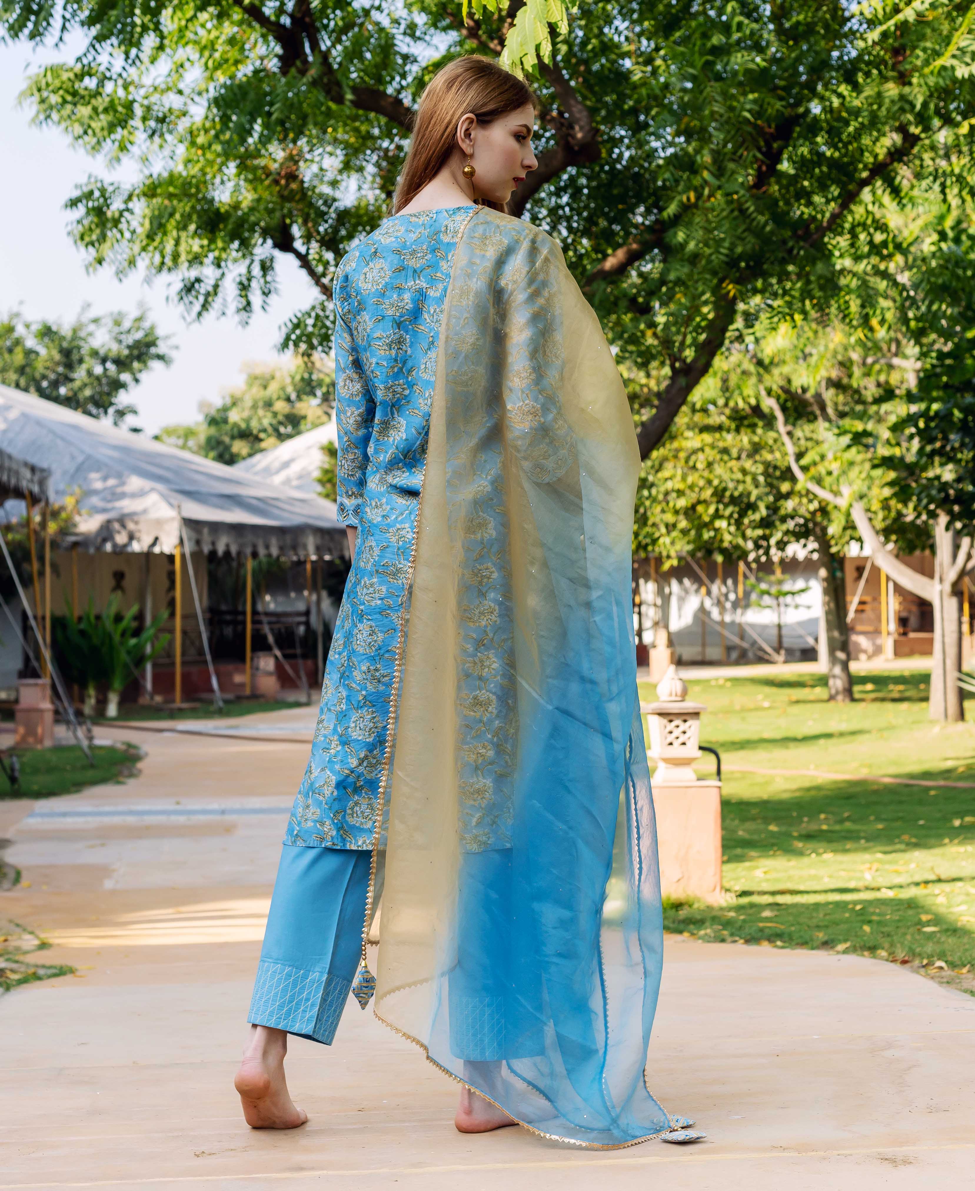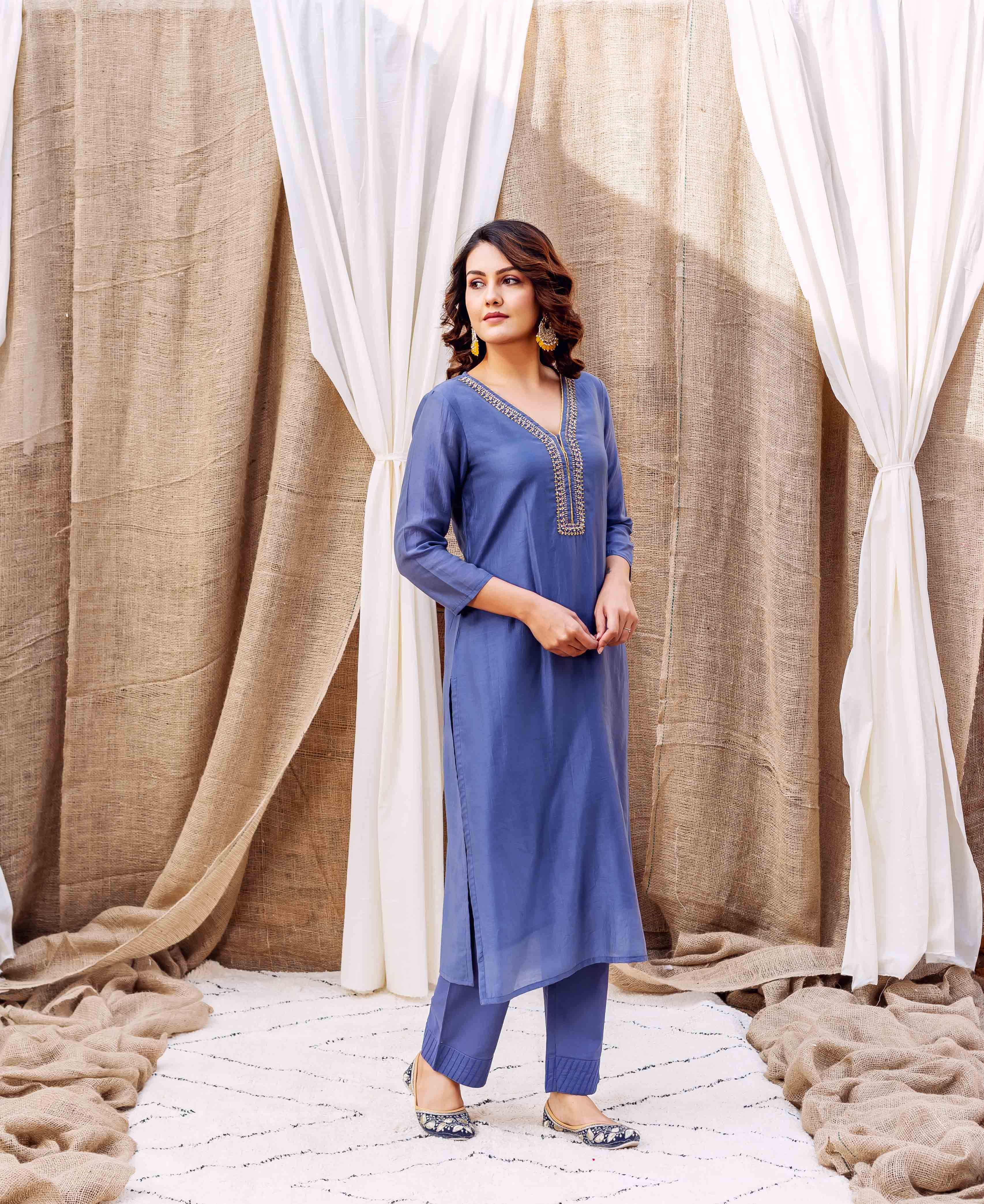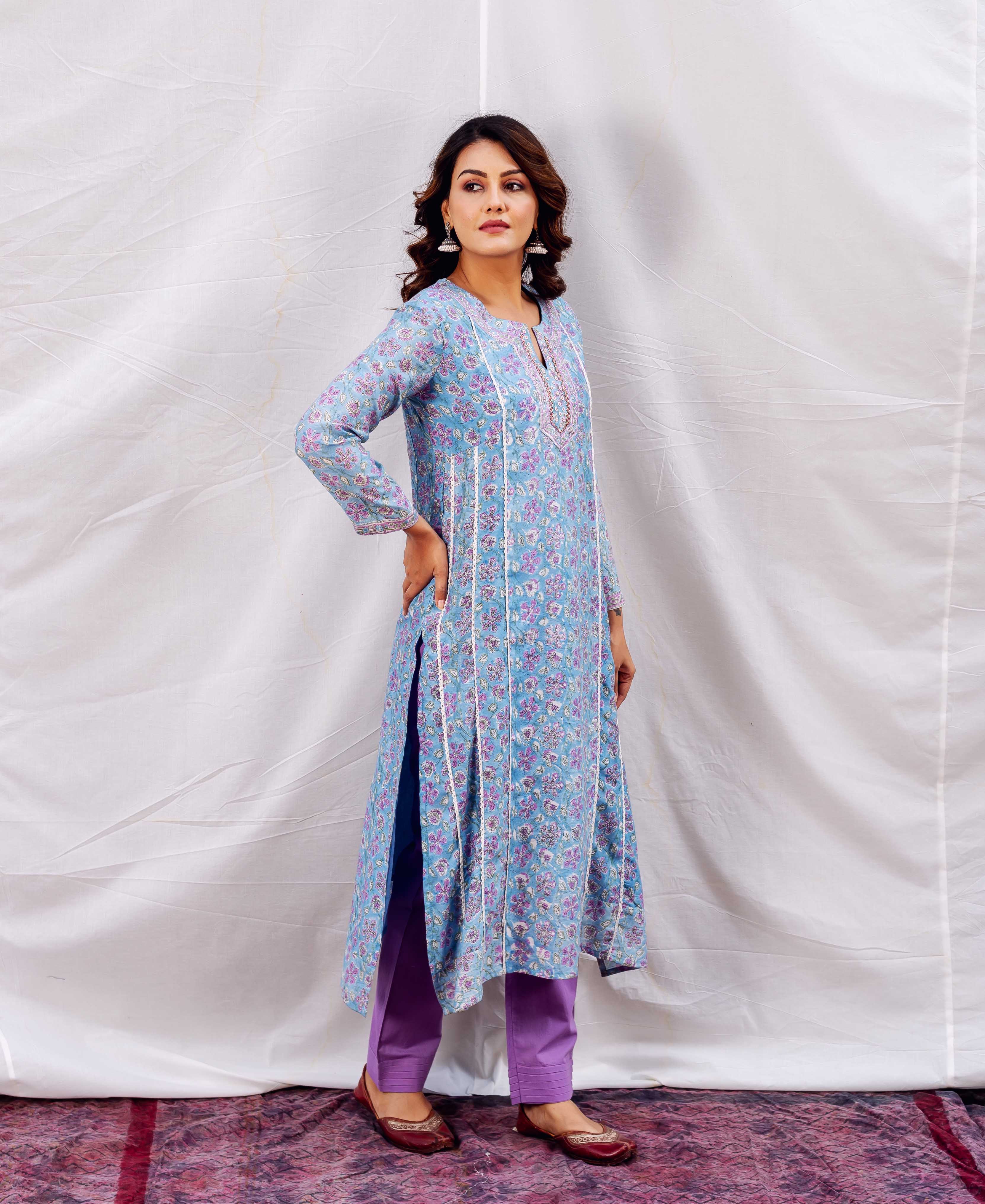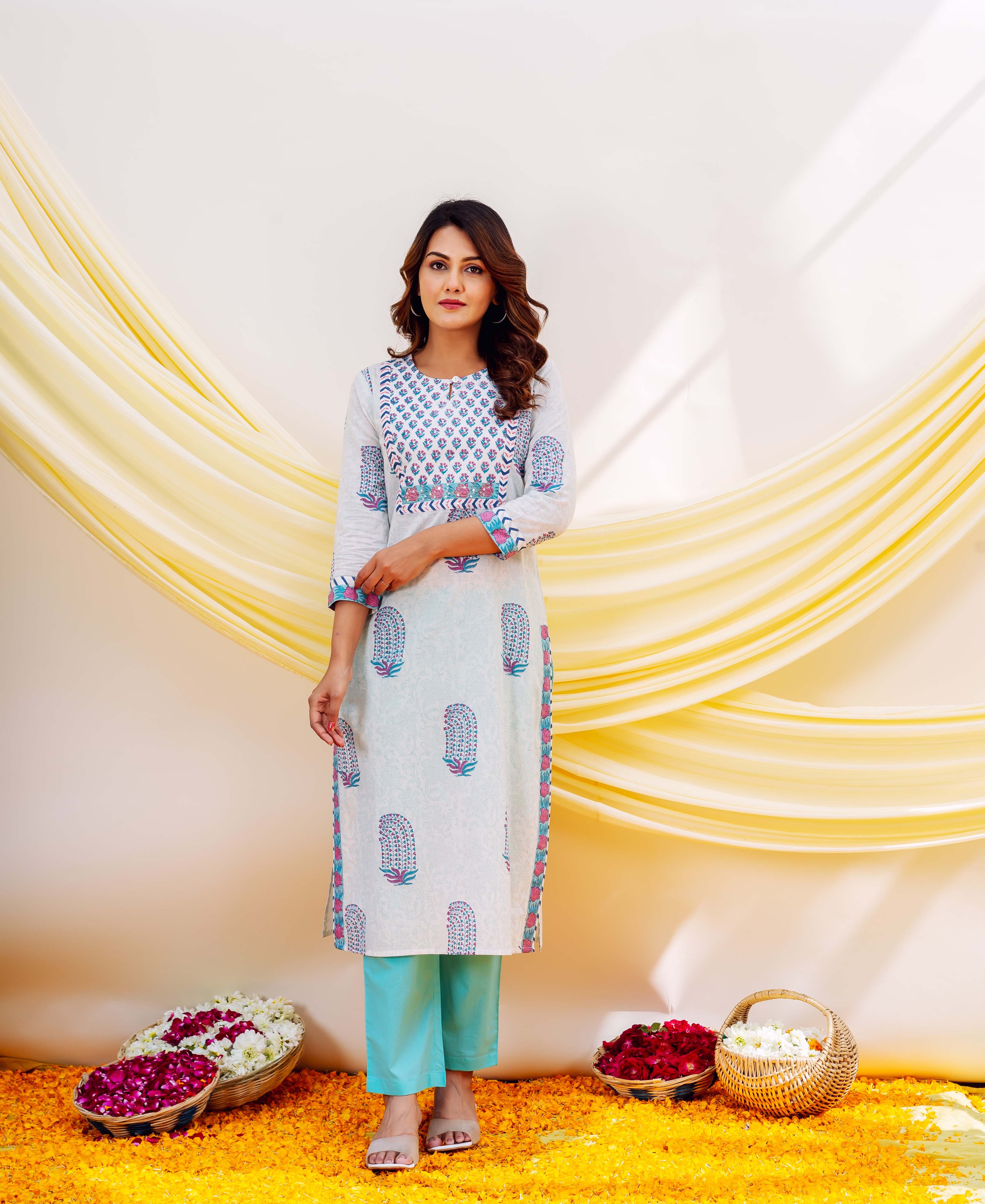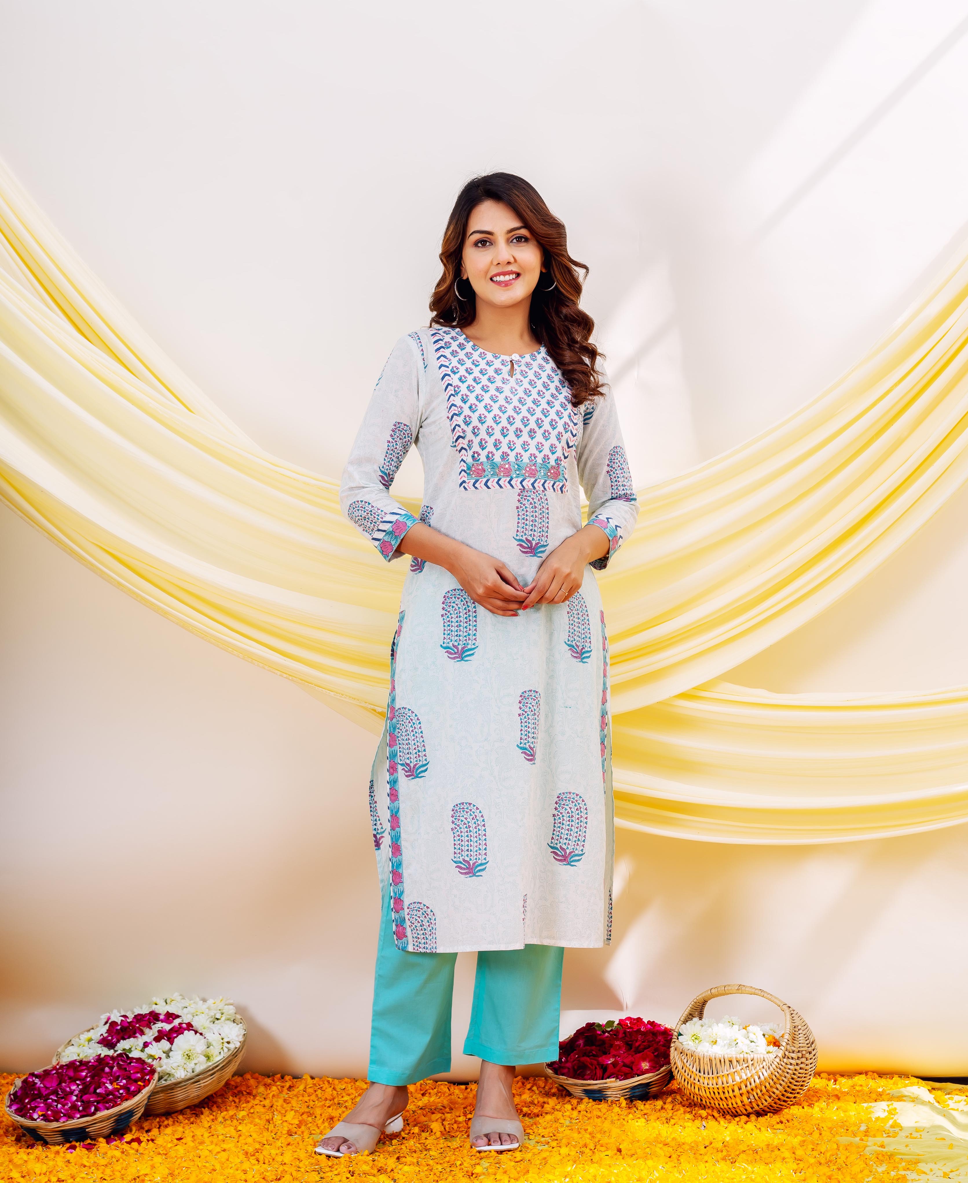 Indigo Hand Block Printed & Embroidered Straight Kurta
