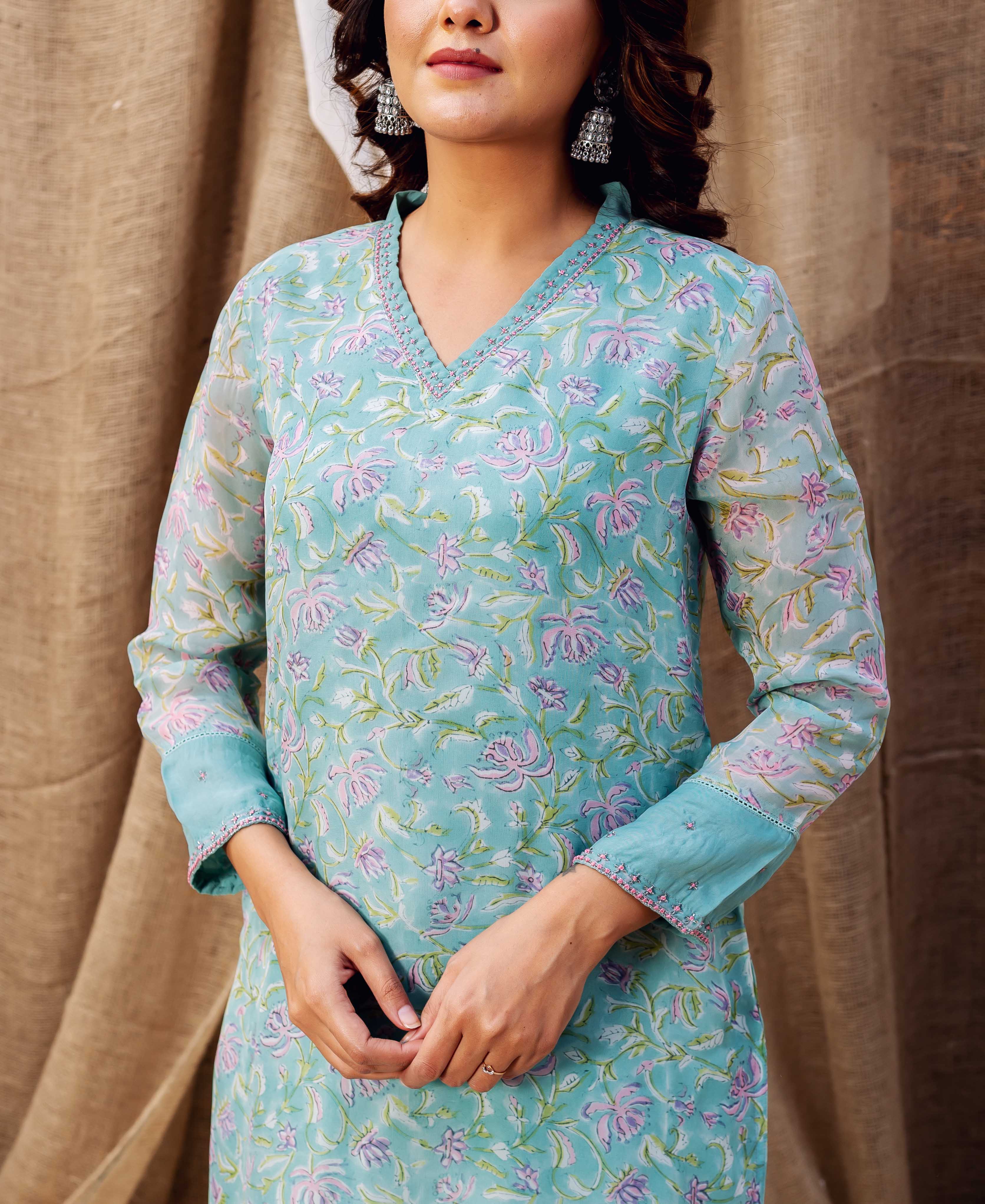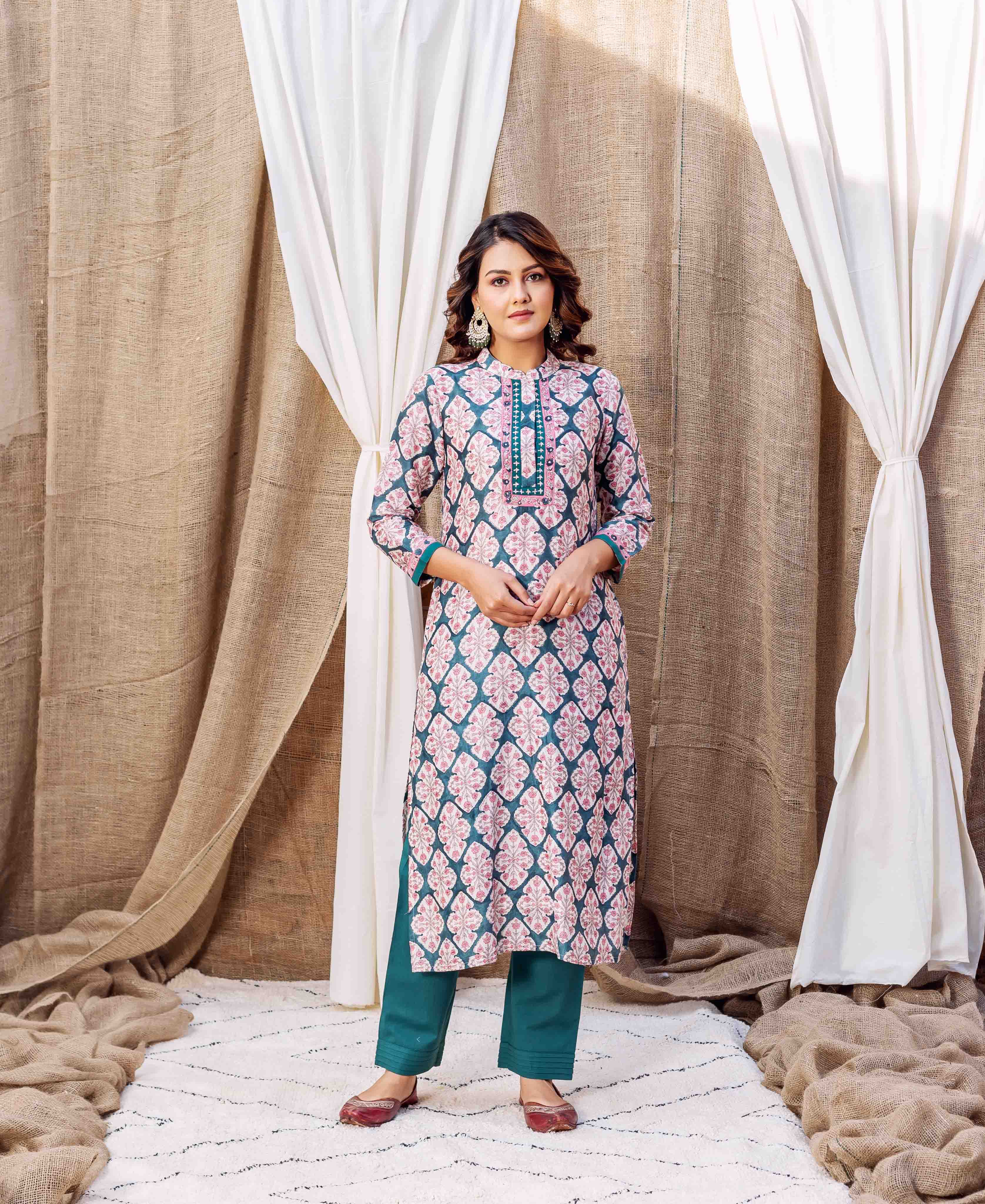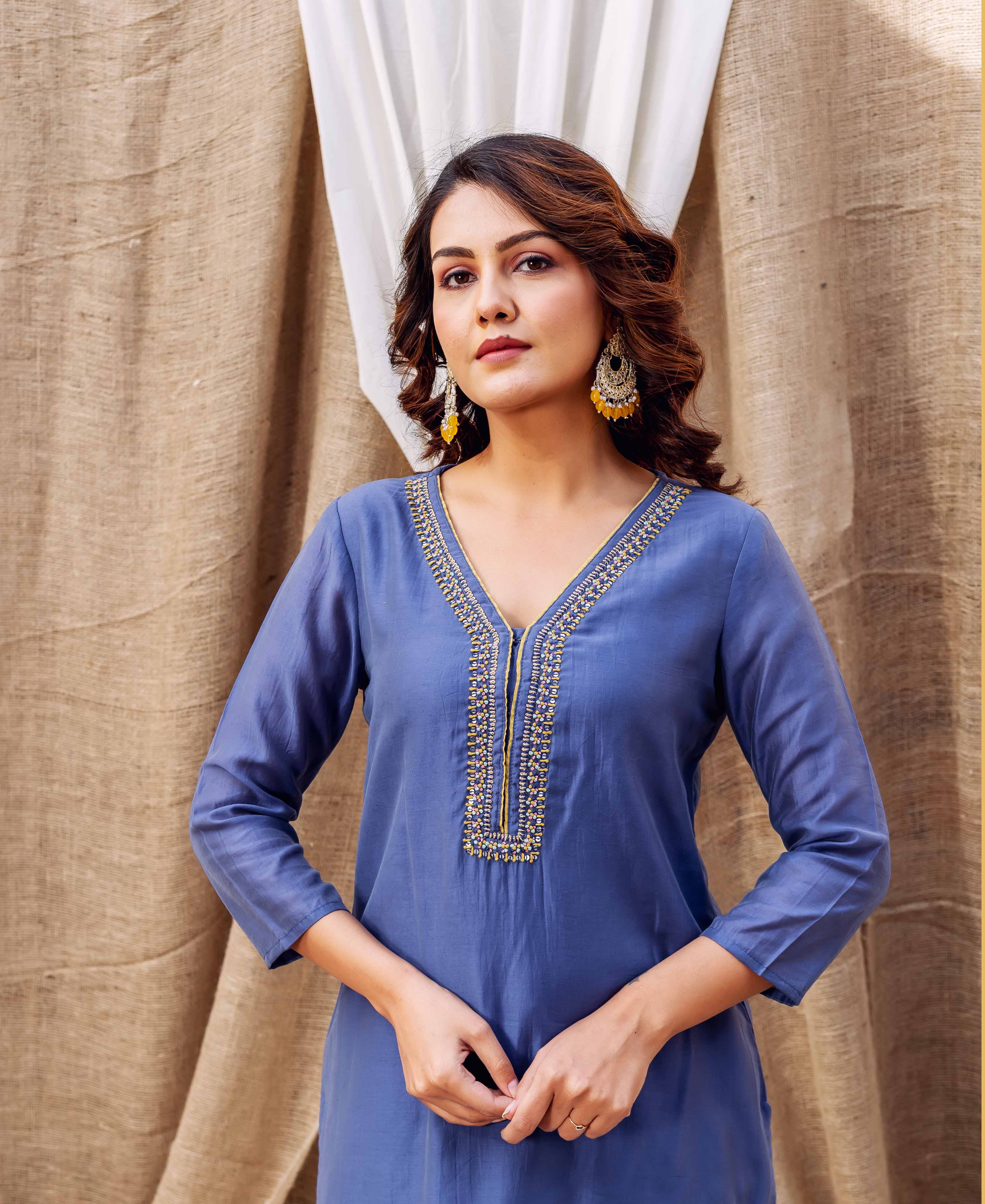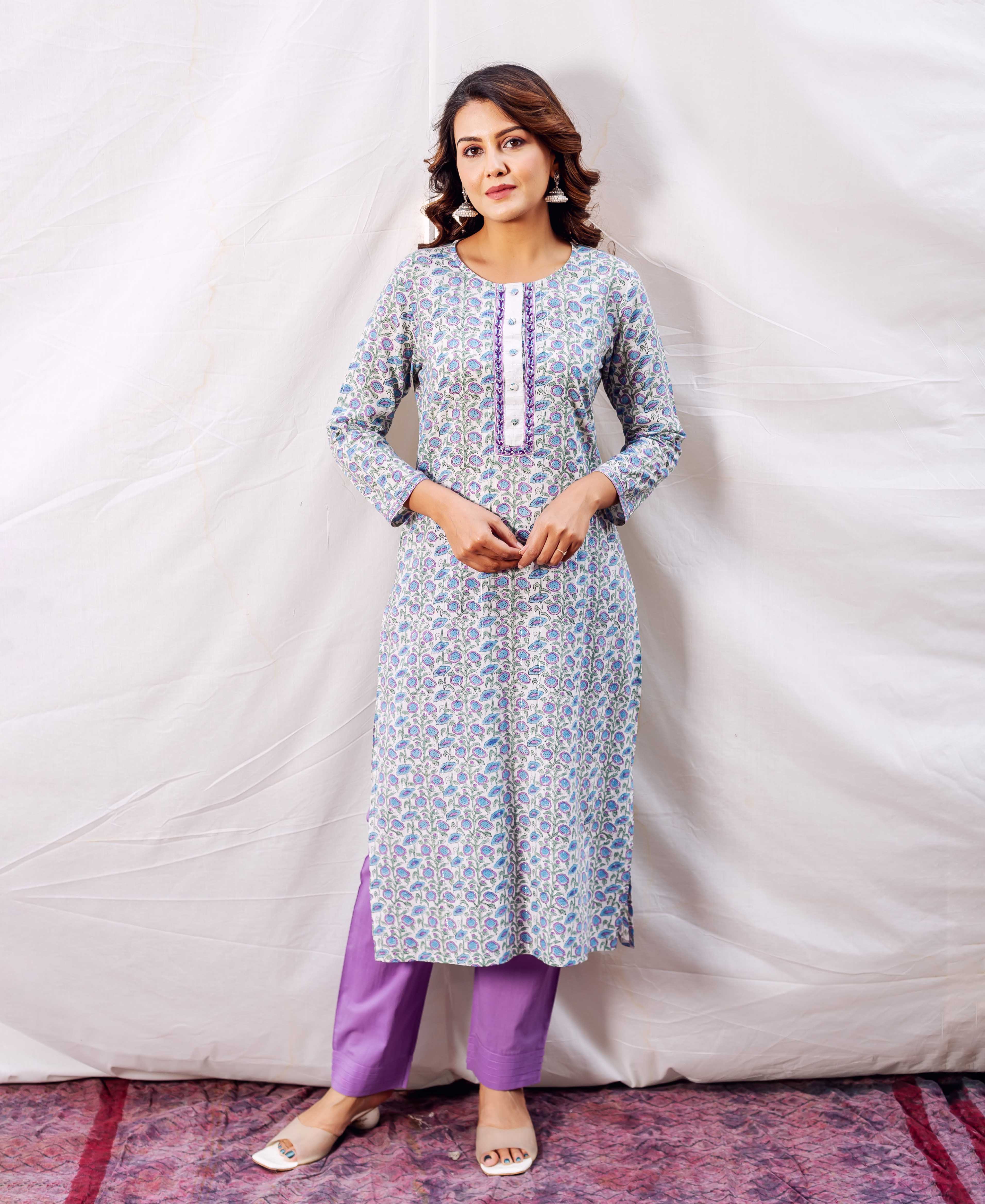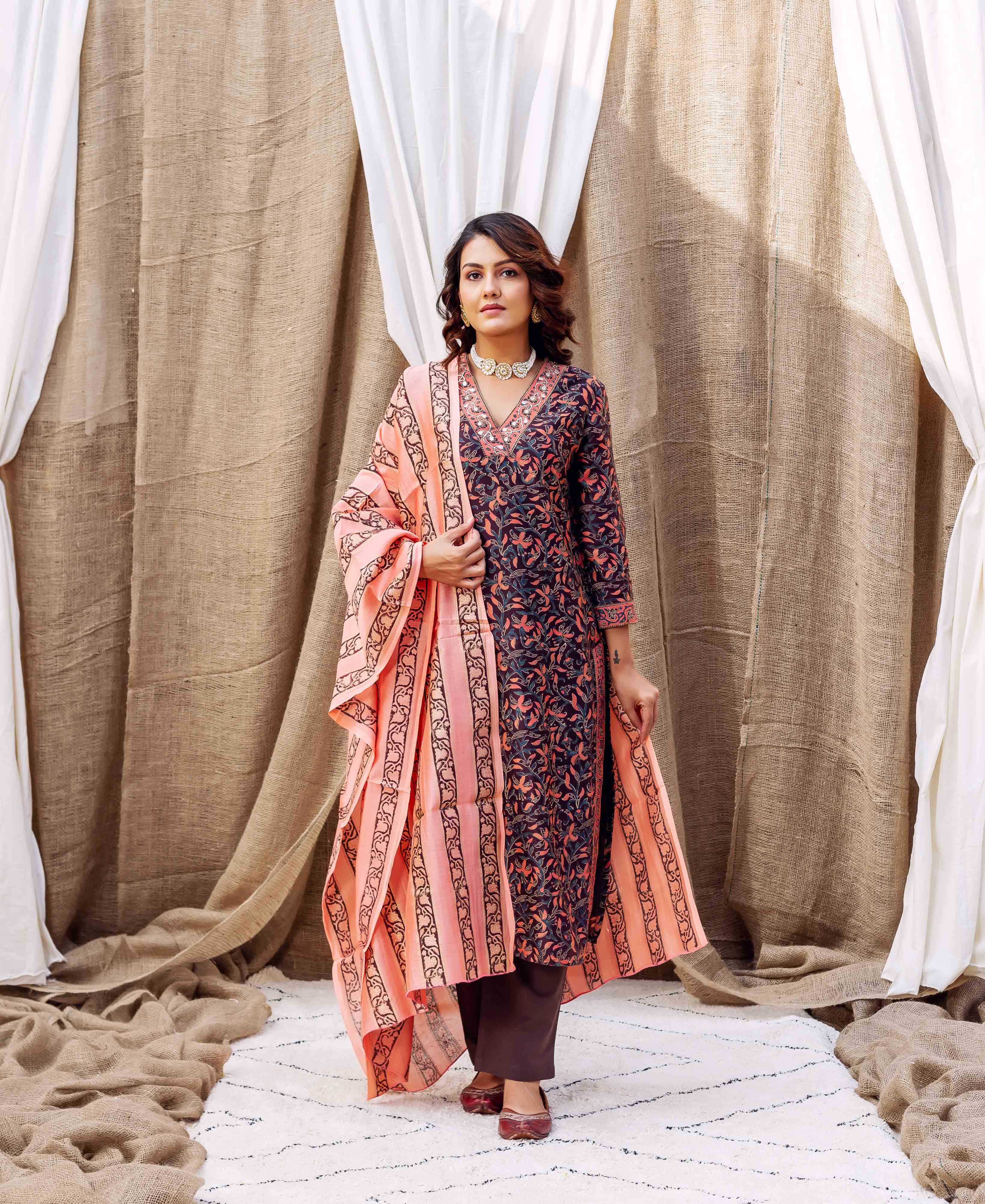 Indigo Hand Block Printed & Embroidered Straight Kurta