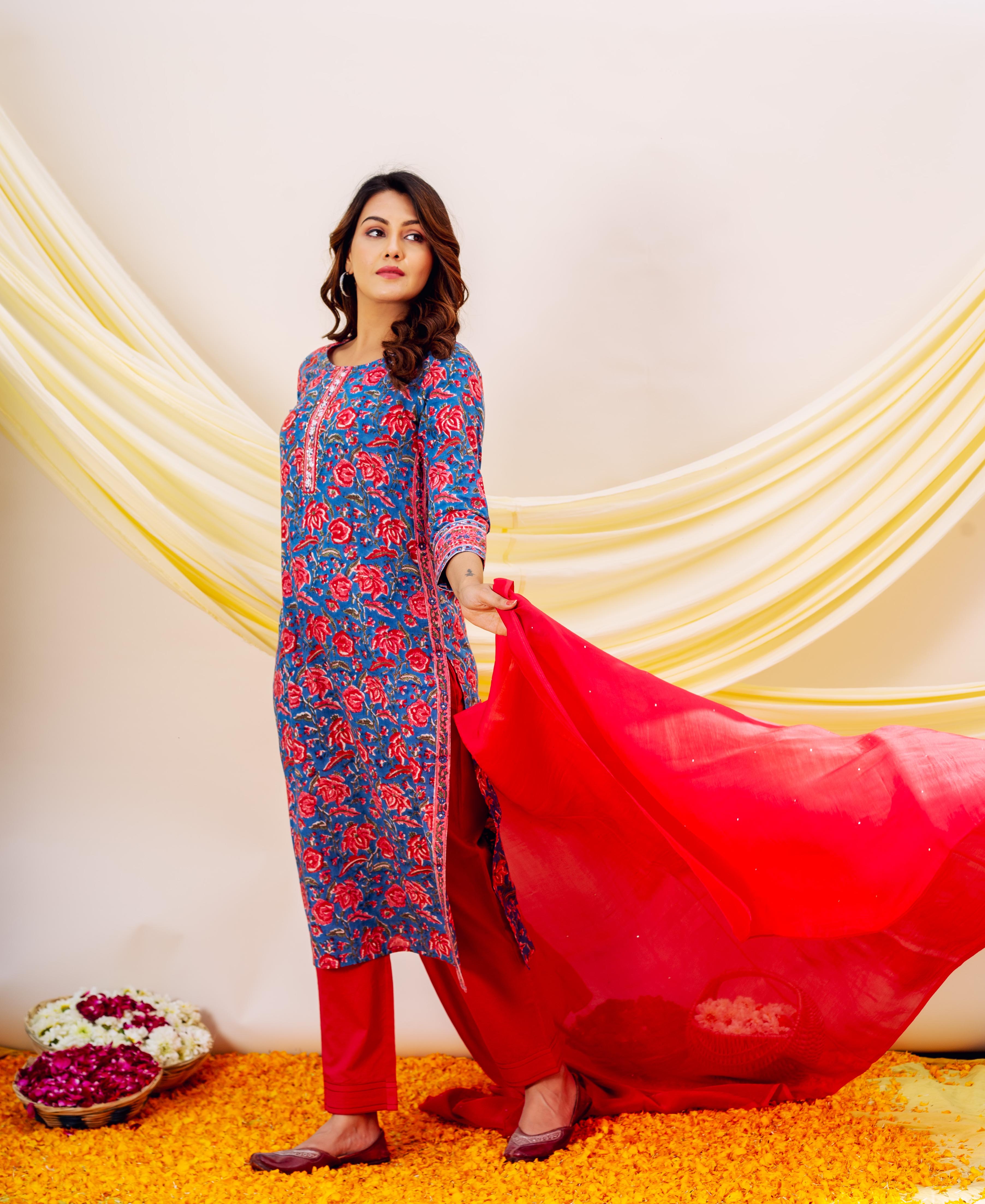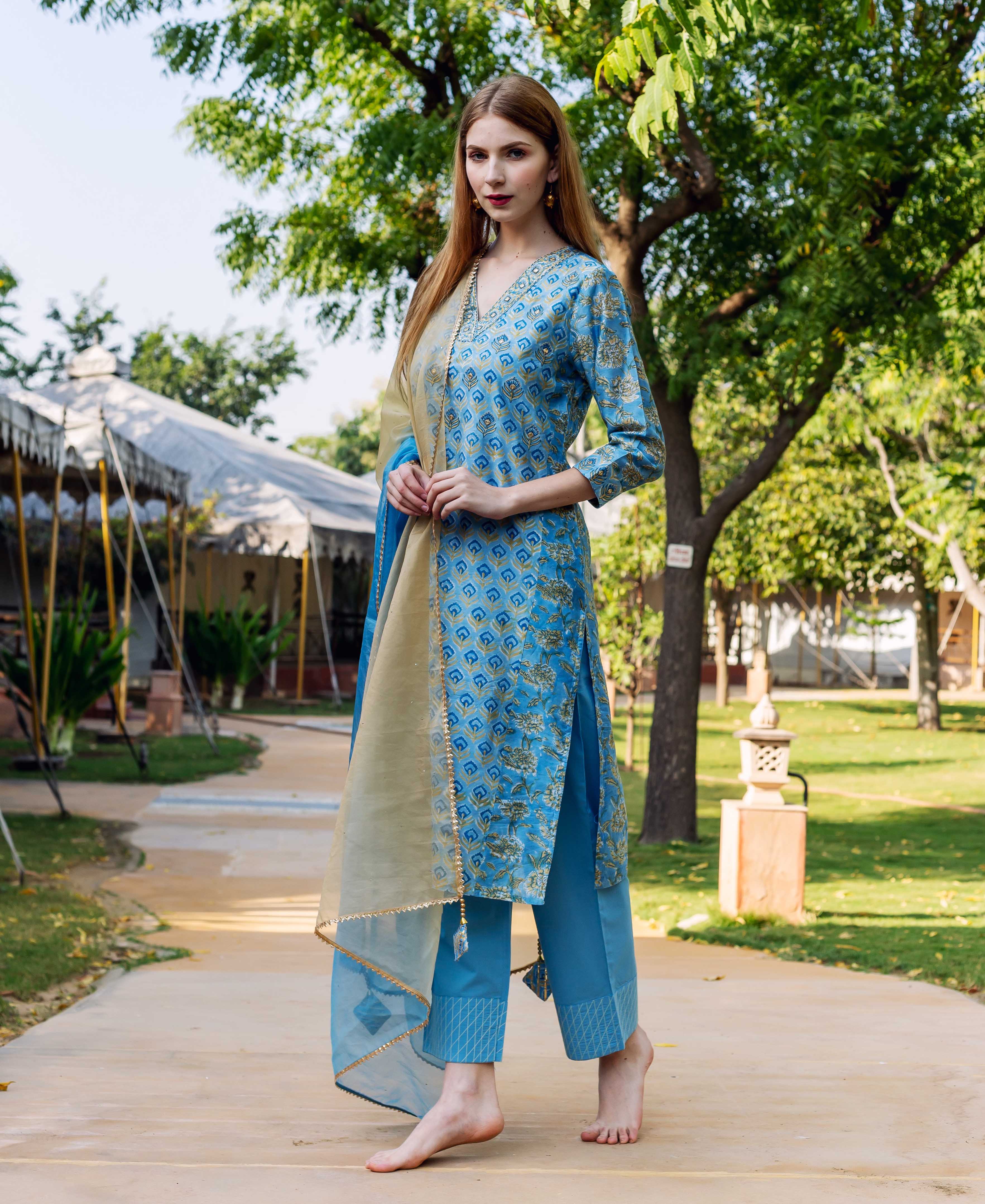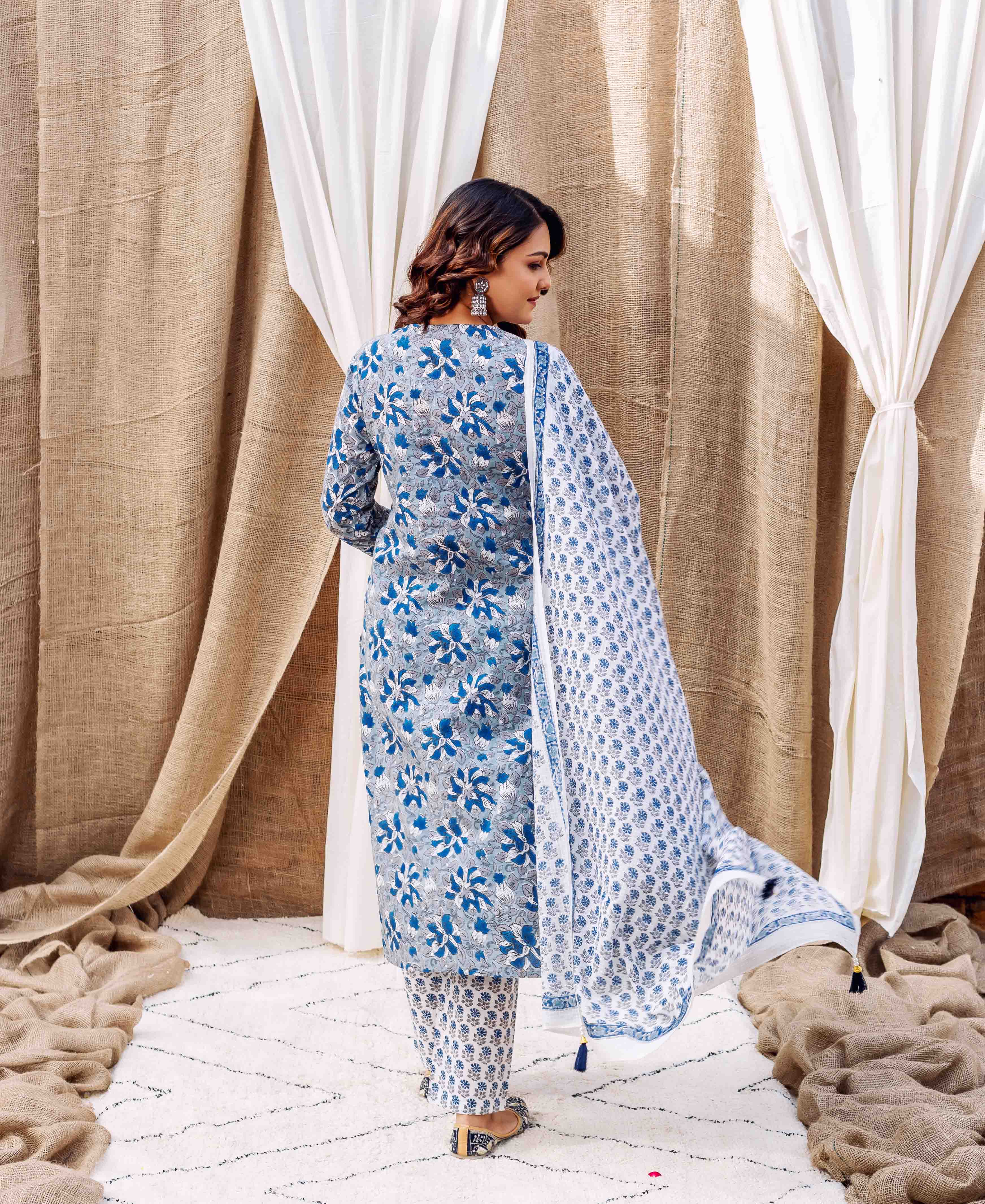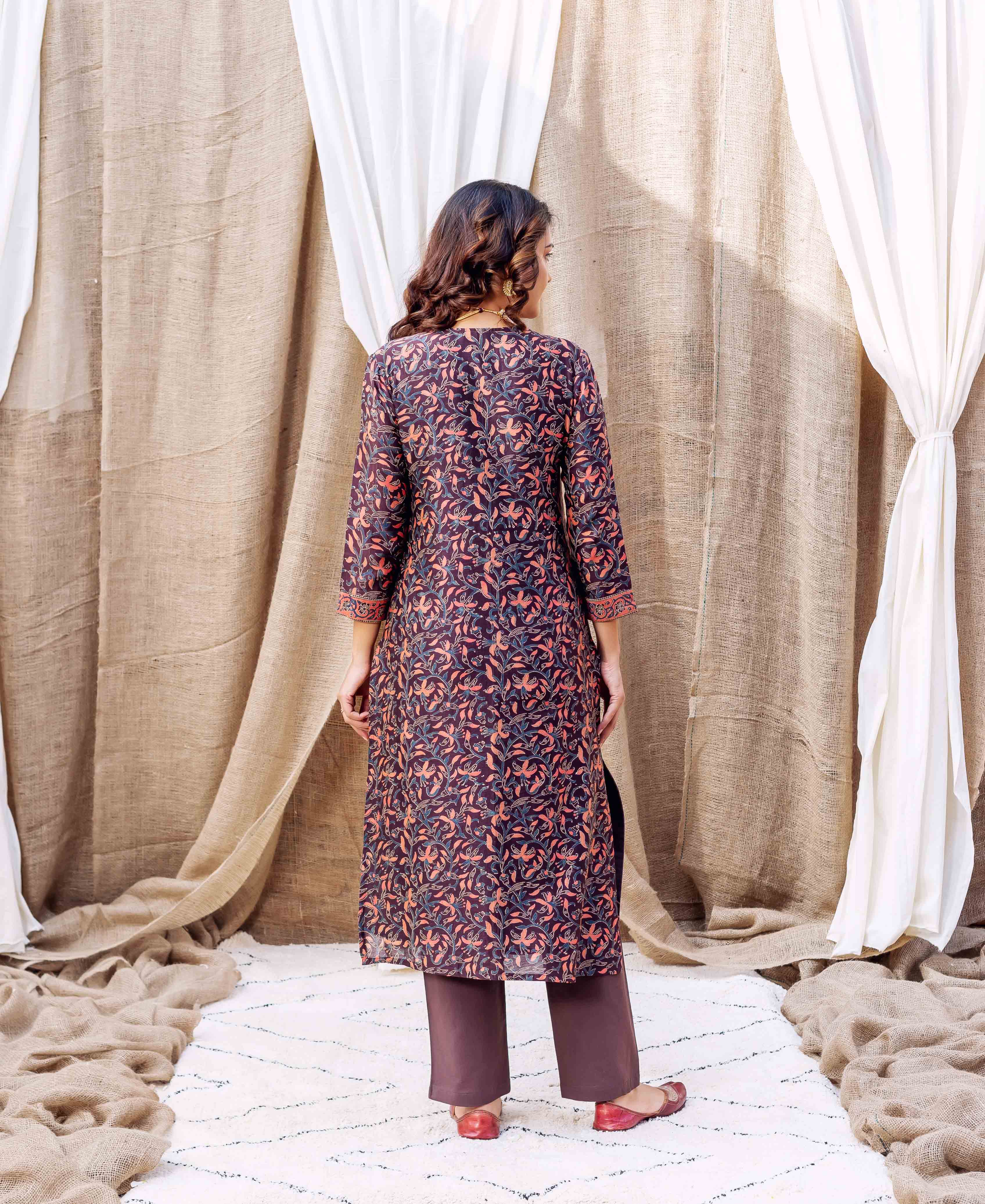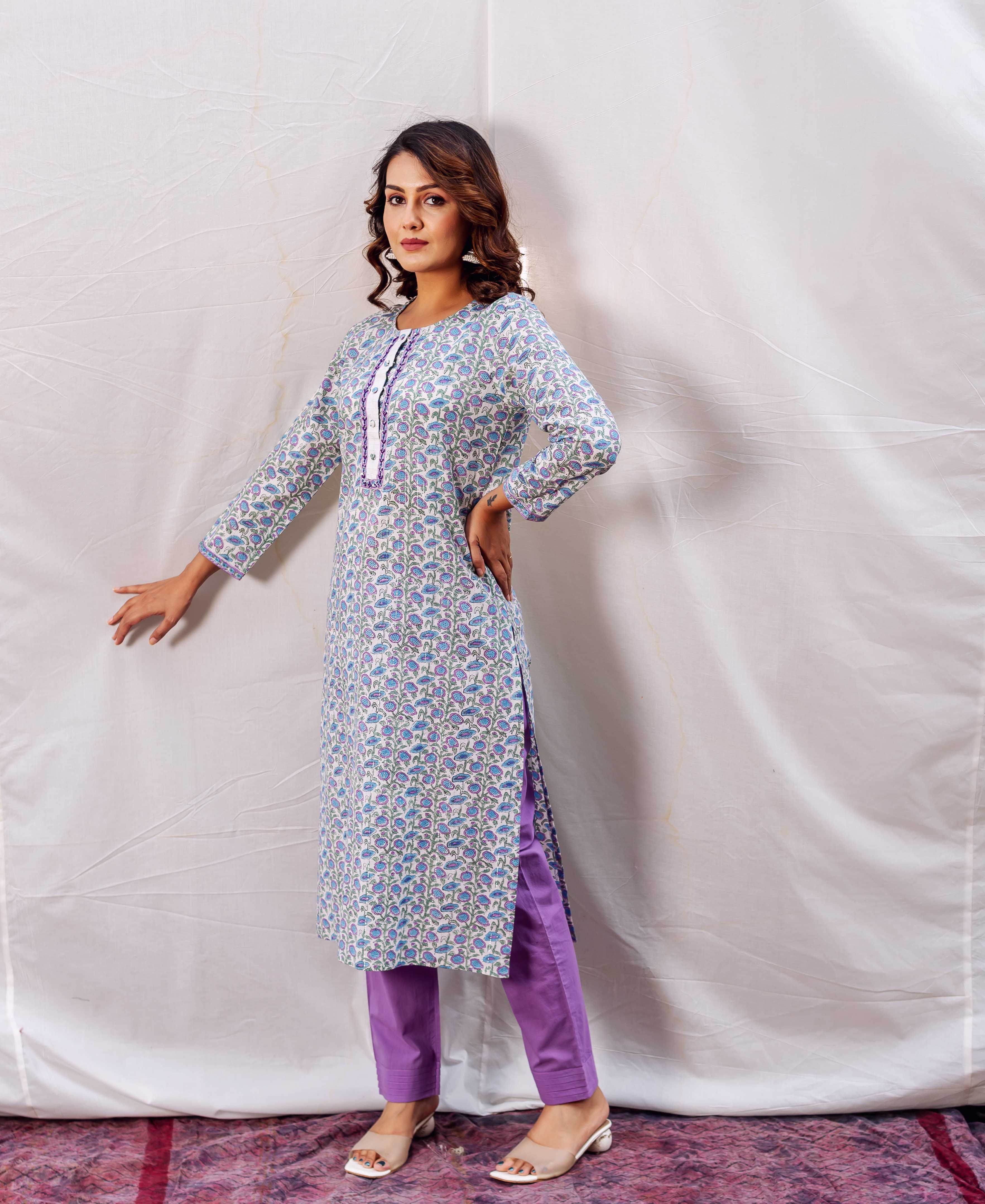 Indigo Hand Block Printed & Embroidered Straight Kurta