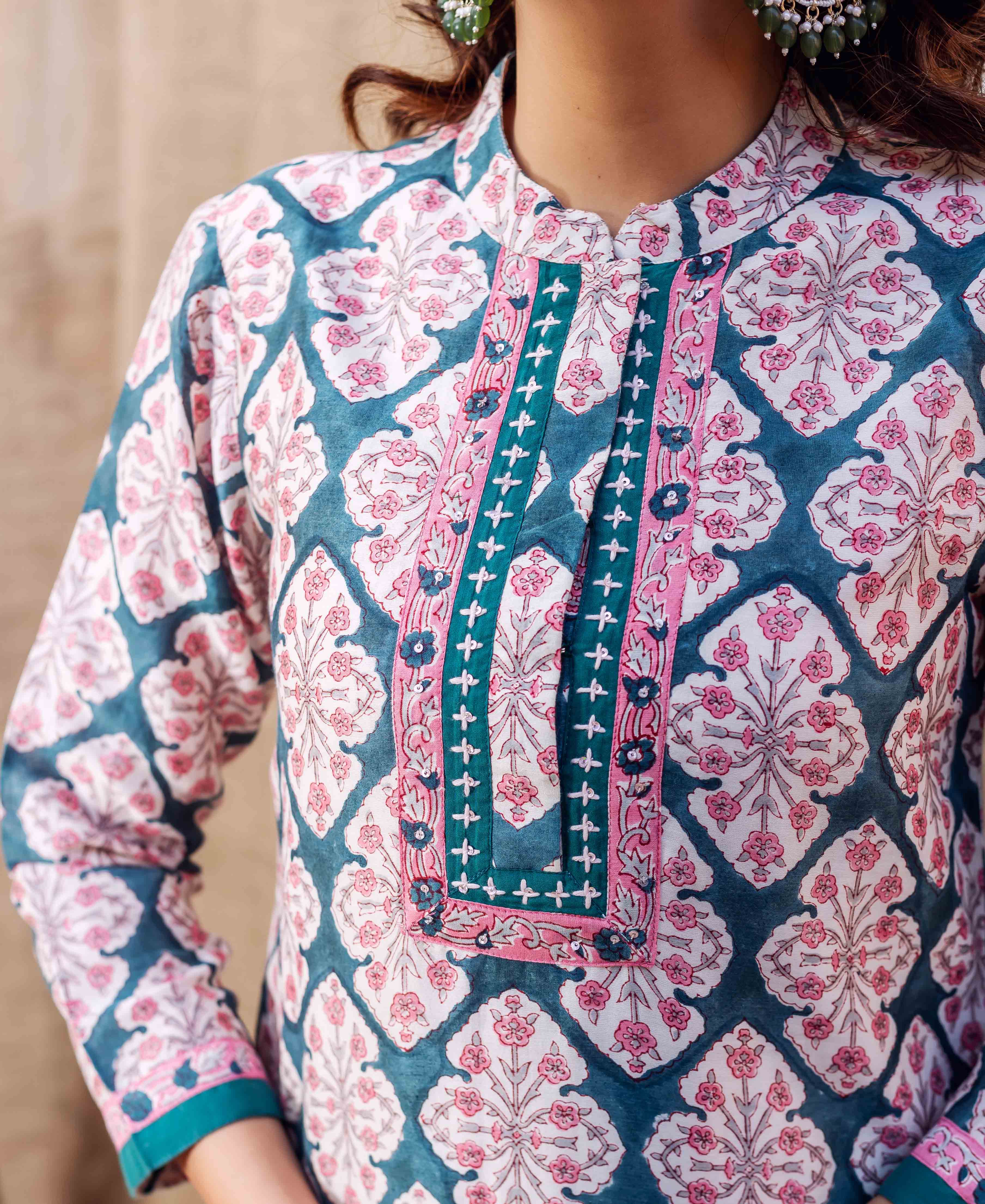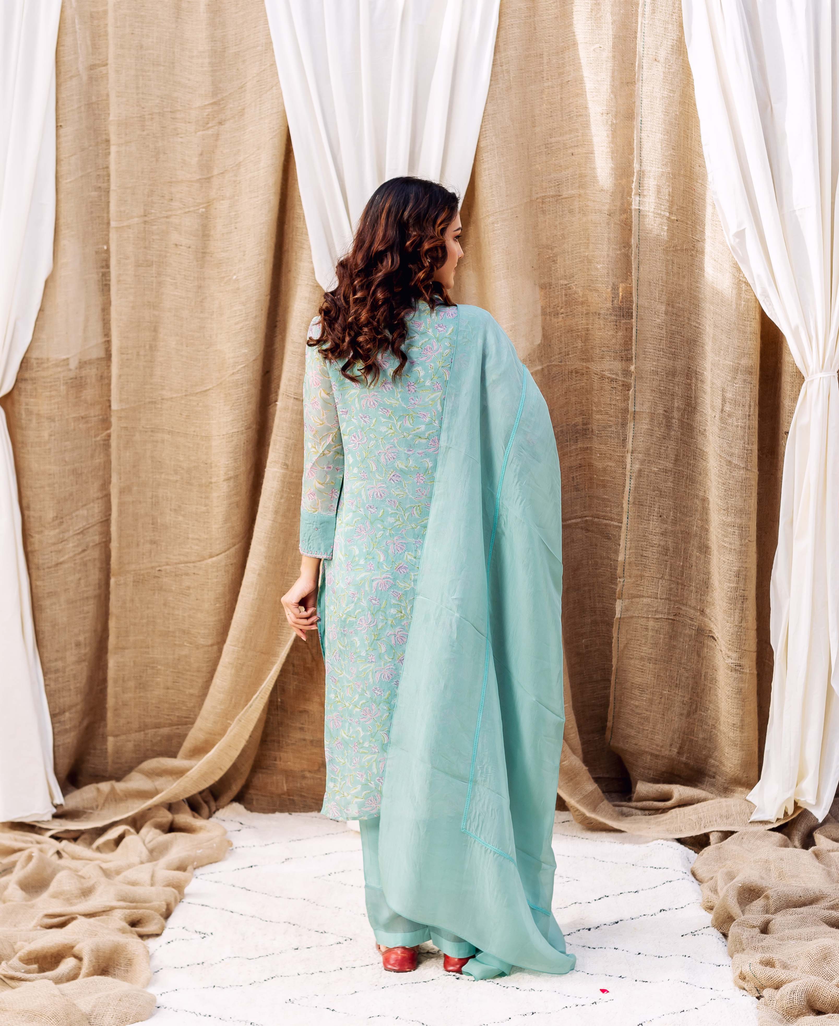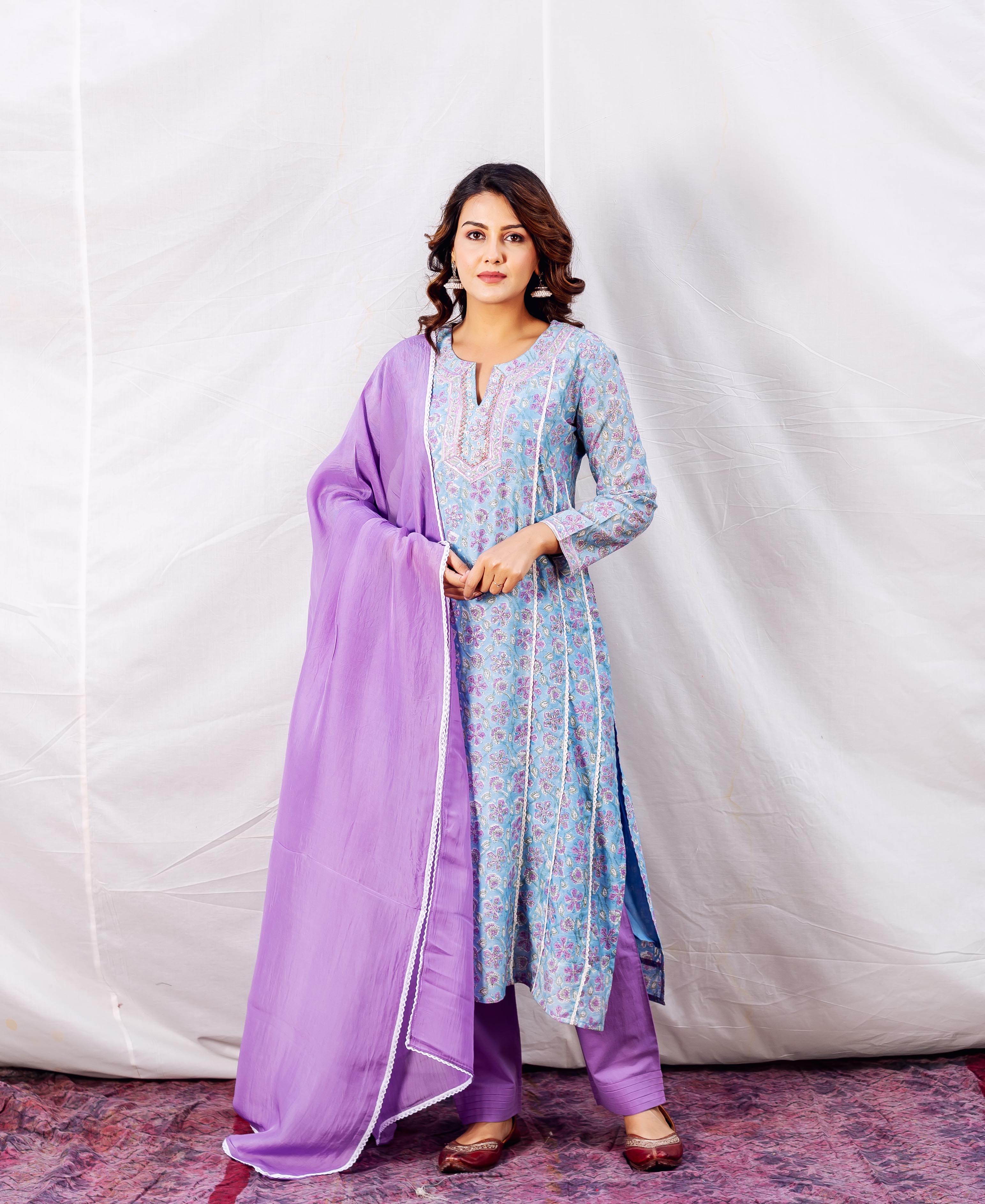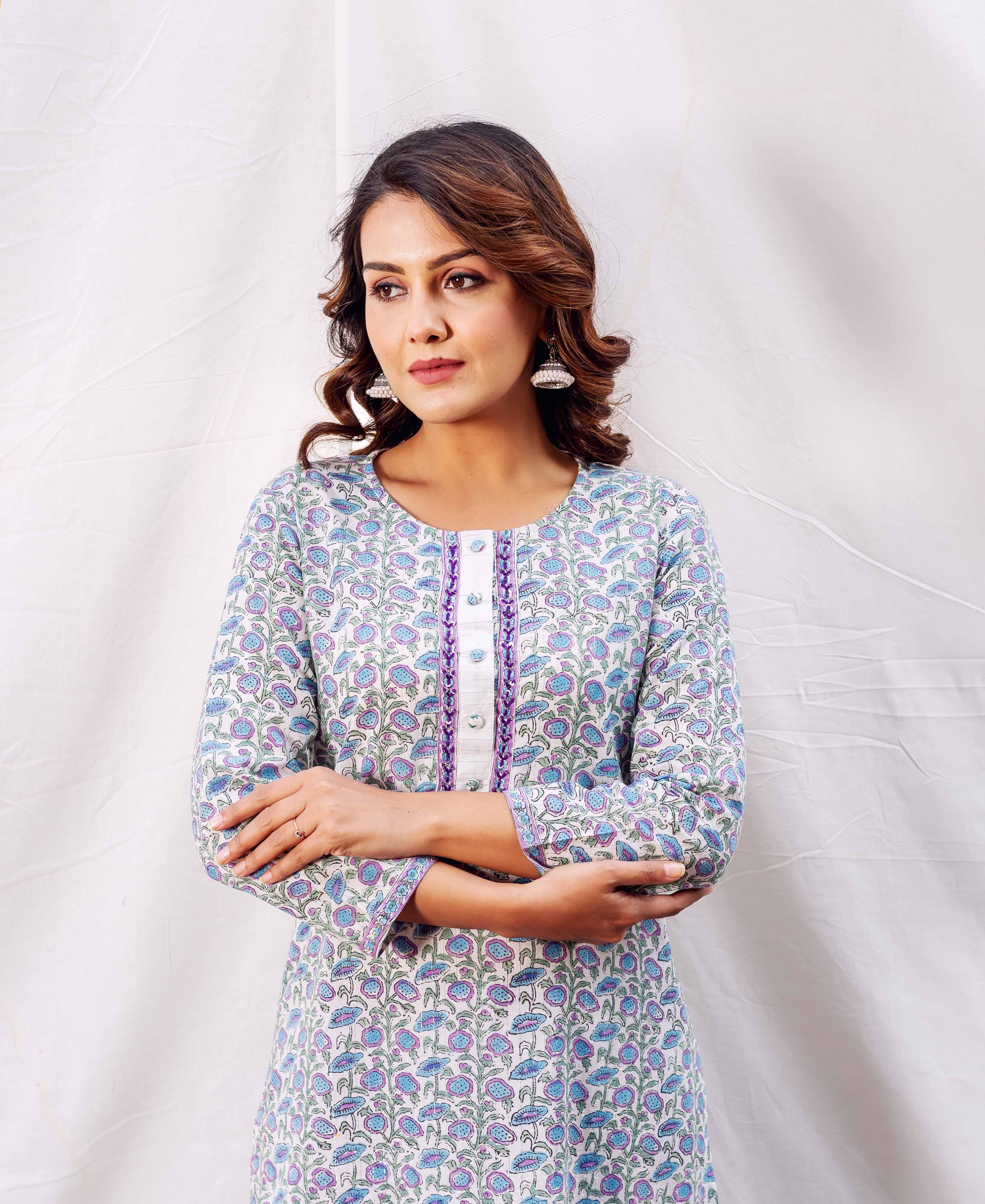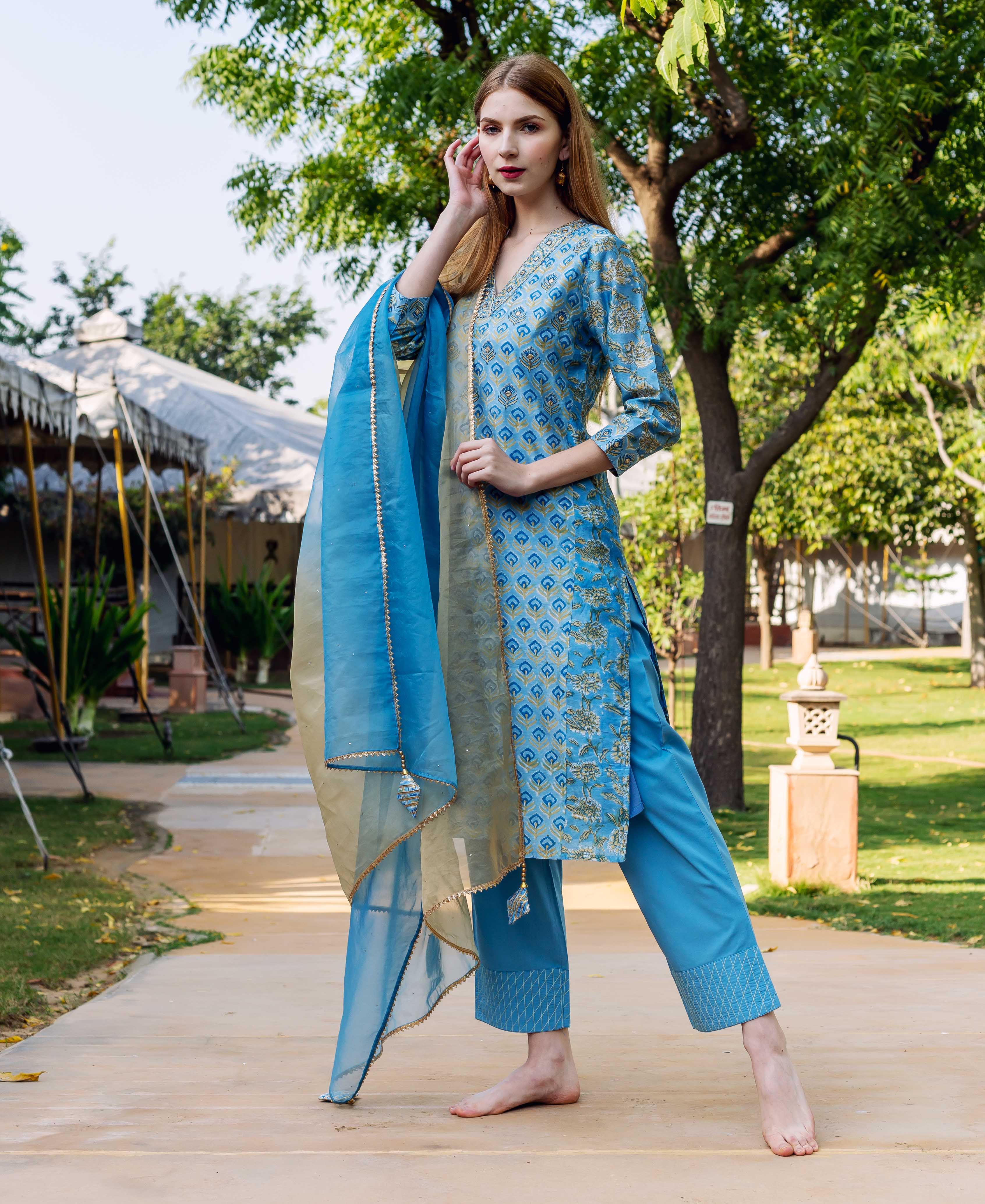 Indigo Hand Block Printed & Embroidered Straight Kurta