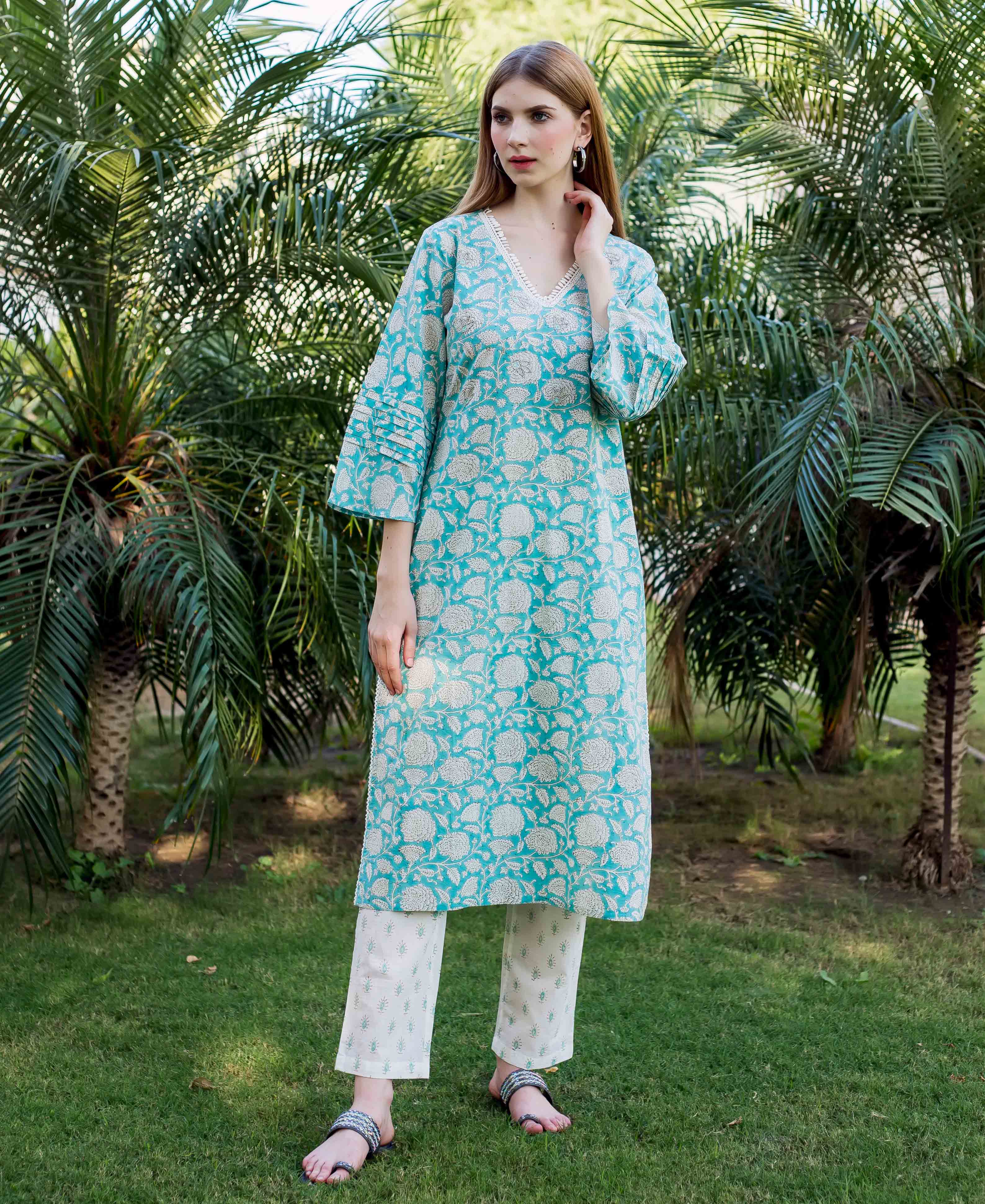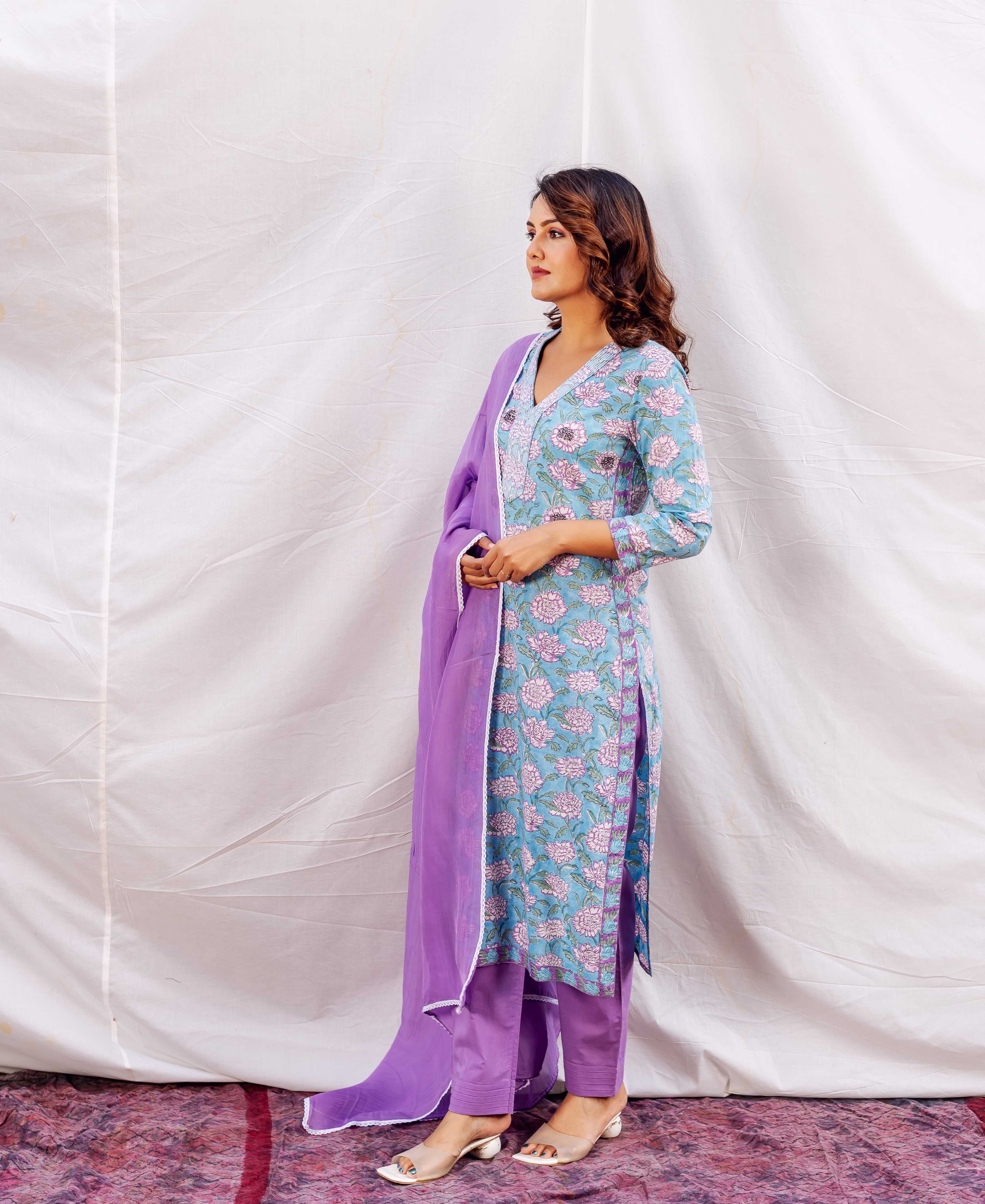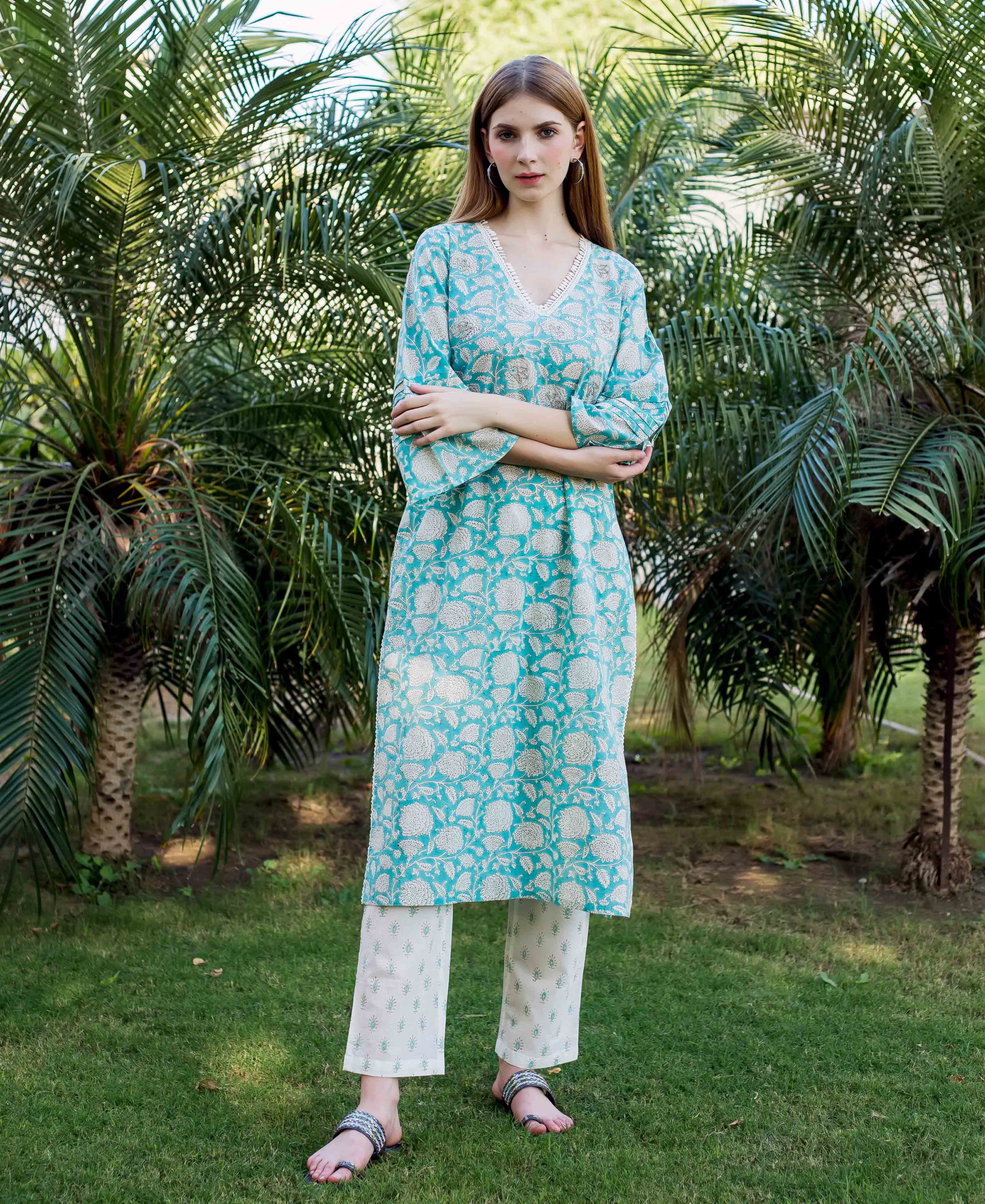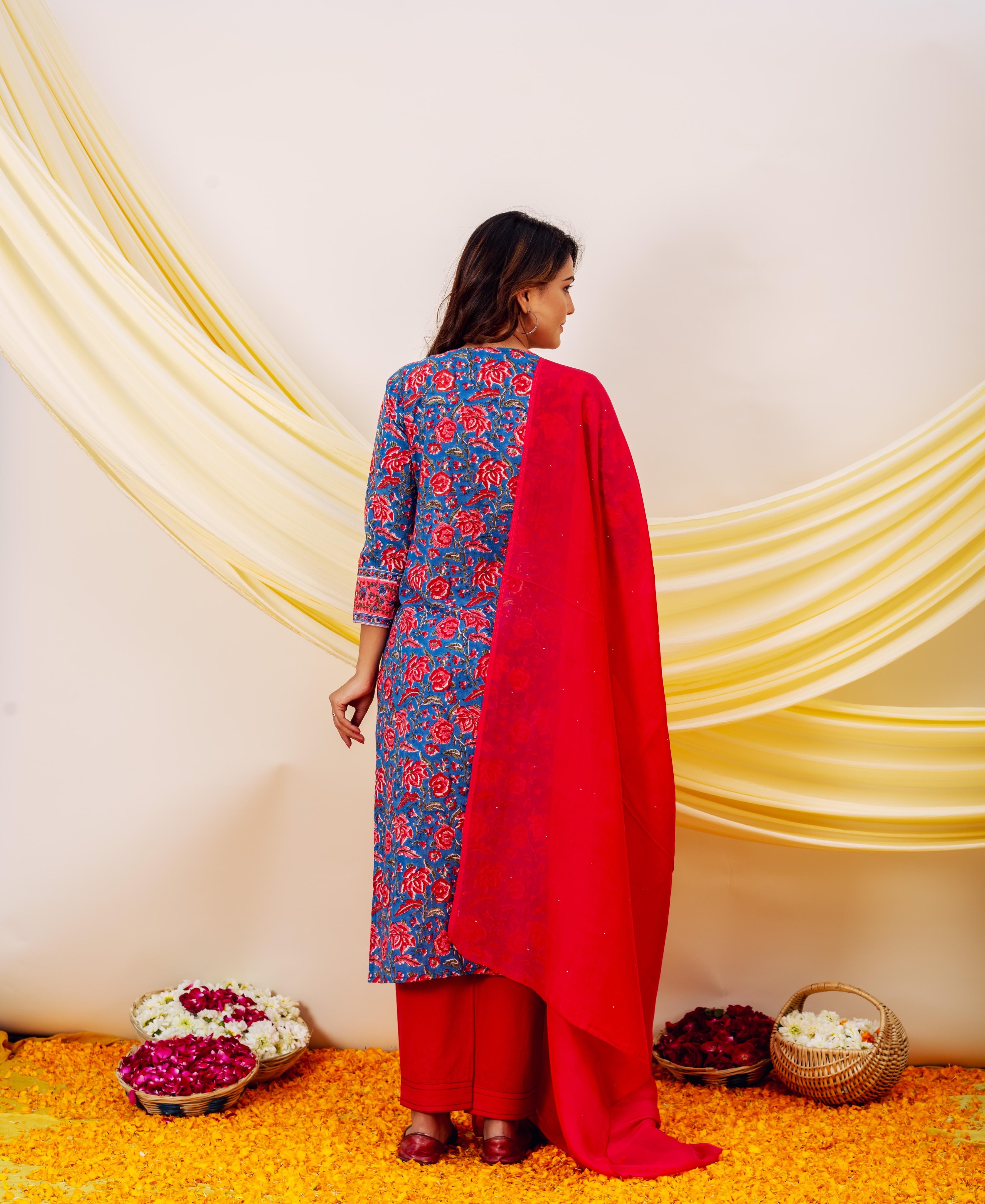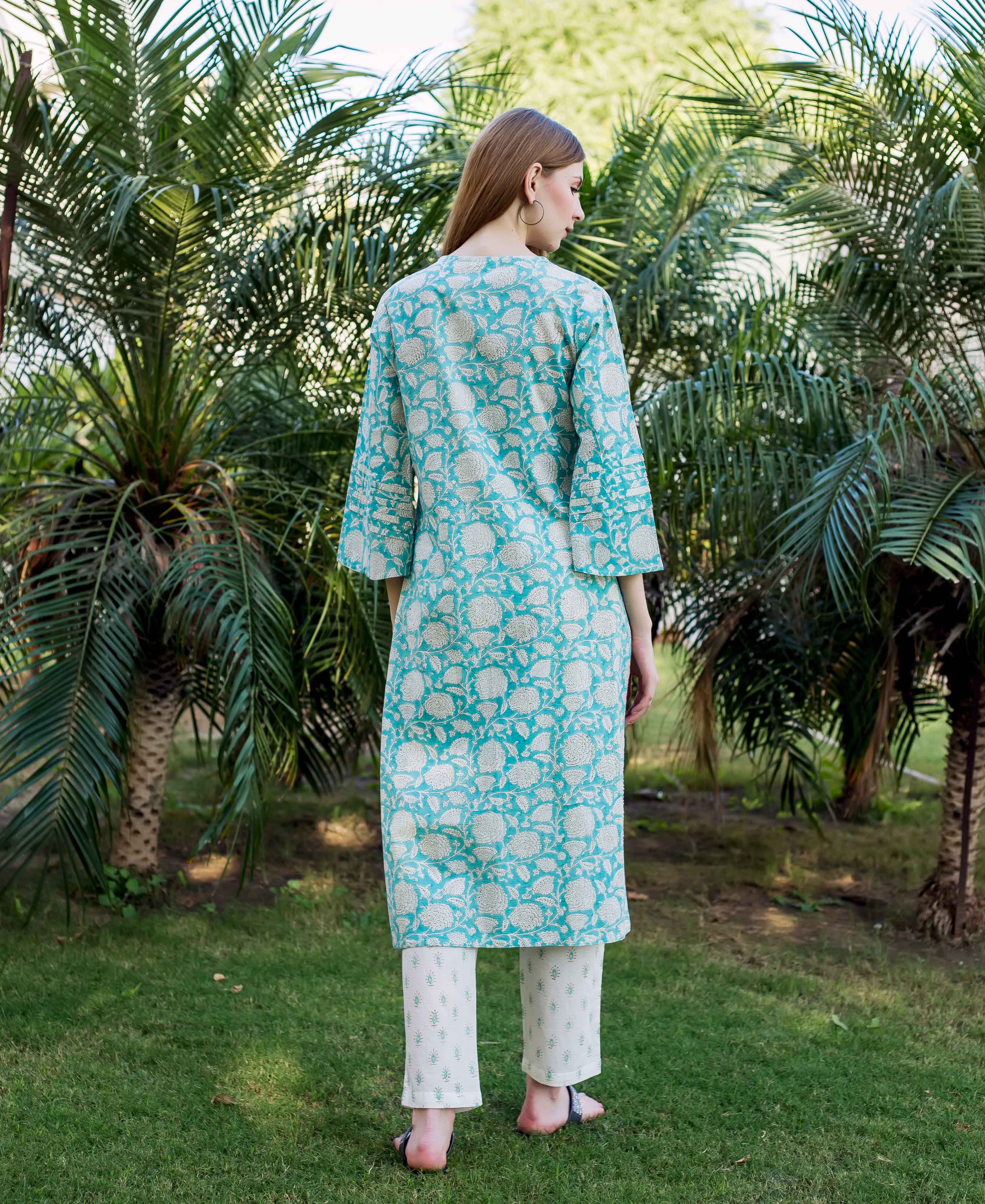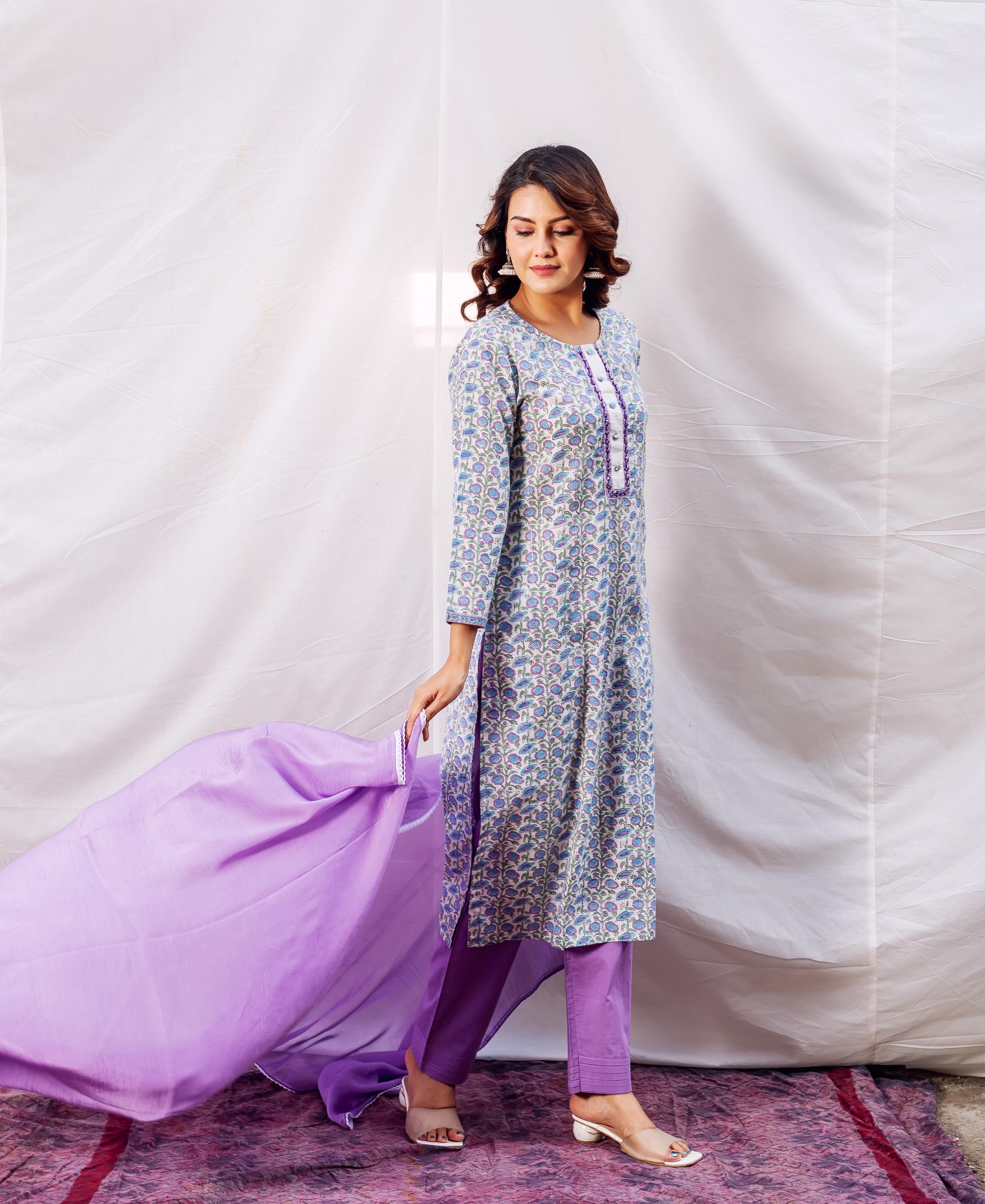 Indigo Hand Block Printed & Embroidered Straight Kurta