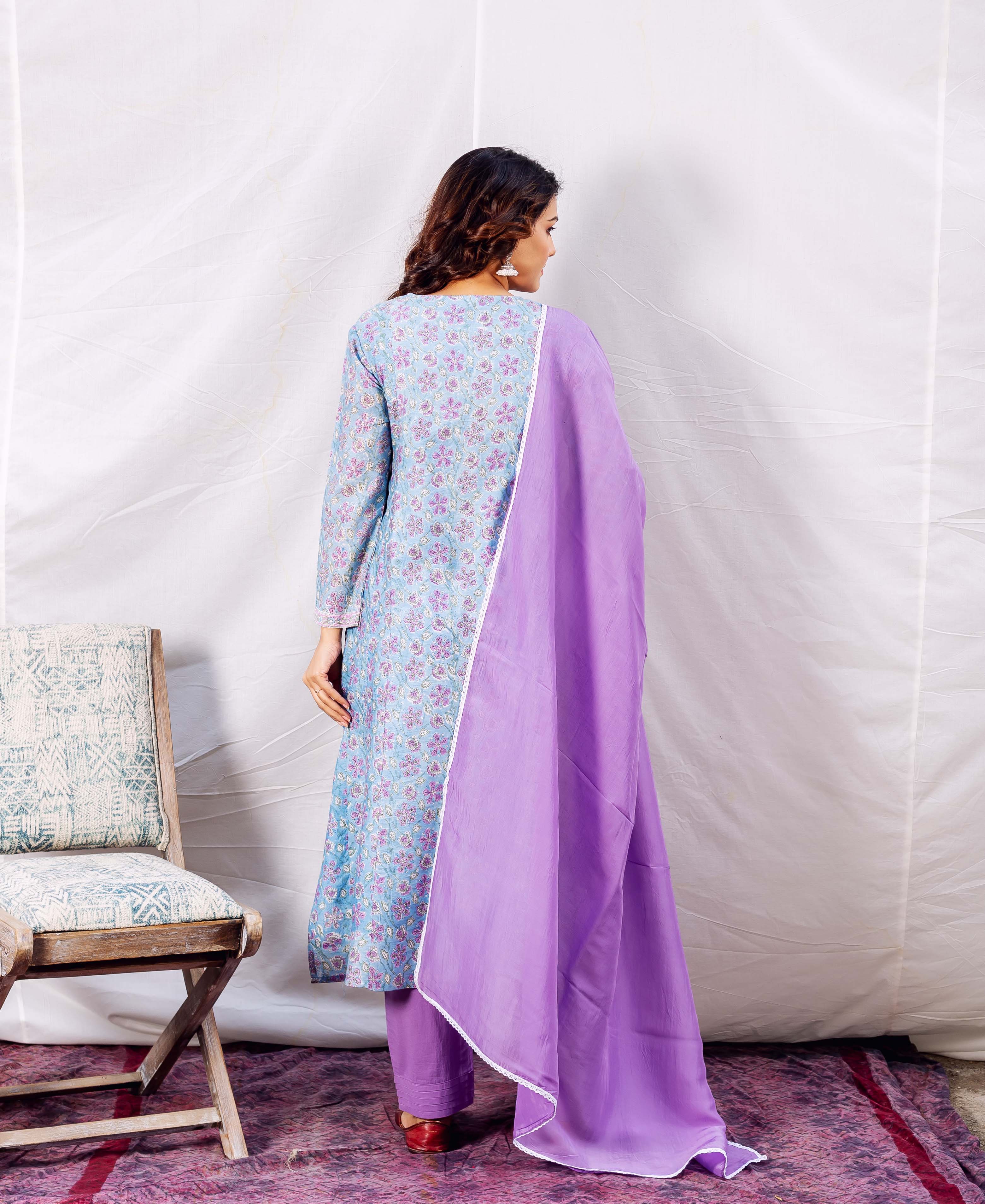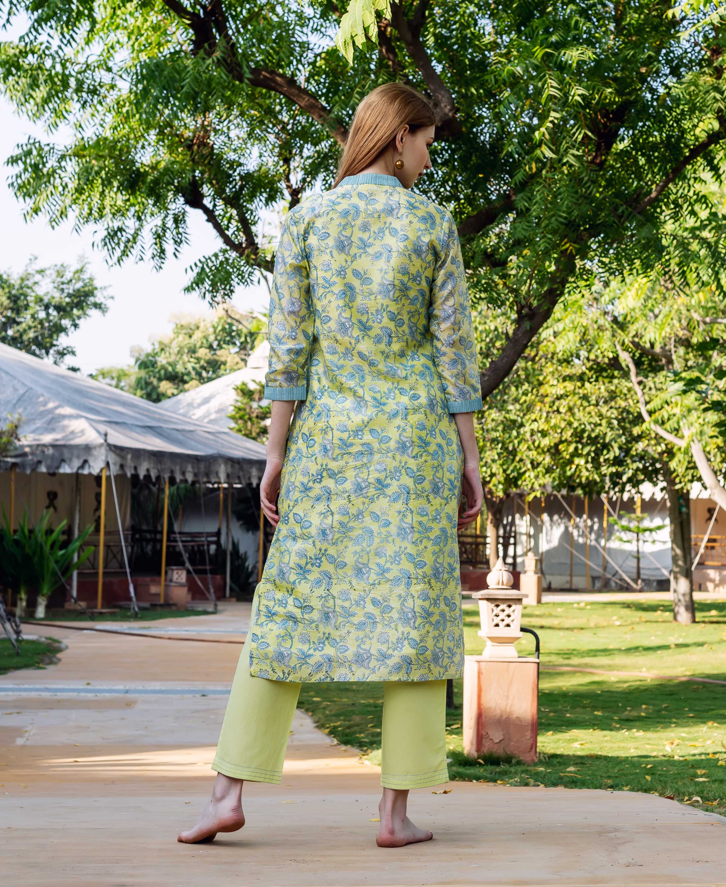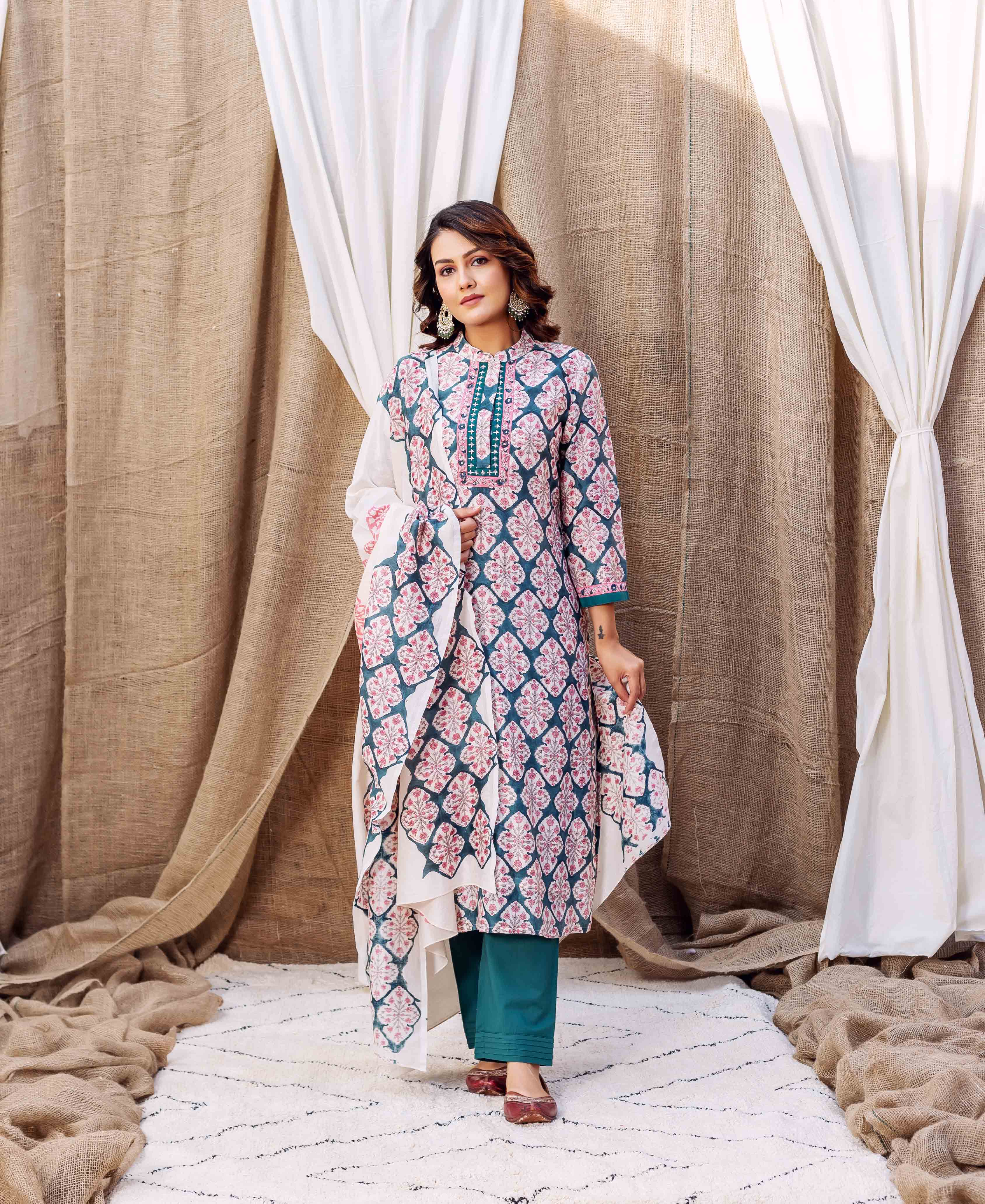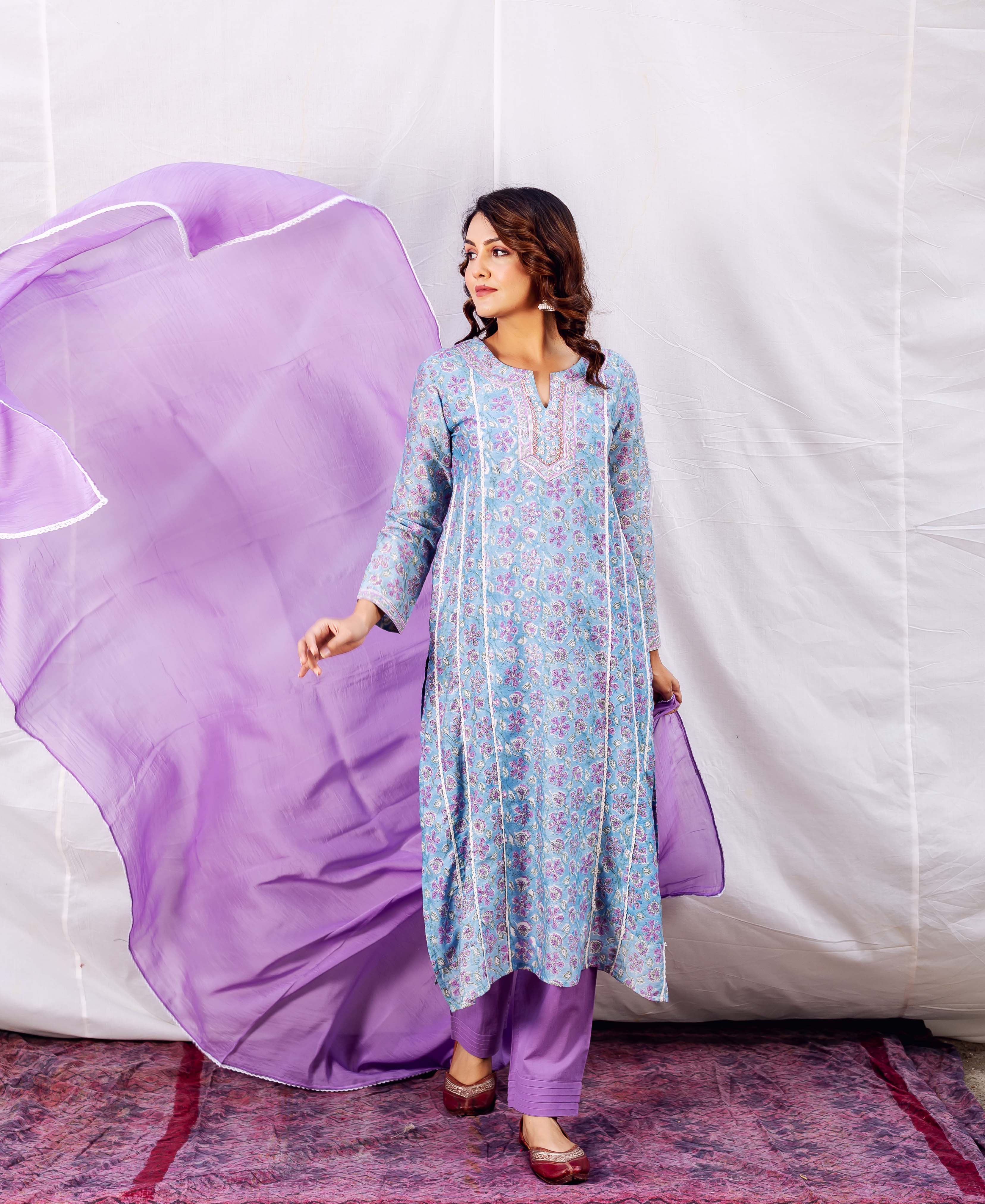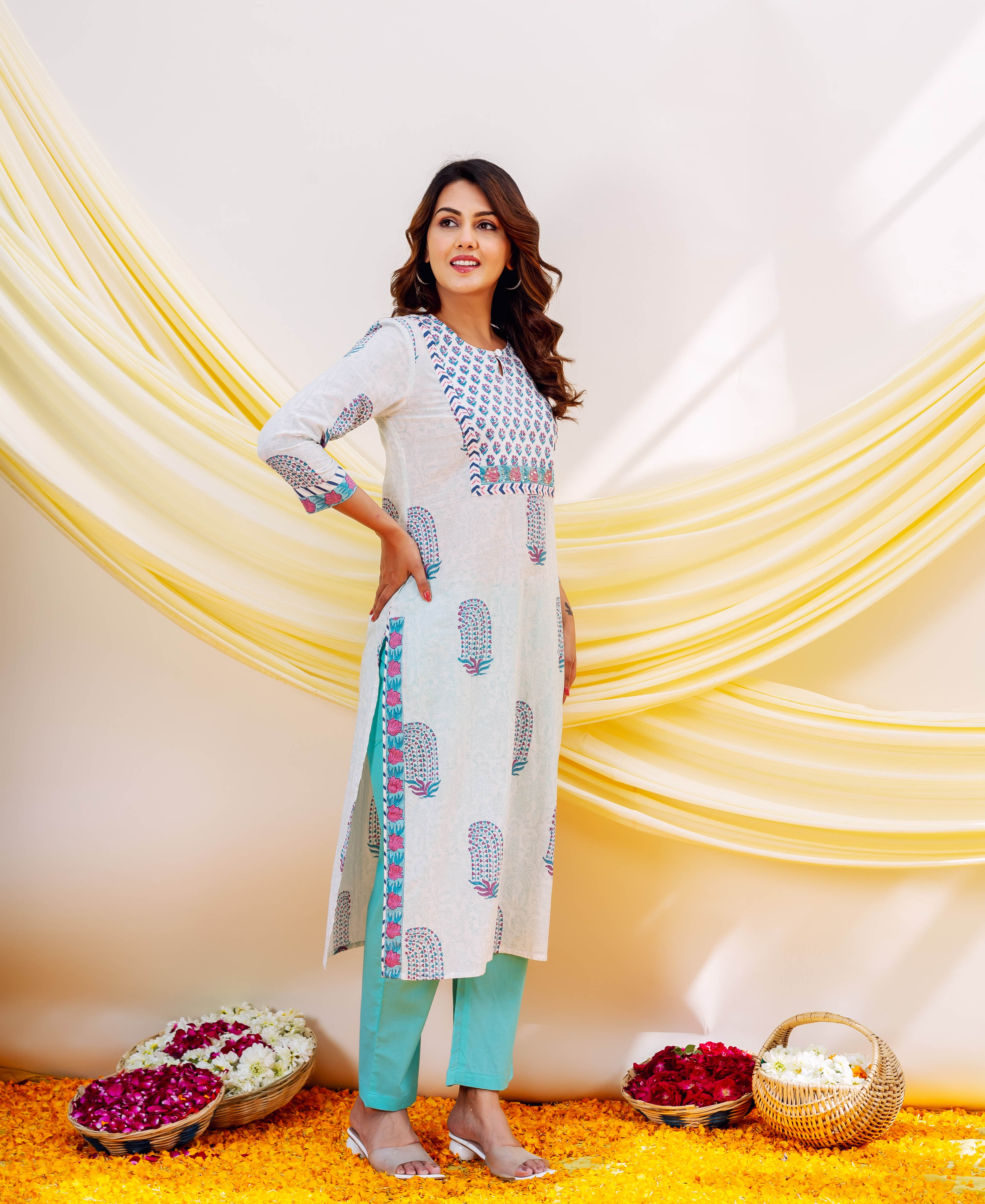 Indigo Hand Block Printed & Embroidered Straight Kurta