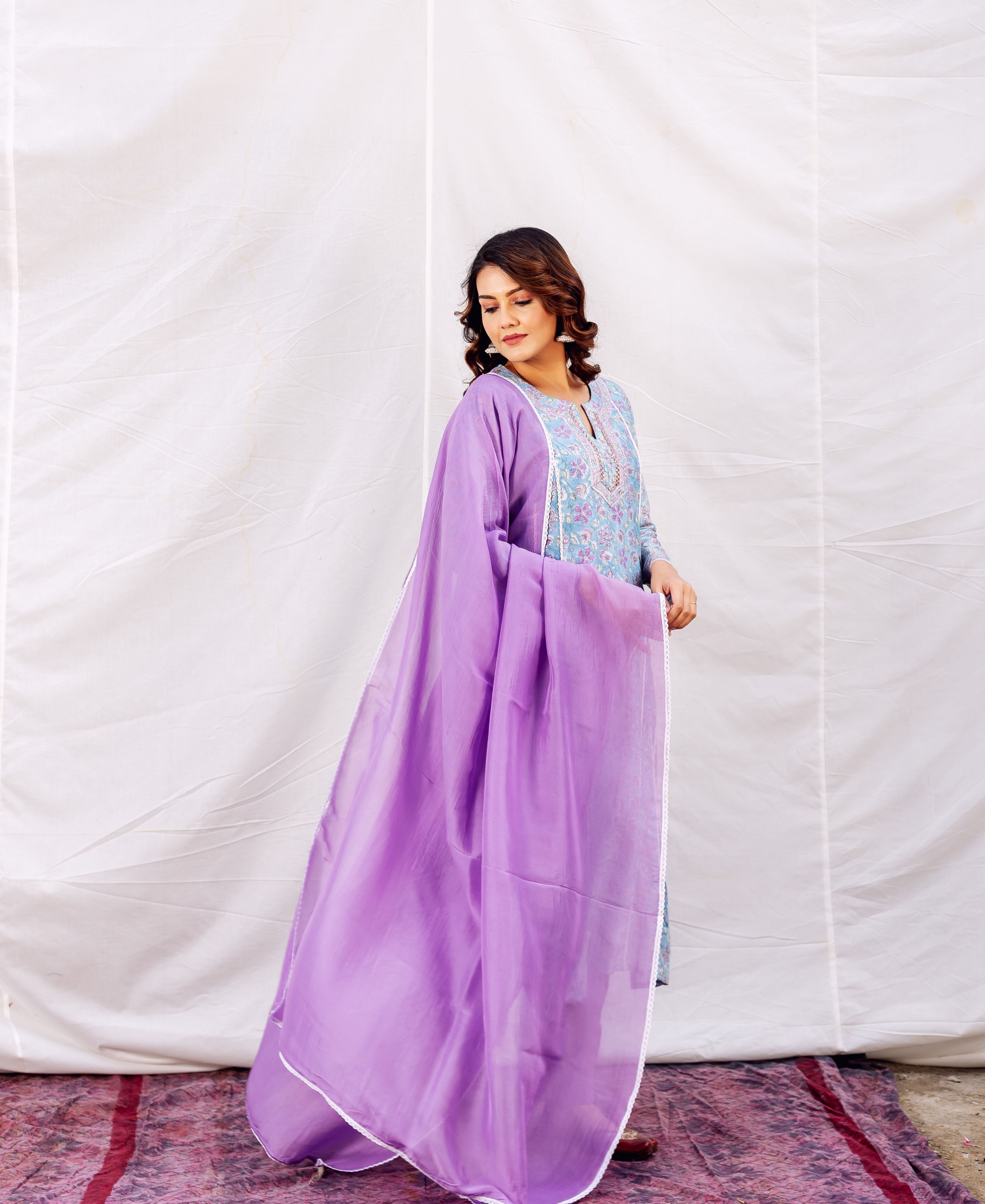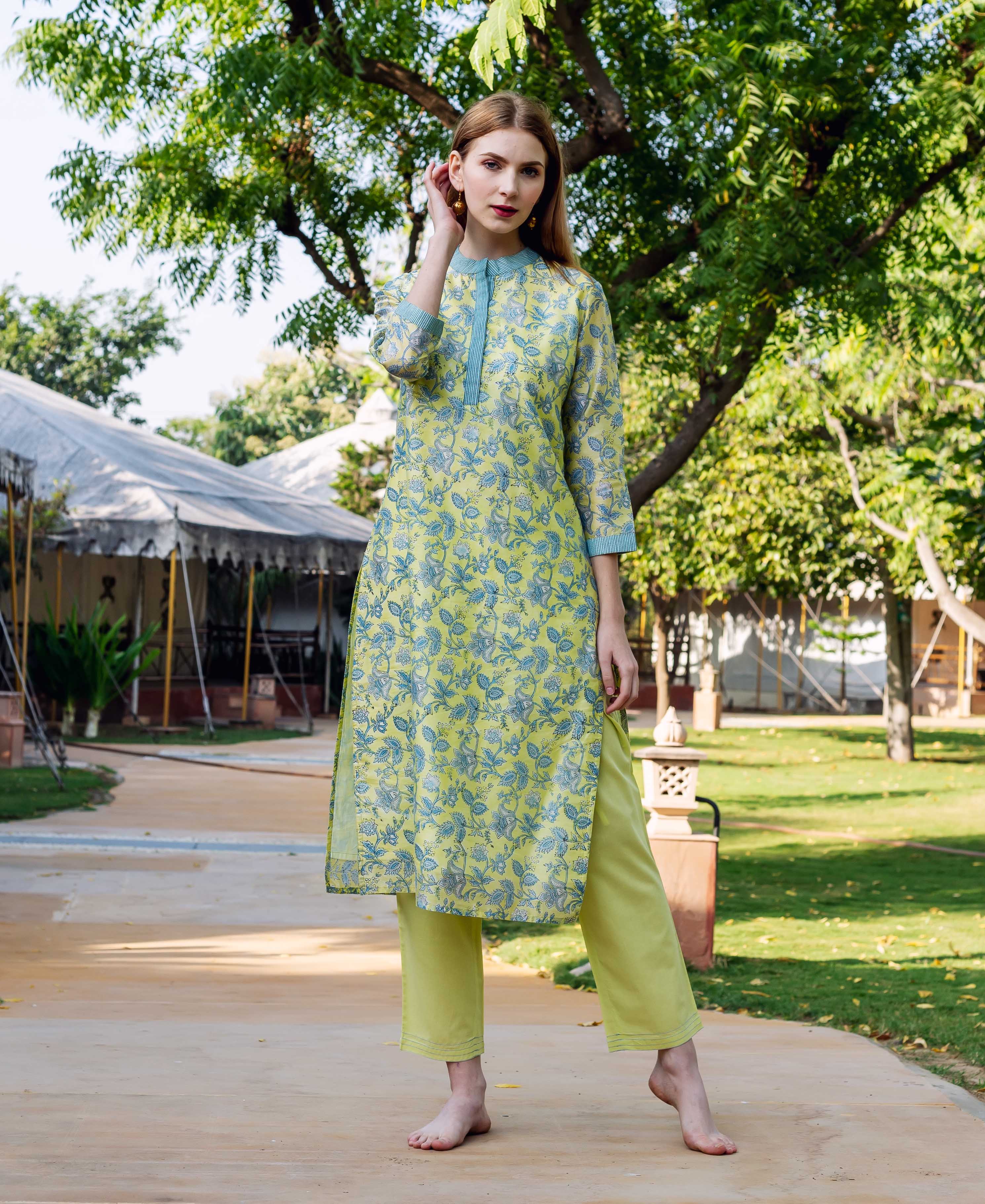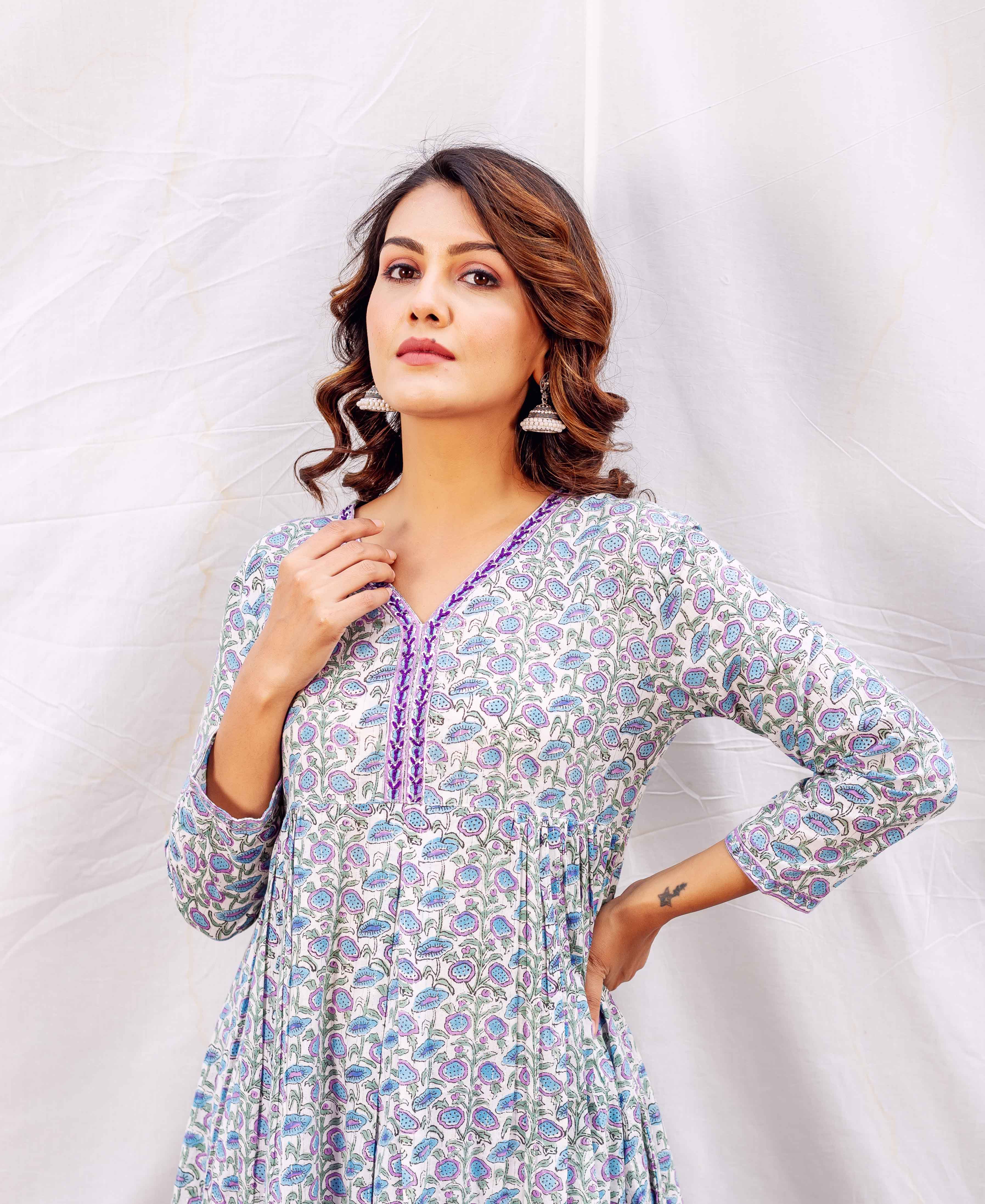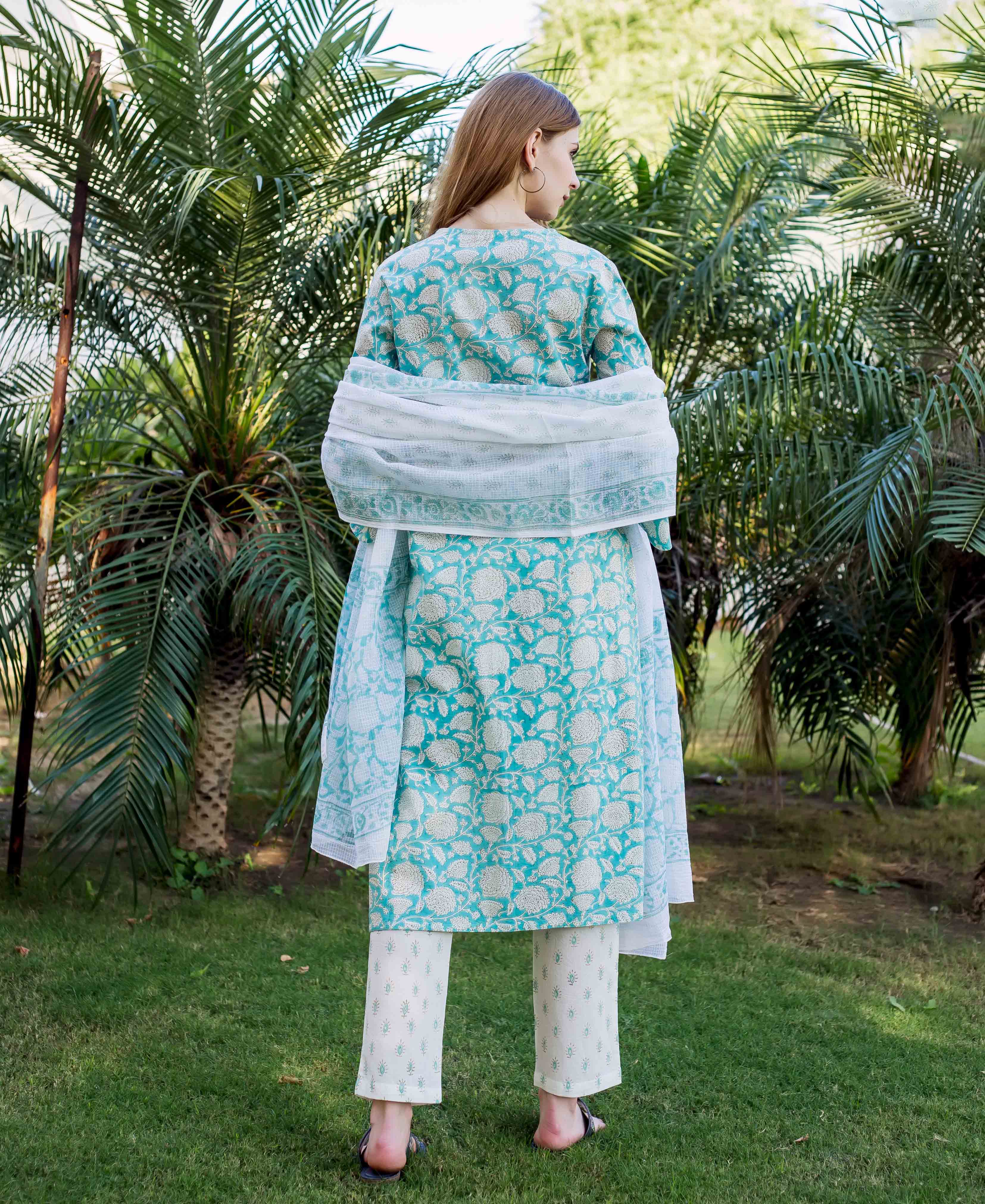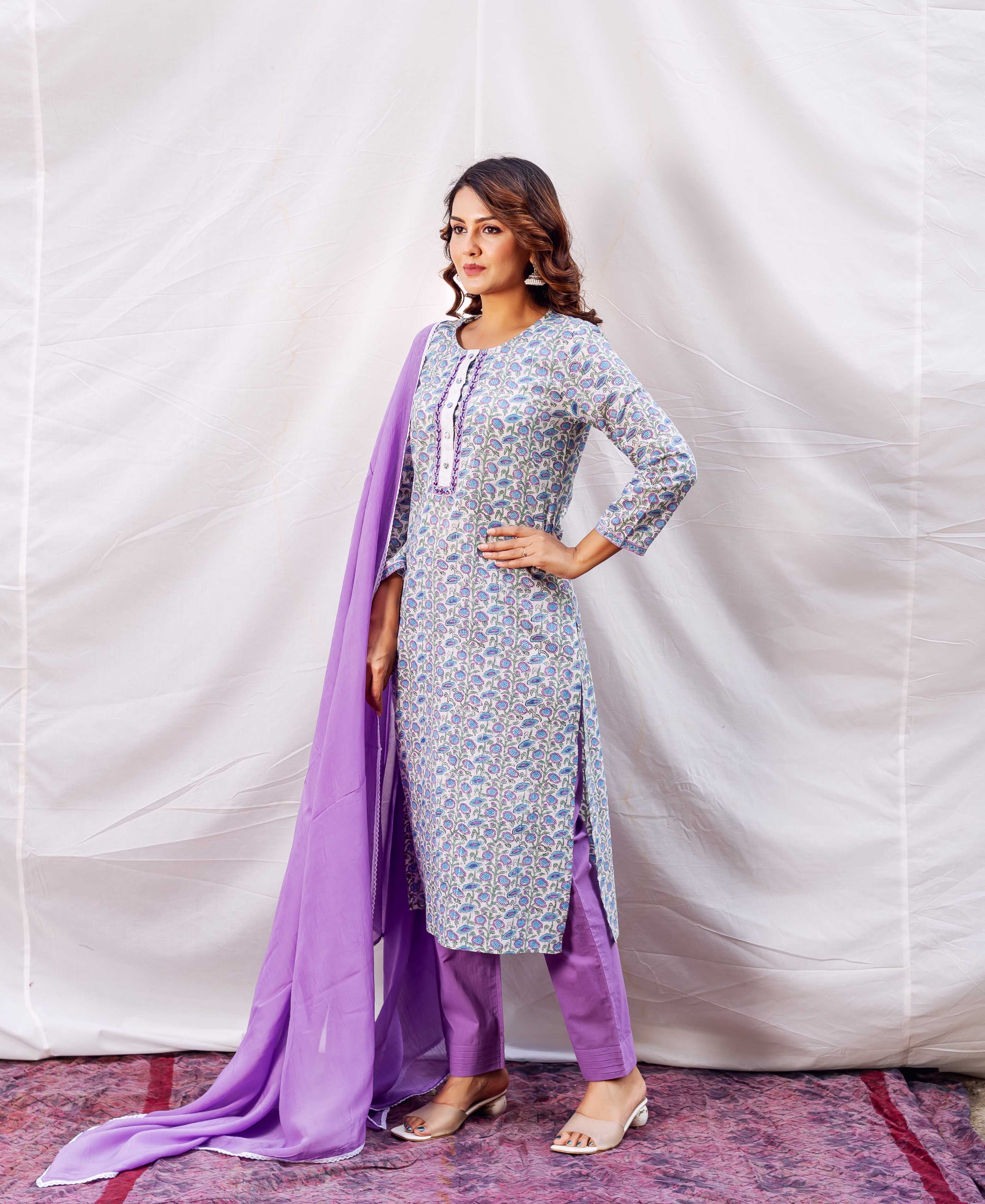 Indigo Hand Block Printed & Embroidered Straight Kurta