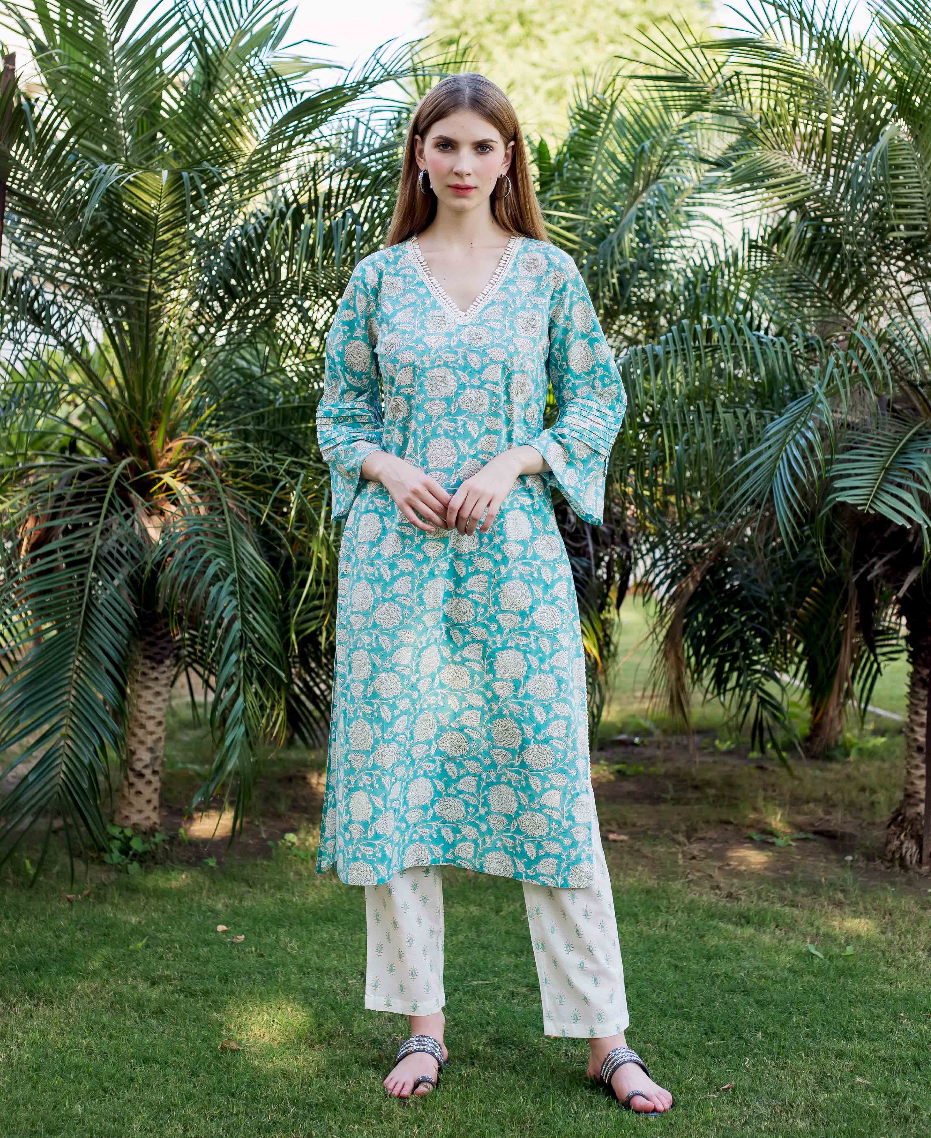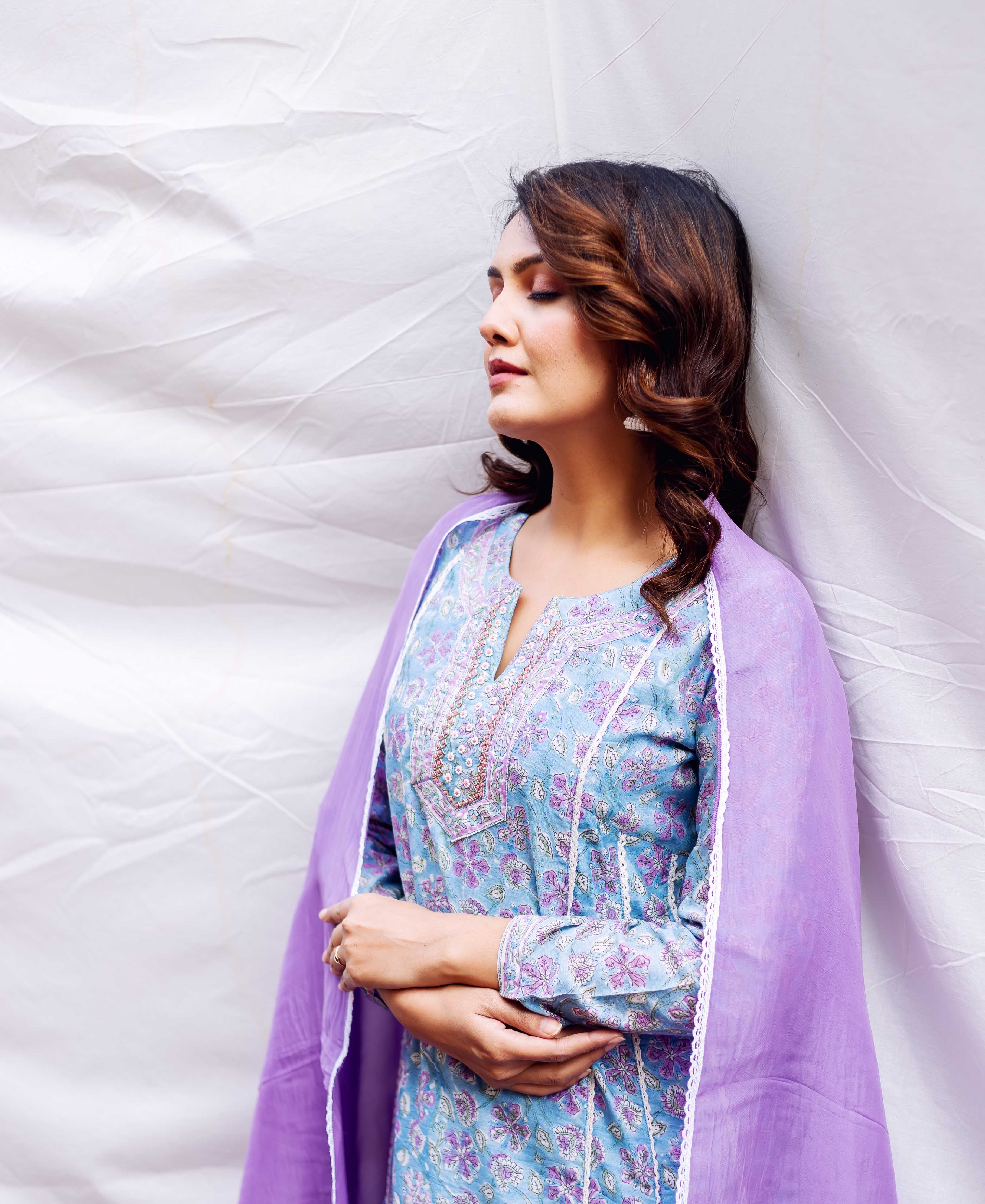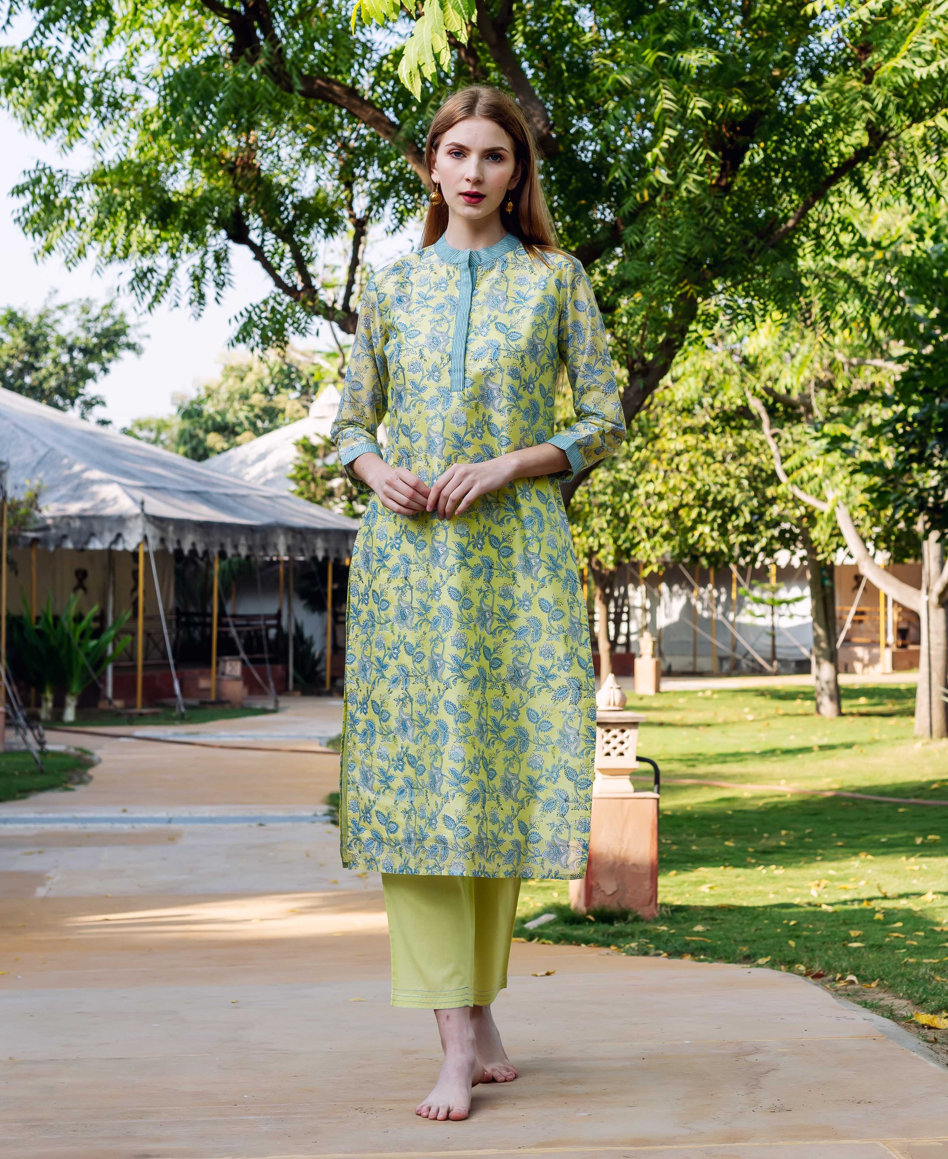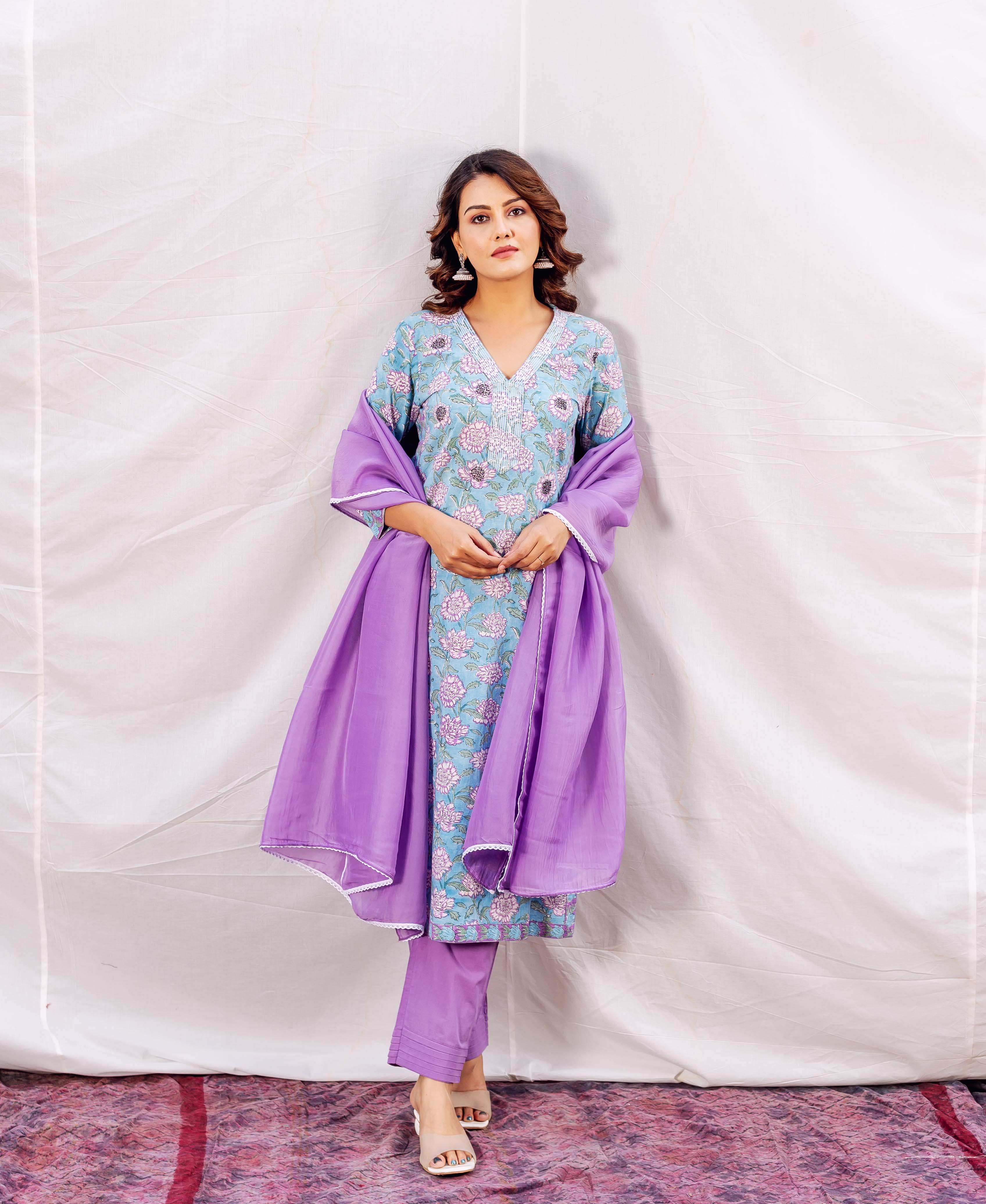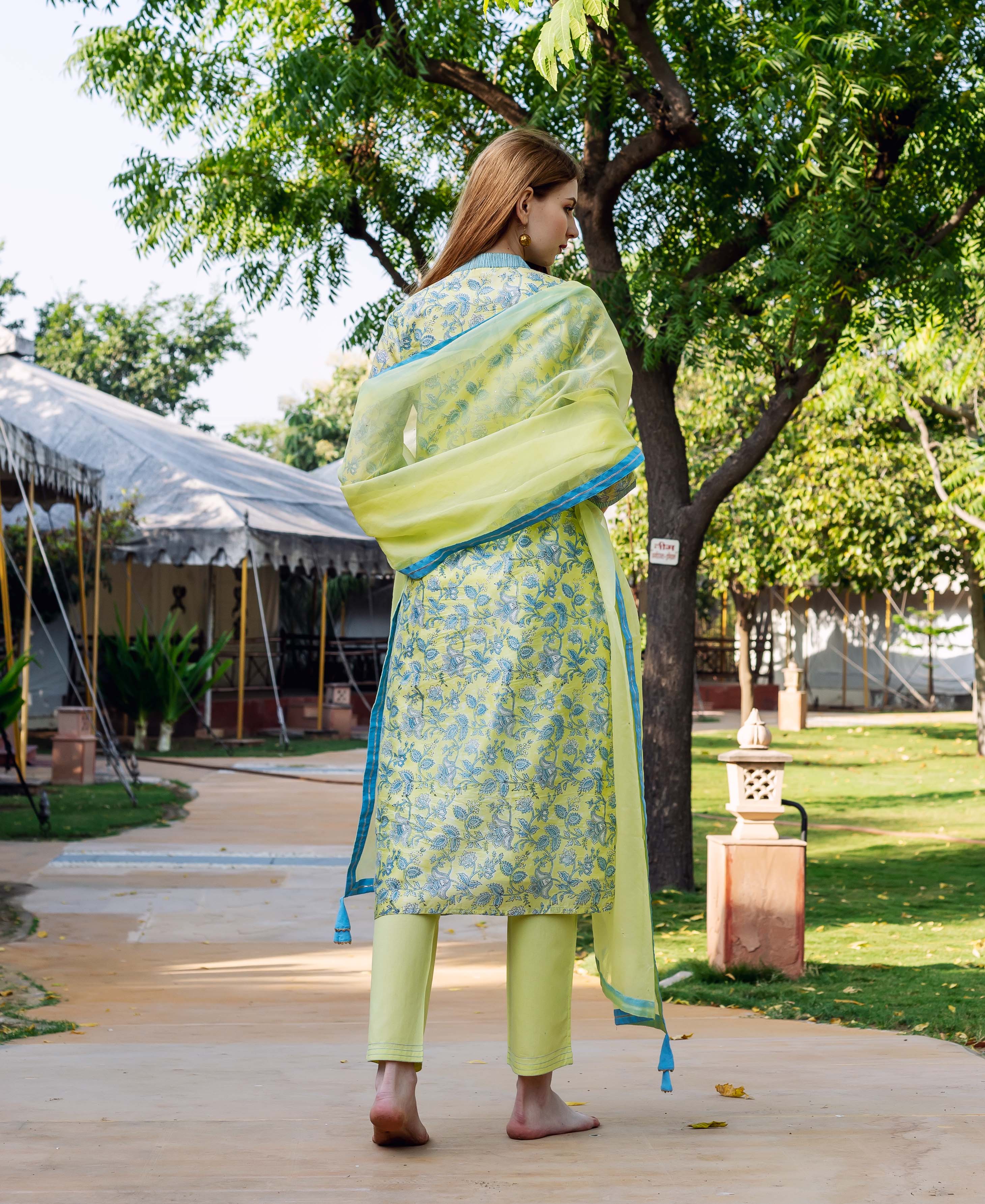 Indigo Hand Block Printed & Embroidered Straight Kurta