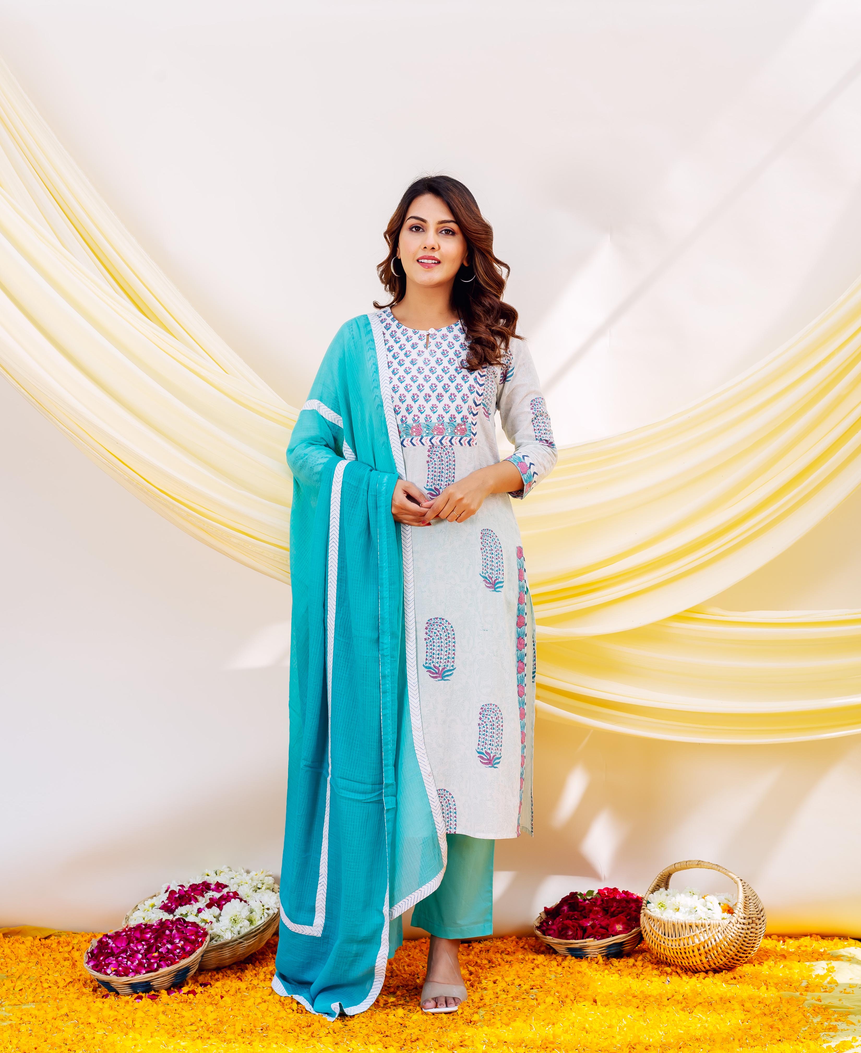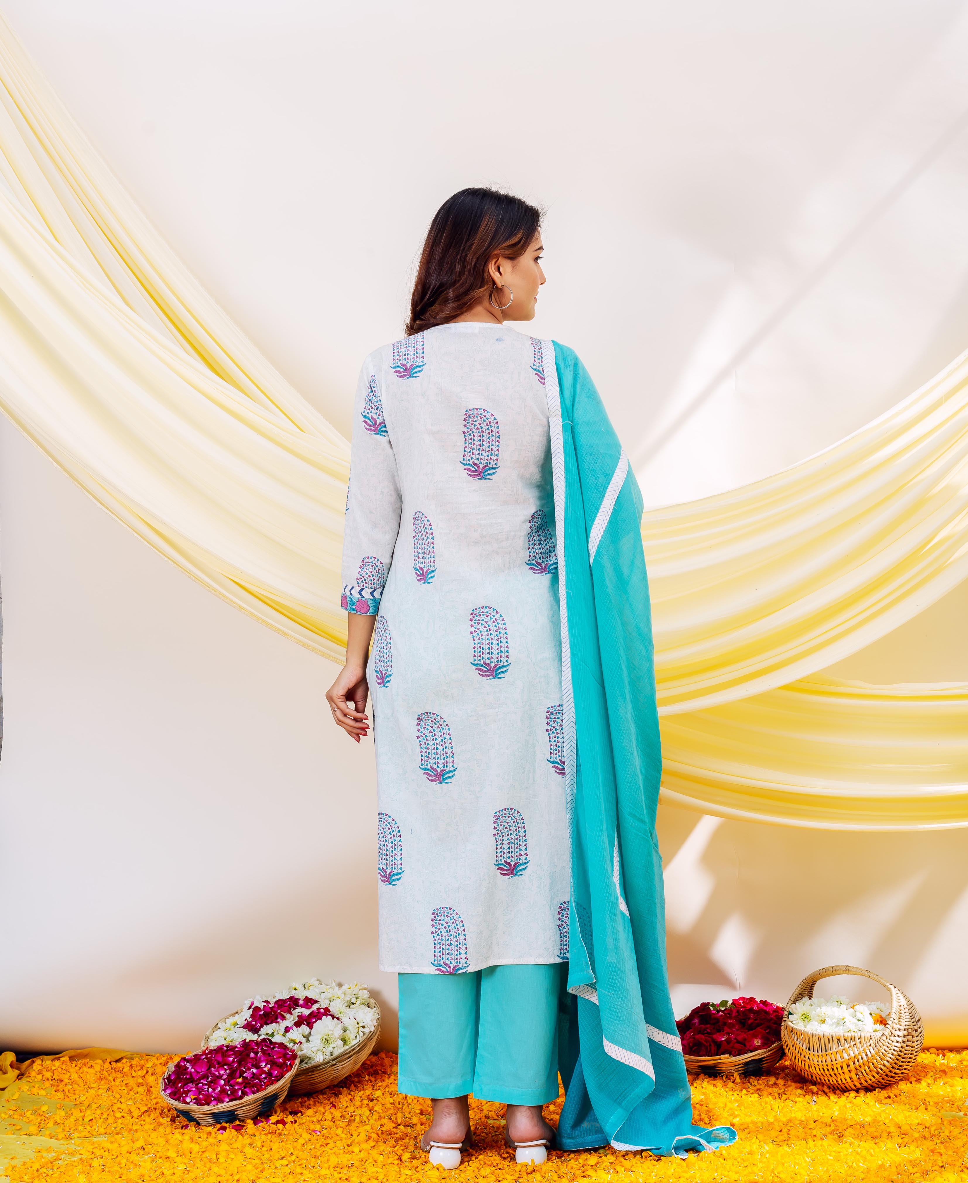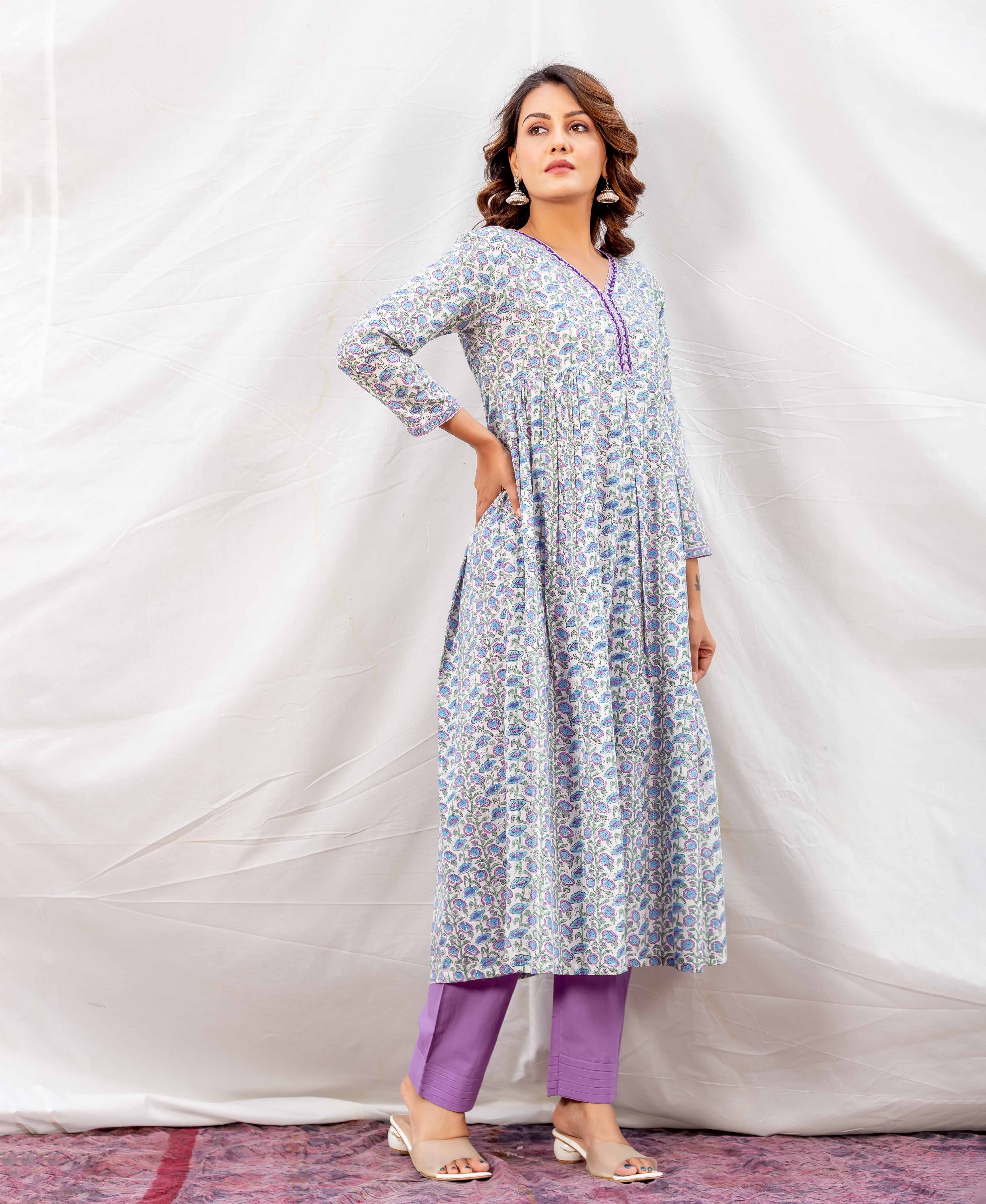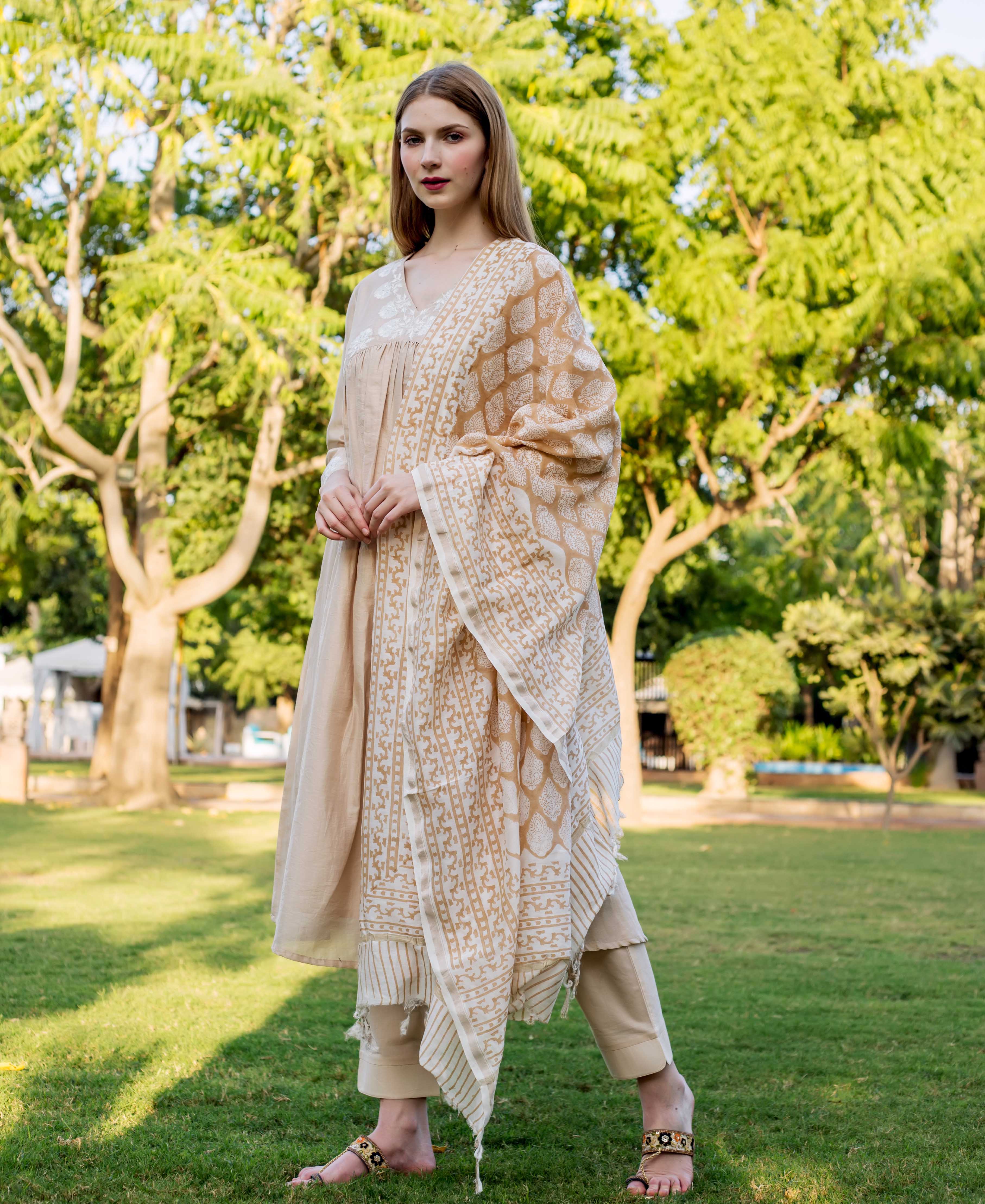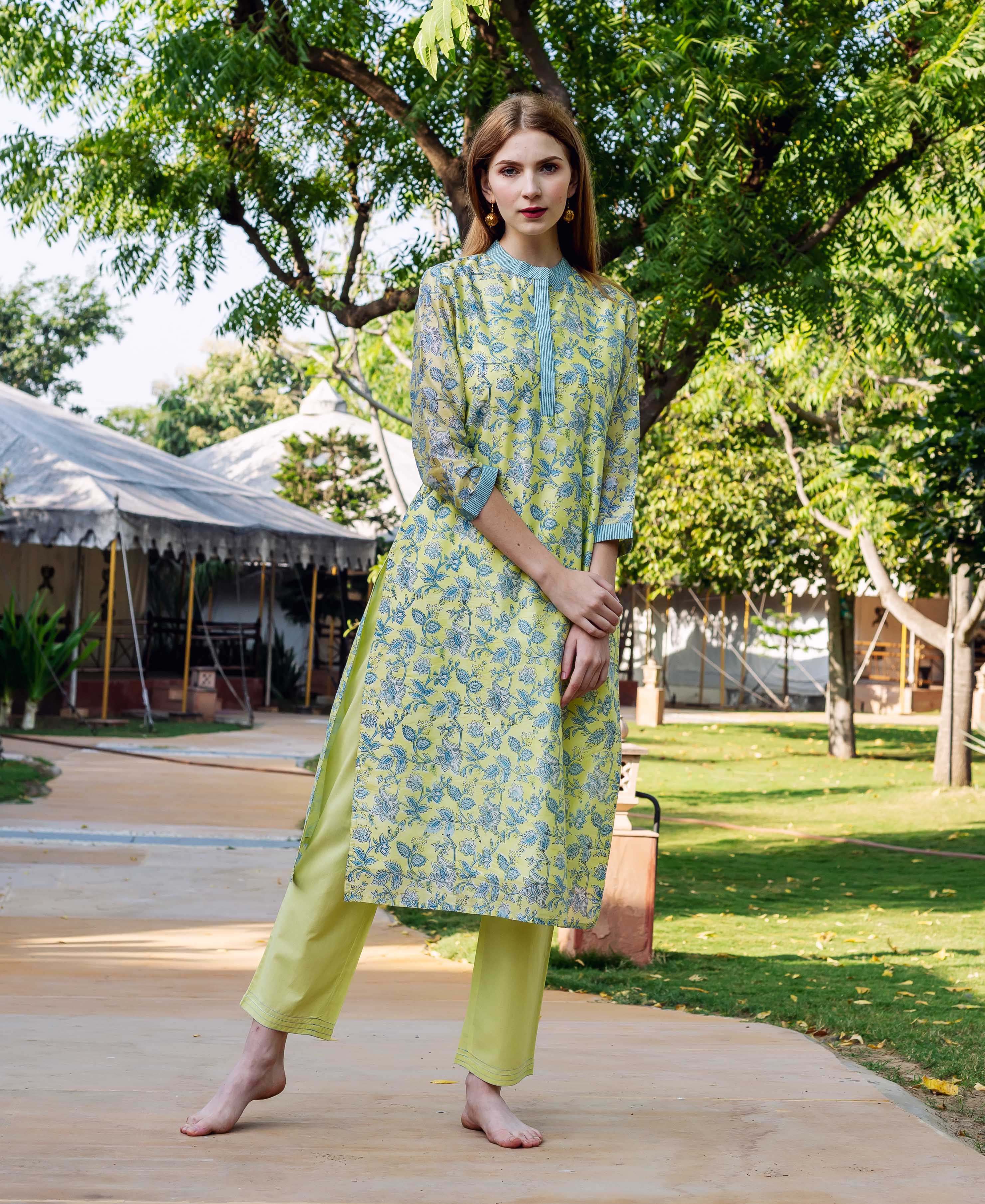 Indigo Hand Block Printed & Embroidered Straight Kurta