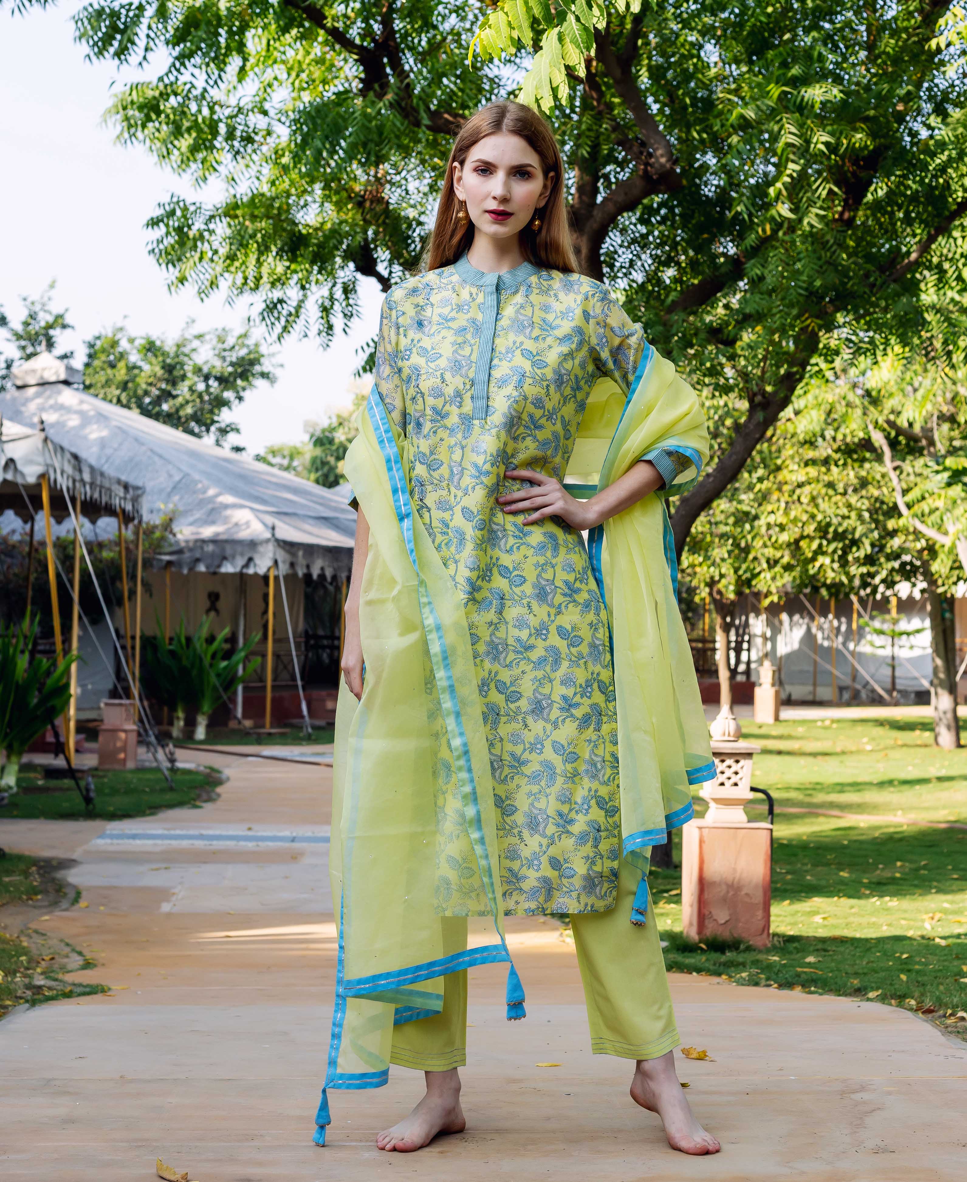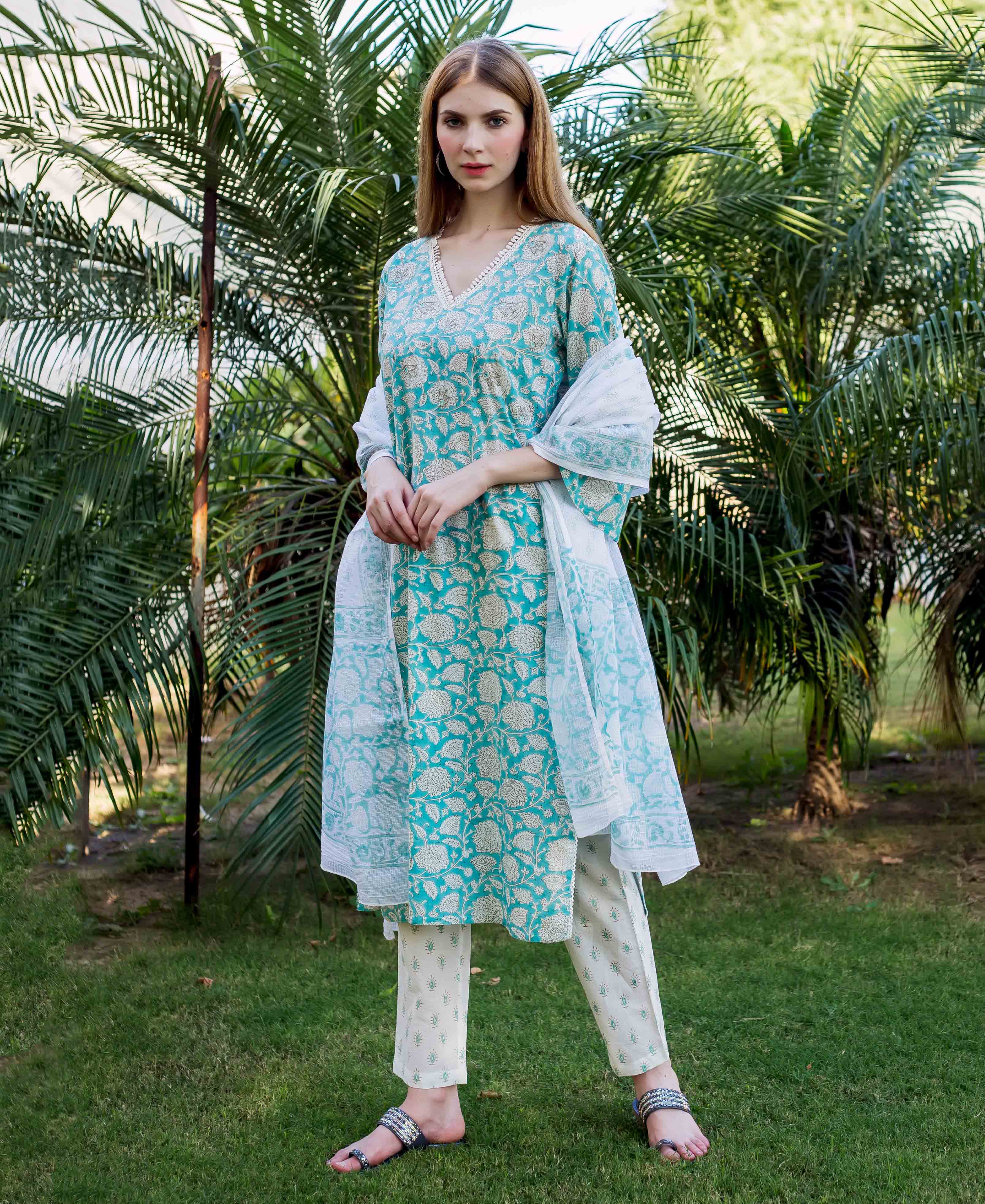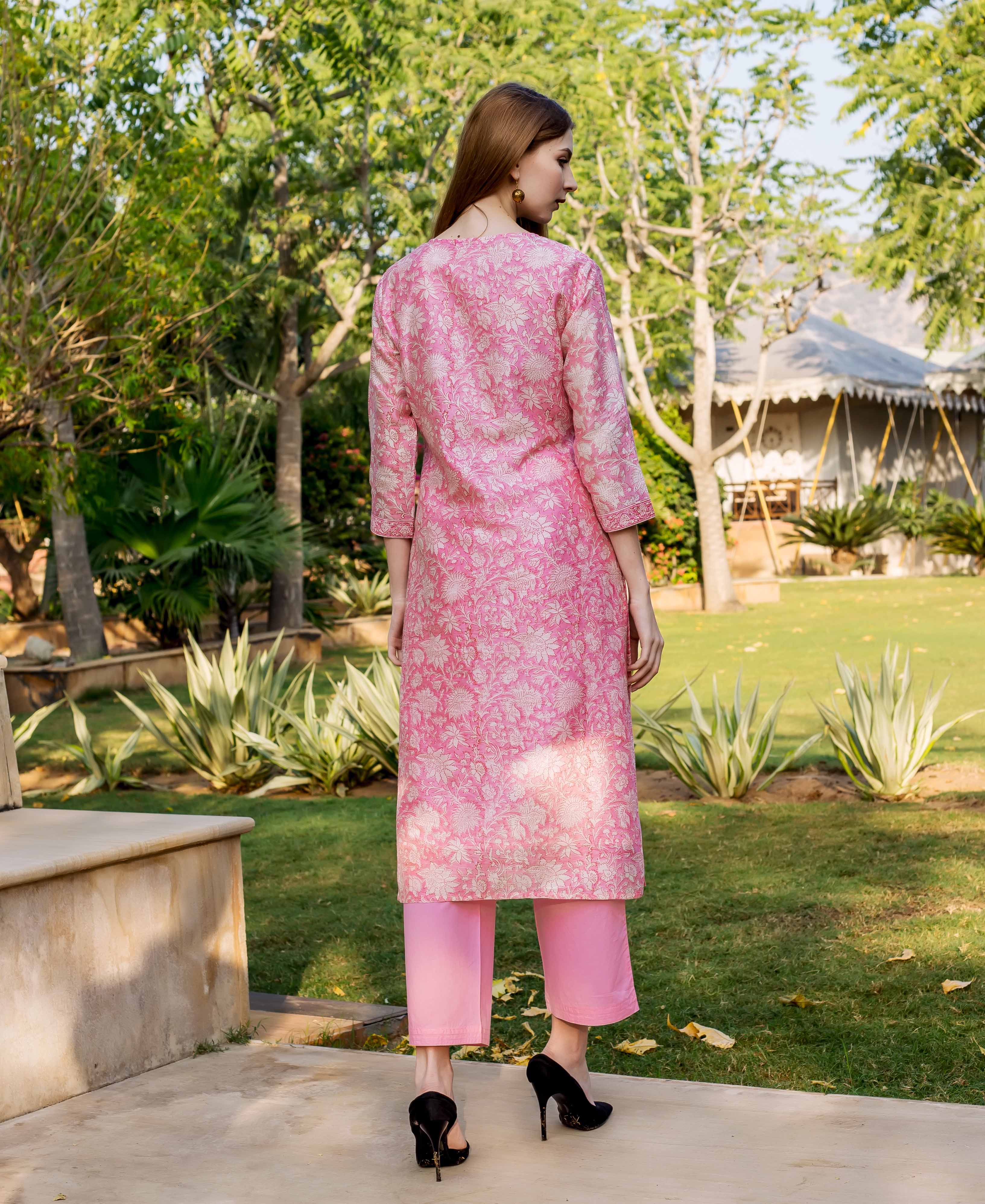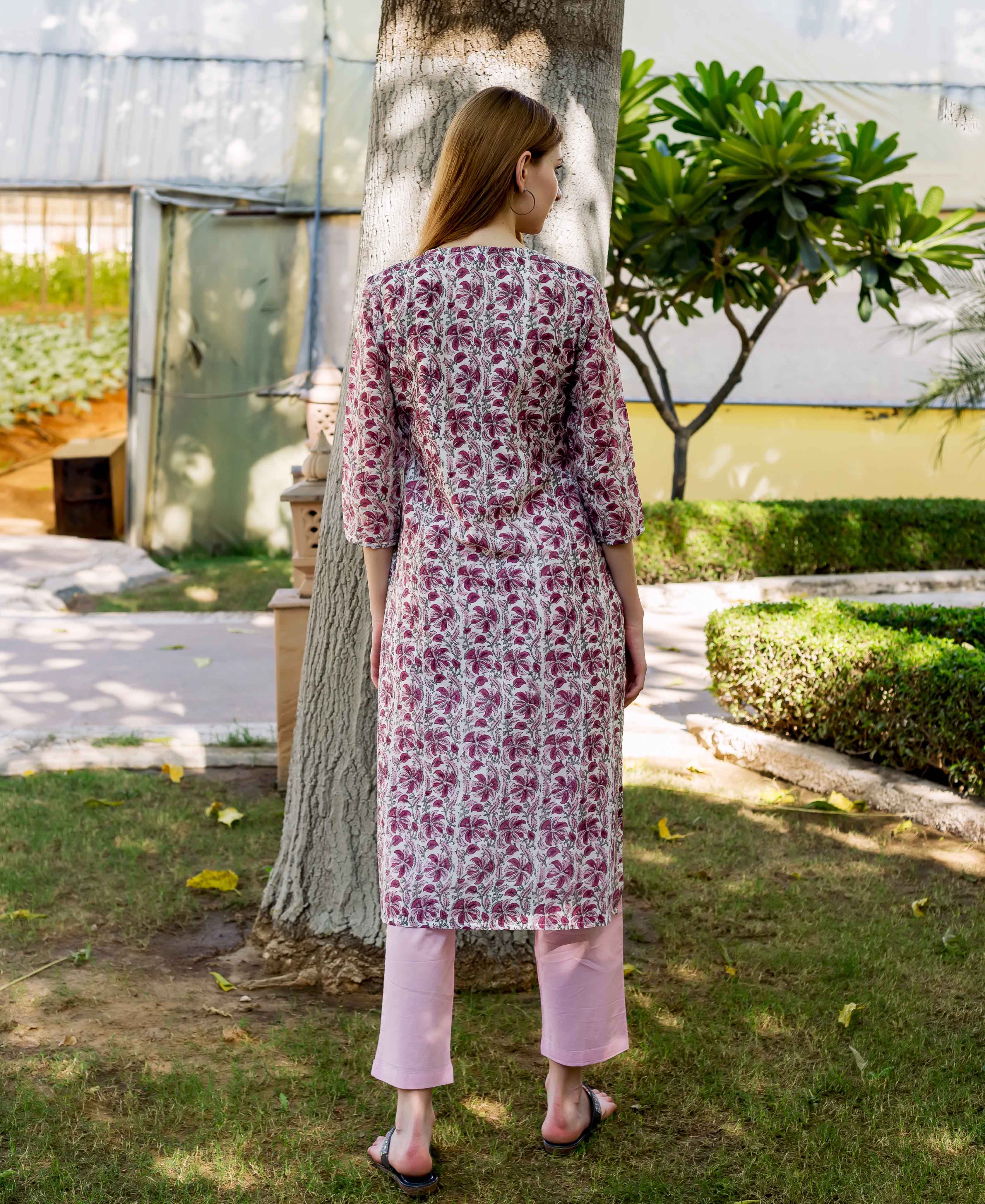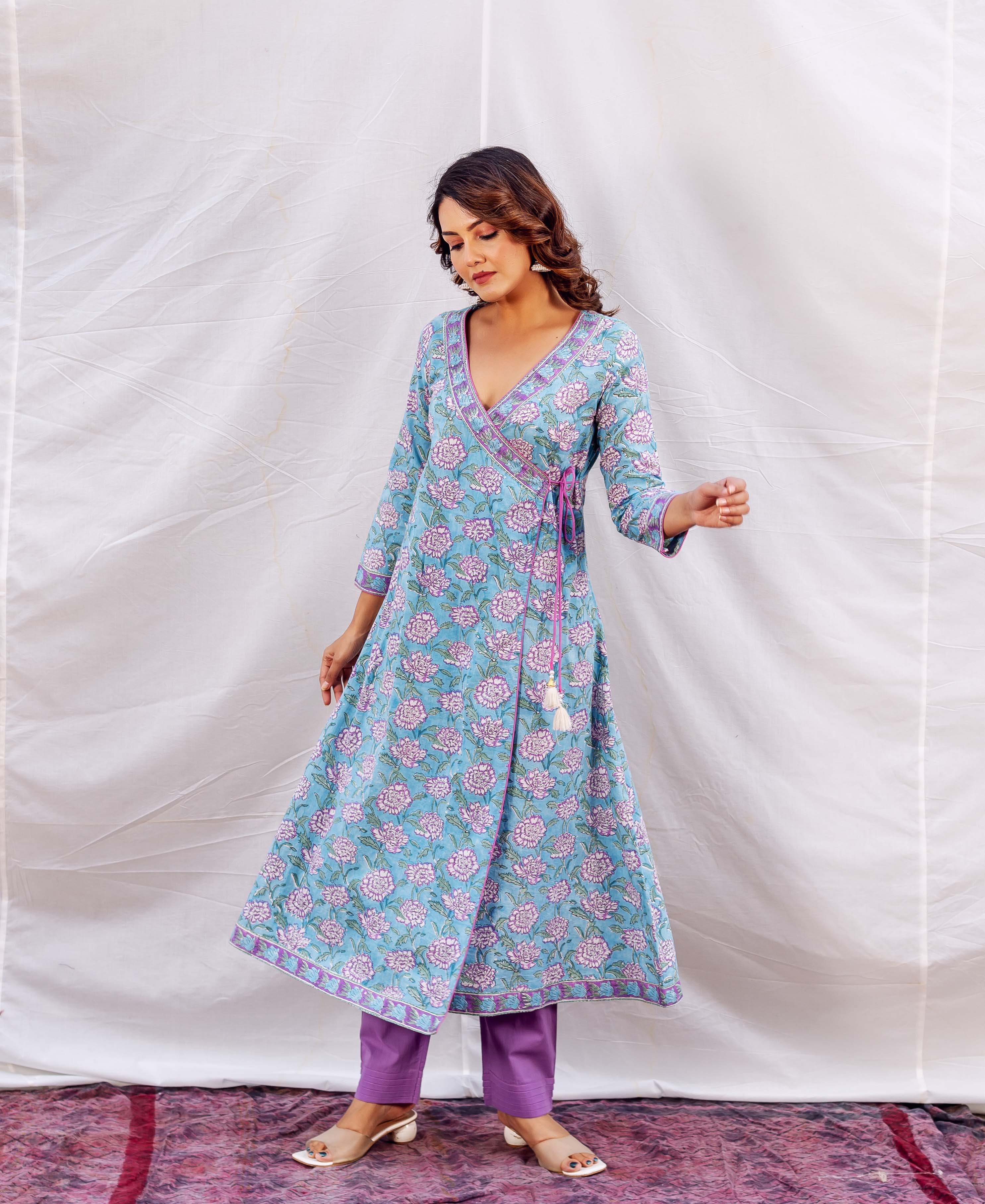 Indigo Hand Block Printed & Embroidered Straight Kurta