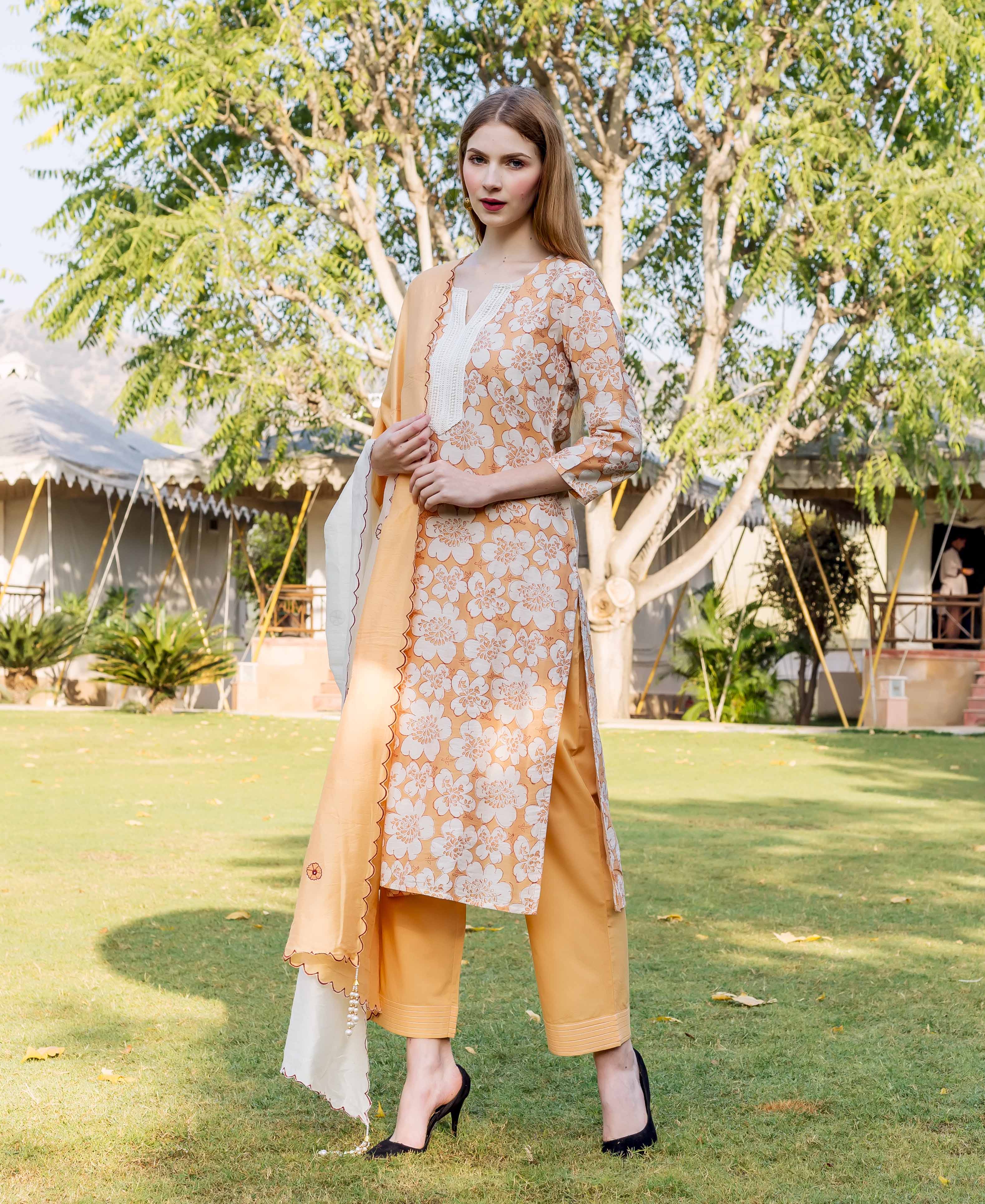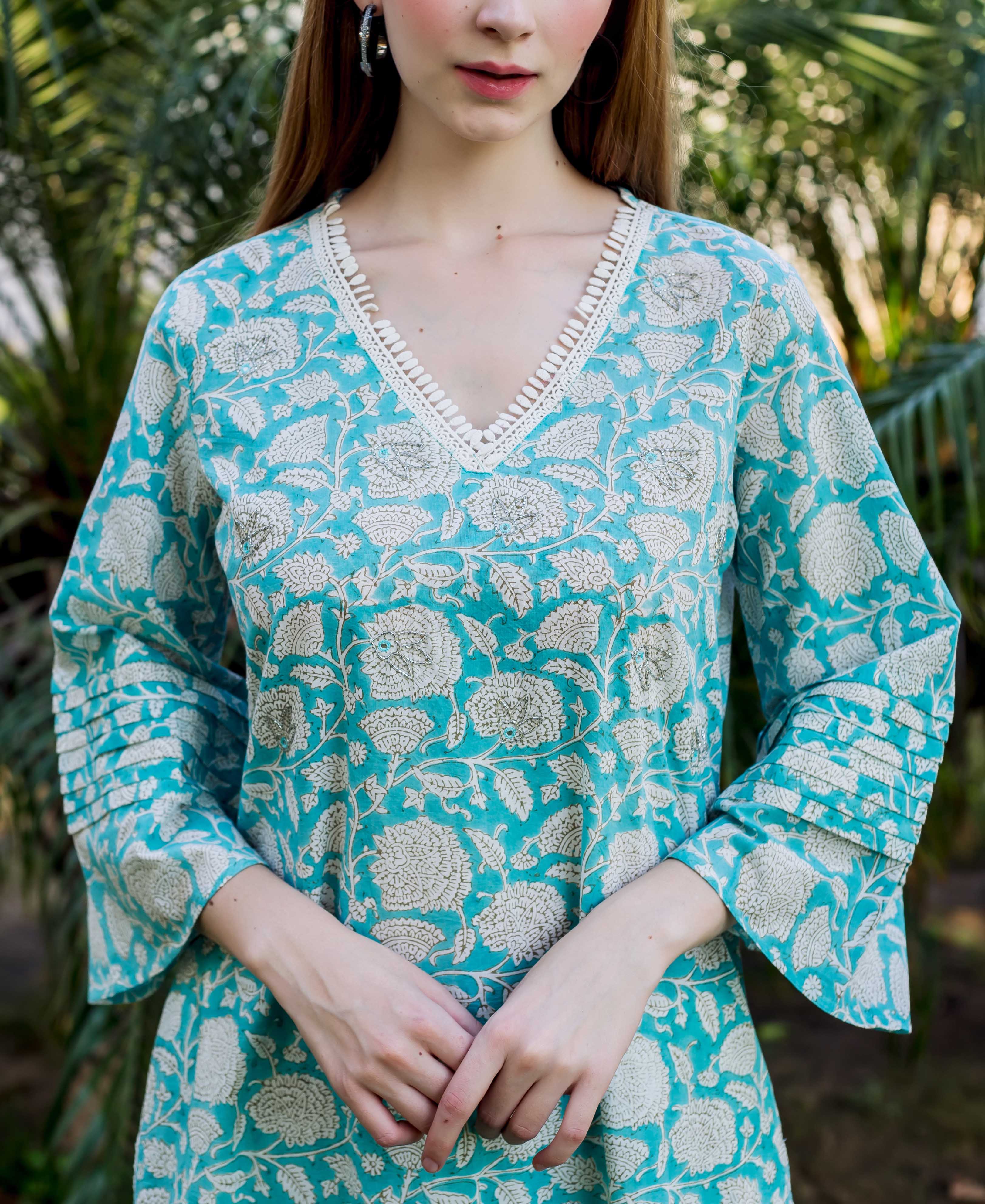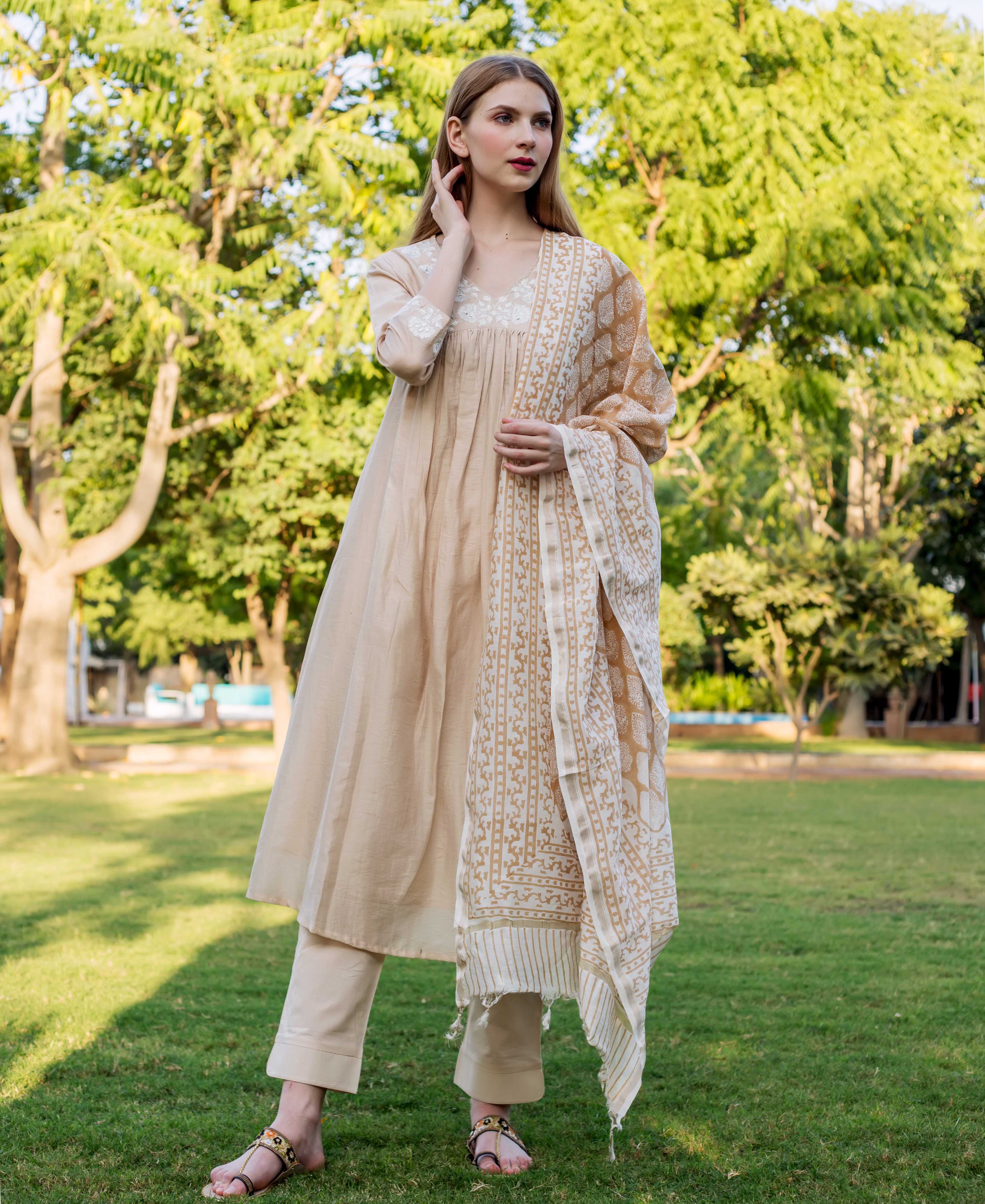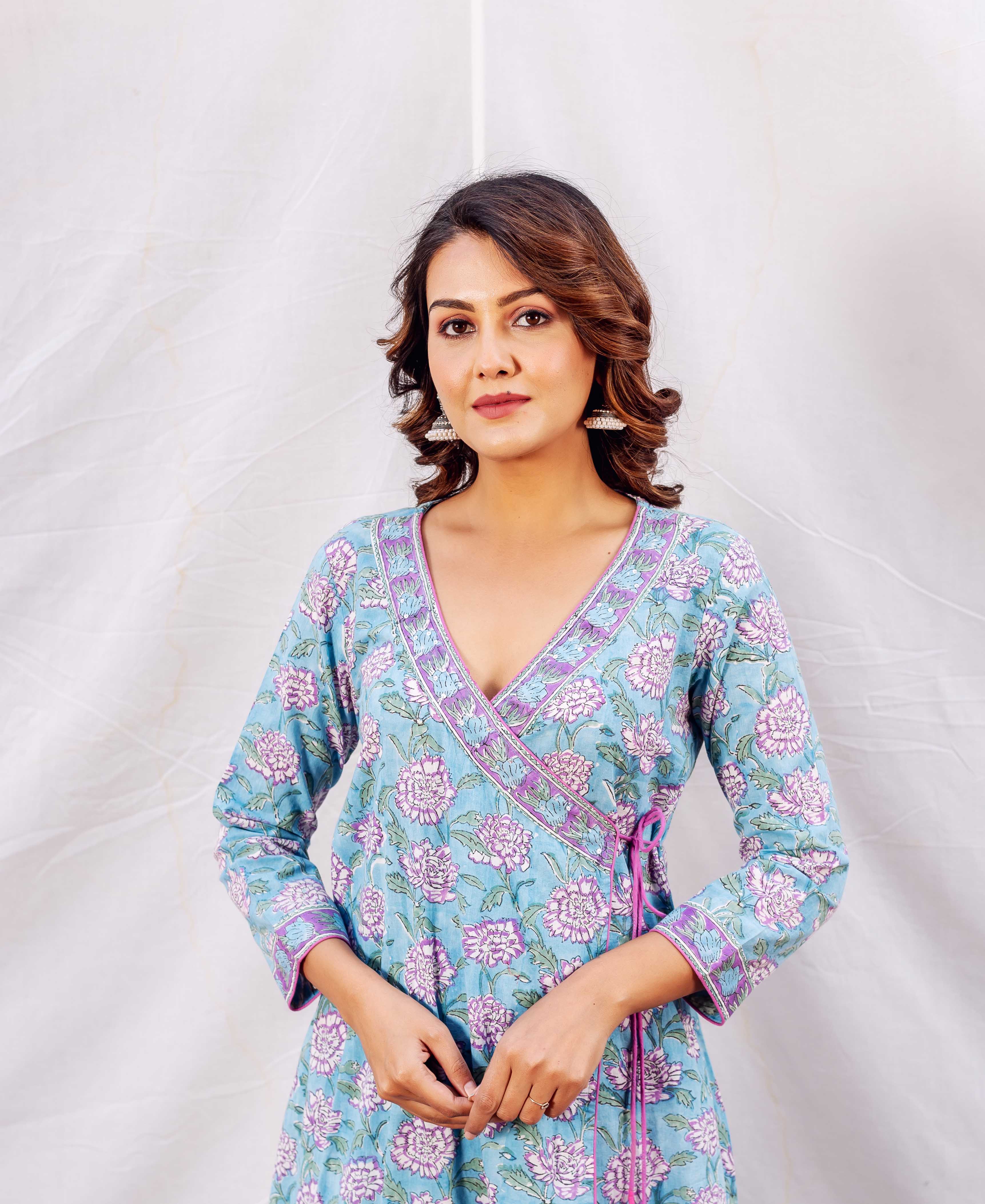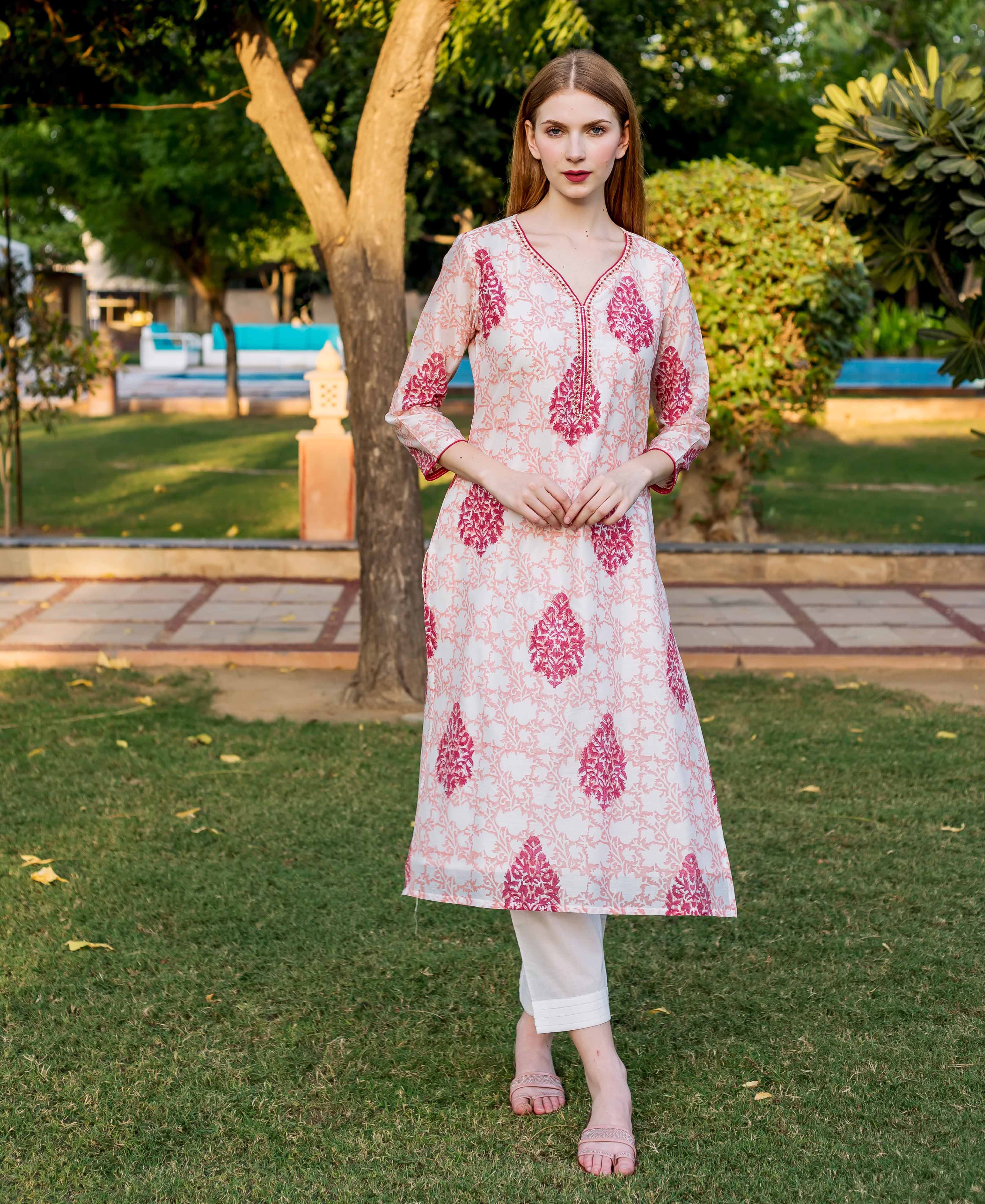 Indigo Hand Block Printed & Embroidered Straight Kurta