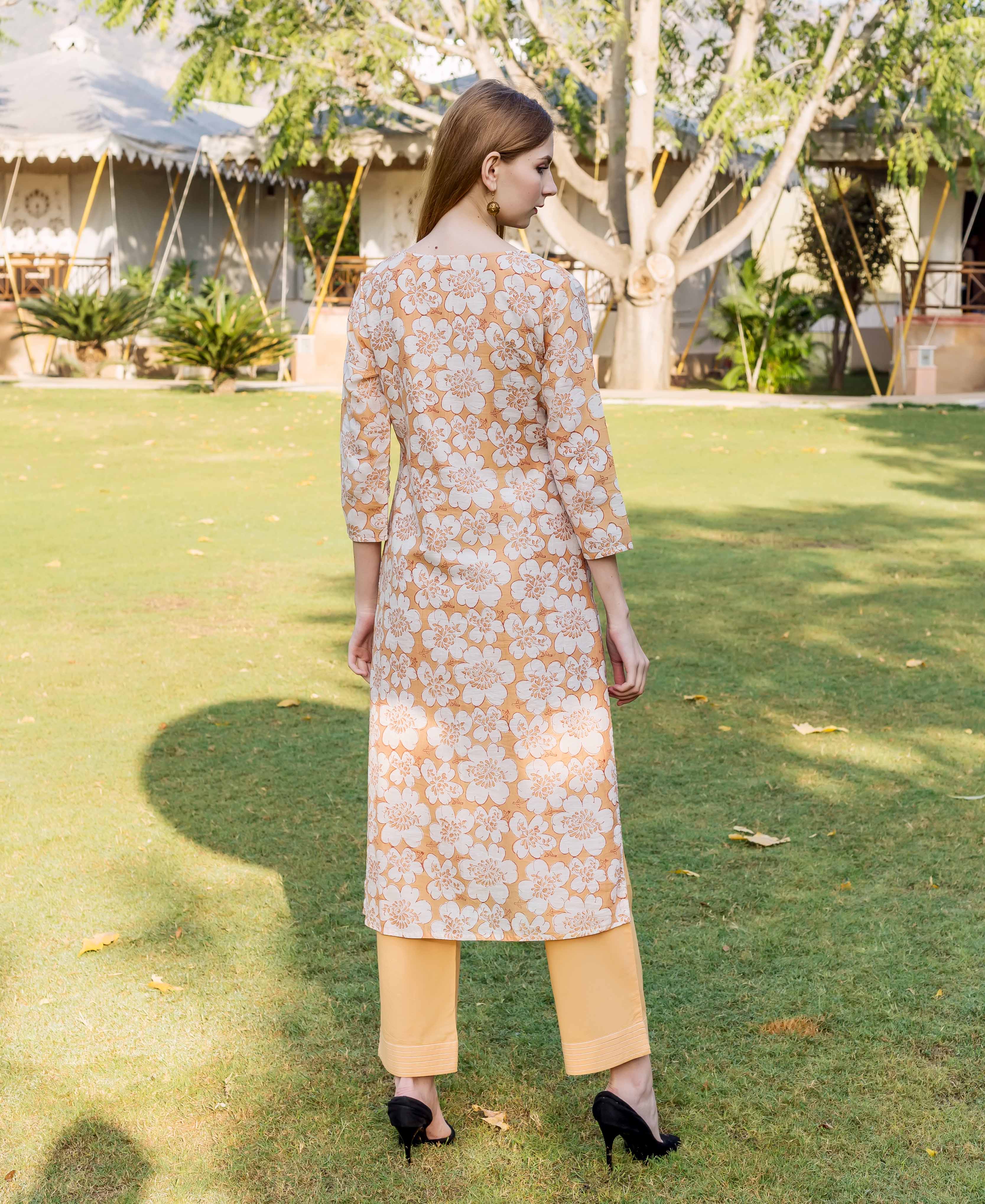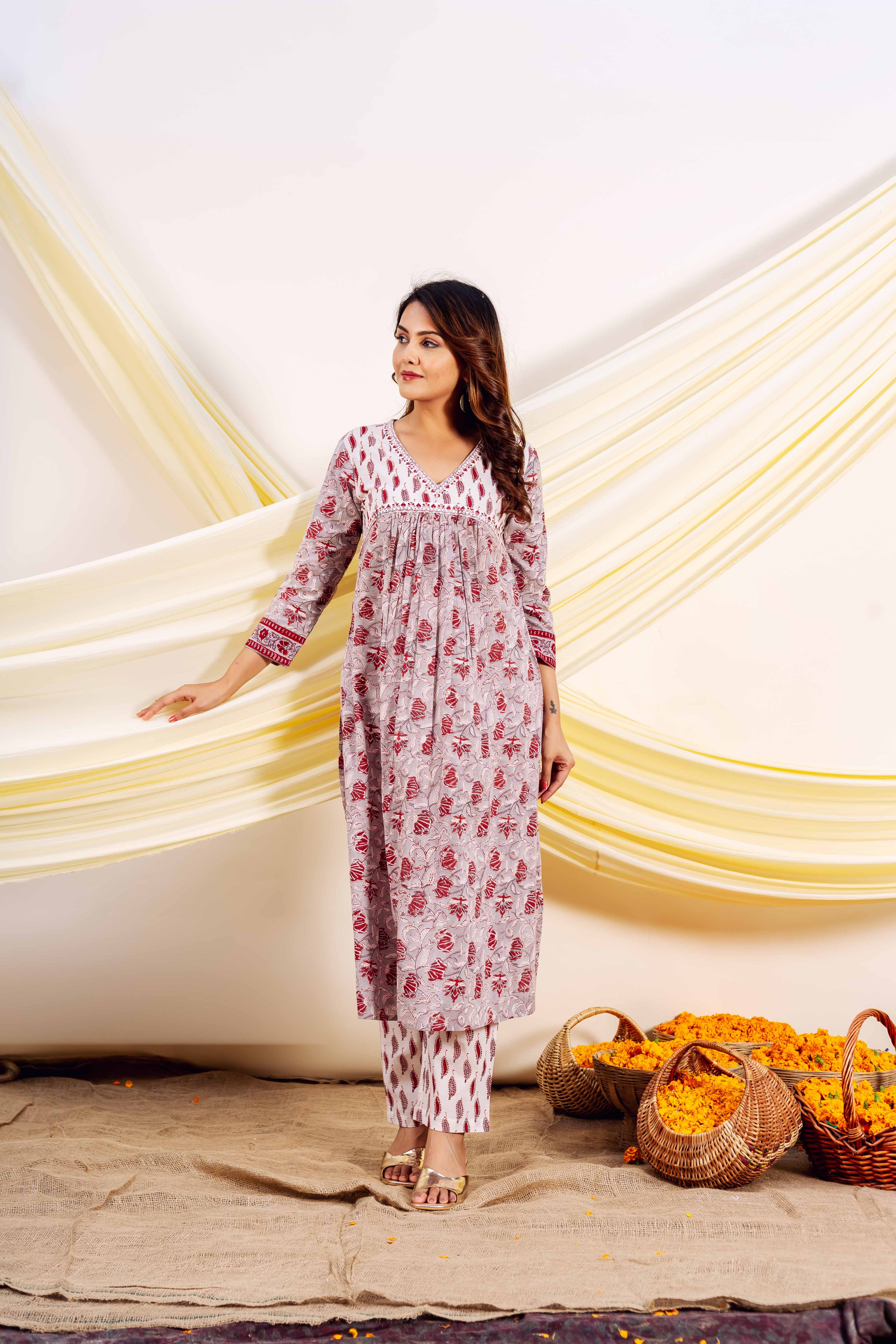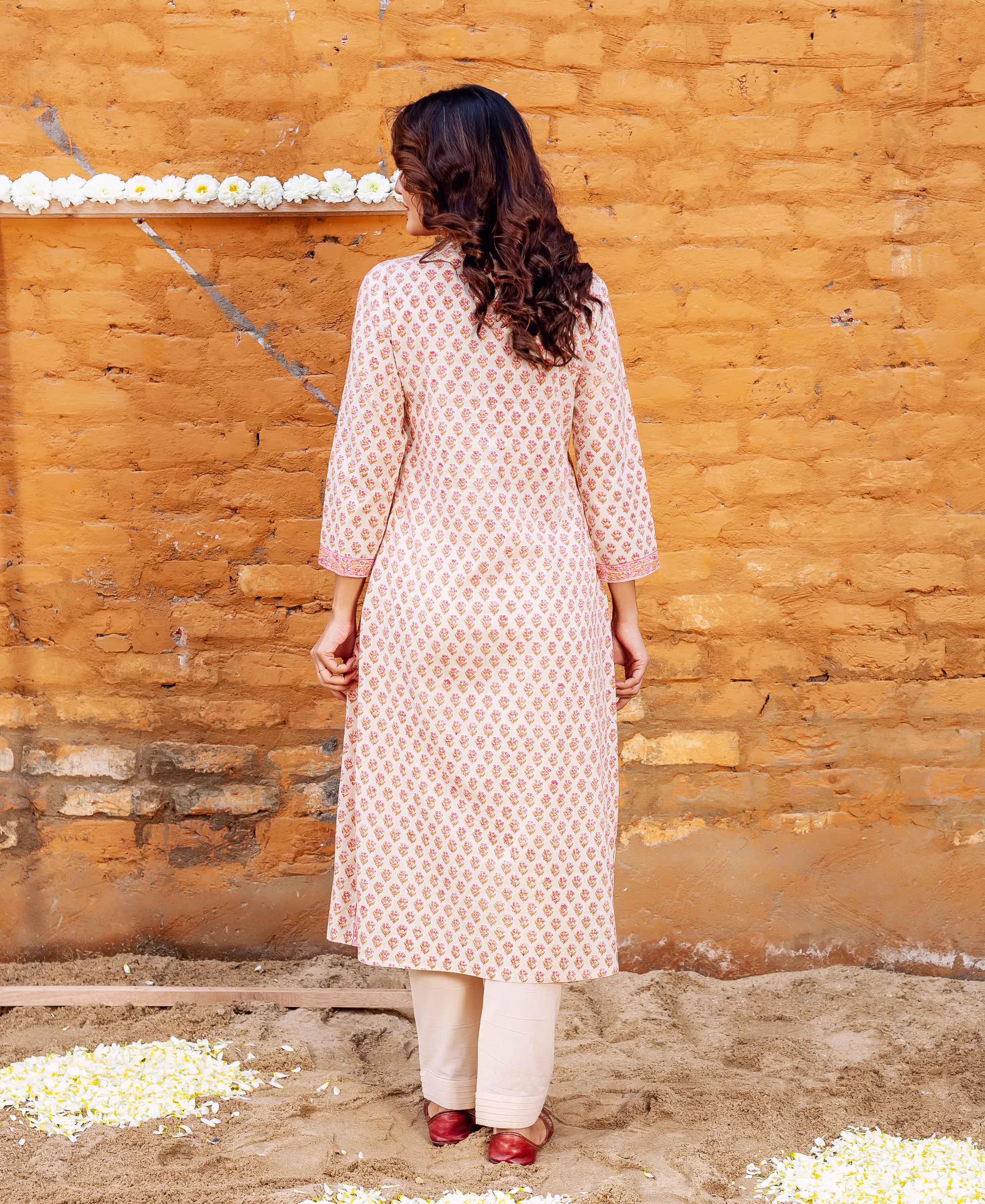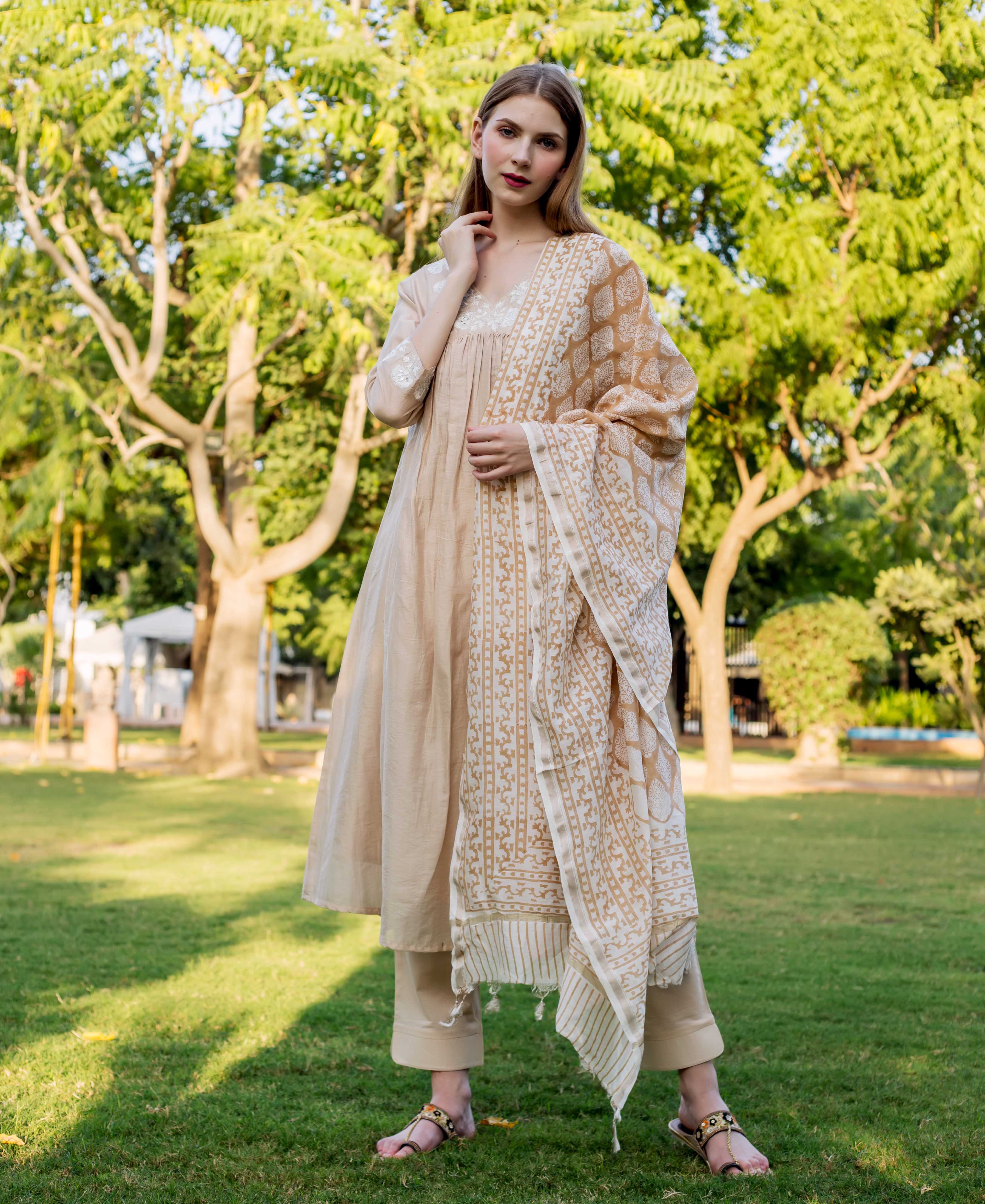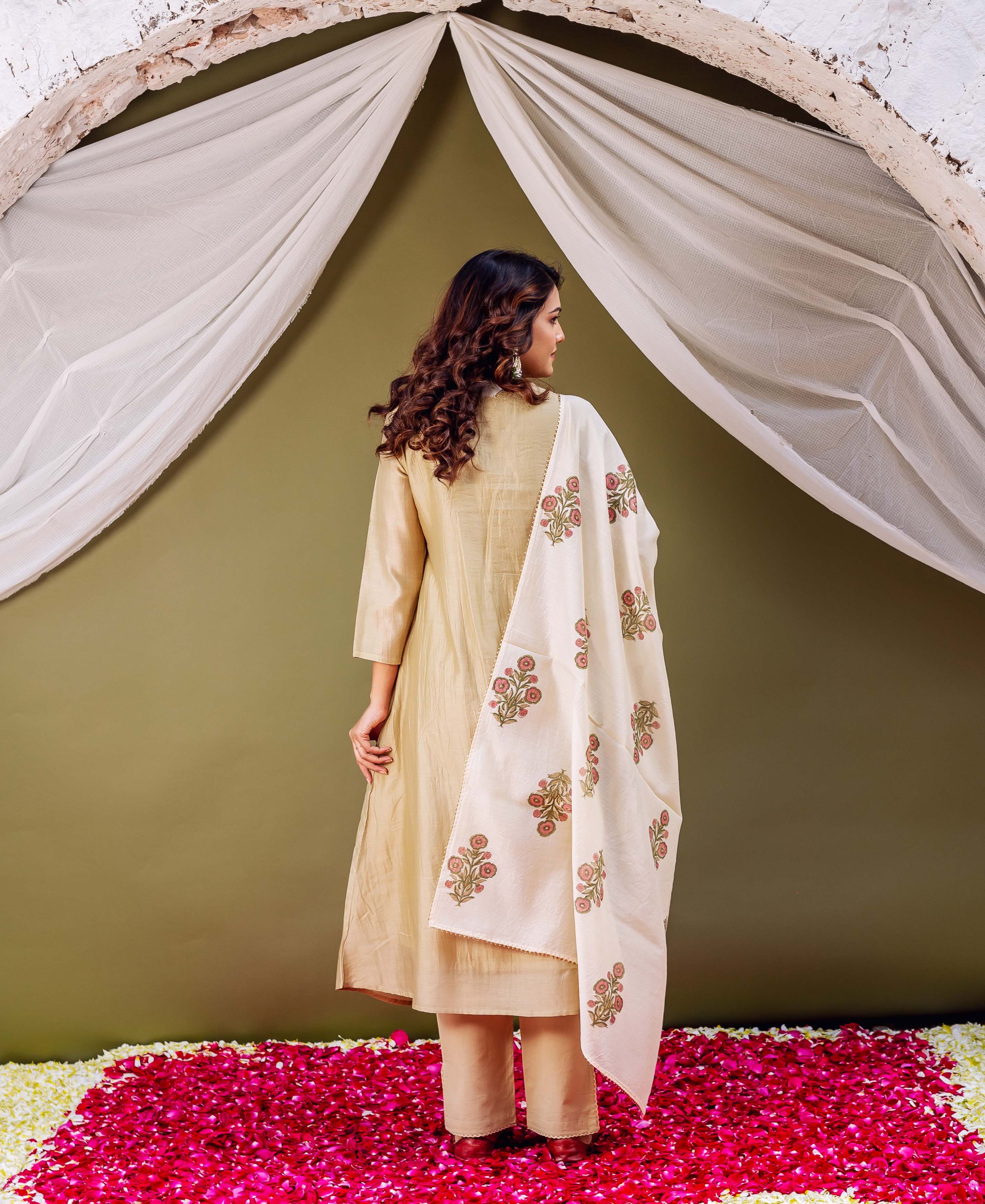 Indigo Hand Block Printed & Embroidered Straight Kurta