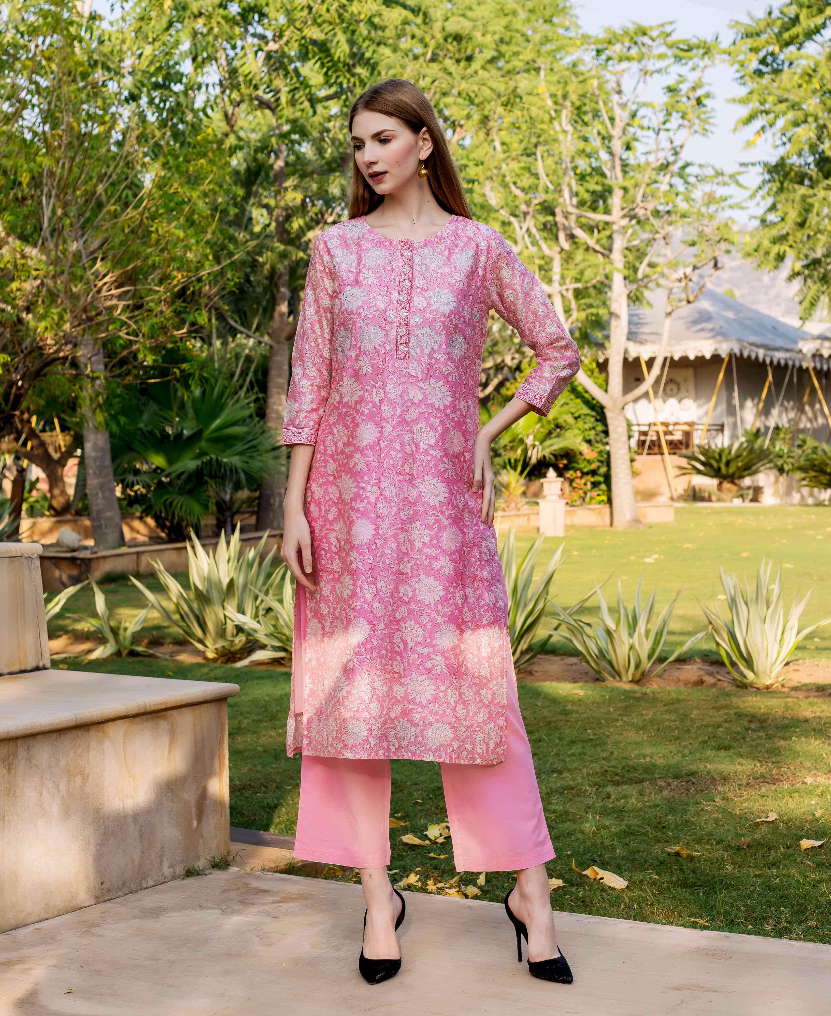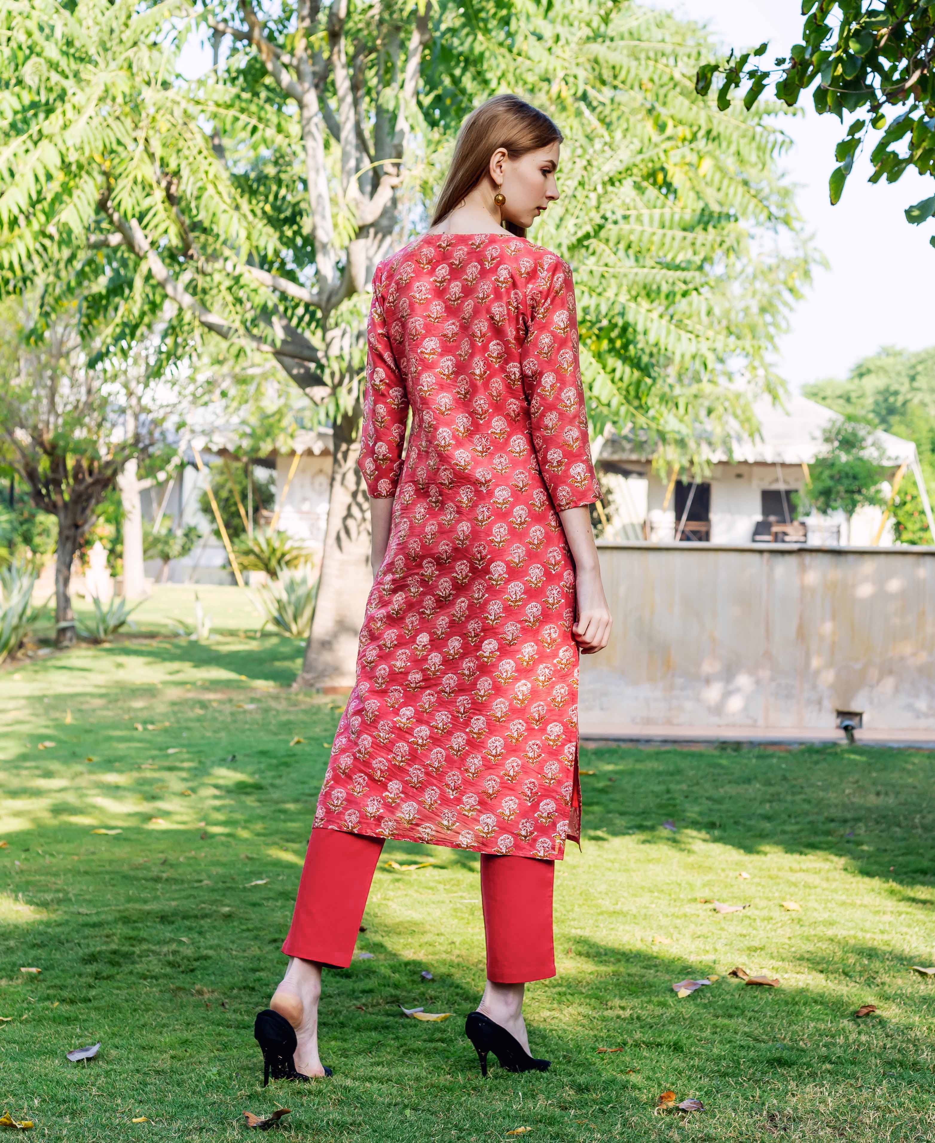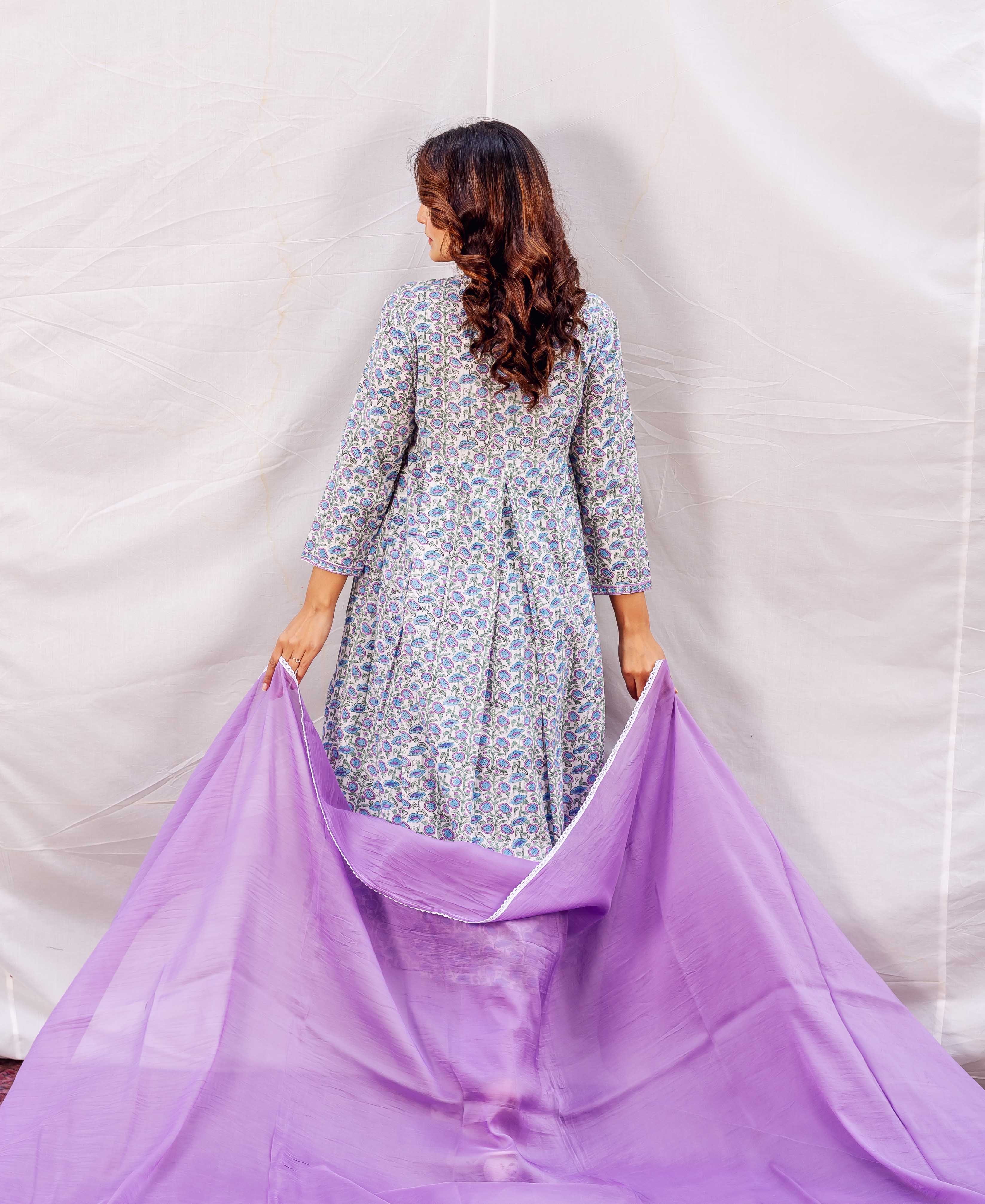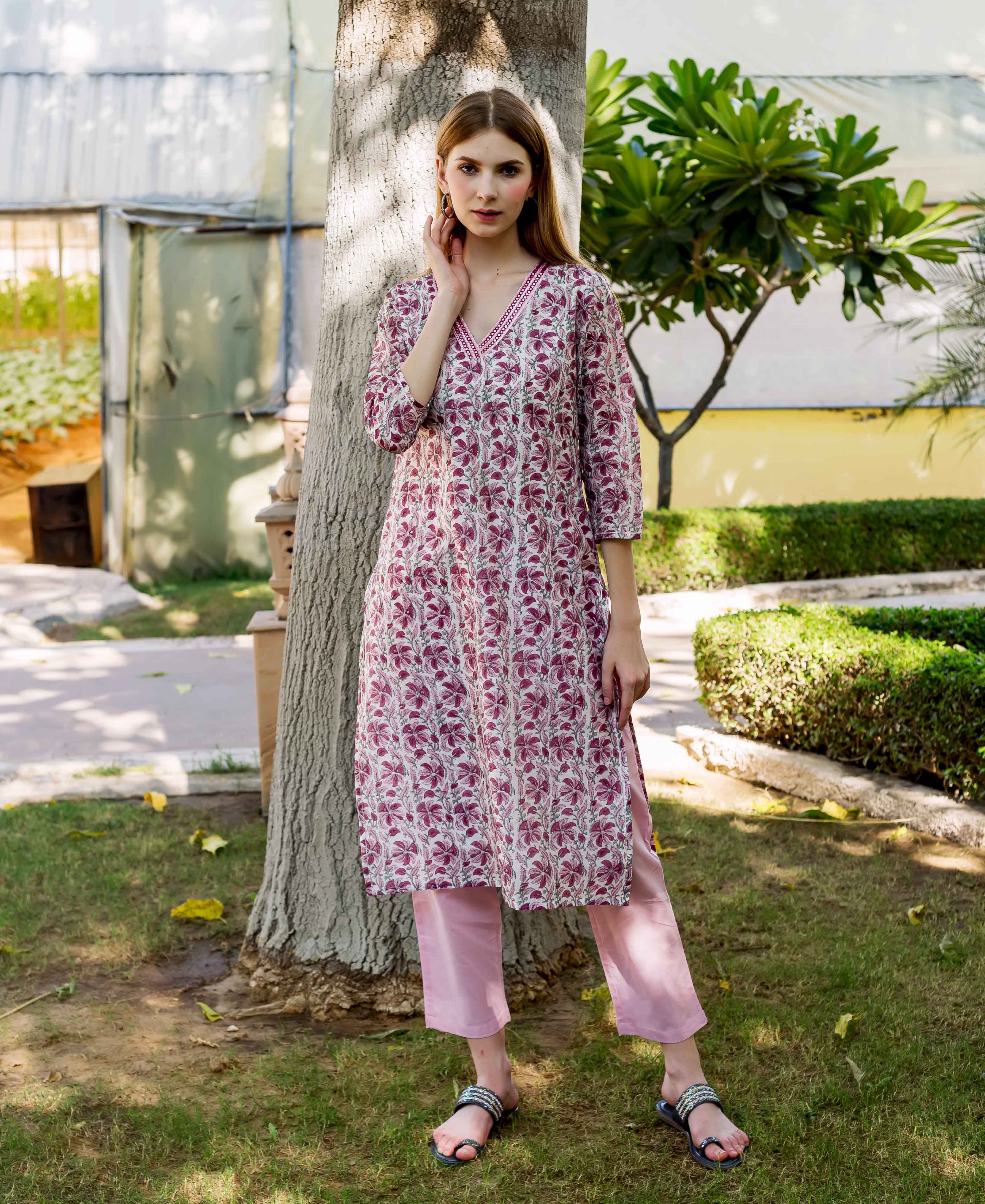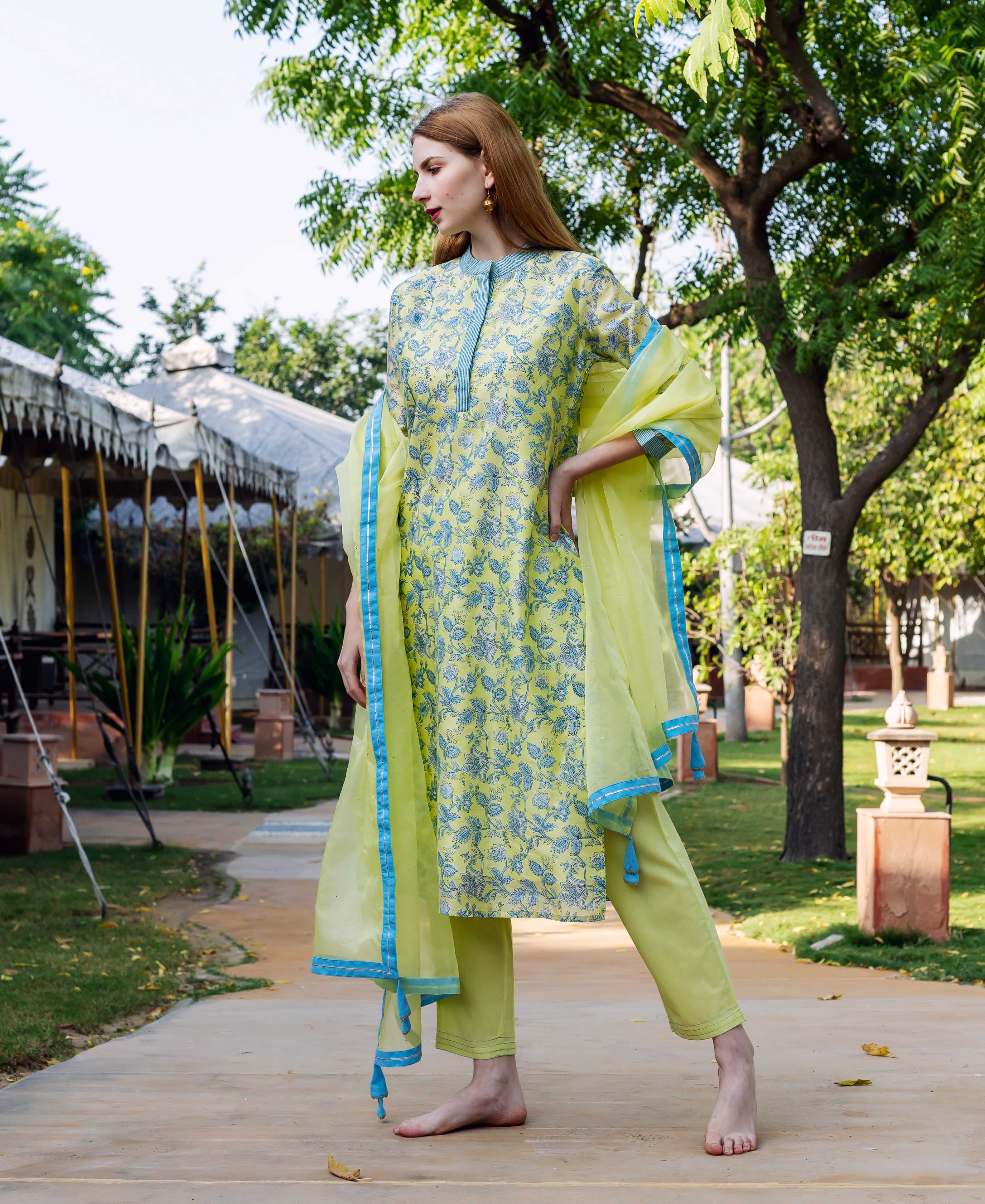 Indigo Hand Block Printed & Embroidered Straight Kurta