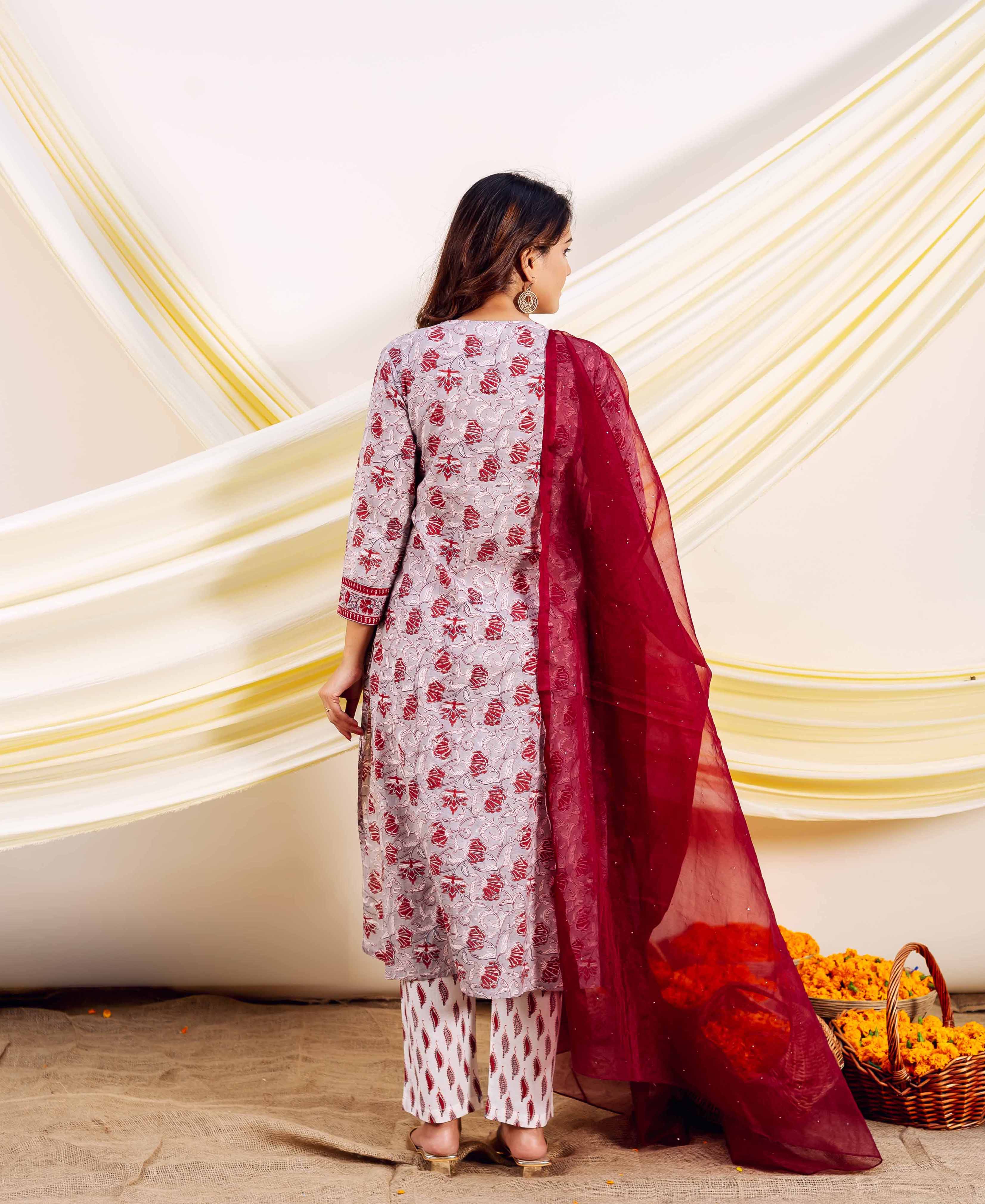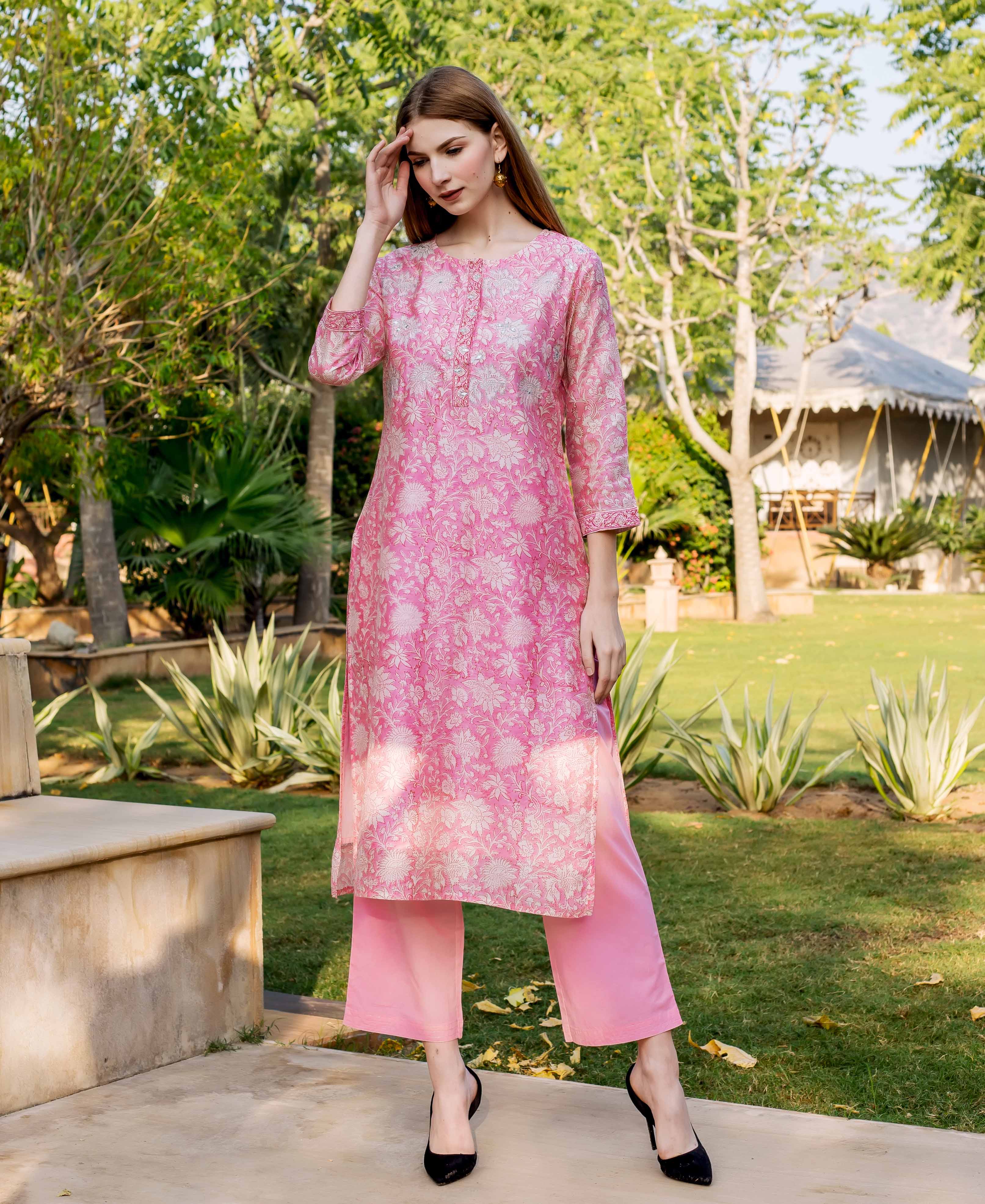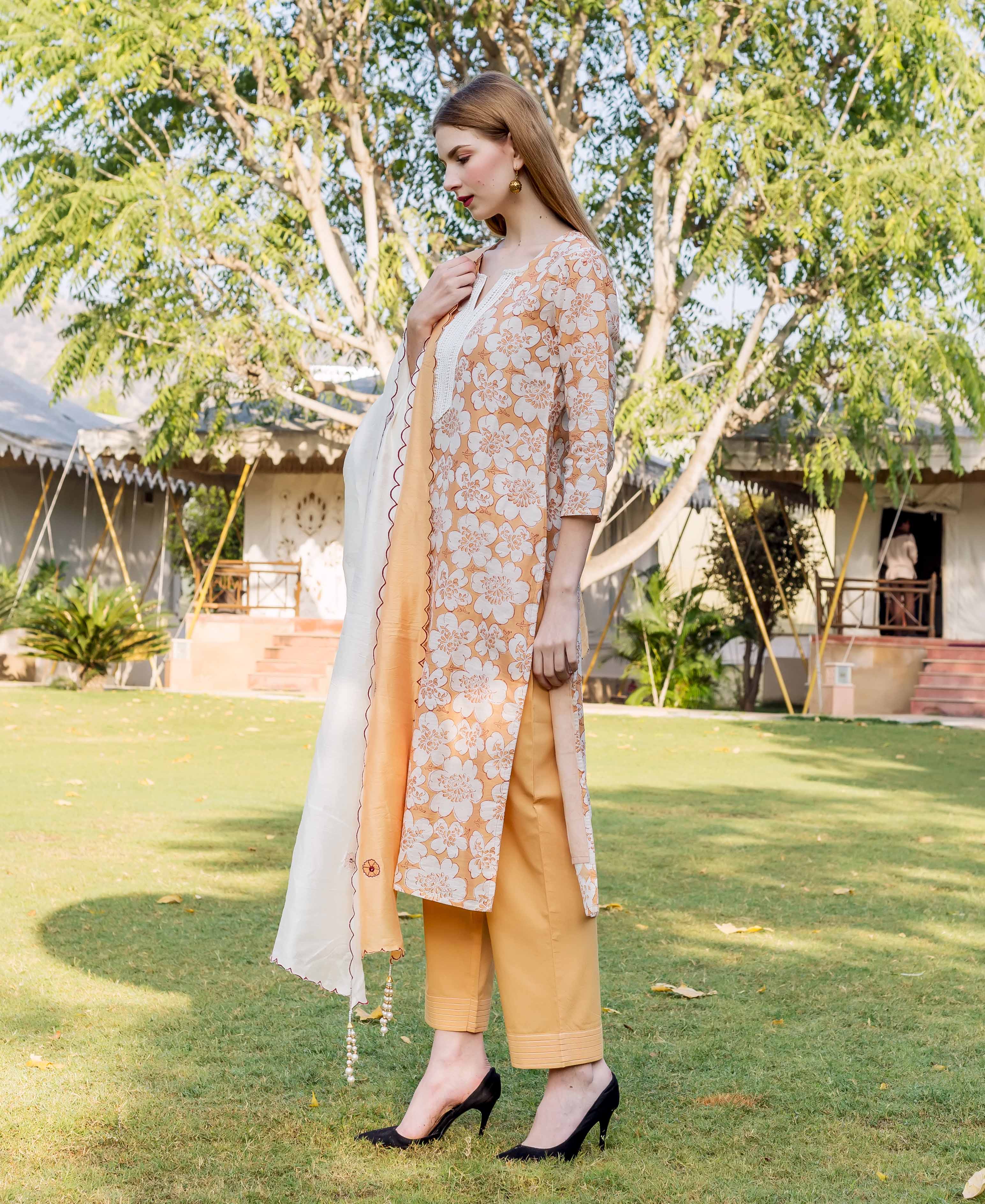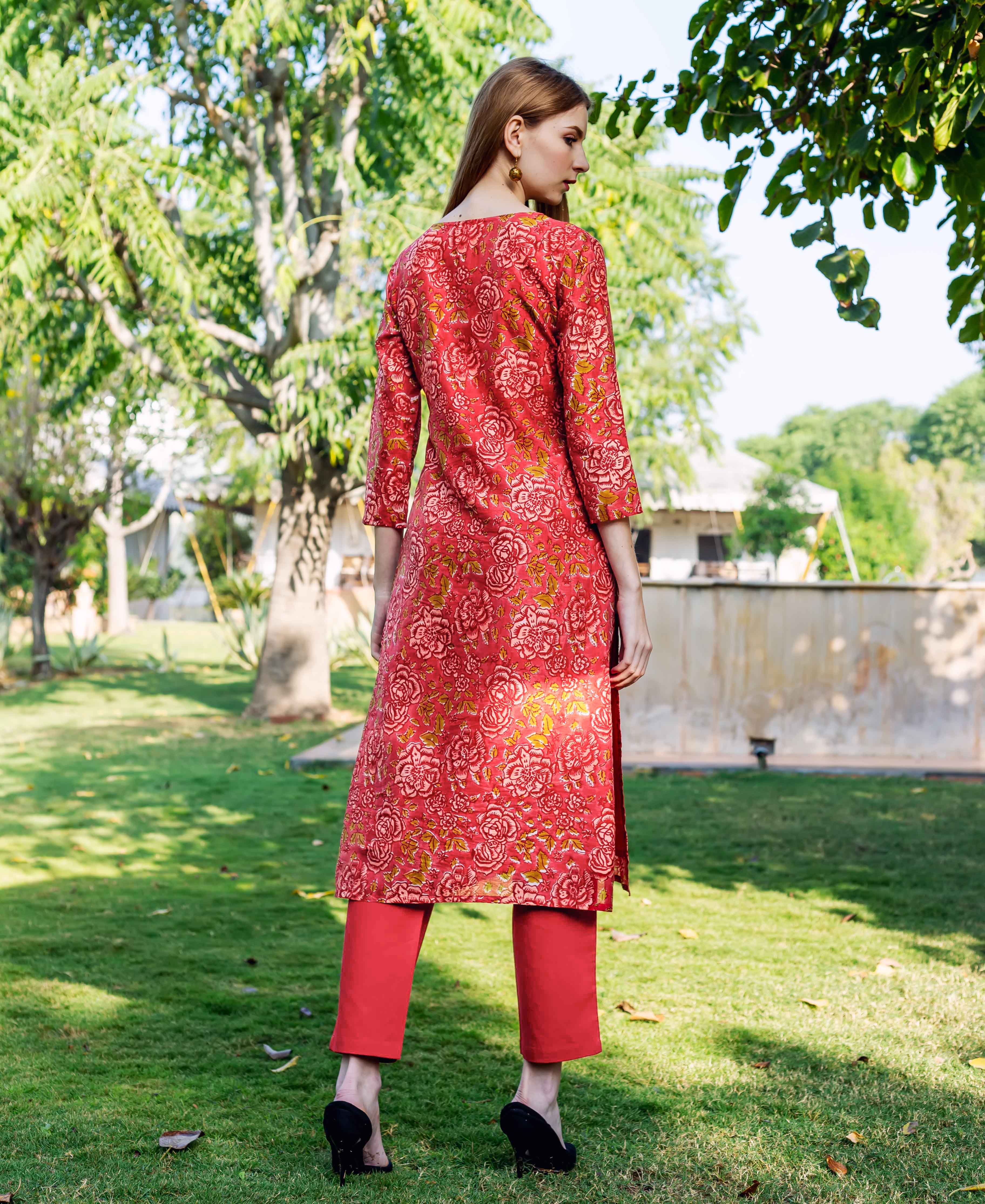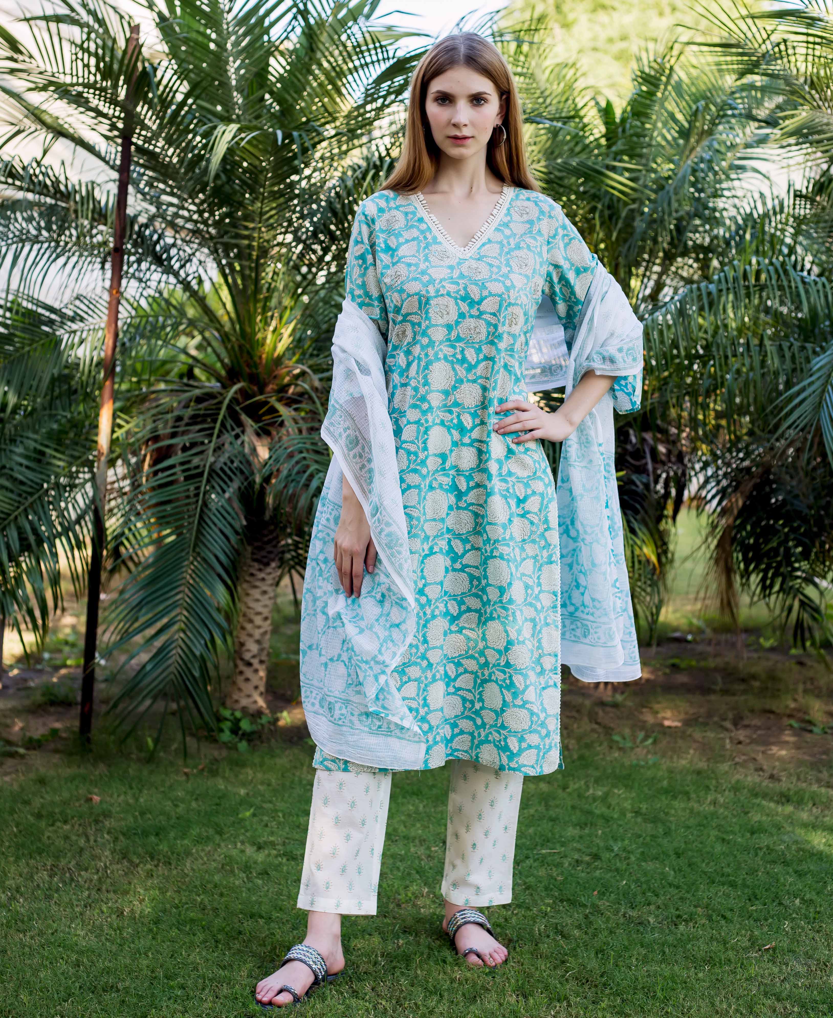 Indigo Hand Block Printed & Embroidered Straight Kurta