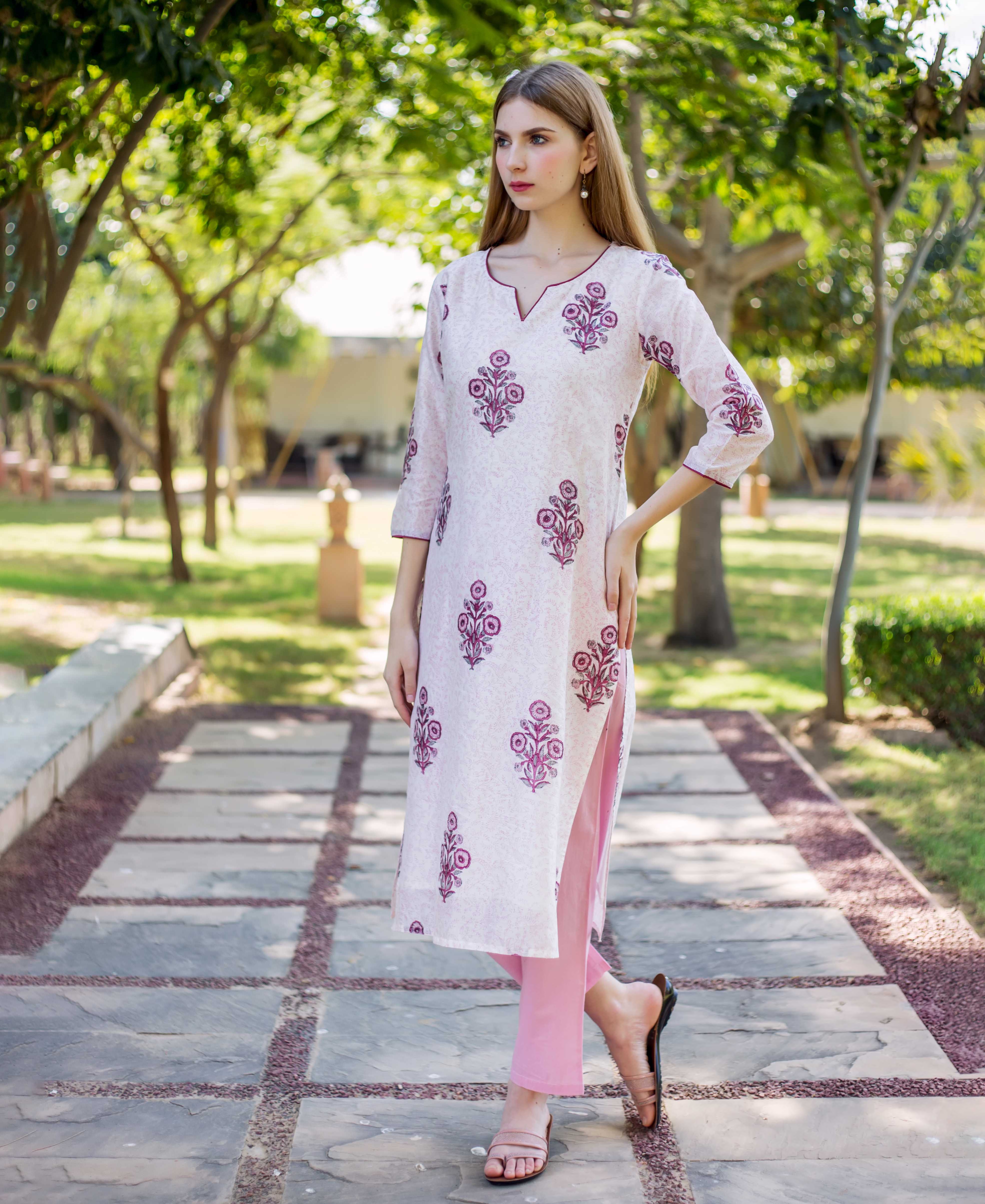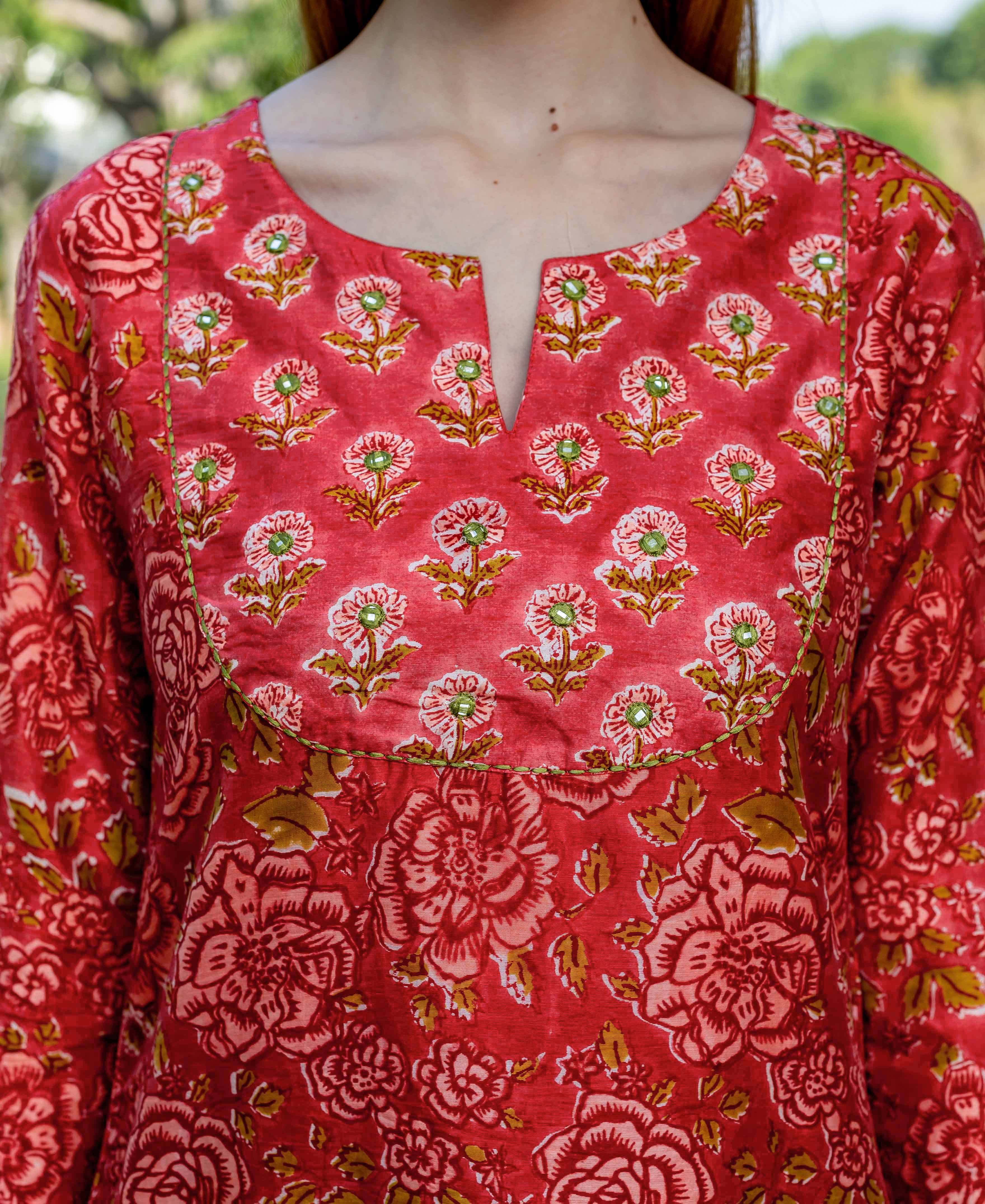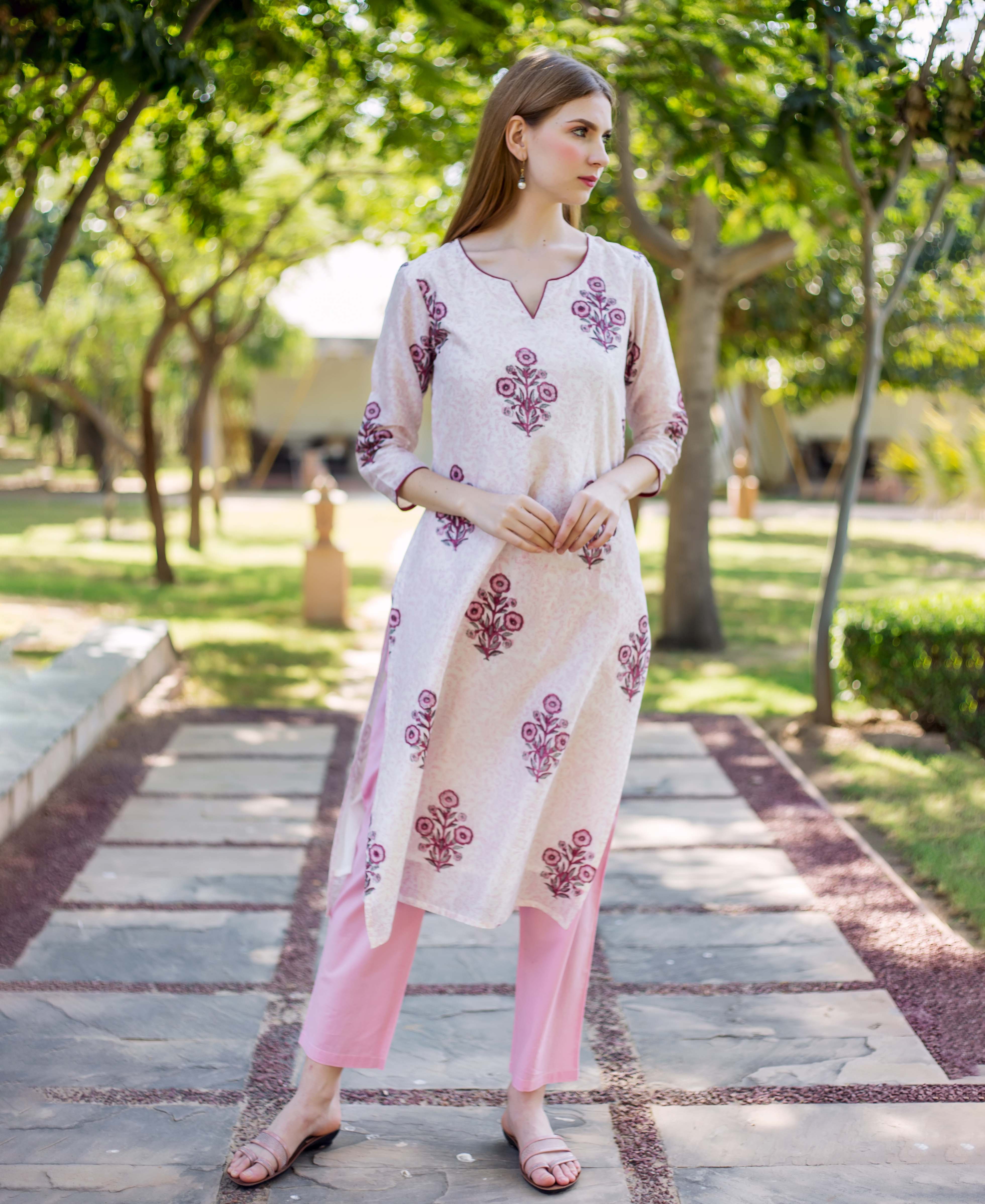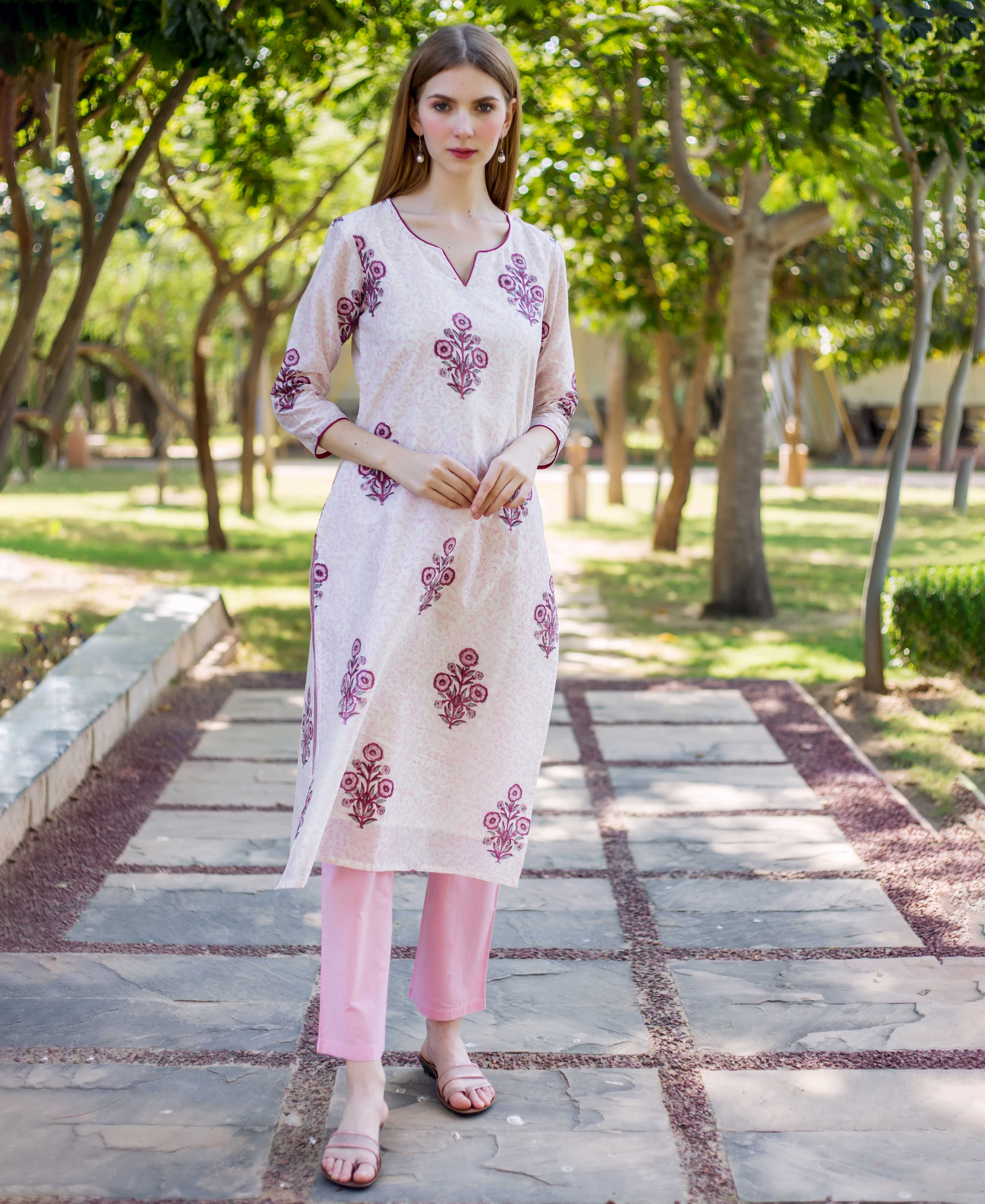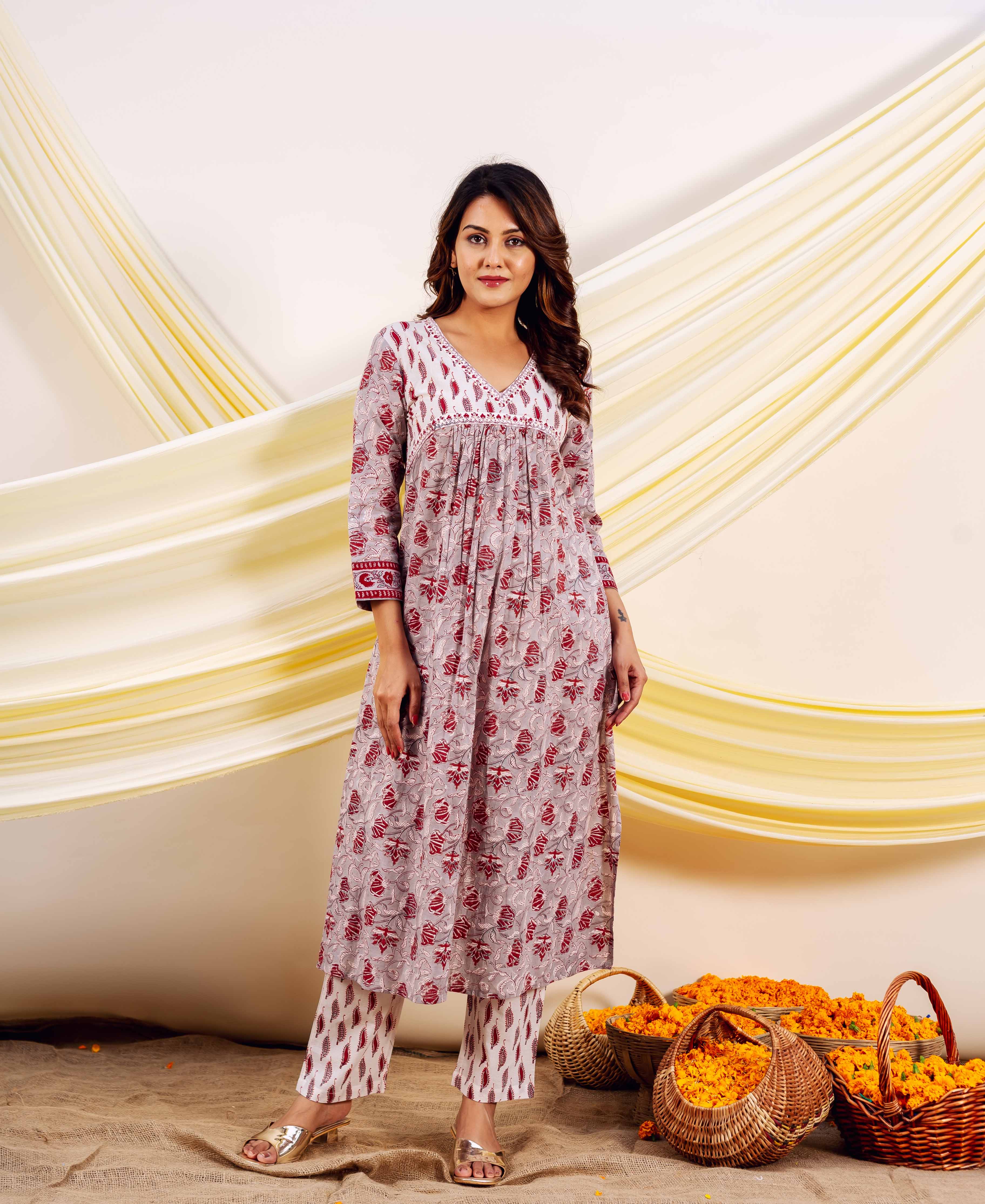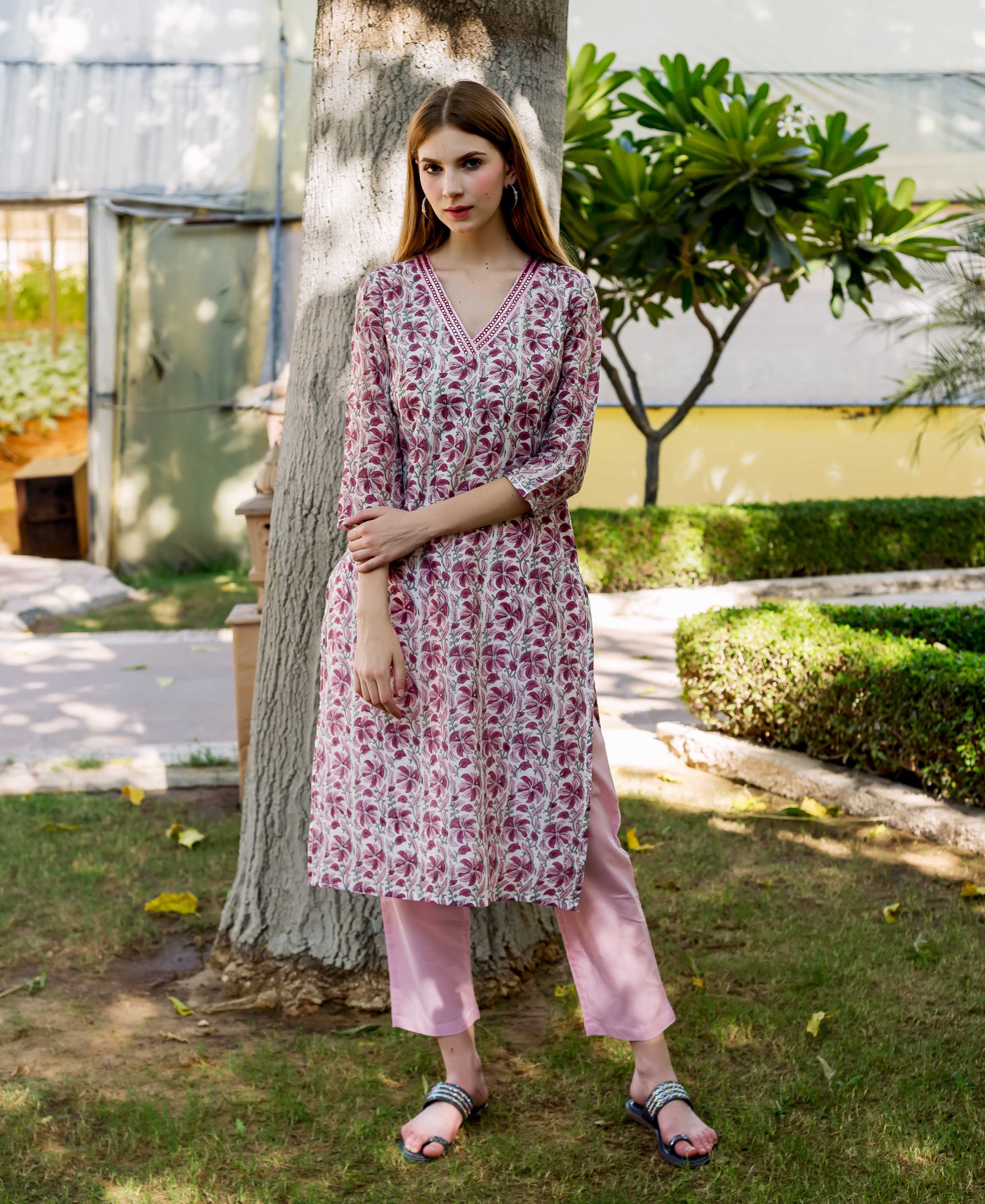Indigo Hand Block Printed & Embroidered Straight Kurta