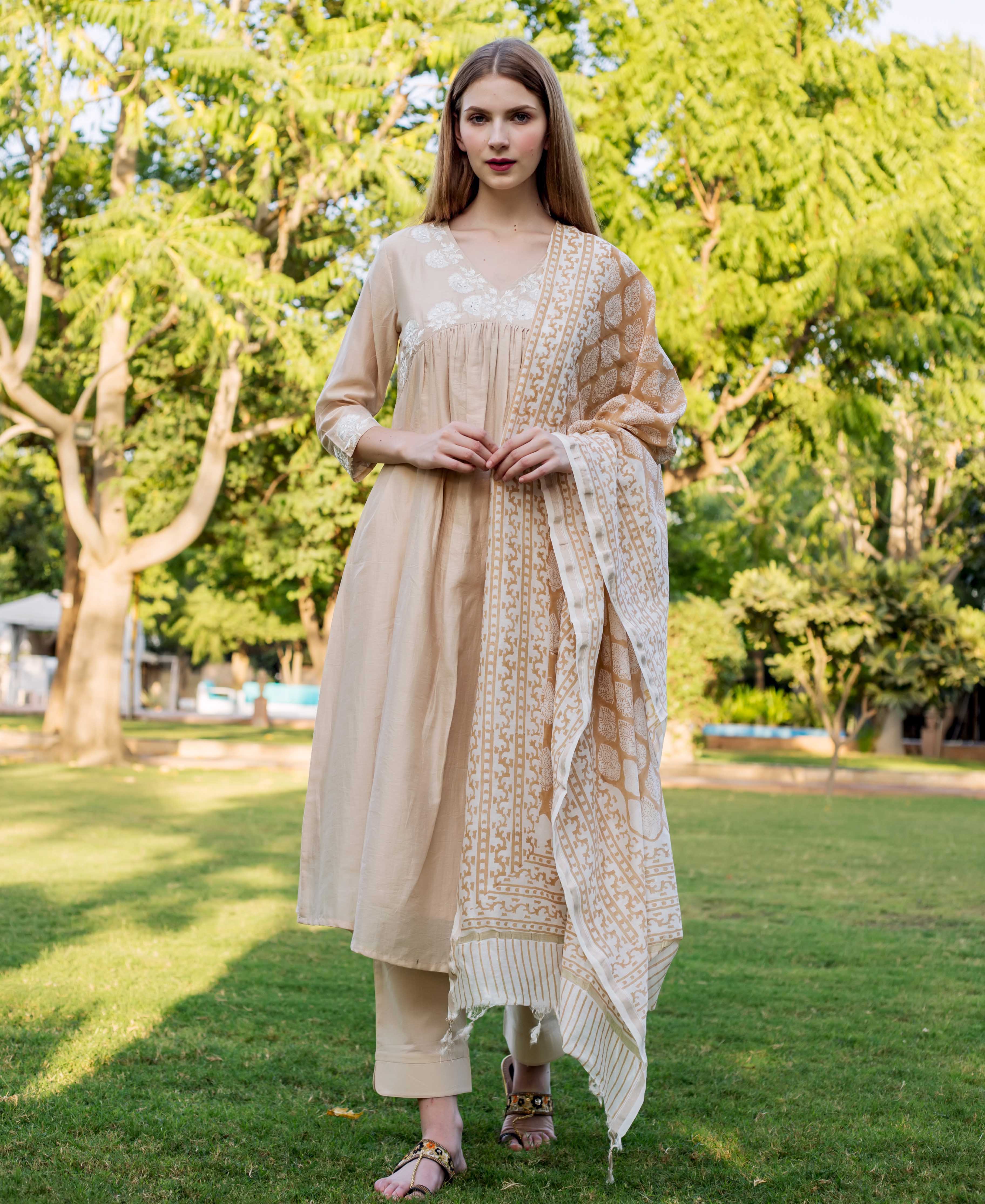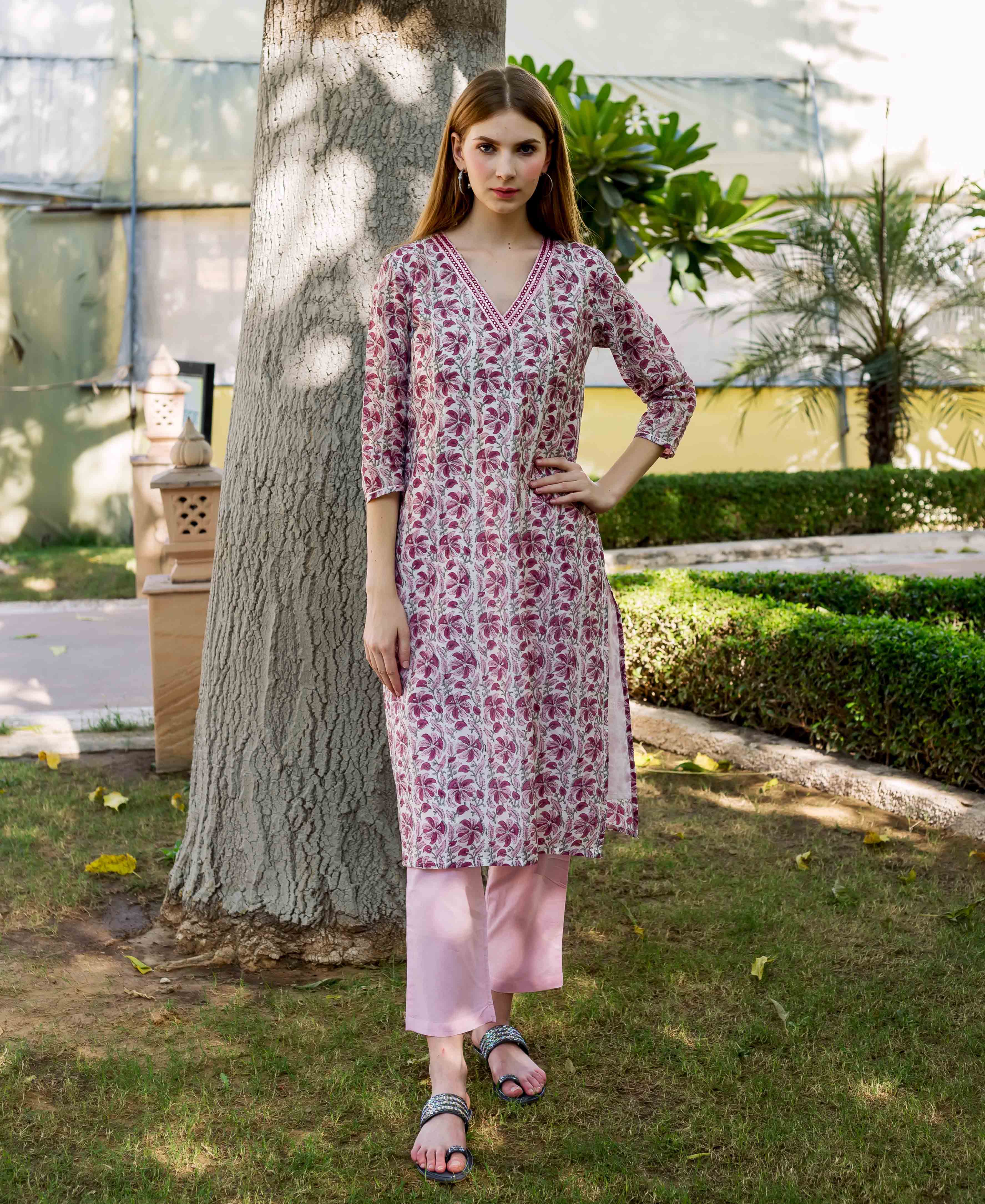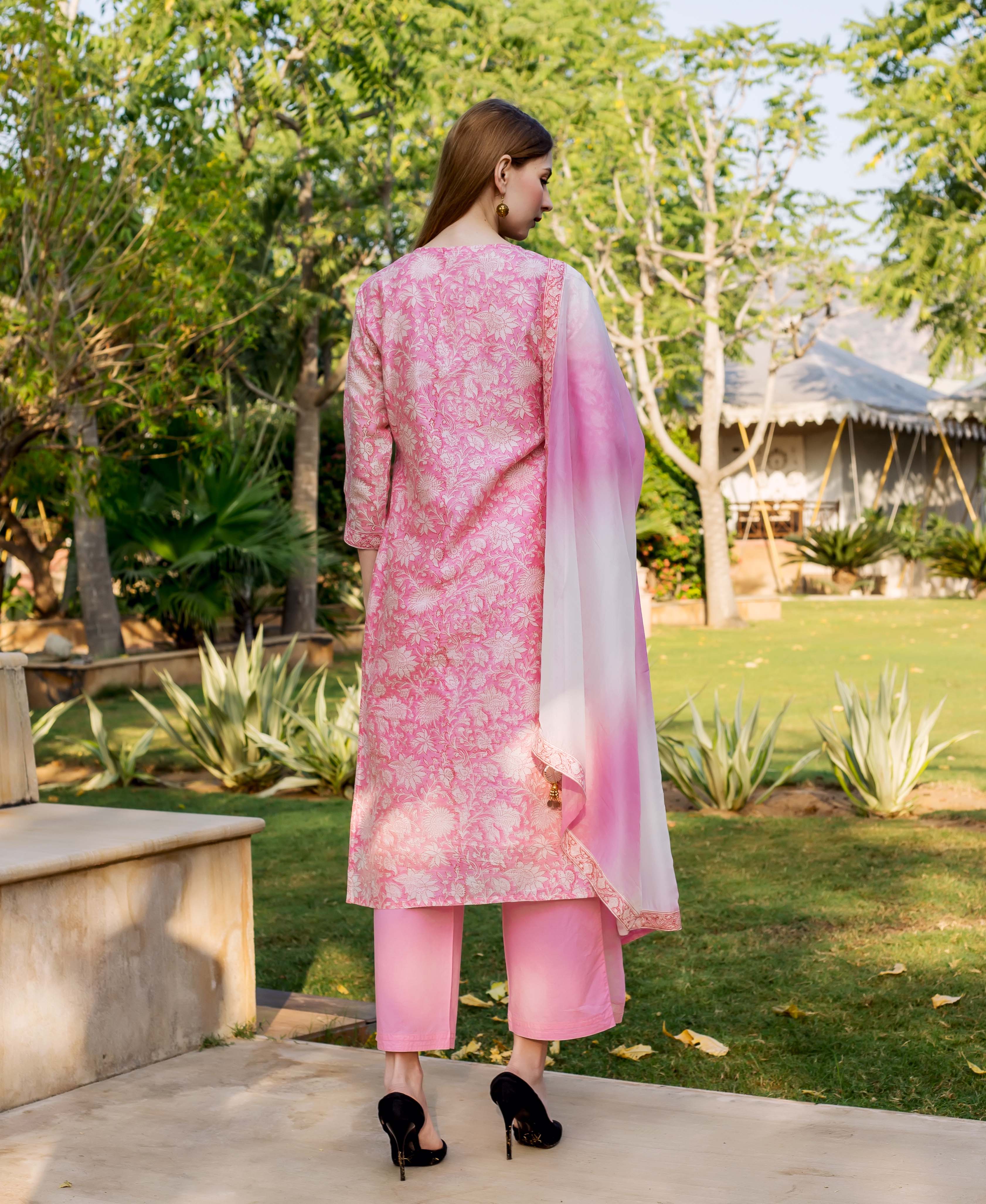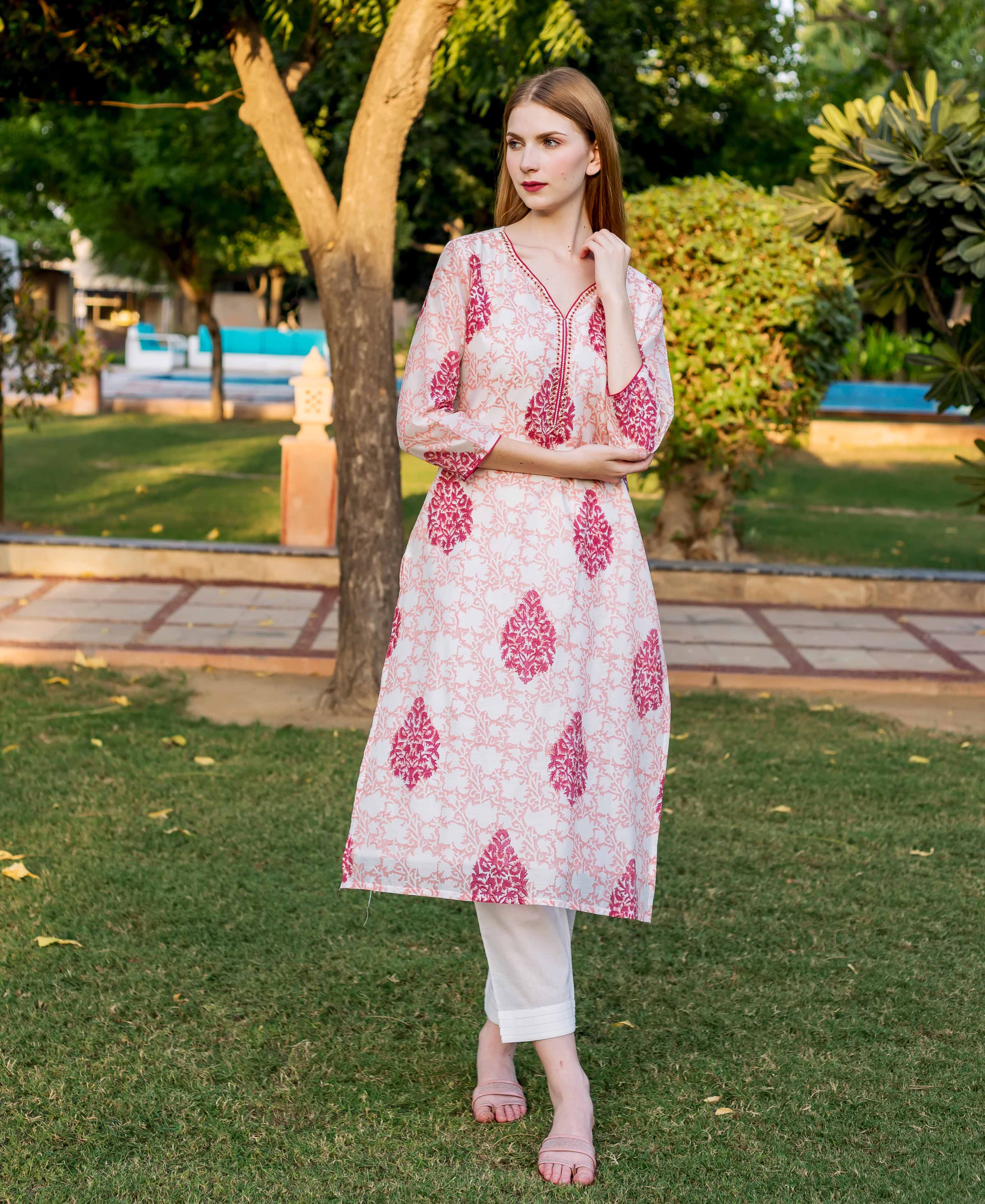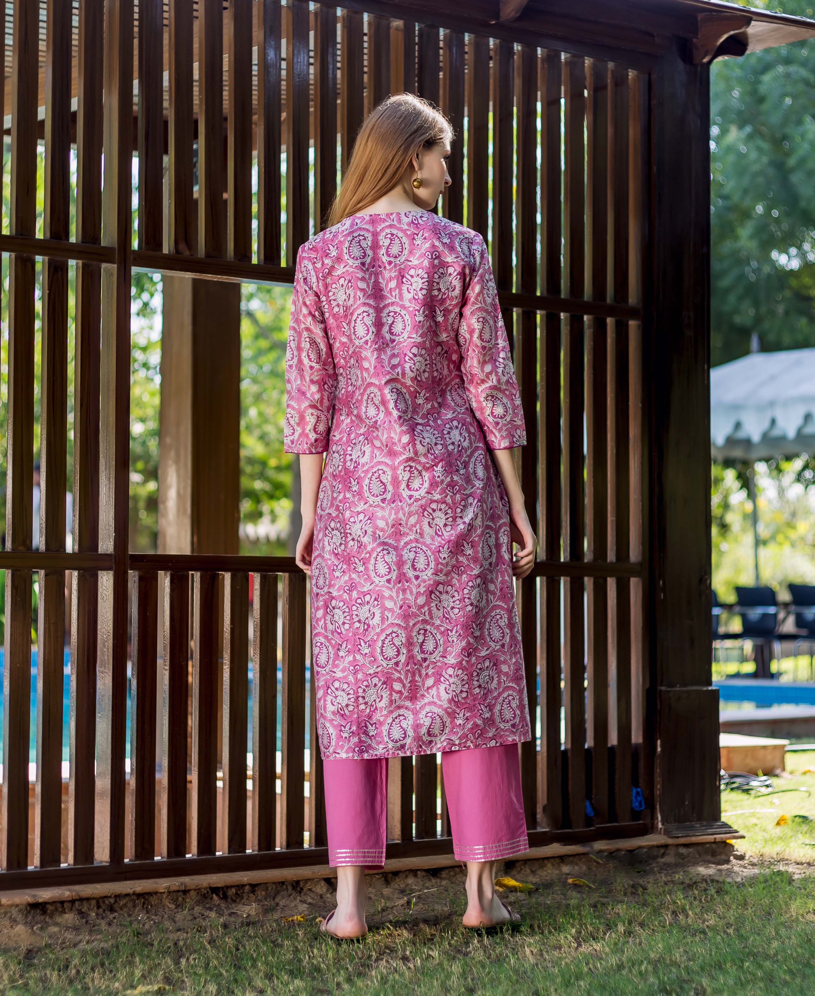 Indigo Hand Block Printed & Embroidered Straight Kurta