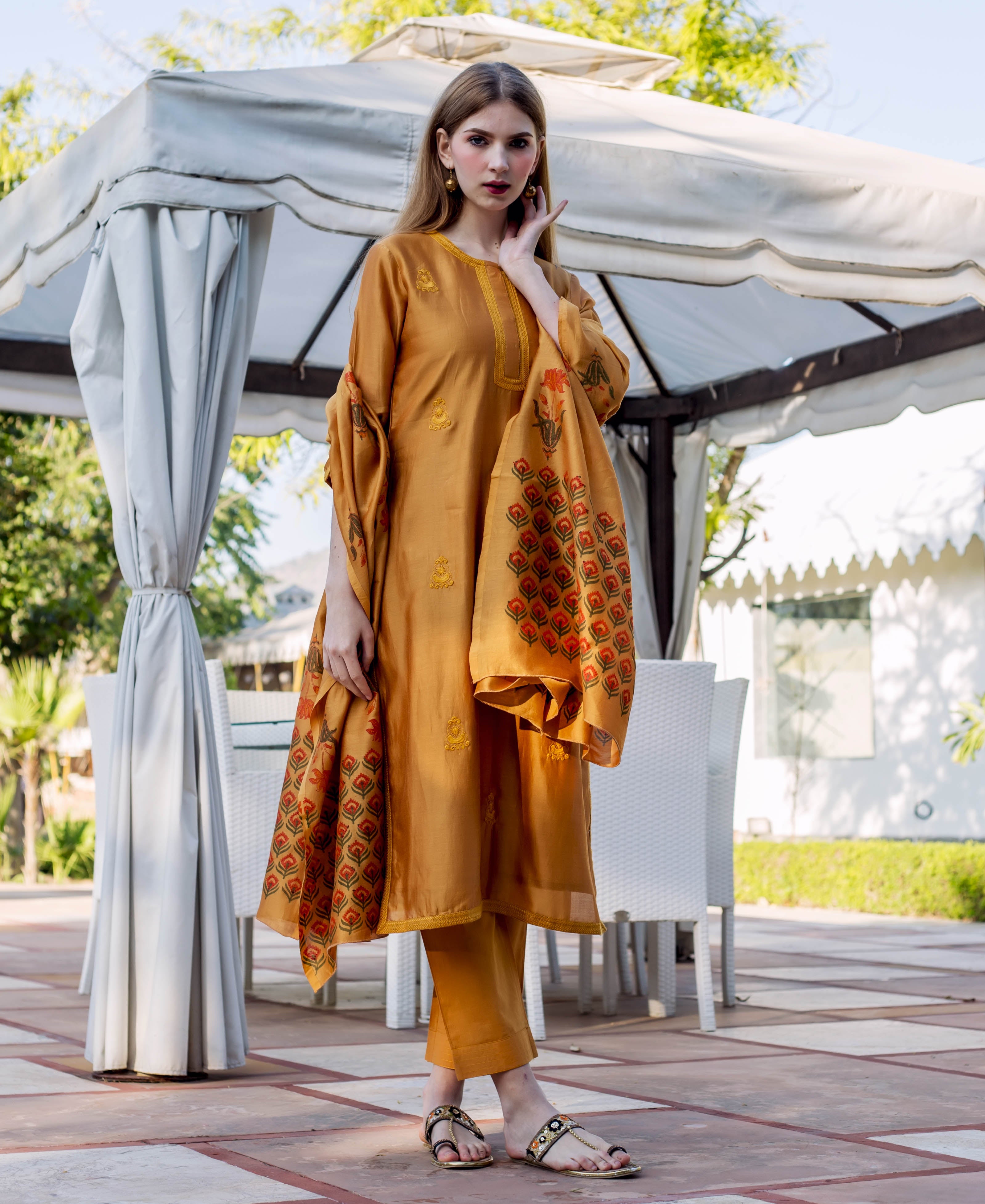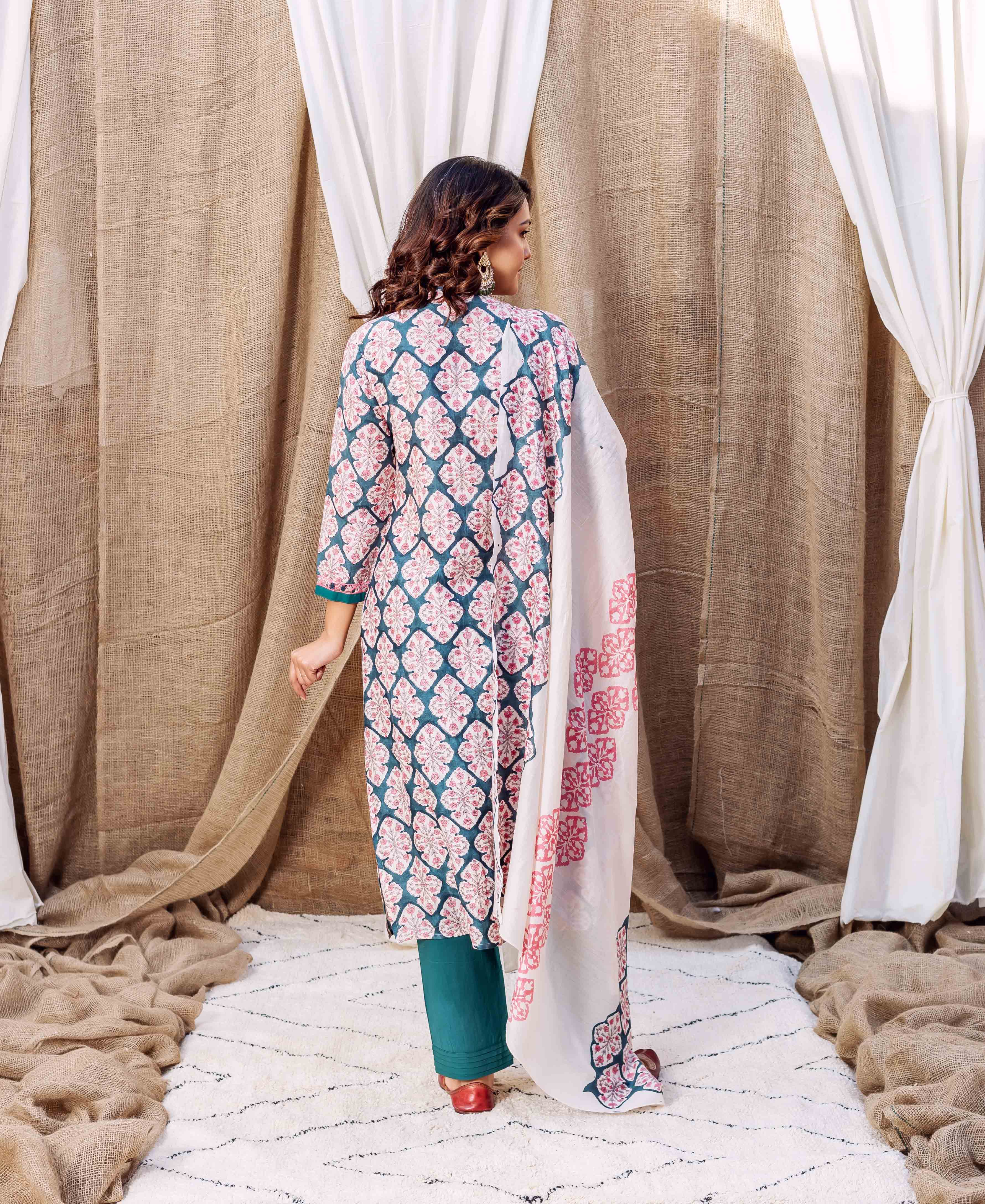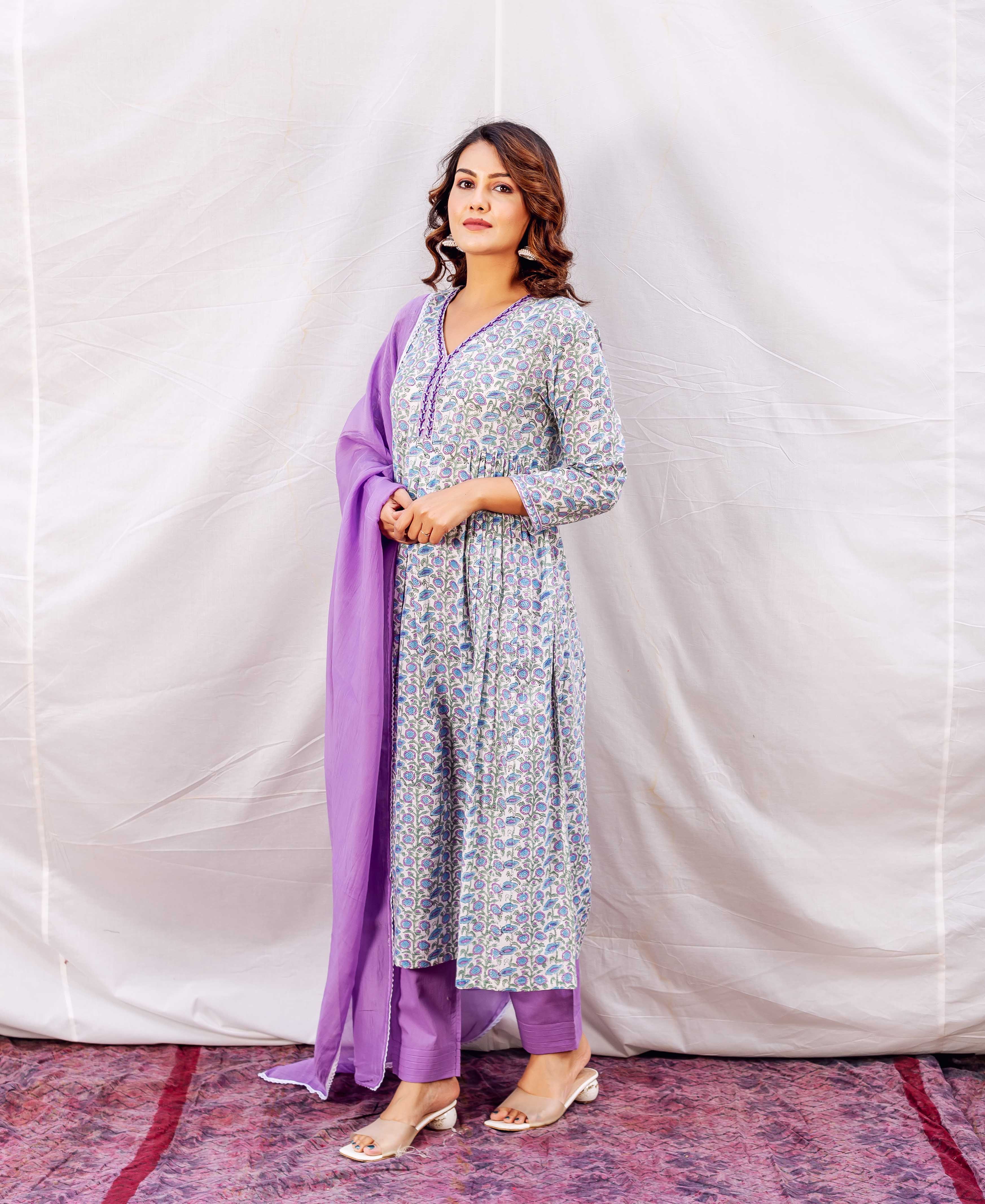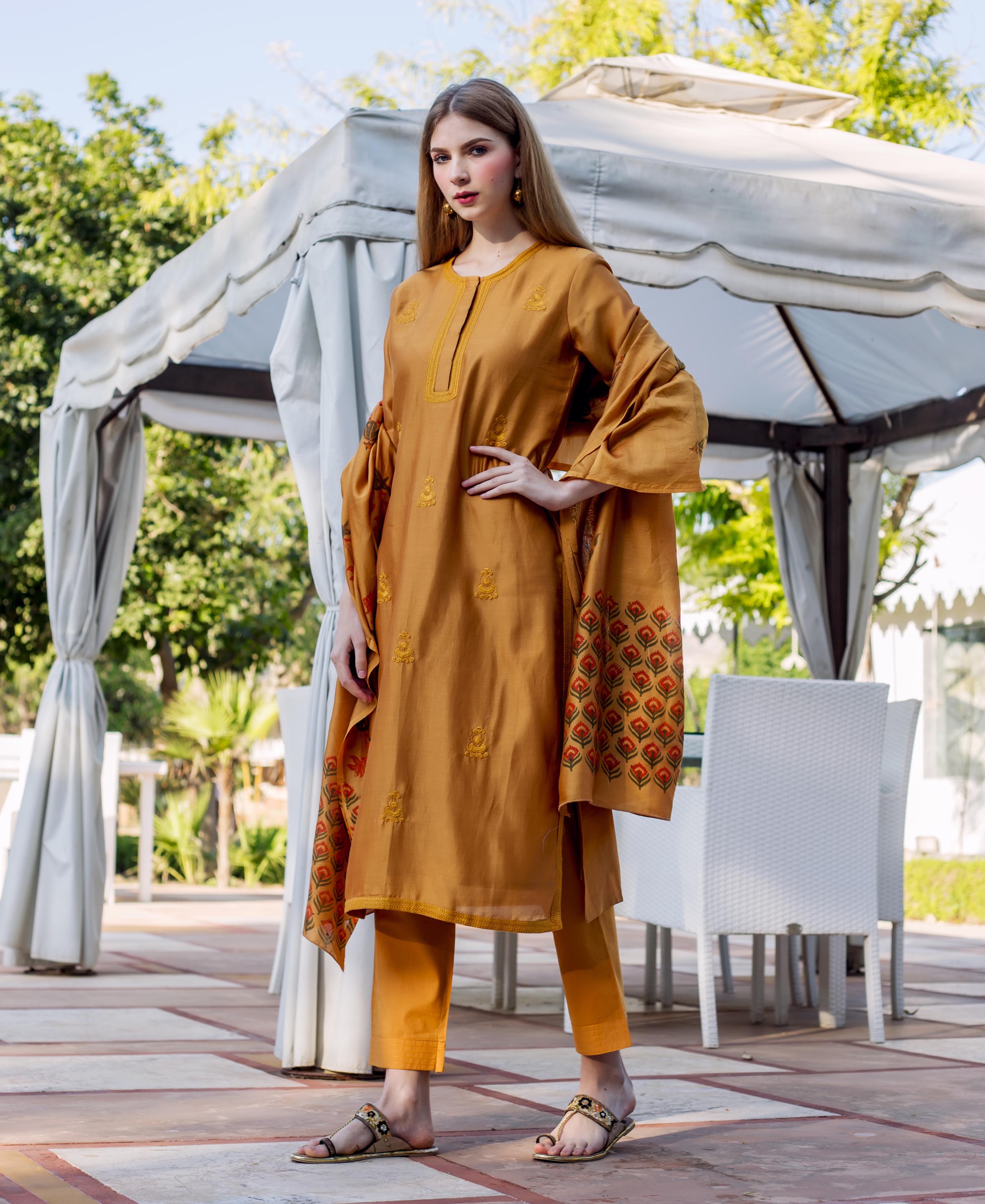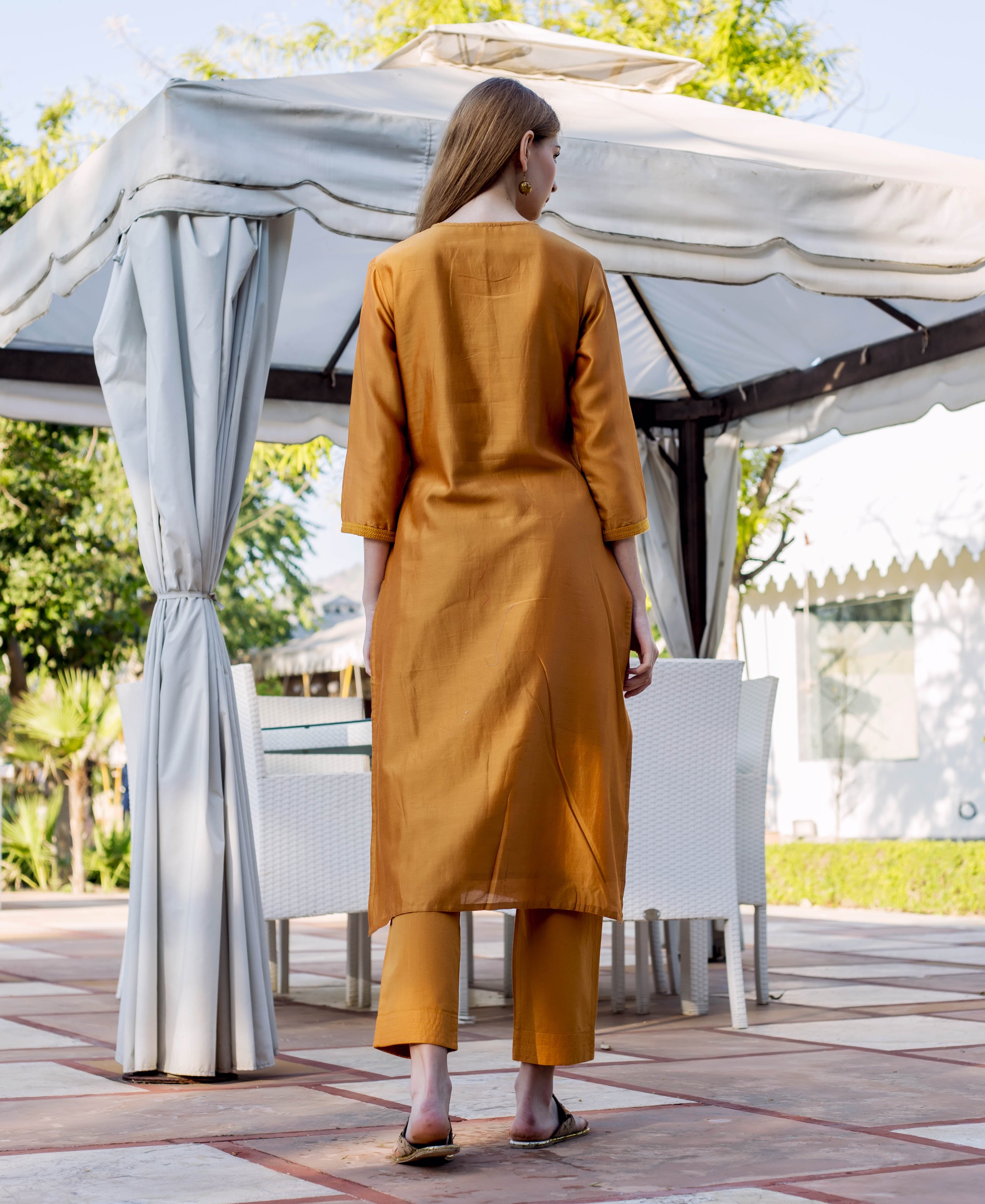 Indigo Hand Block Printed & Embroidered Straight Kurta