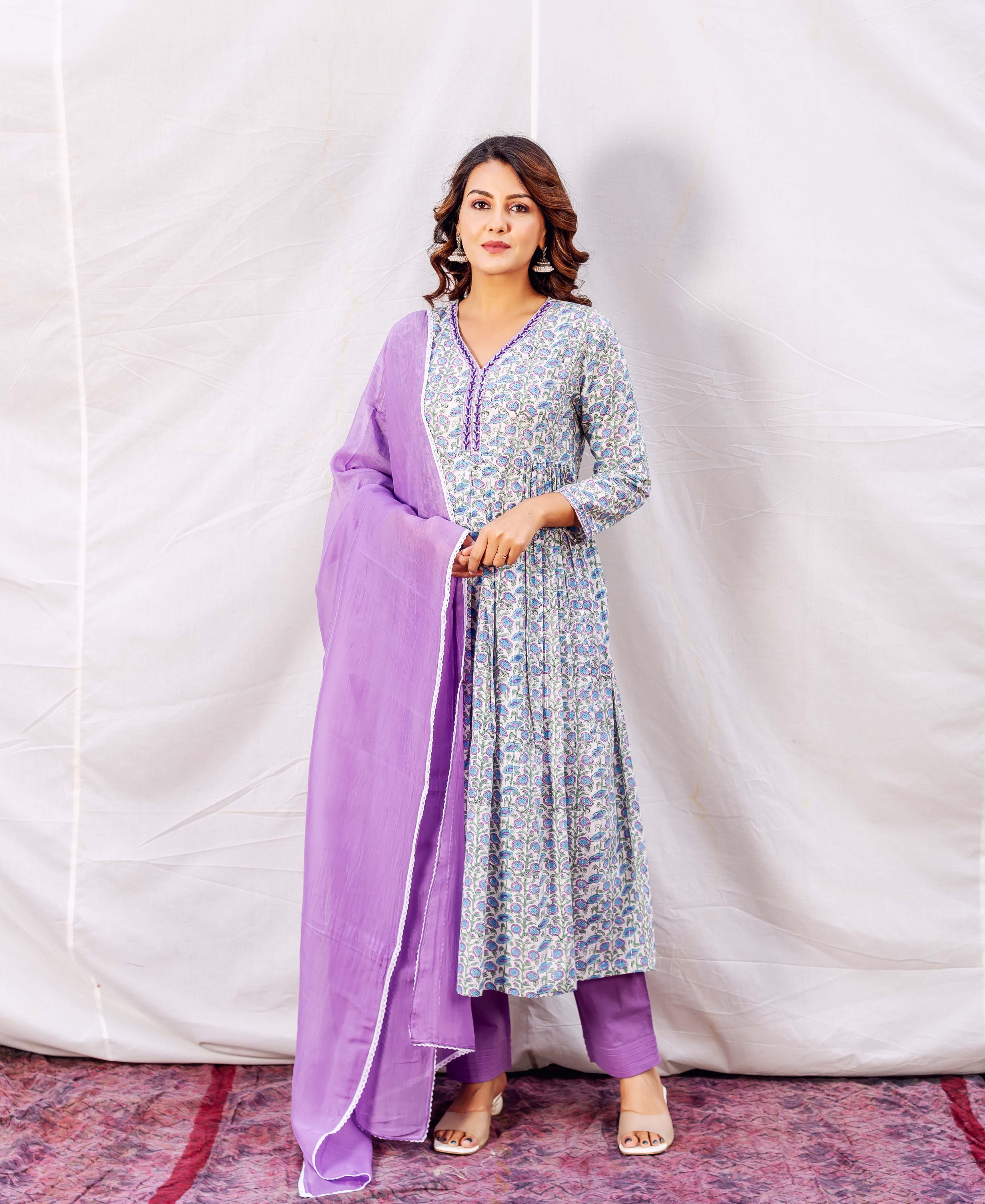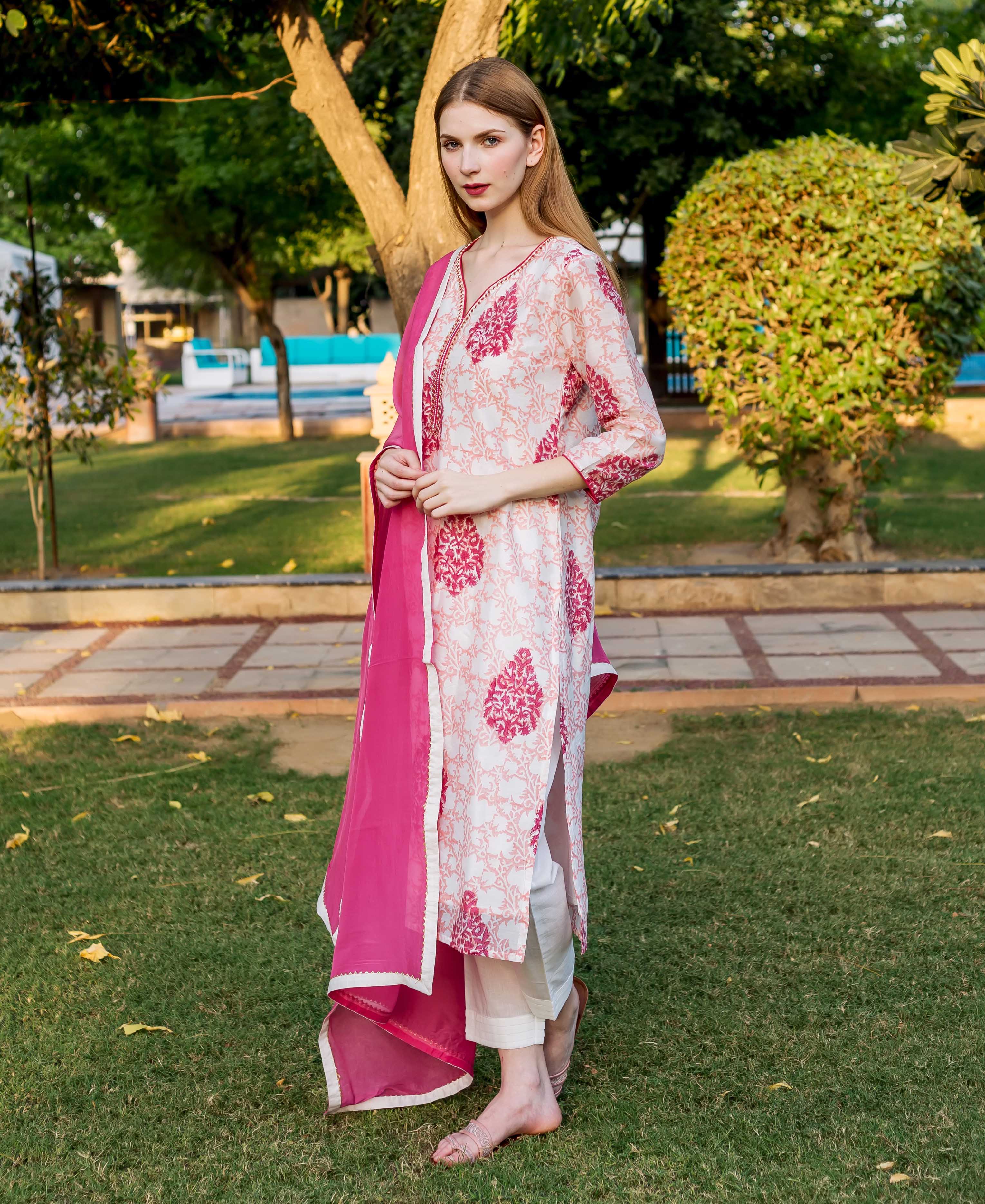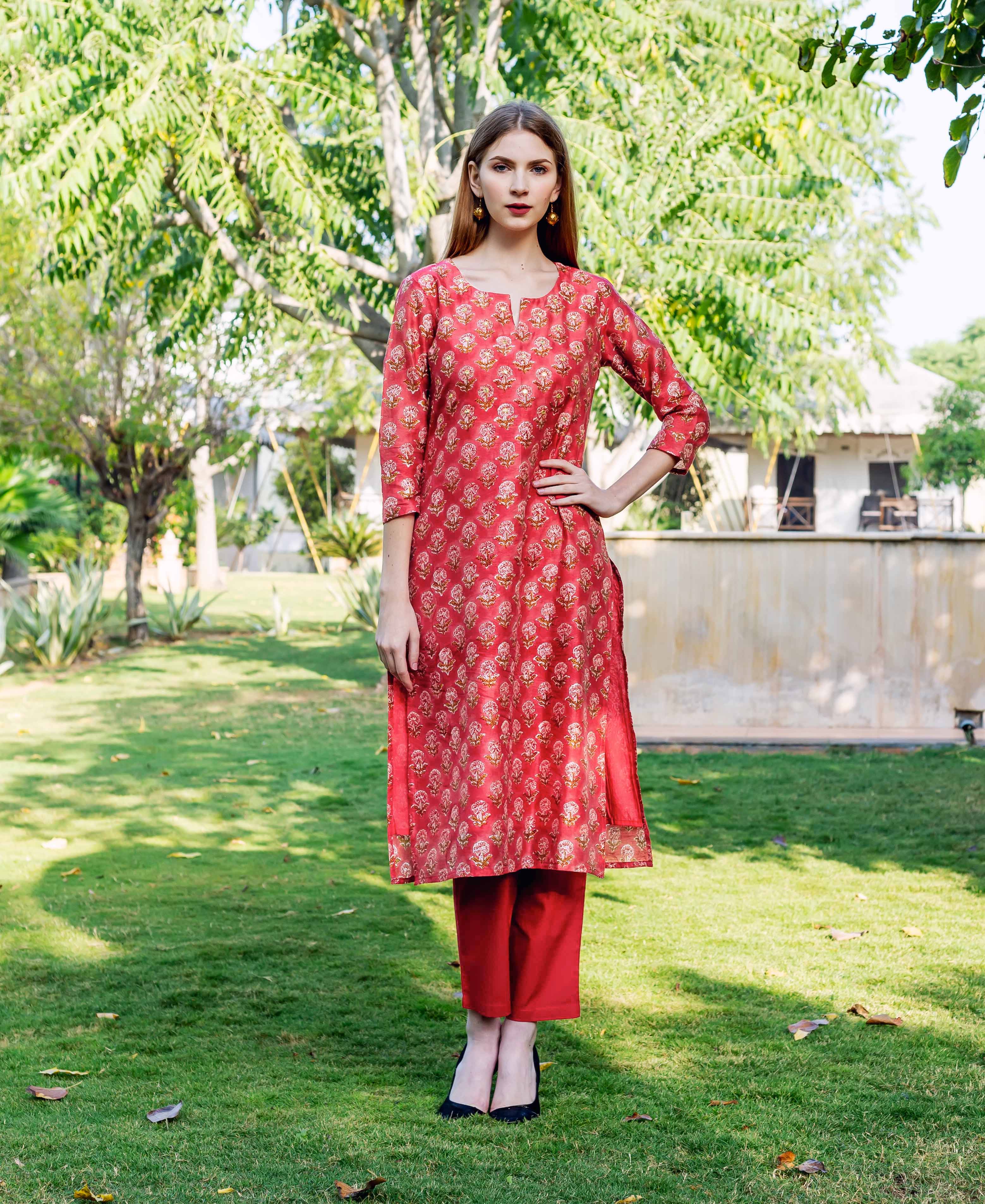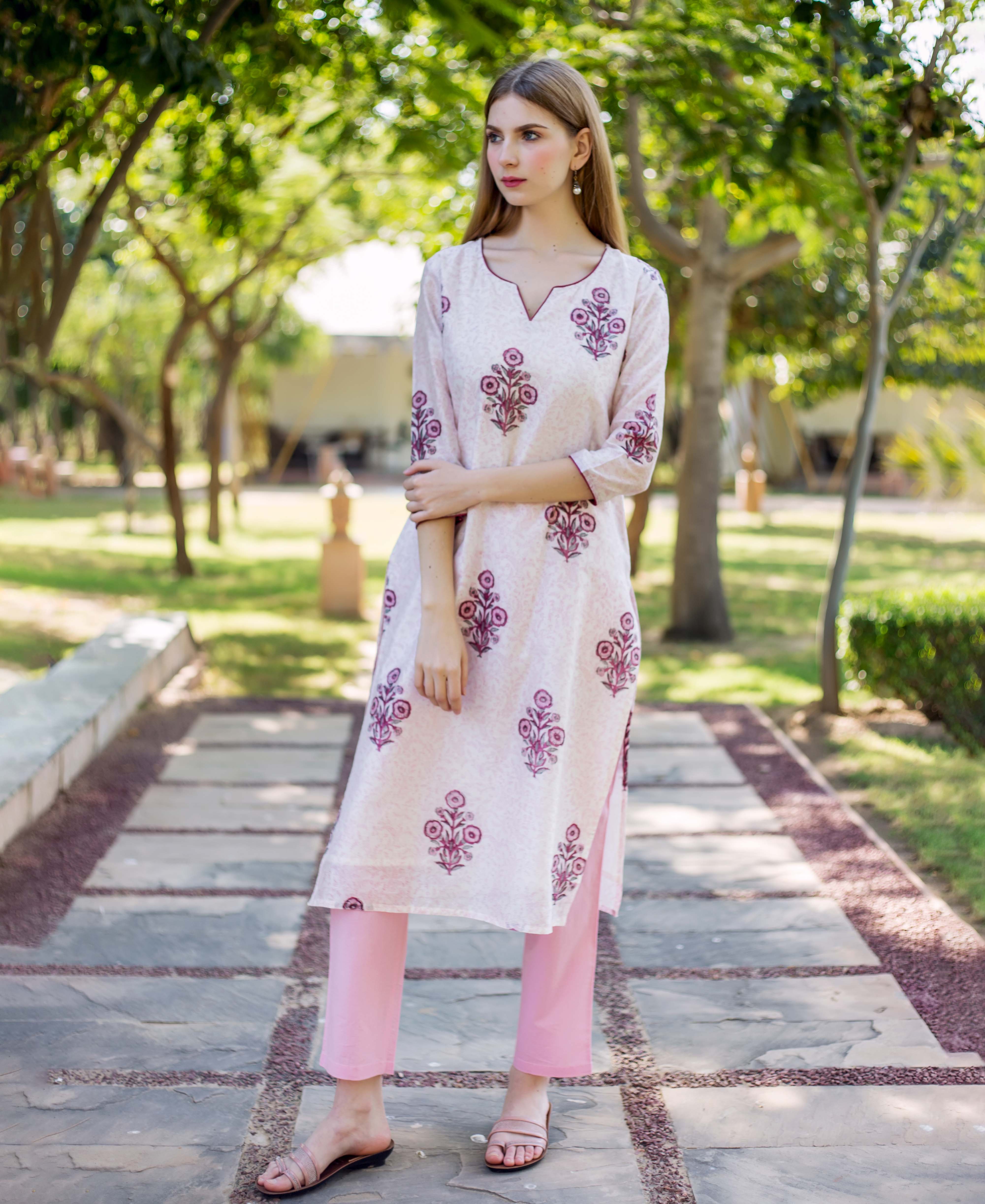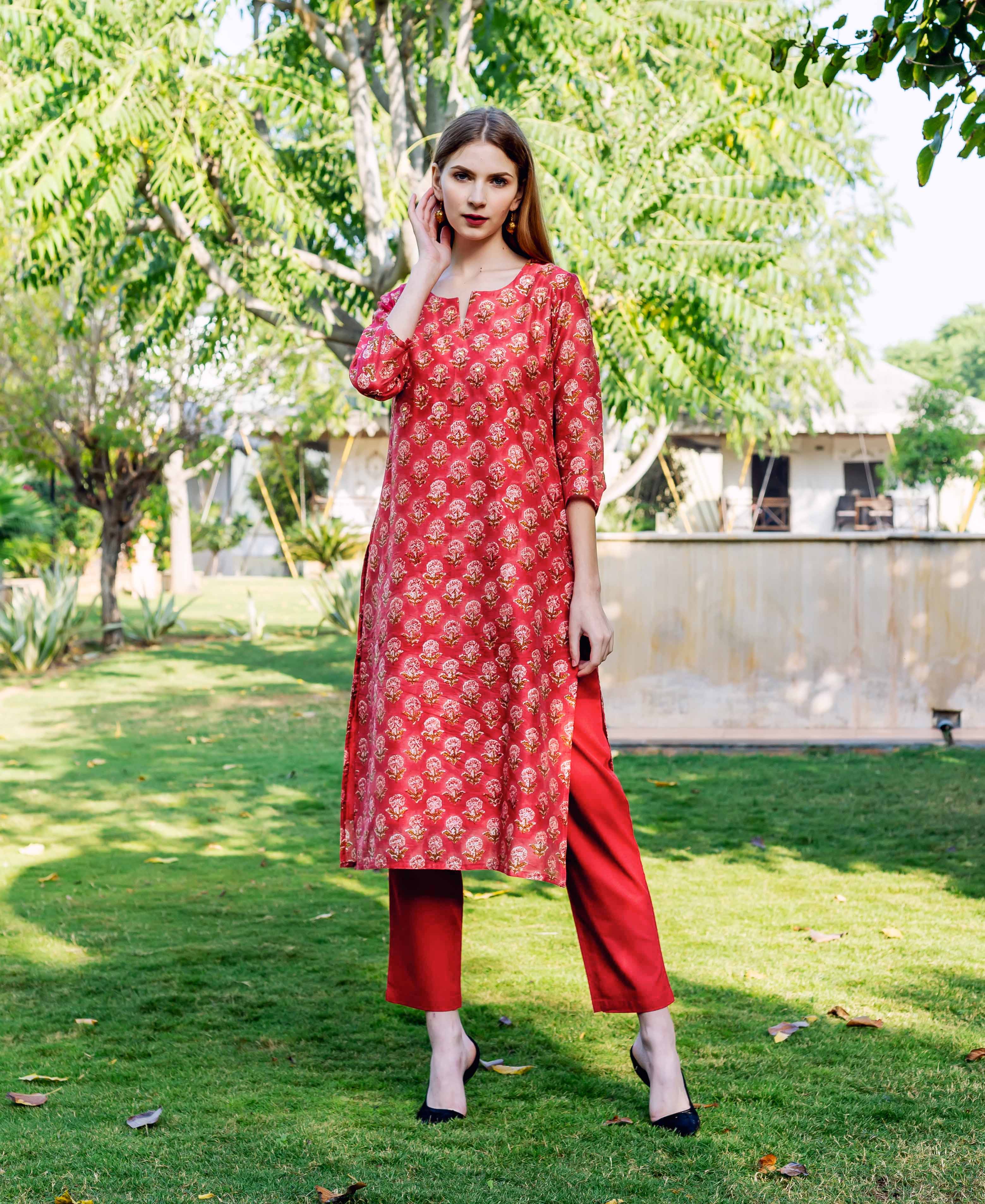 Indigo Hand Block Printed & Embroidered Straight Kurta